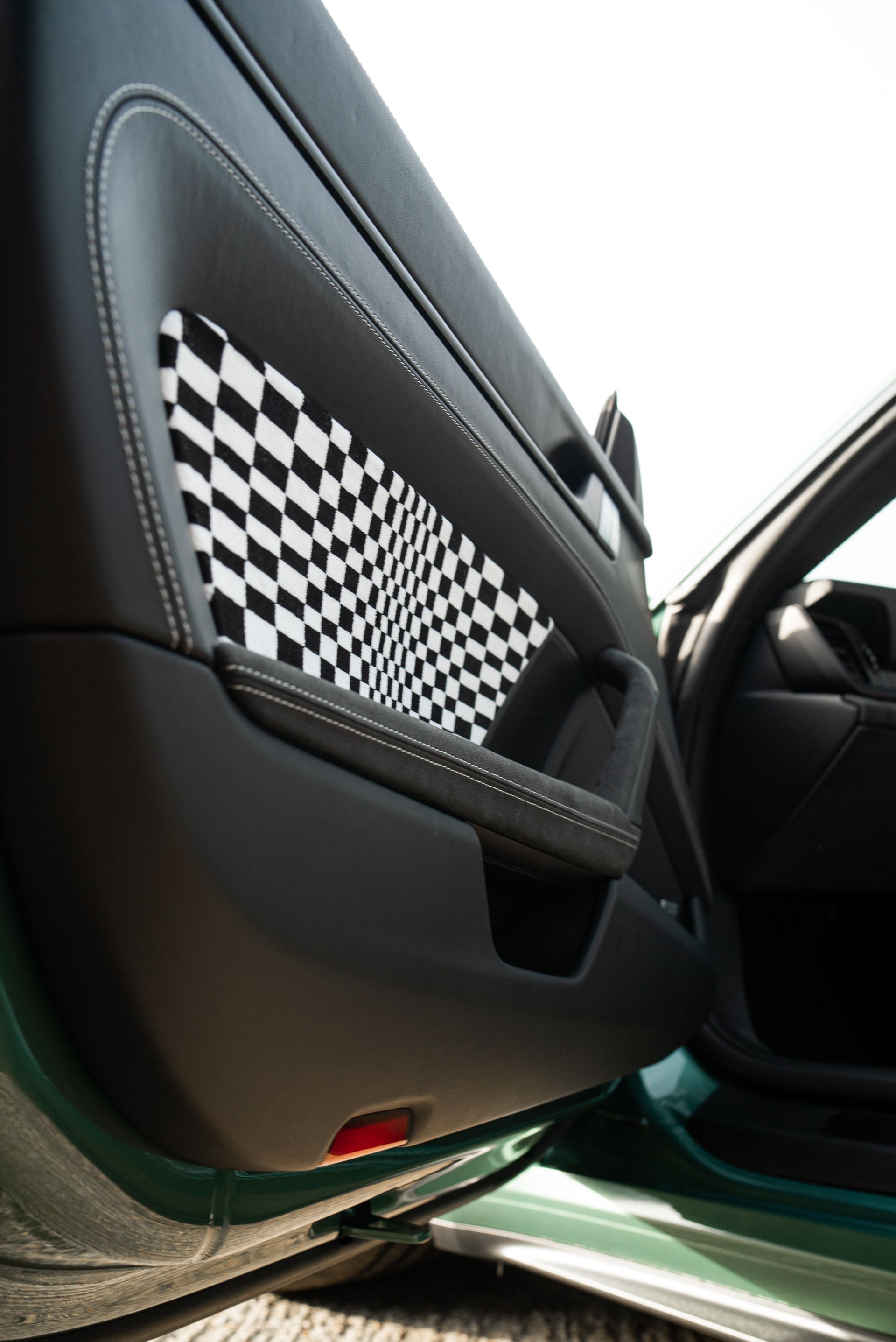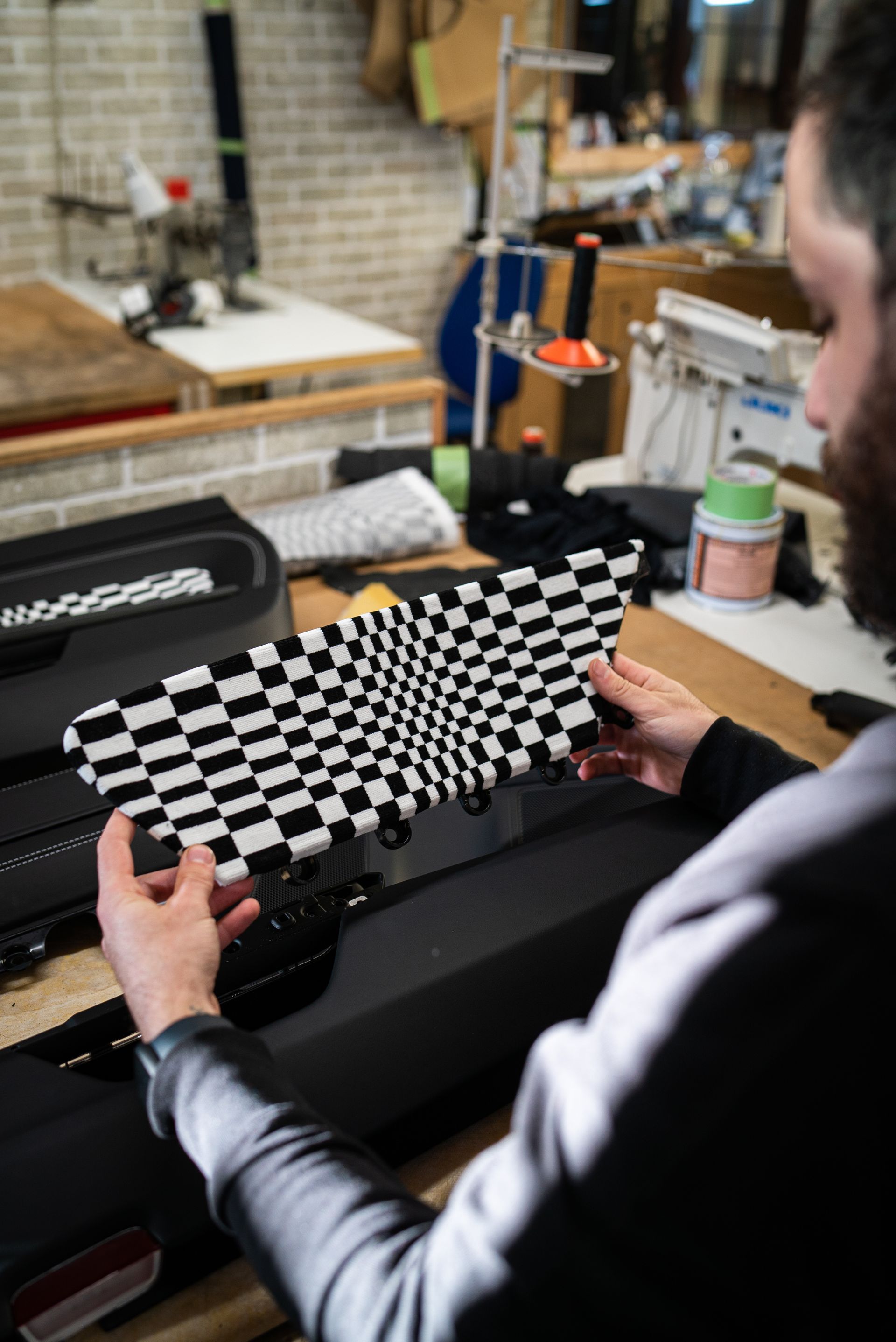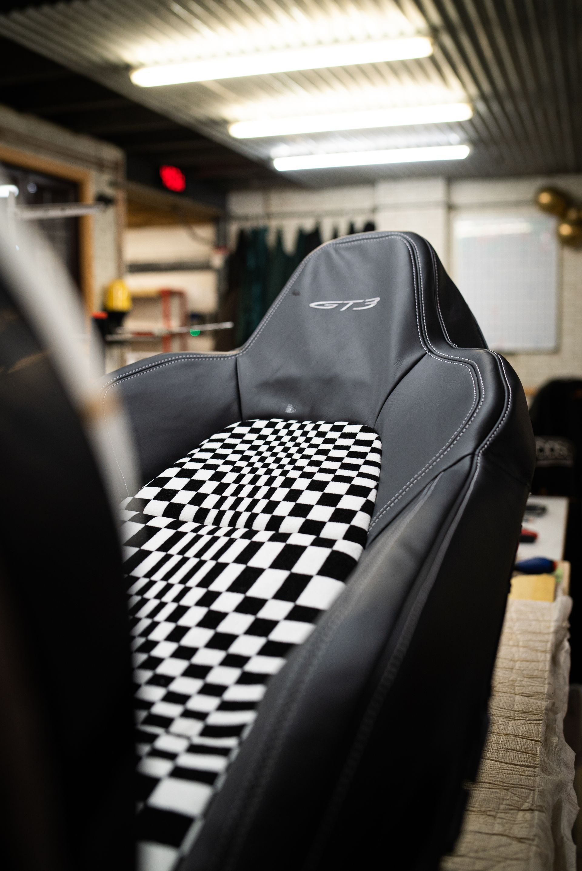 Sam is a frequent customer of d:class and is also popularly known on YouTube as Seen Through Glass. Sam recently brought his Ferrari 360 in for some minor repairs and came down to d:class HQ. Prior to that, we retrimmed the 360's steering wheel. This time, we developed Sam's brand-new Porsche 911 GT3 as a fresh project. After exchanging messages, we realised Sam desired a vintage Porsche fabric, such as the houndstooth pattern that is once again becoming quite popular among Porsche enthusiasts. Pascha in black and white was ultimately chosen, and it was promptly delivered in time for the GT3's arrival.