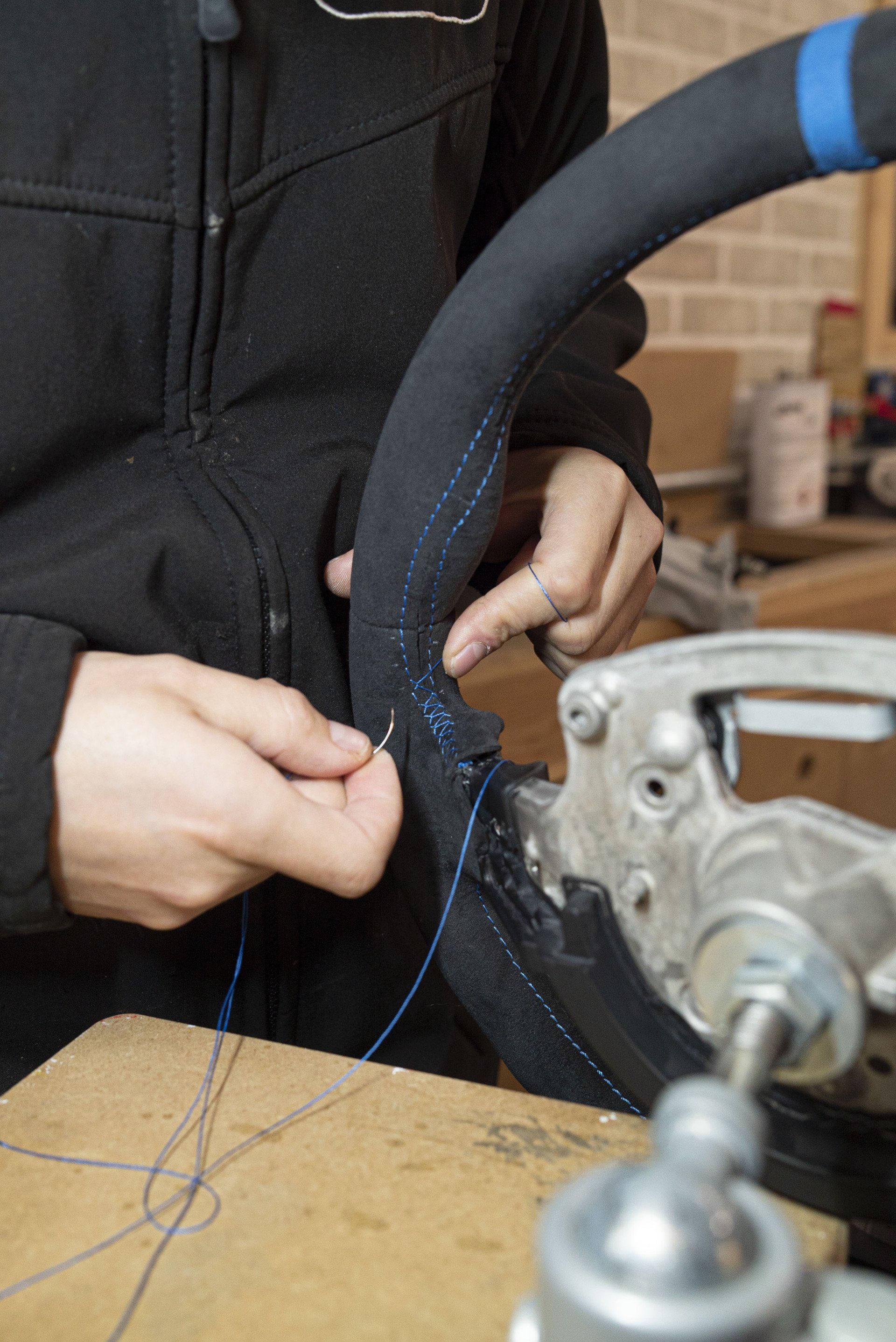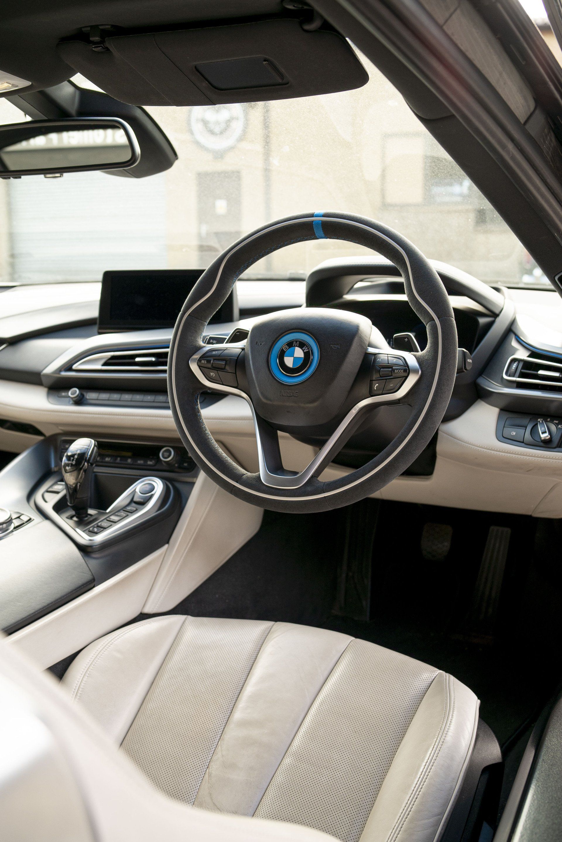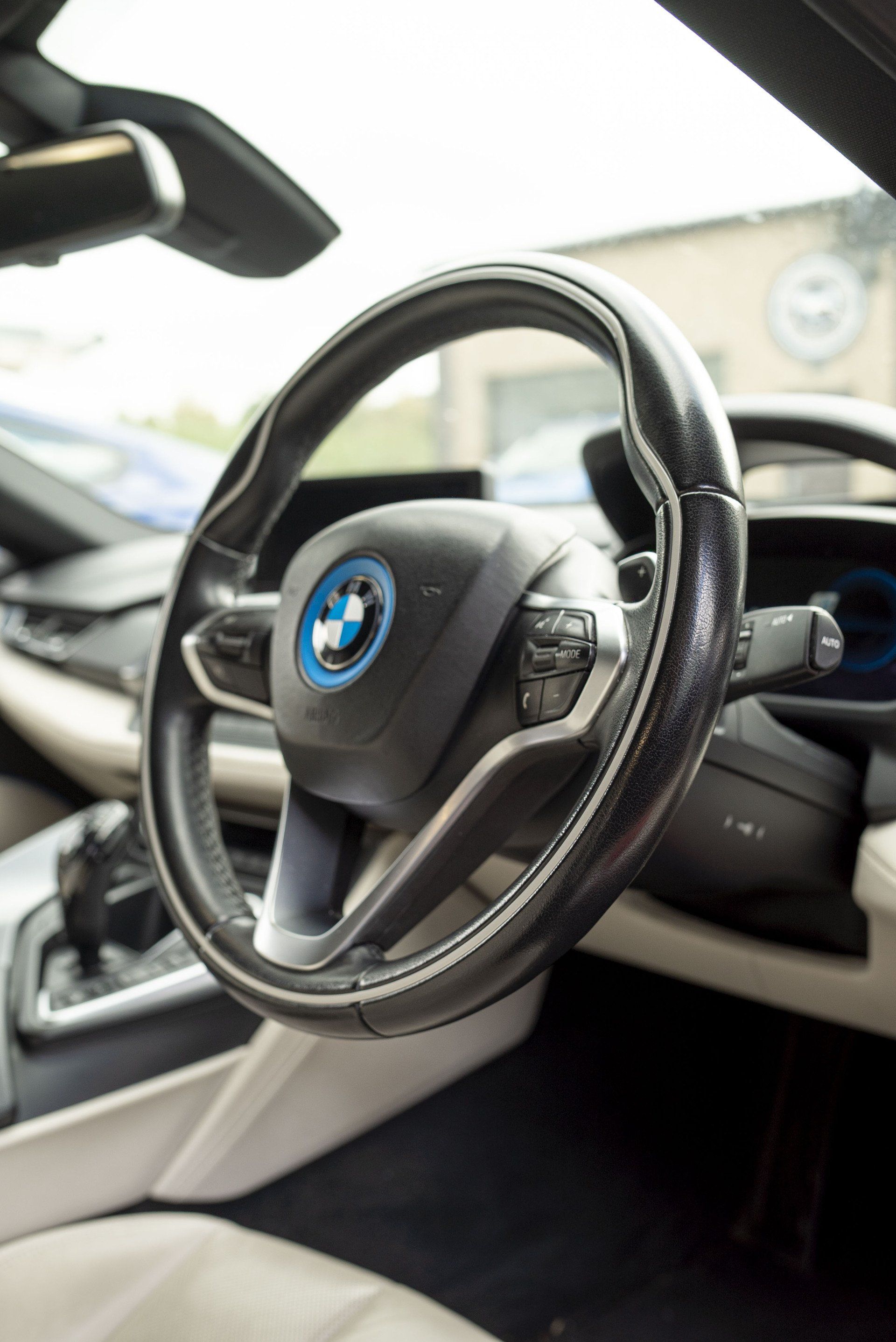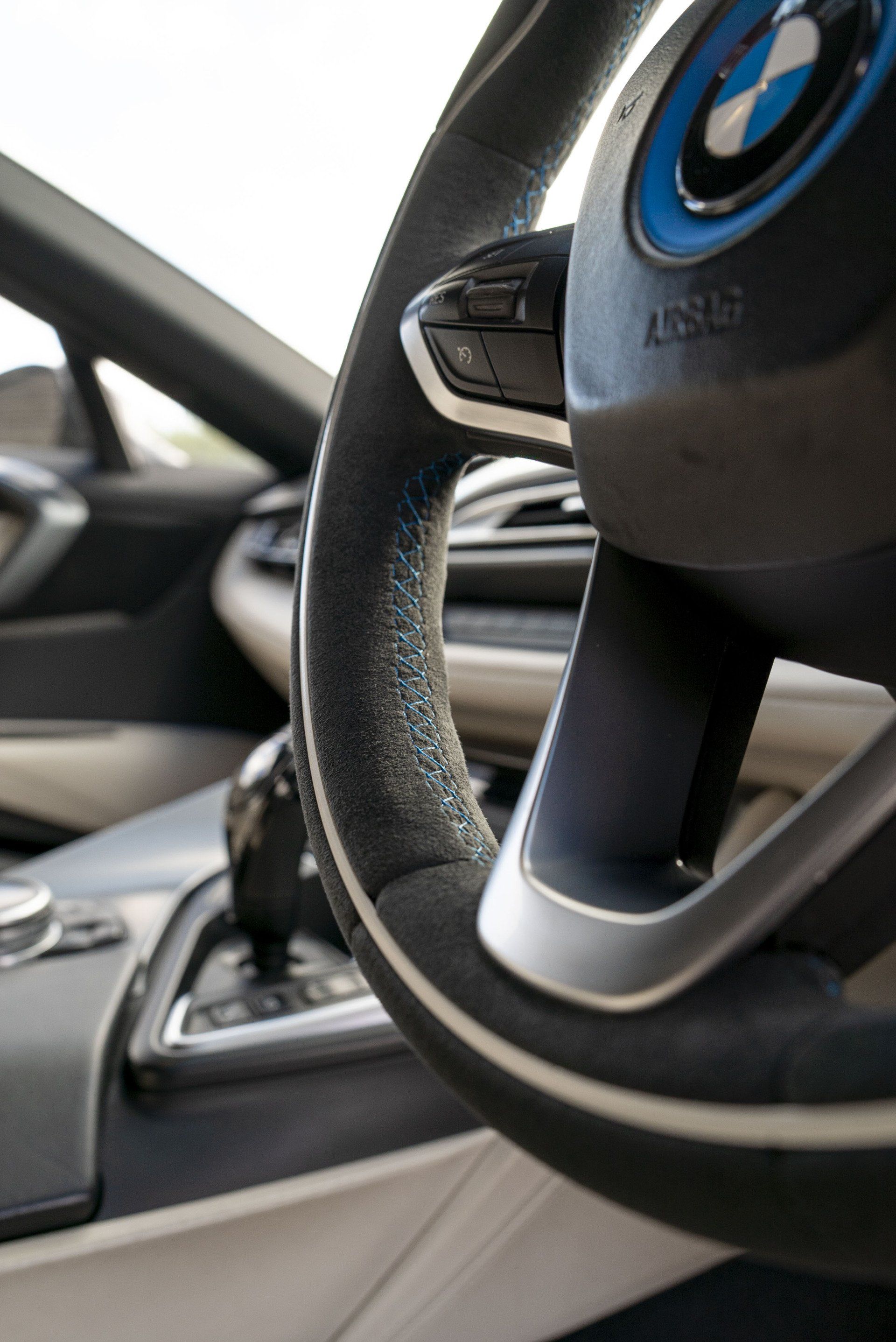 Steering wheel retrim for this BMW i8. The wheel used to be leather but had become shiny due to a lot of use. This has now been changed as it's been retrimmed with charcoal Alcantara with a blue Alcantara racing band. Identical blue thread has been hand stitched to complete this bespoke wheel. The blue used is to match the accents already found in the OEM interior.