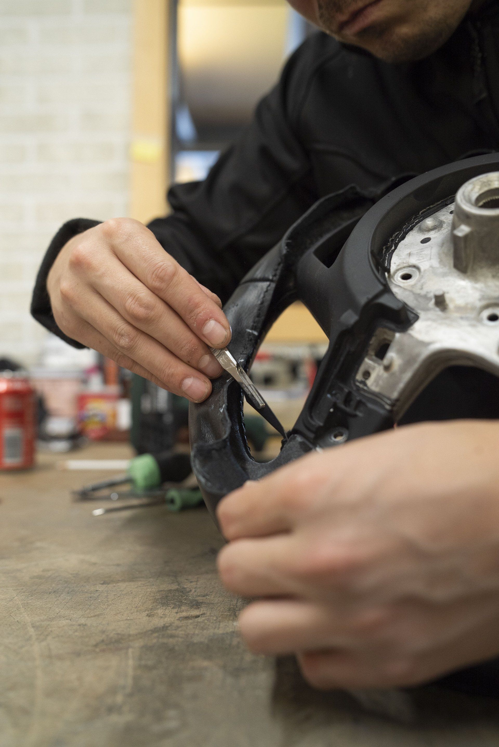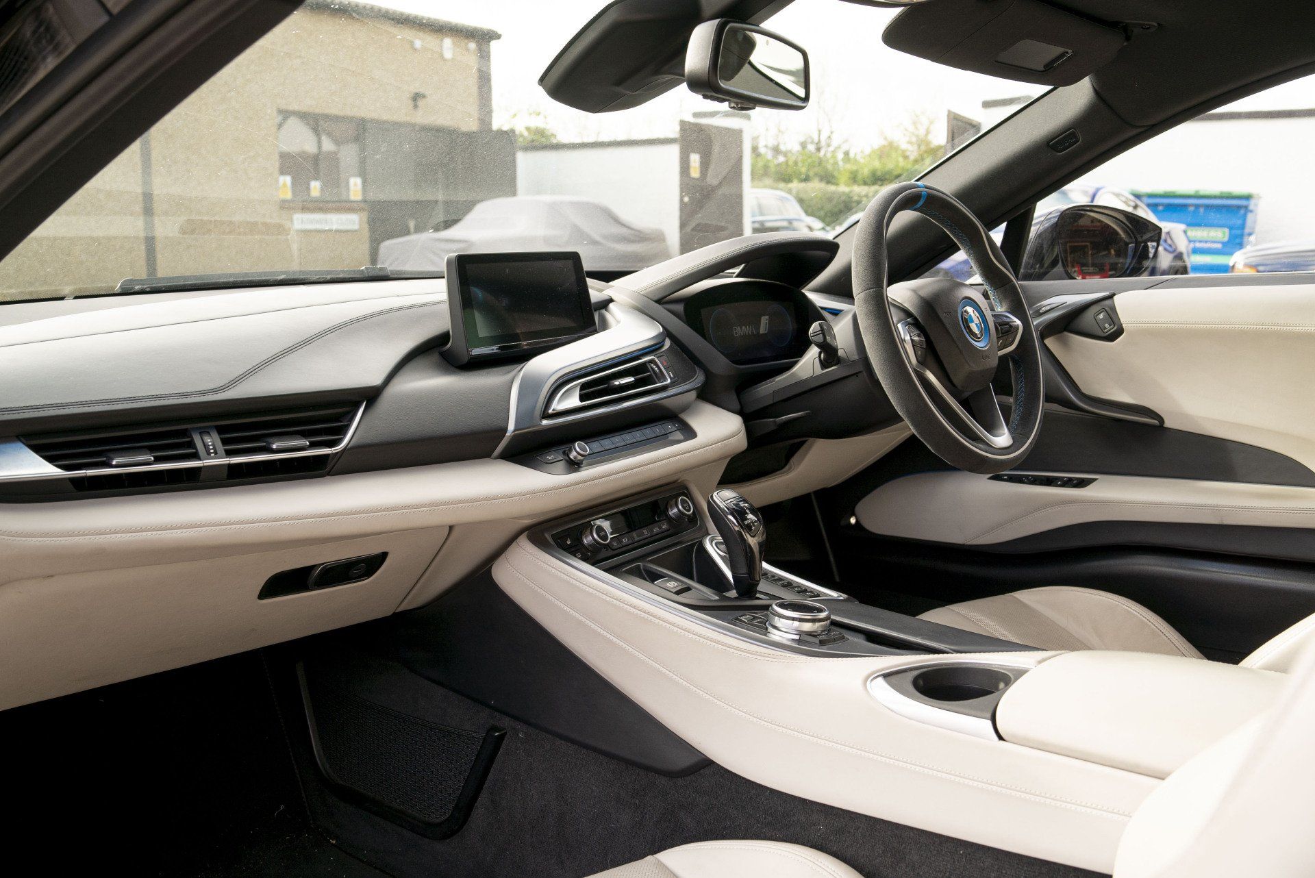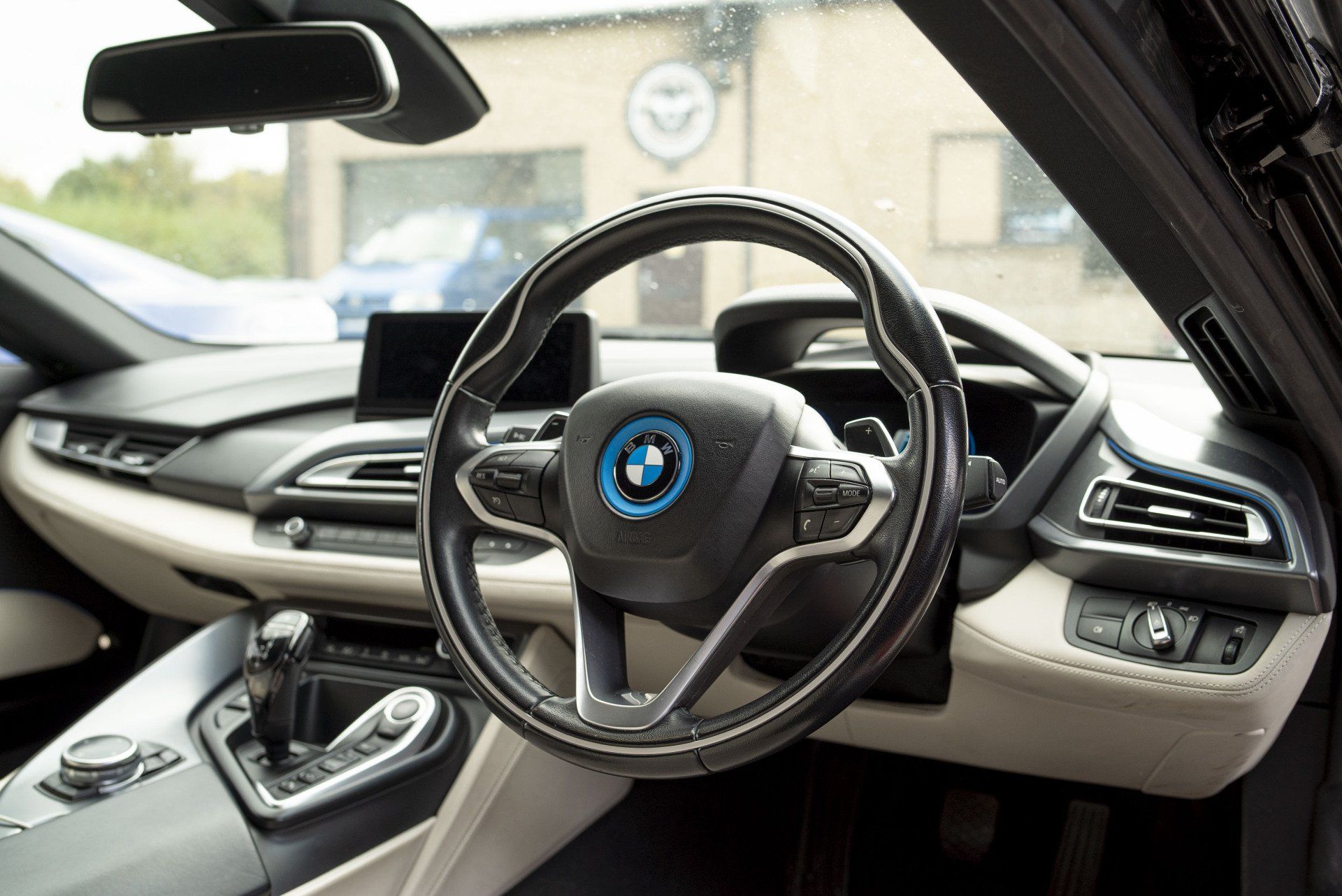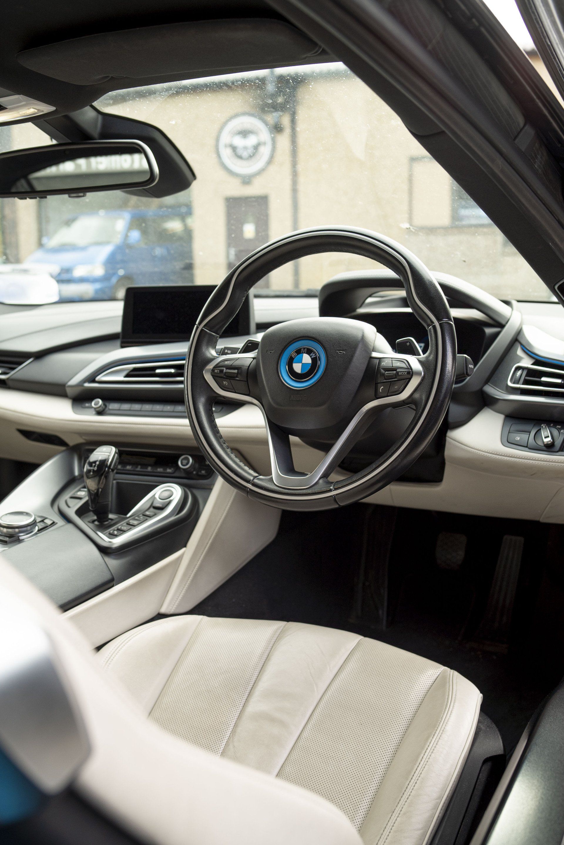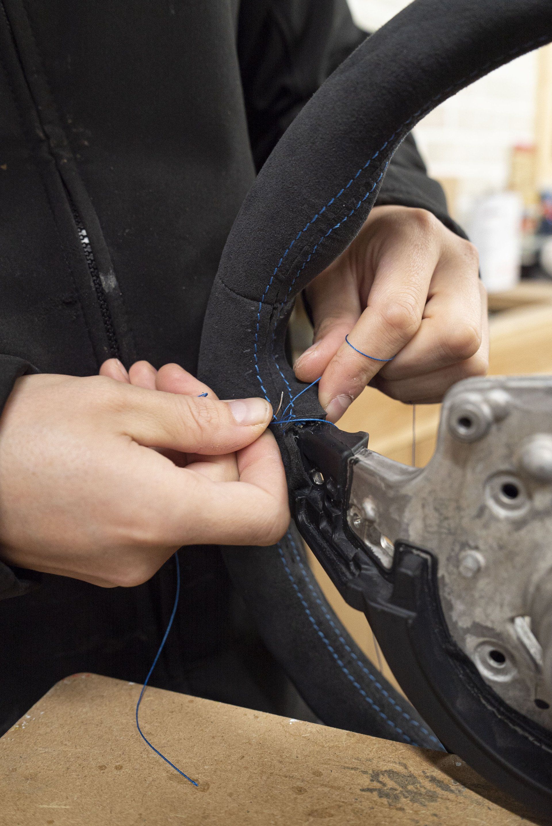 Steering wheel retrim for this BMW i8. The wheel used to be leather but had become shiny due to a lot of use. This has now been changed as it's been retrimmed with charcoal Alcantara with a blue Alcantara racing band. Identical blue thread has been hand stitched to complete this bespoke wheel. The blue used is to match the accents already found in the OEM interior.