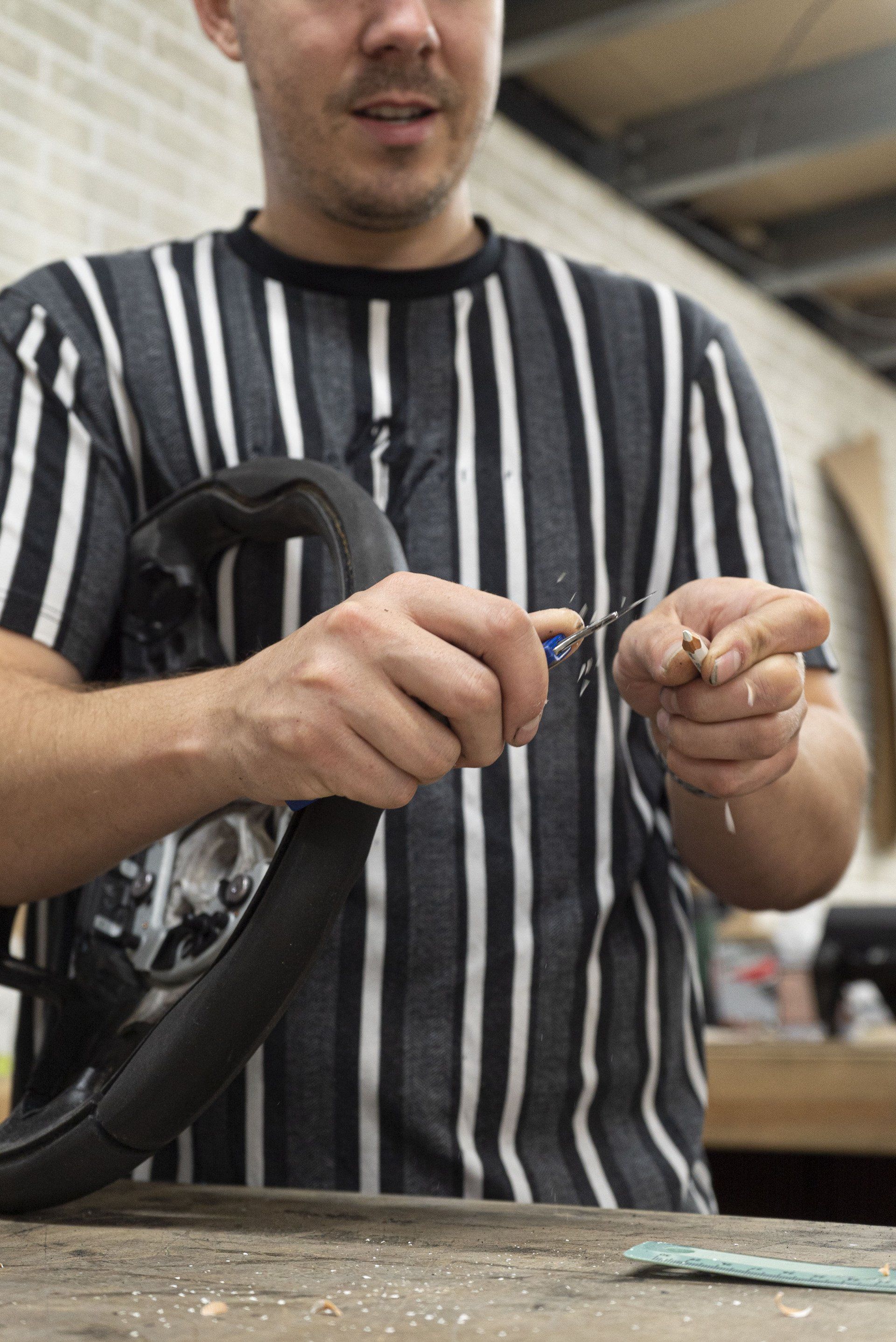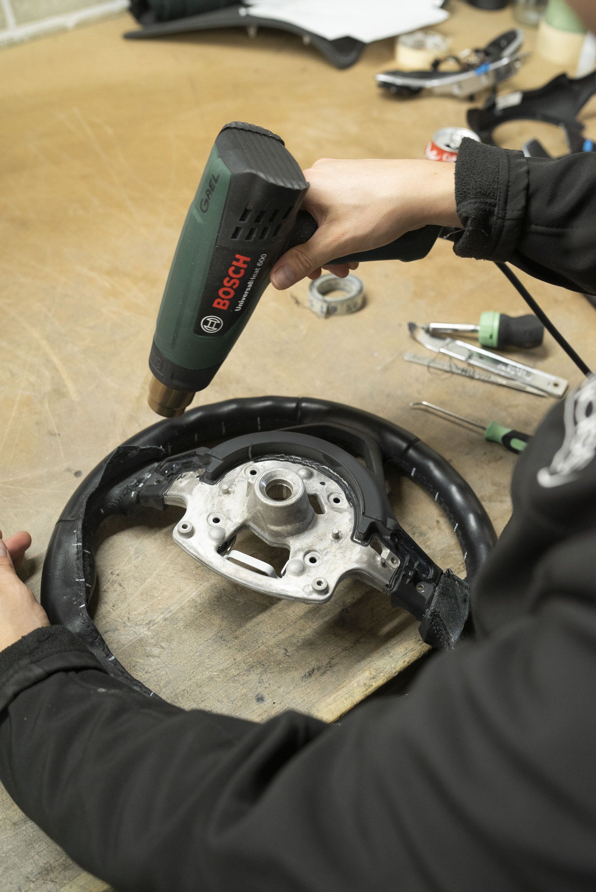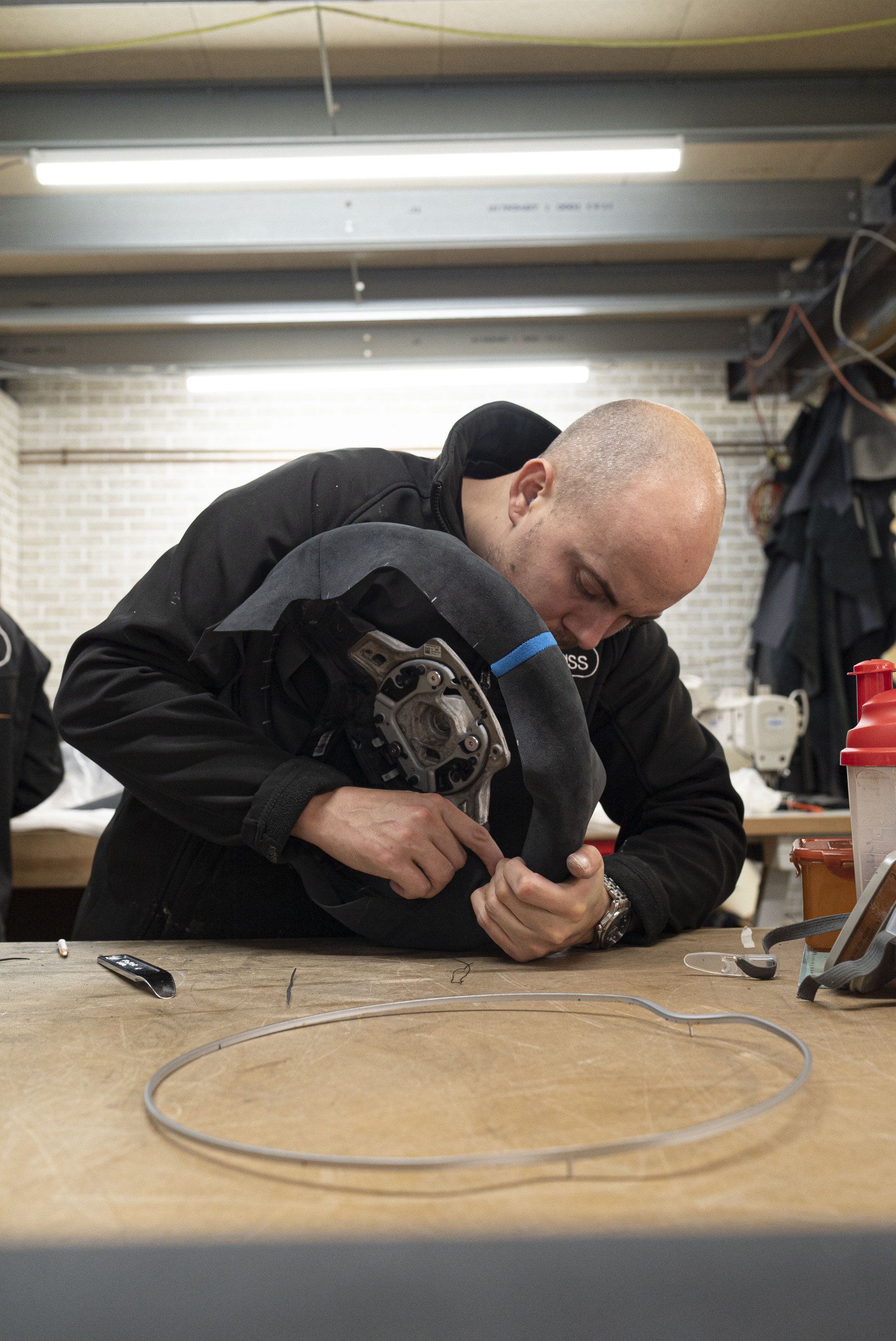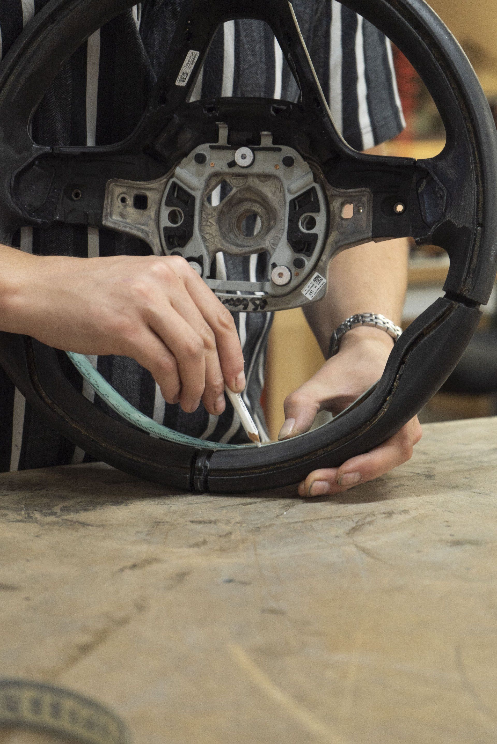 Steering wheel retrim for this BMW i8. The wheel used to be leather but had become shiny due to a lot of use. This has now been changed as it's been retrimmed with charcoal Alcantara with a blue Alcantara racing band. Identical blue thread has been hand stitched to complete this bespoke wheel. The blue used is to match the accents already found in the OEM interior.