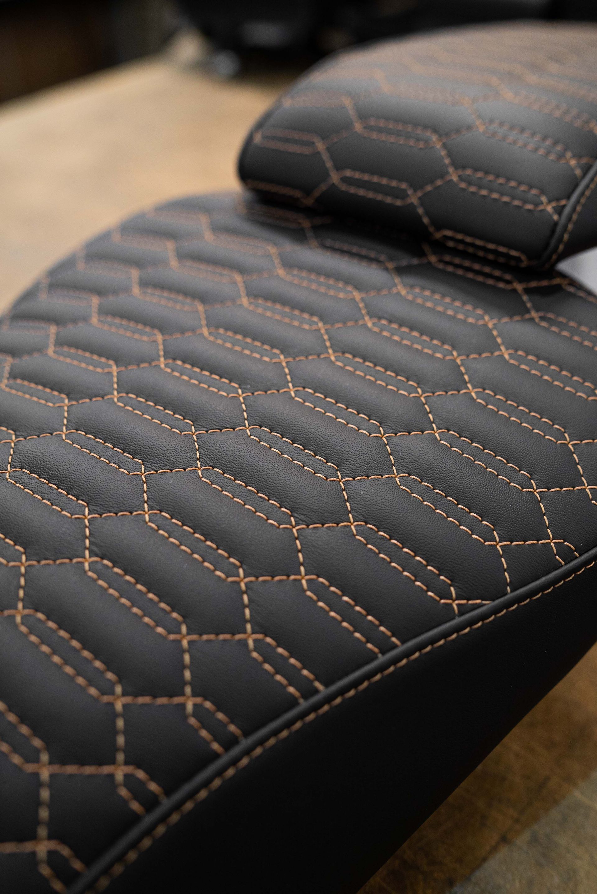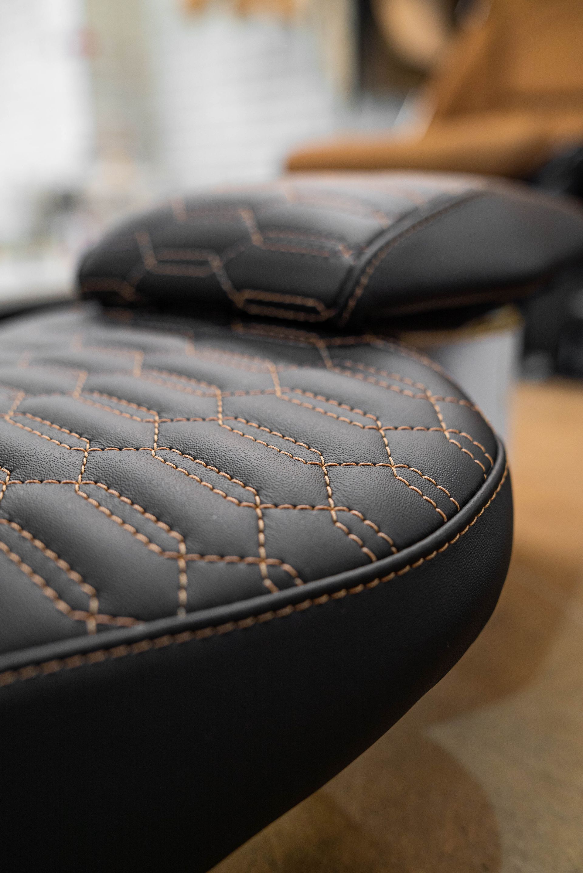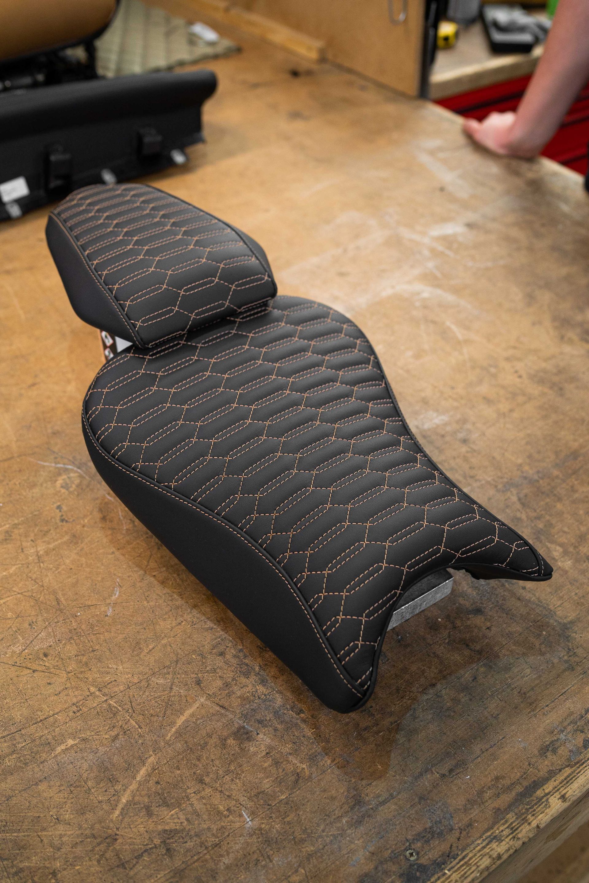 For this seat, we received a small list of requirements from our customer; make the seat comfier than the OEM spec, use black nappa leather, a copper stitch to match the bike frame, and create a modern CNC stitch pattern seat centre.