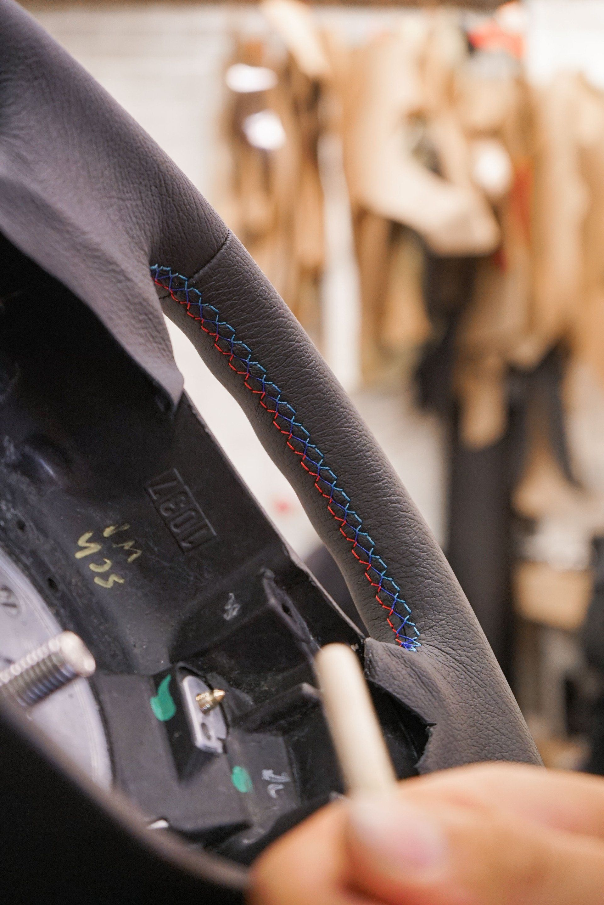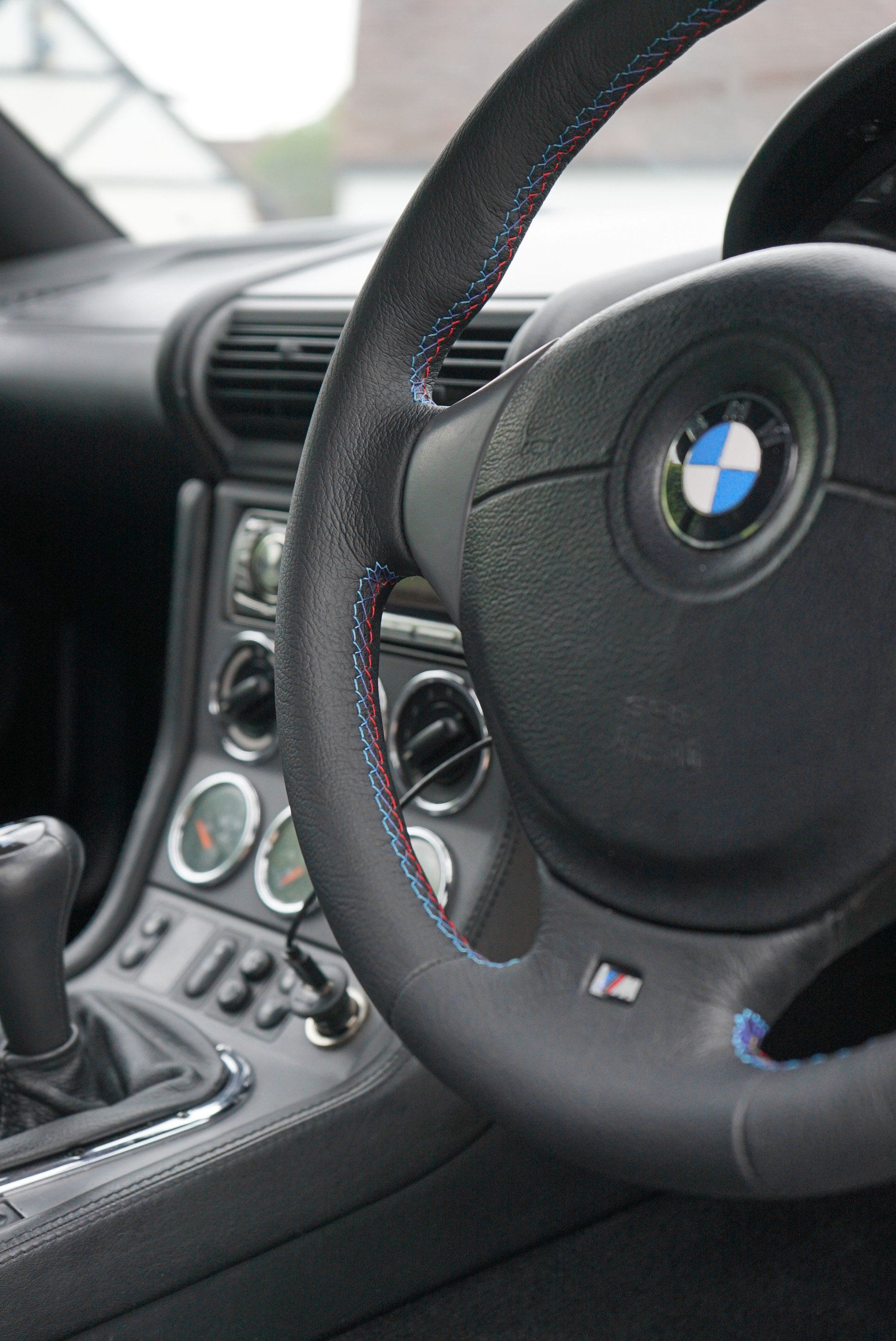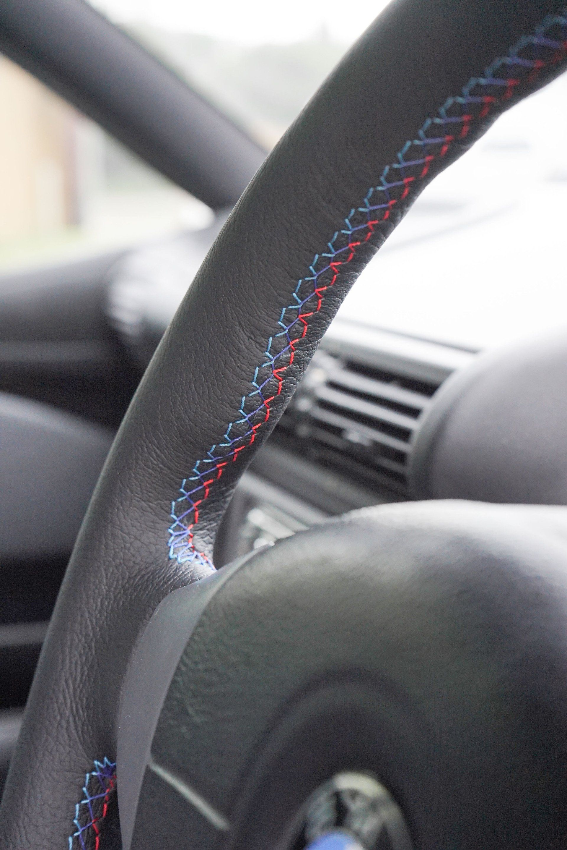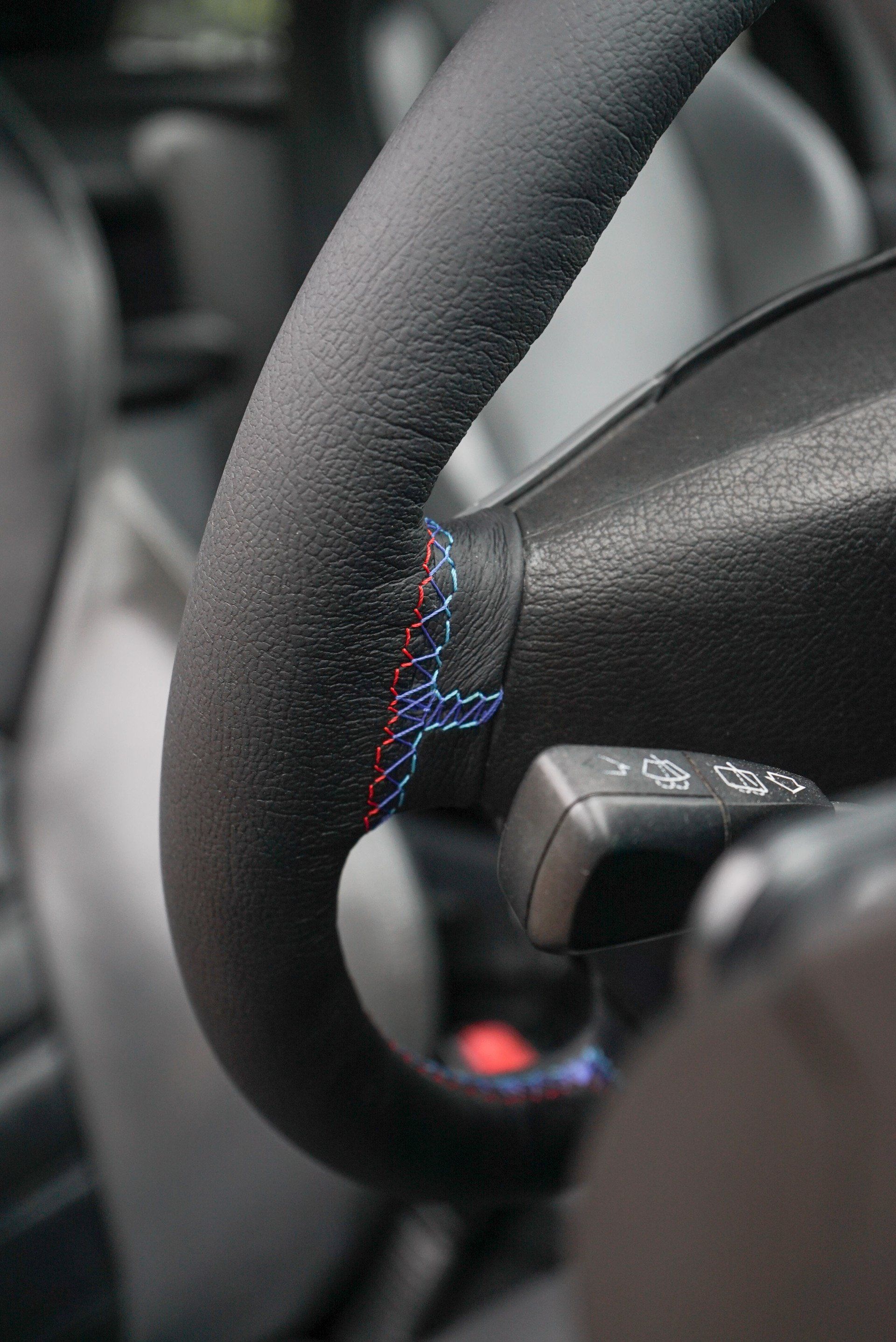 BMW Z3M Coupe which had it's steering wheel retrimmed in black grained leather. The original leather had been completely worn down by years of use and as a result had become shiny and flat. The original wheel also had tri-coloured M stitching which lost all it's colouring from use. The freshly retrimmed wheel now has brand new stitching bringing the interior on this modern classic back up to date.