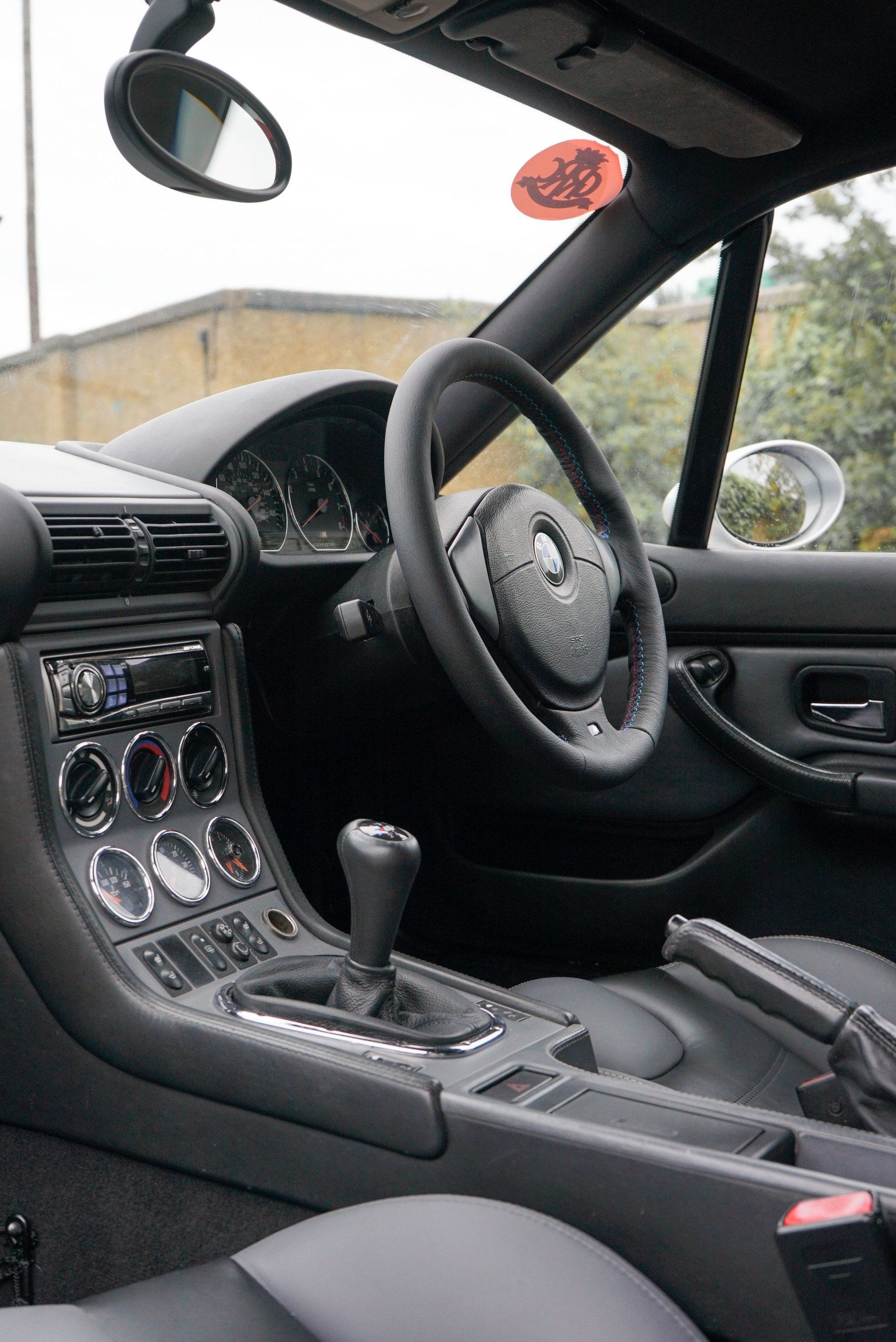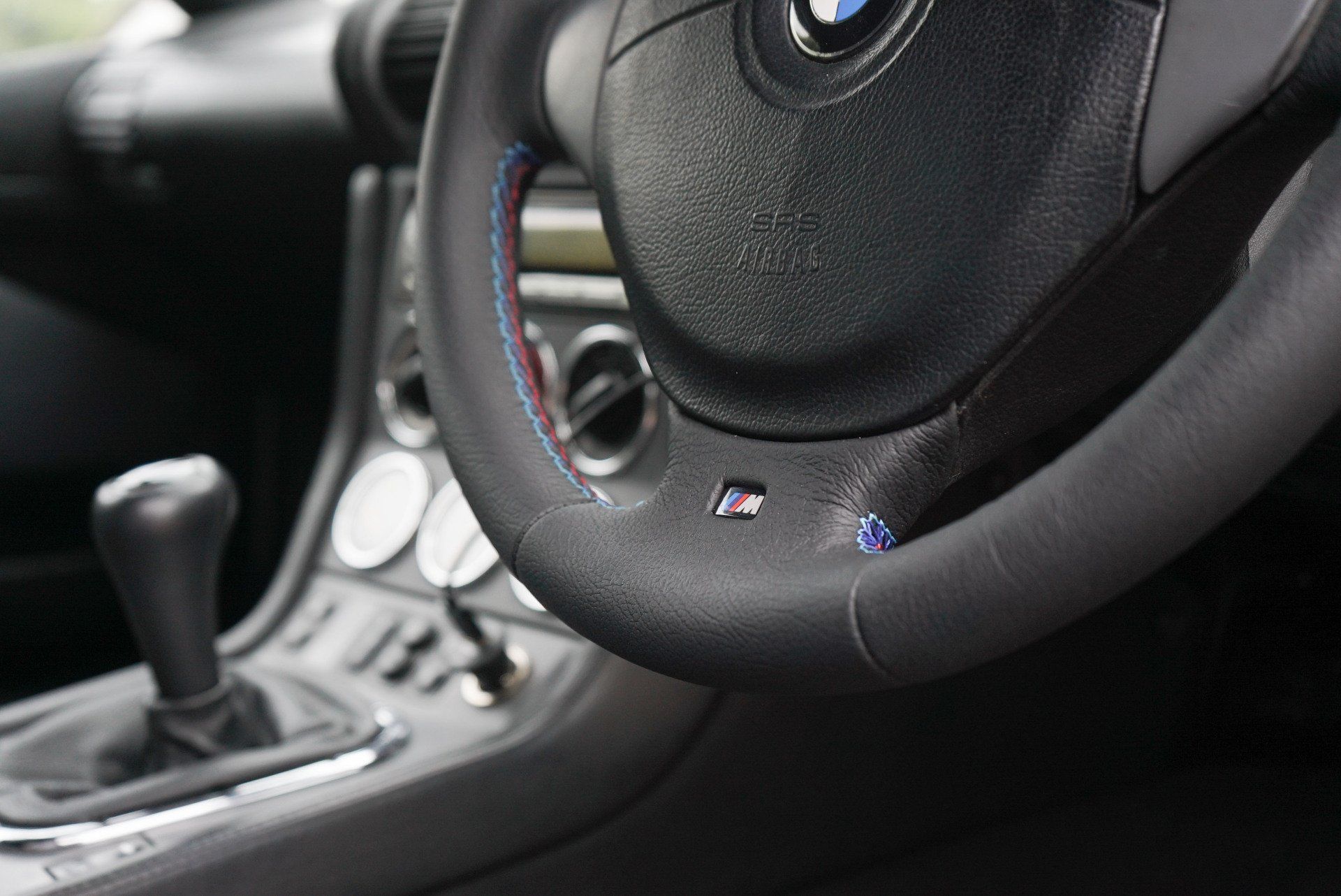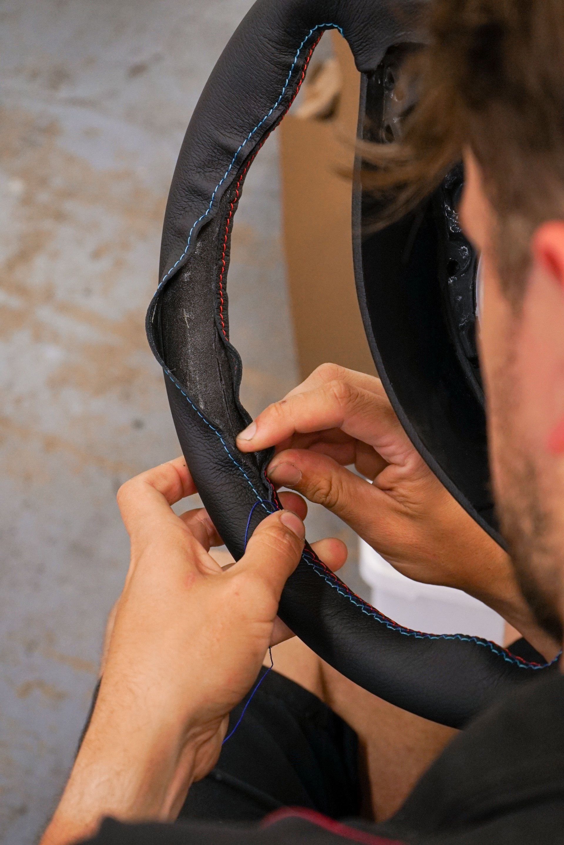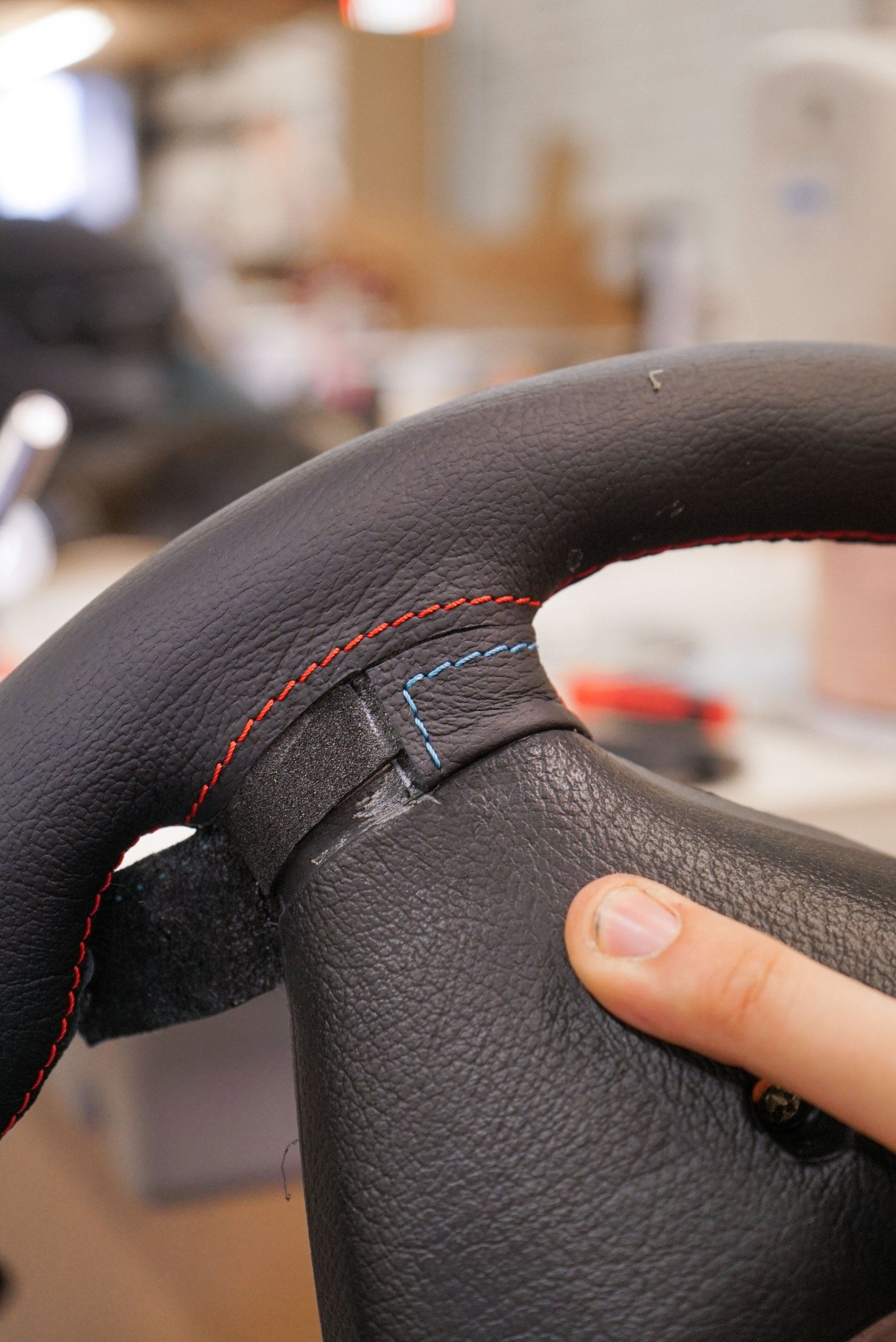 BMW Z3M Coupe which had it's steering wheel retrimmed in black grained leather. The original leather had been completely worn down by years of use and as a result had become shiny and flat. The original wheel also had tri-coloured M stitching which lost all it's colouring from use. The freshly retrimmed wheel now has brand new stitching bringing the interior on this modern classic back up to date.