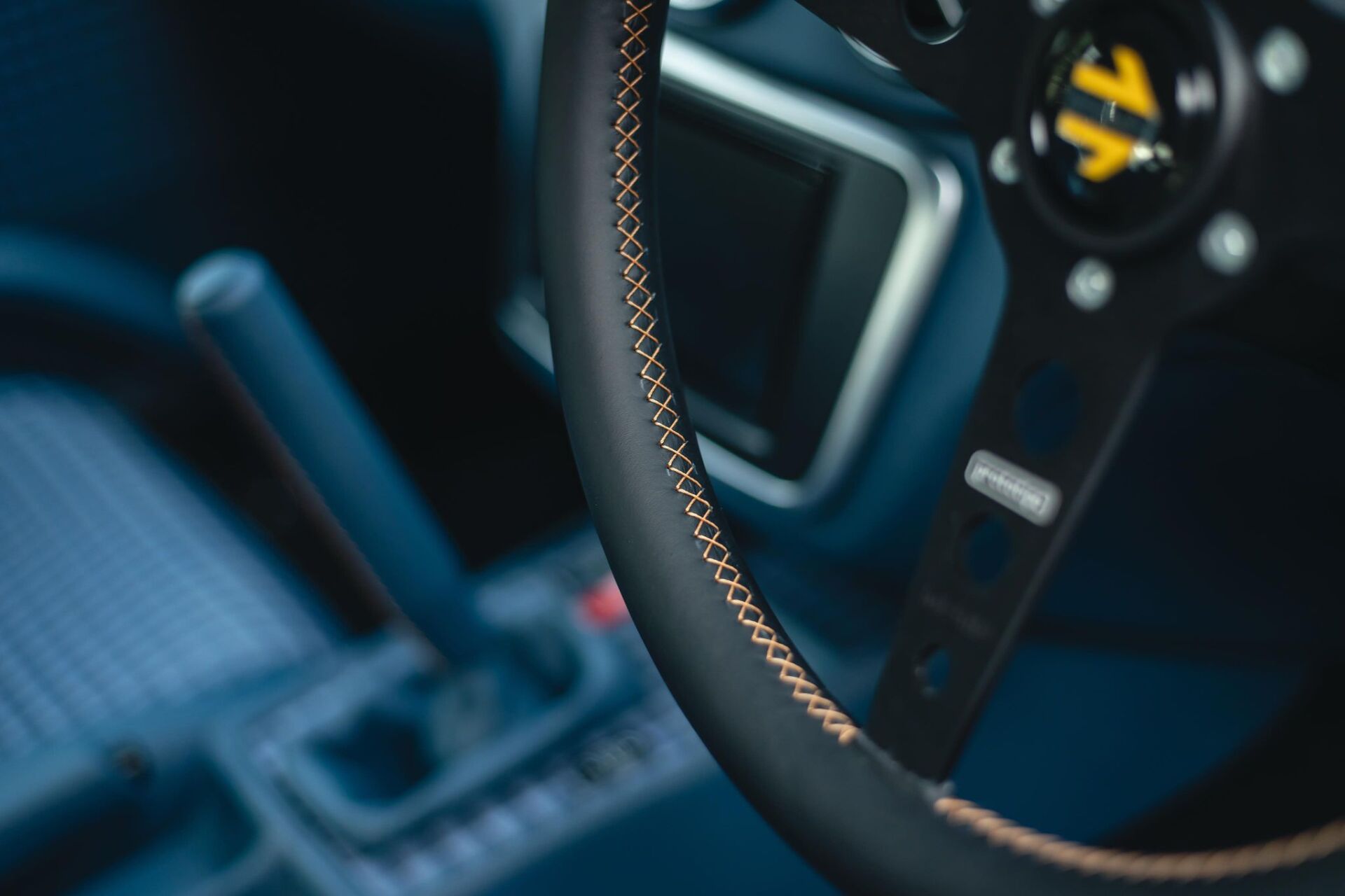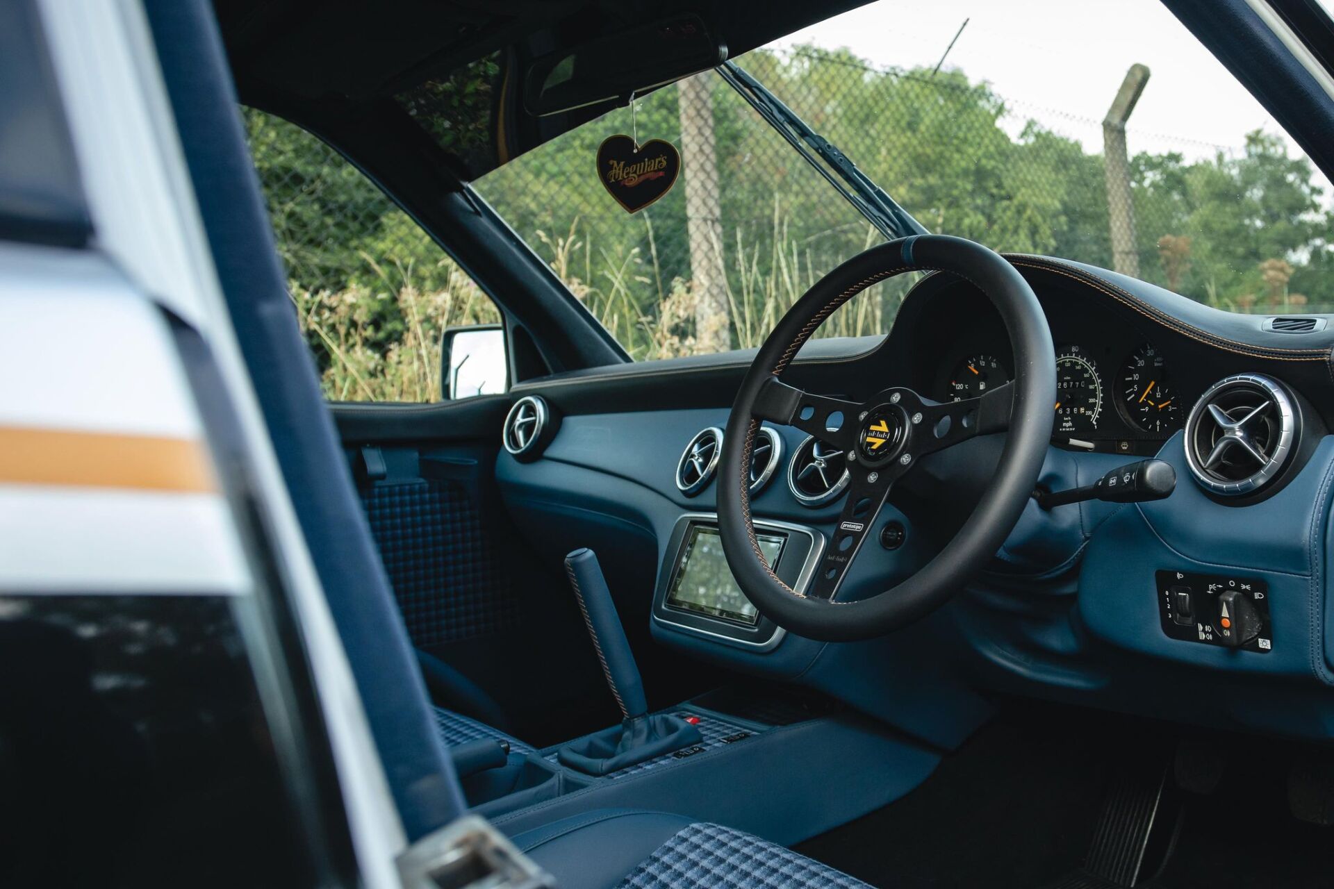 Seats: The seats are from a Mercedes-Benz A45 AMG, they were totally standard with black leather upper and lower bolsters, perforated black leather seat centres with additional red leather accents. This has all now changed with a simplified seat layout and of course colour and material changes. The bolsters have now been retrimmed in blue nappa leather, the seat centres are now Mercedes-Benz blue Karo sports check. for the headrests, Team Old school had them perforated with "05", the same number found on the livery. This is for the year 2005 when d:class was first established.