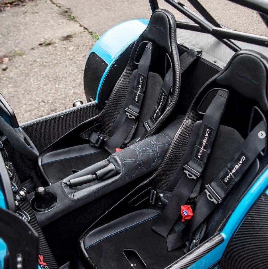 Starting with the steering wheel, this has been retrimmed in charcoal Alcantara with an additional racing band in blue Alcantara. This blue was chosen as it is the closest match to the vehicles paint colour you can find, it only seemed right. With this we knew the thread for the hand stitched wheel had to also match. Last but not least, we swapped out the MOMO logo for the Caterham 7 logo which has been embroidered in the same blue thread.