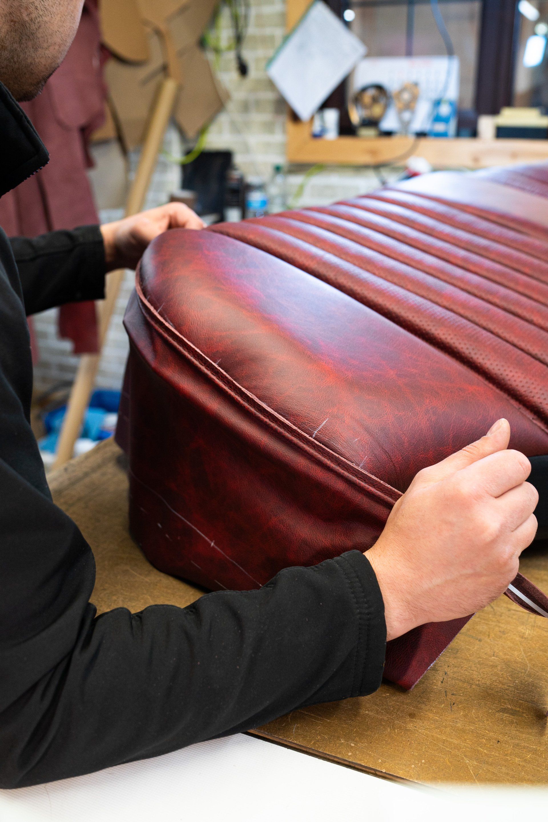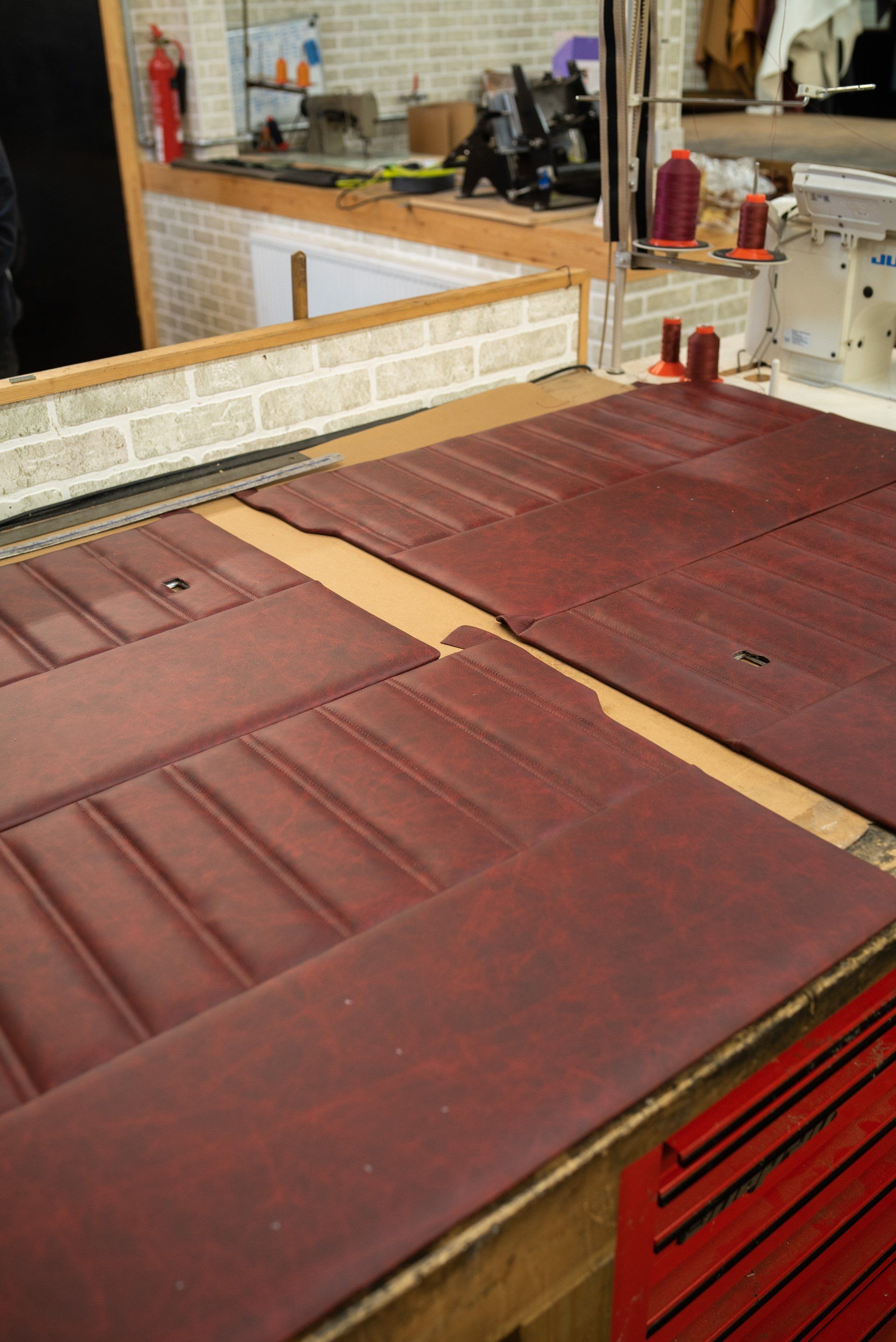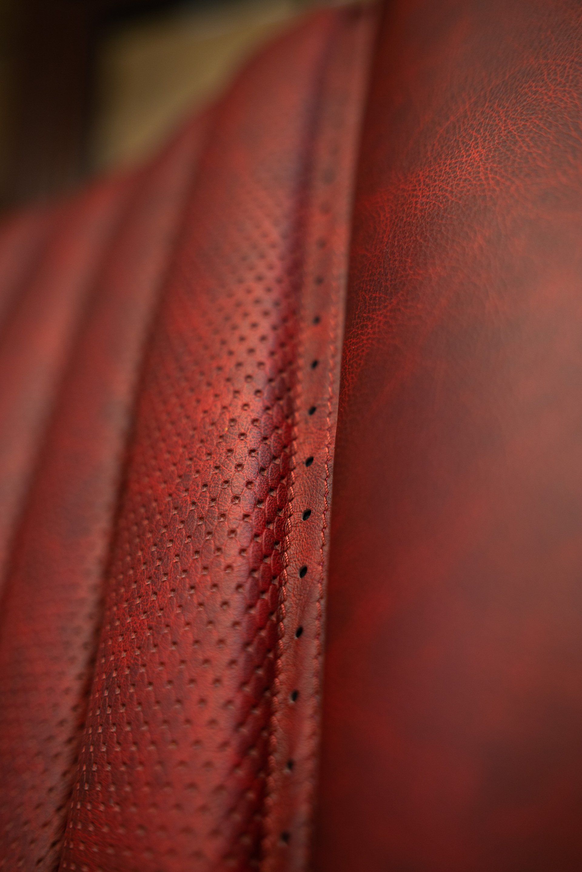 Owner Dougie sat down with David and had a lengthy discussion about what leather to pick for the vehicle. Oxblood red distressed leather was selected and ordered. For the seat centres, we had the leather debossed with period-correct basket weave patterning. Creating these seats from absolutely nothing is nothing short of a masterpiece. They are the definition of tailor-made upholstery.