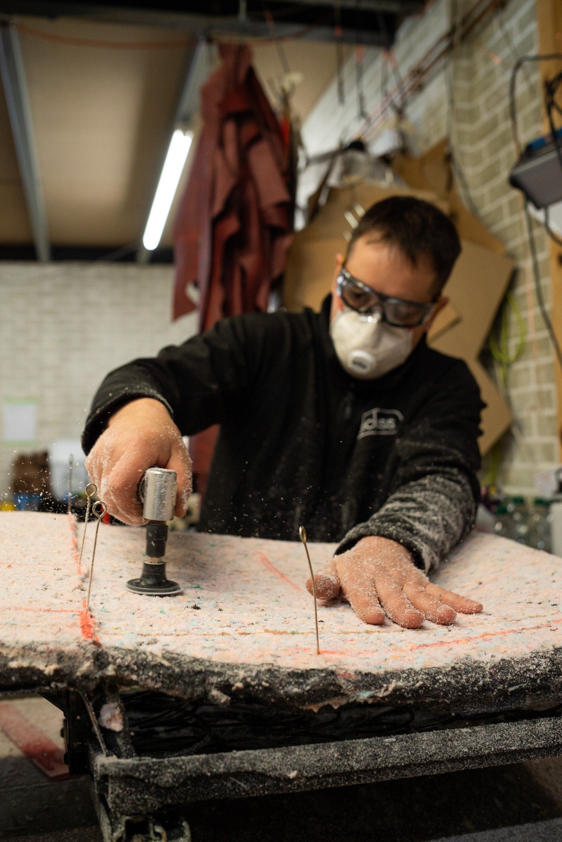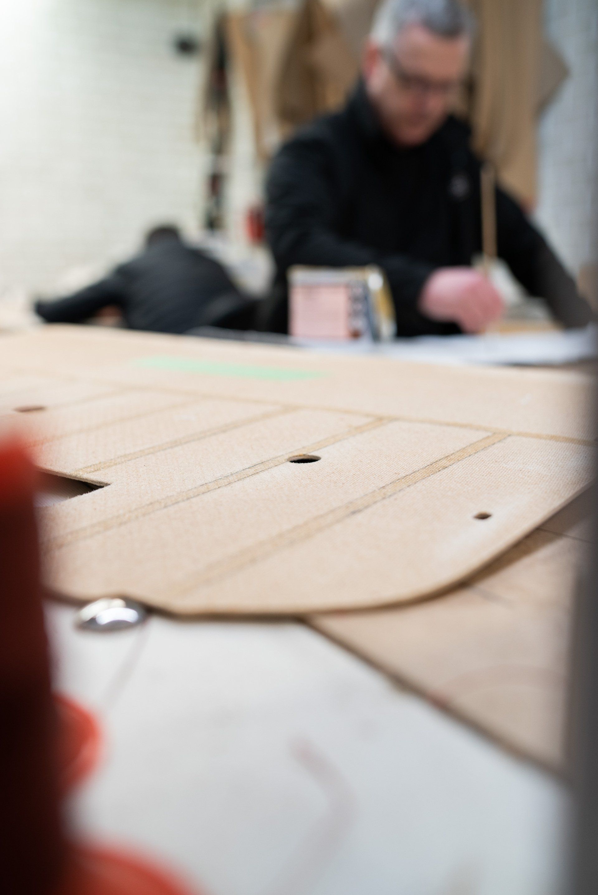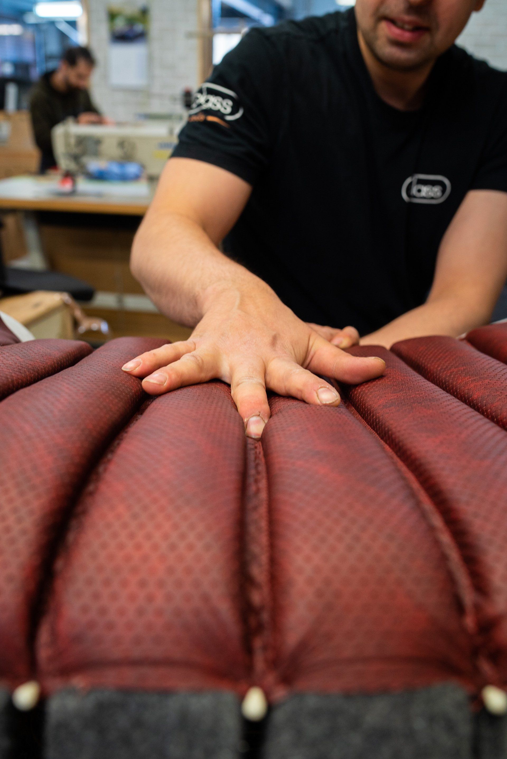 Owner Dougie sat down with David and had a lengthy discussion about what leather to pick for the vehicle. Oxblood red distressed leather was selected and ordered. For the seat centres, we had the leather debossed with period-correct basket weave patterning. Creating these seats from absolutely nothing is nothing short of a masterpiece. They are the definition of tailor-made upholstery.