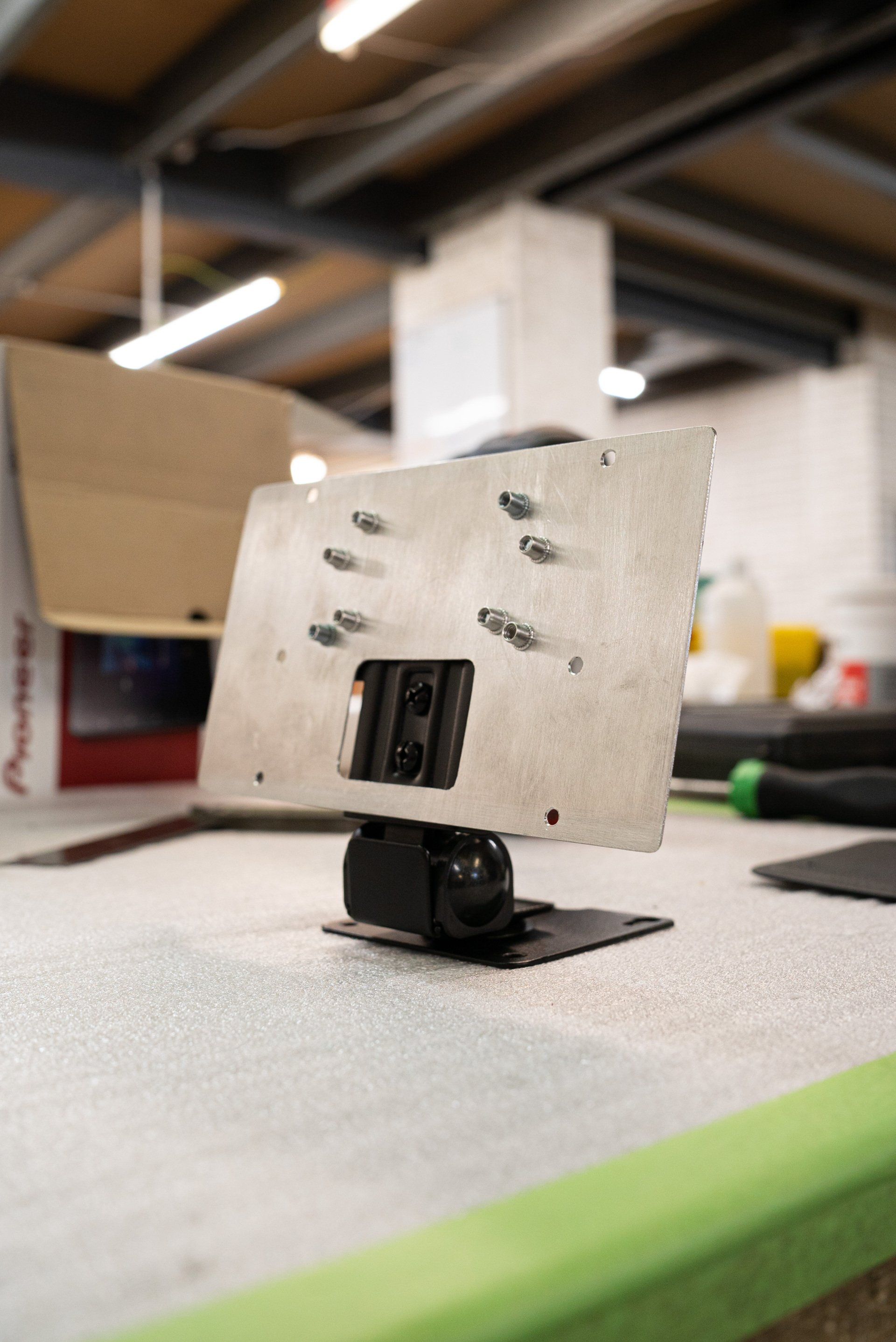 The dashboard is next, another stand-out key feature of this restoration. We were tasked with finding a home for a large entertainment system screen. Dougie wished it to be in the car so he would have his modern comforts like Bluetooth audio and satellite navigation. He also requested the screen to be tucked away when desired, this involved us designing and fabricating a type of hinge to be able to travel without contacting the dashboard. It also had to be able to uphold the weight of the device at all times.