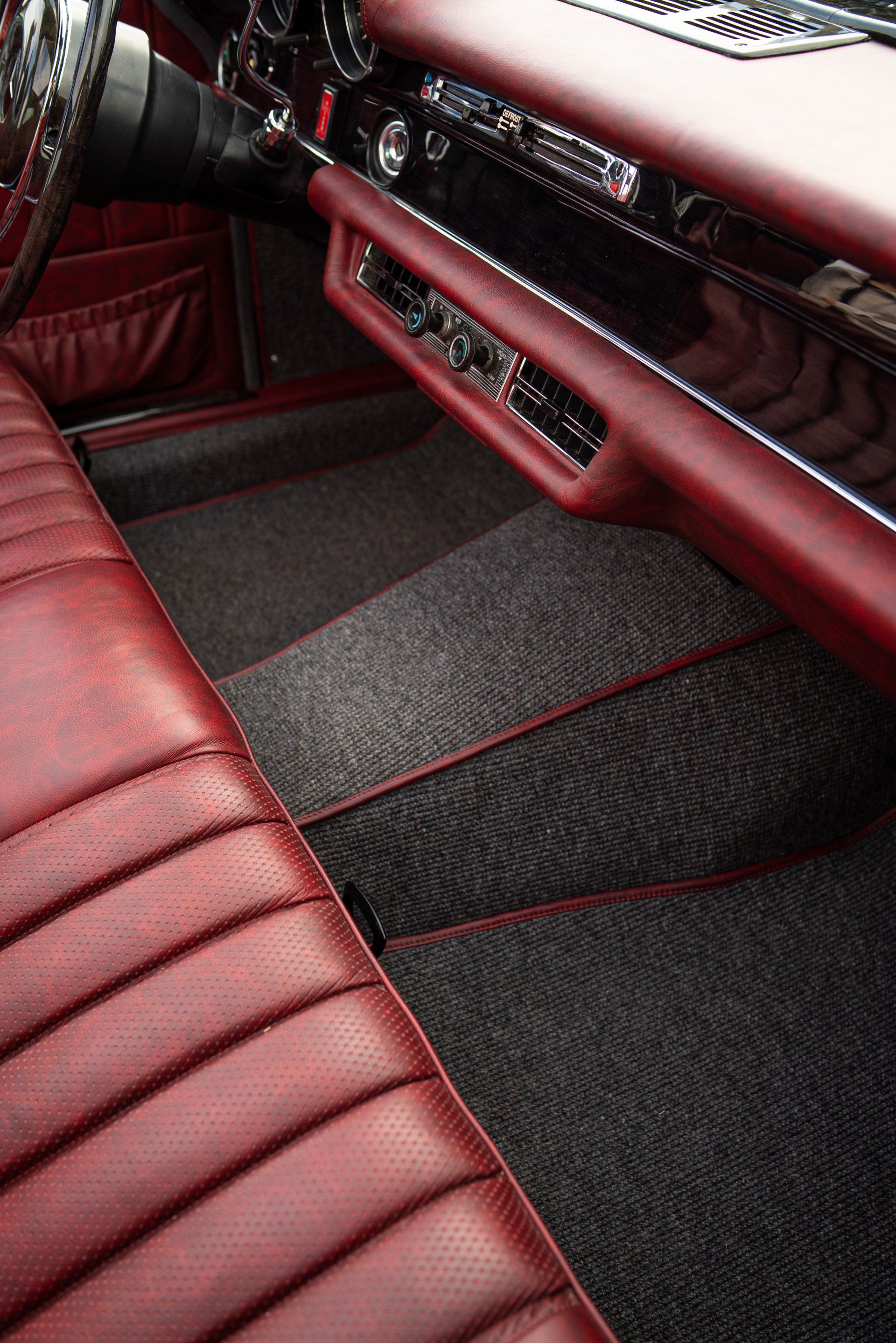 For the carpet, we have used a grey box weave carpet with red leather binding to match the rest of the interior. All of which are custom-made and glued down on top of the Dynamat panels.