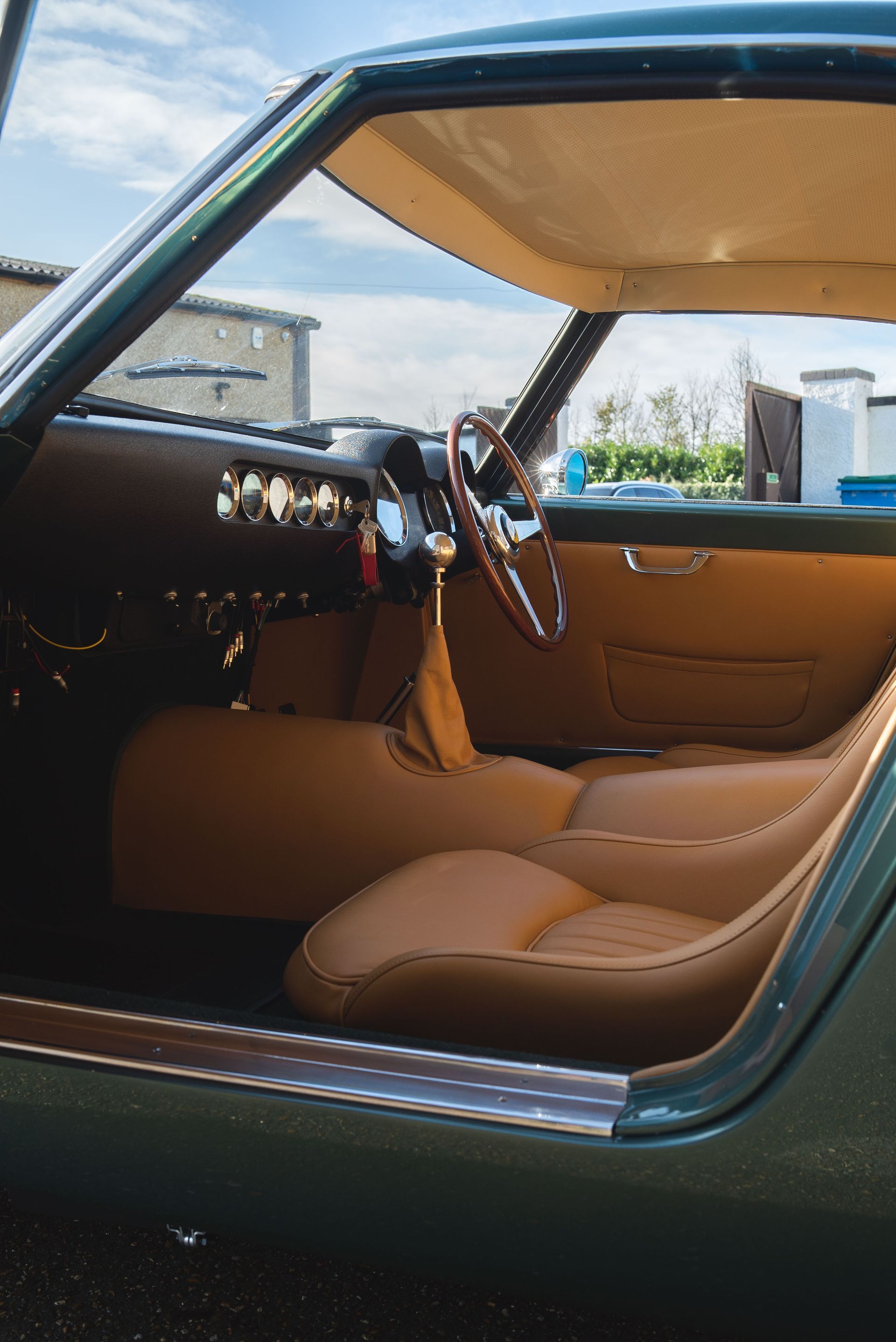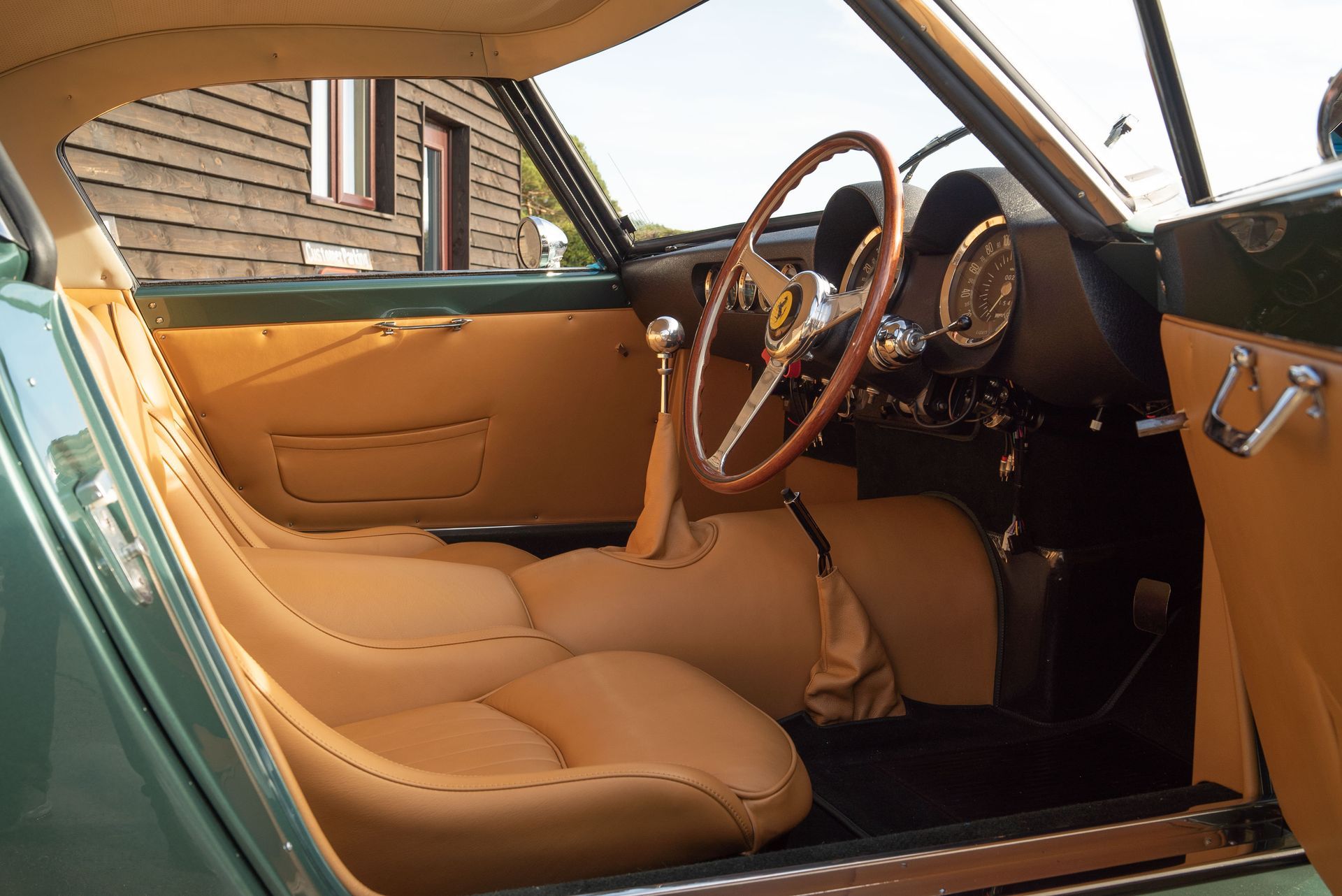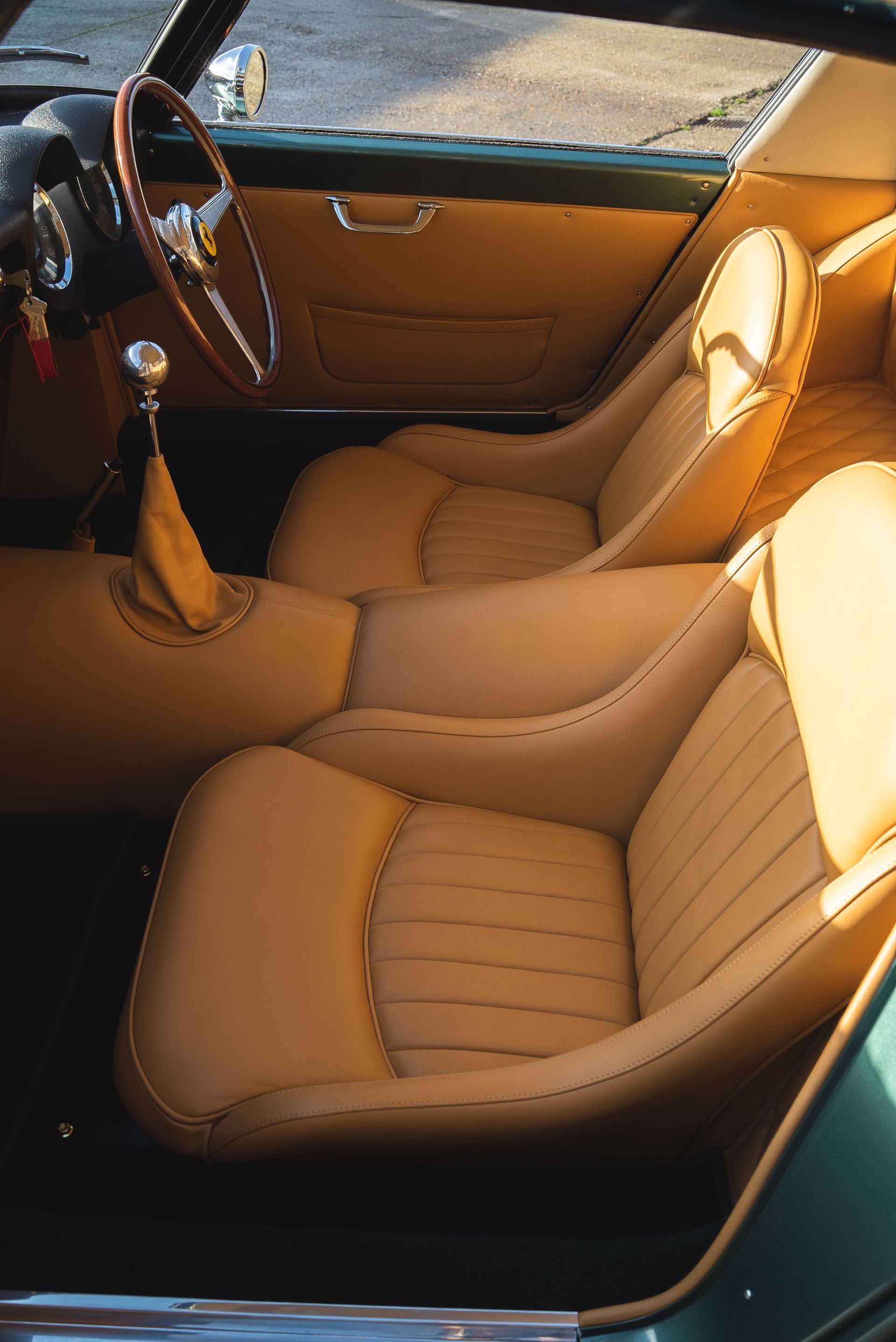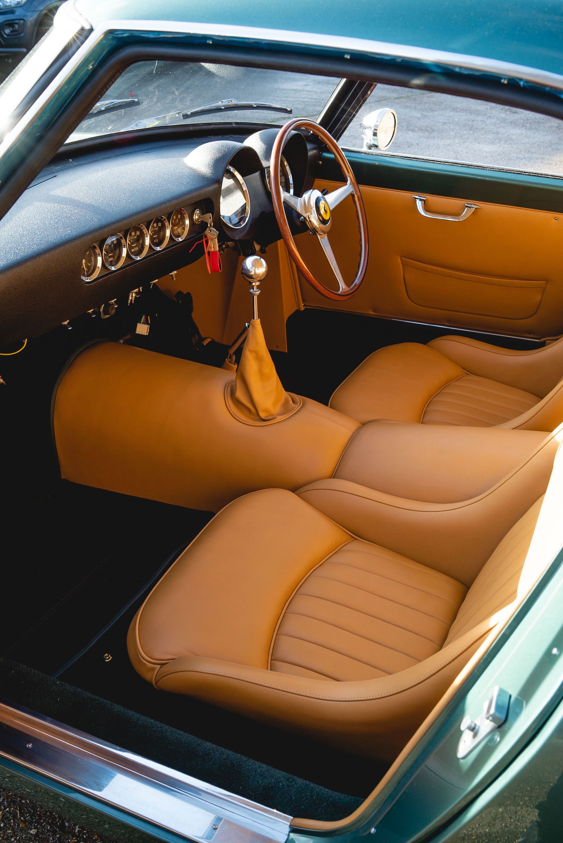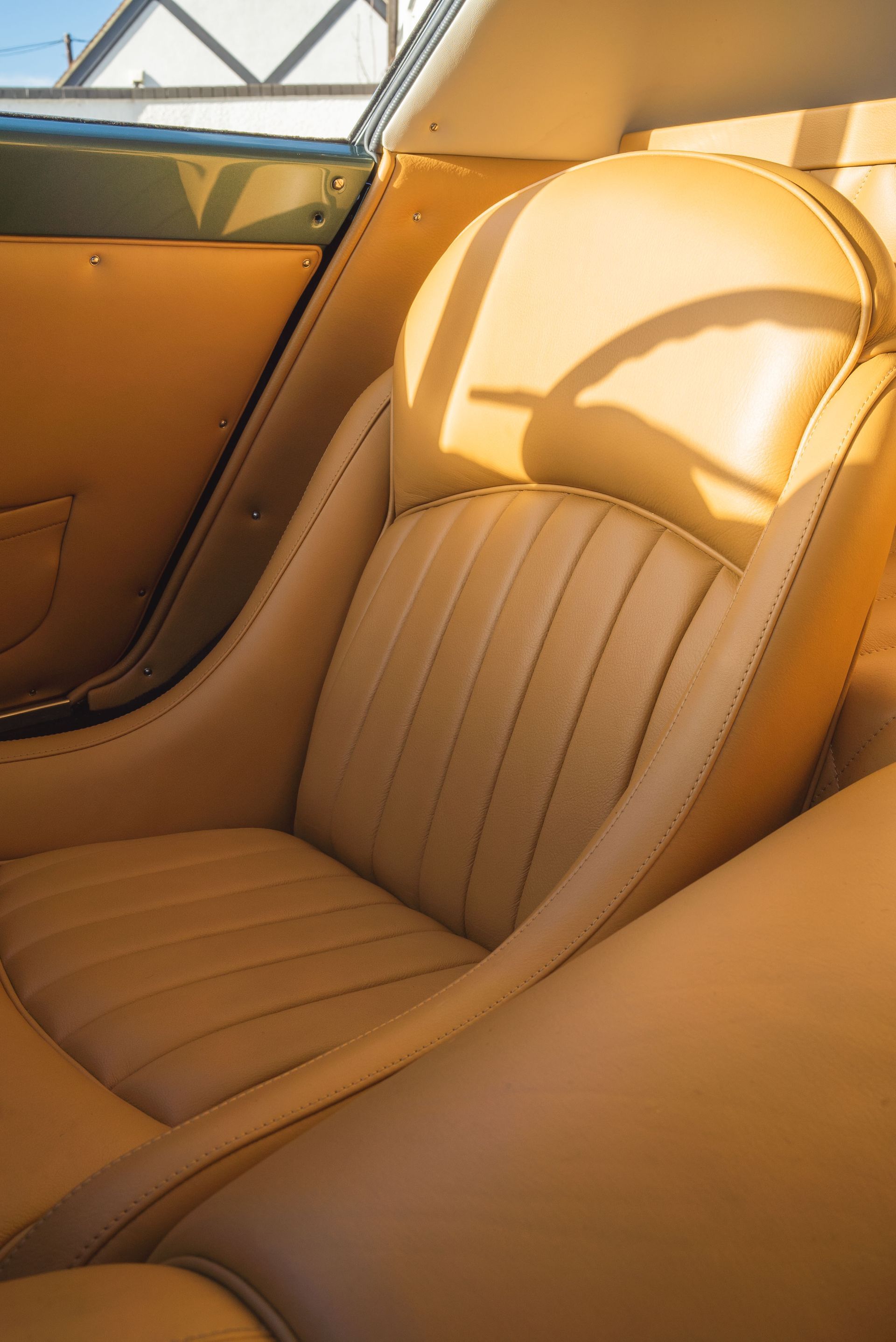 Different from the first Ferrari 250 SWB we trimmed, this one has a leather quilted rear bulkhead in the same tan leather found in the car, compared to the carpeted bulkhead from before.