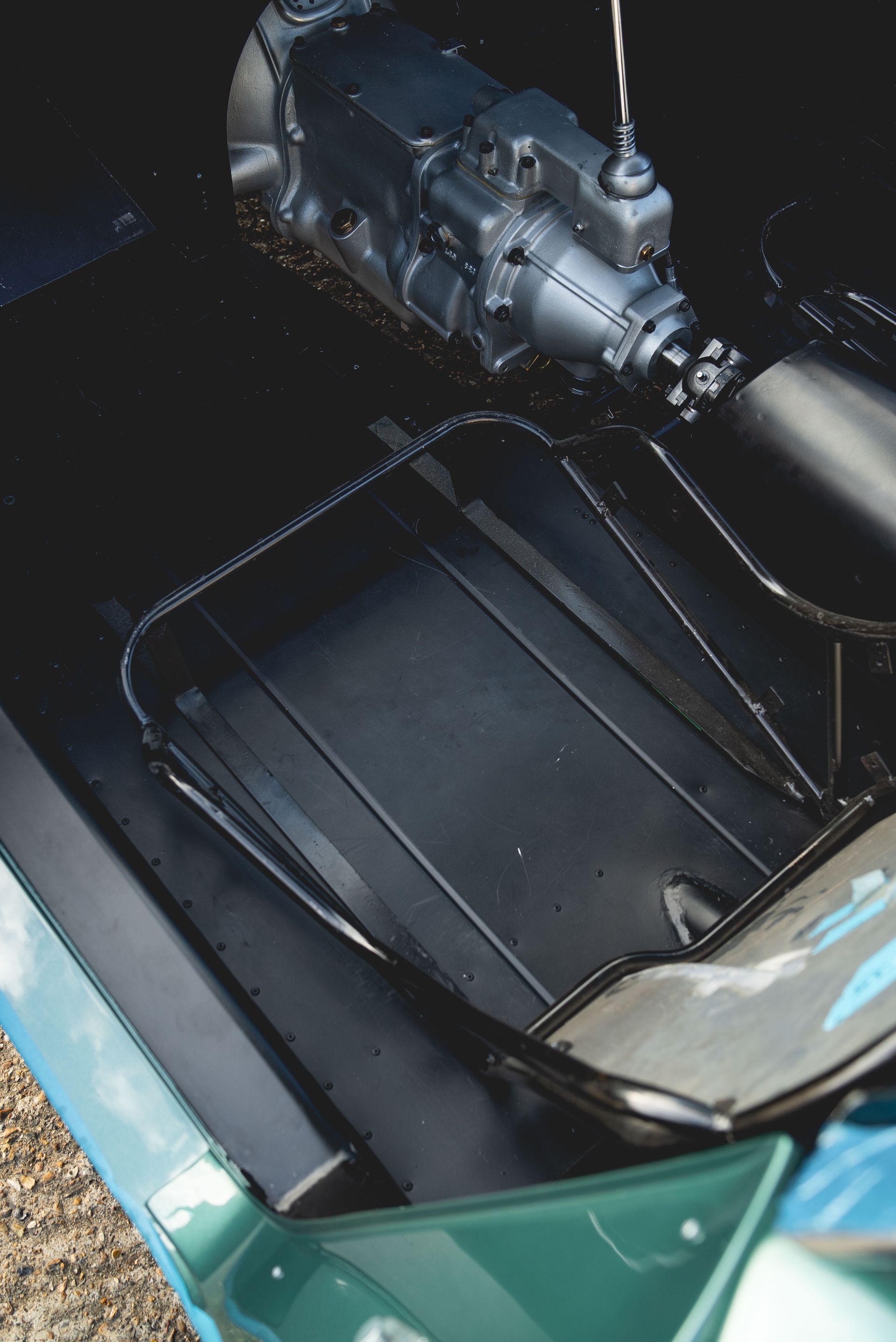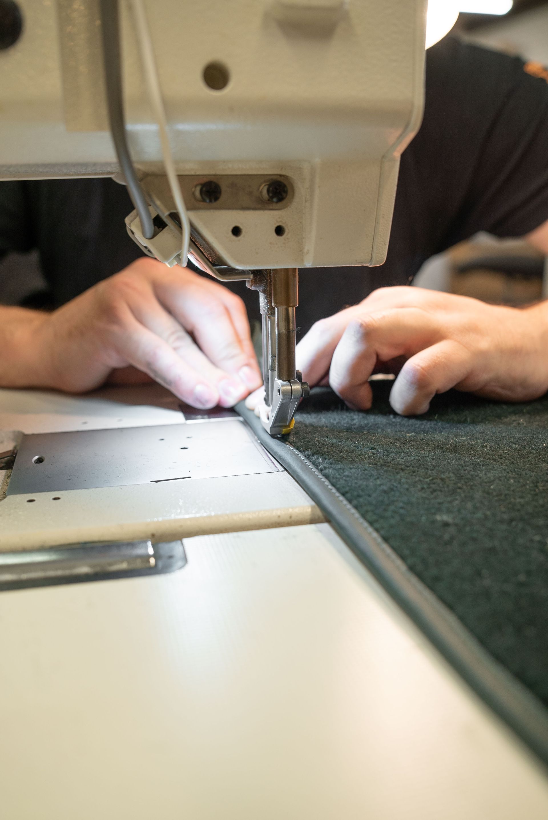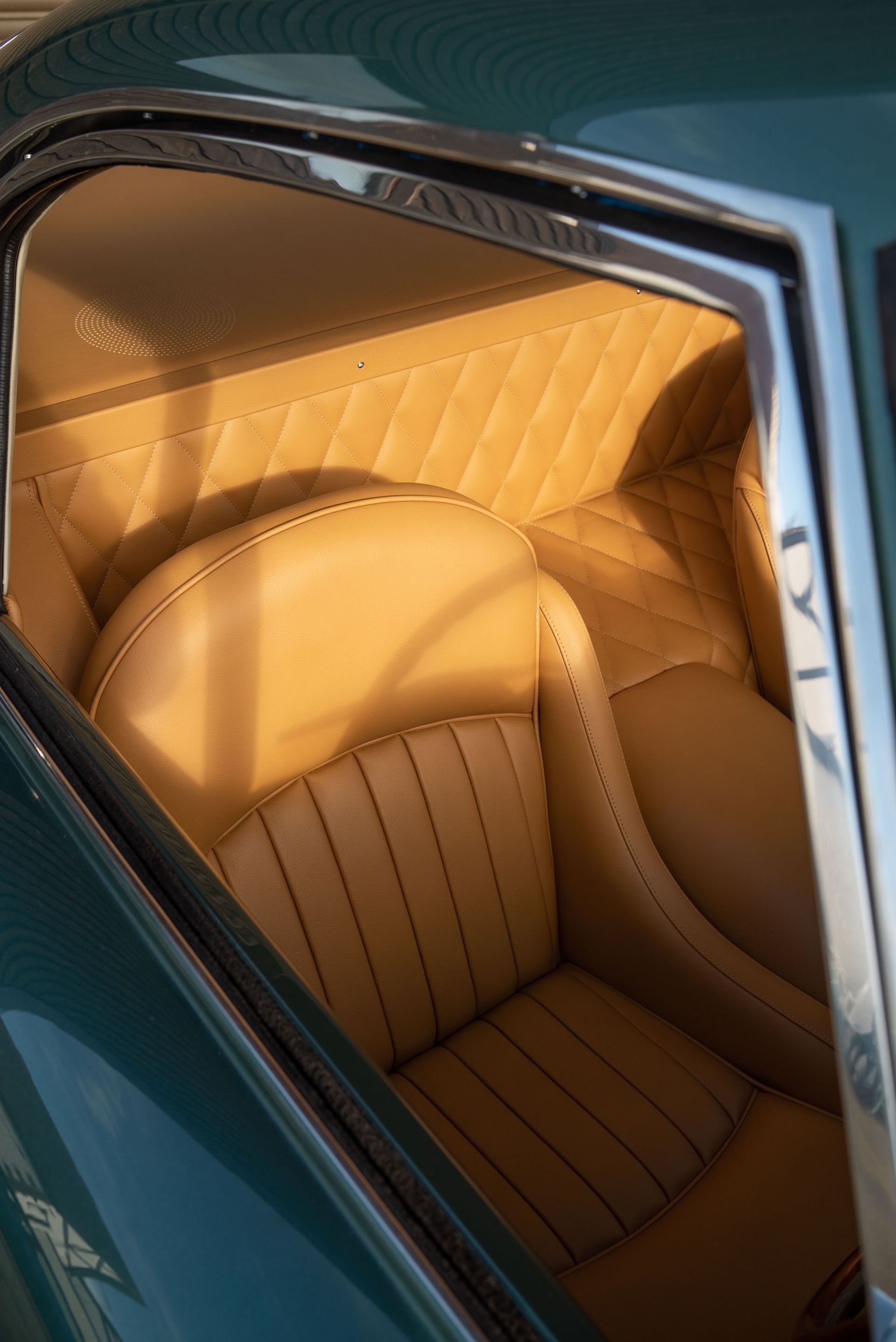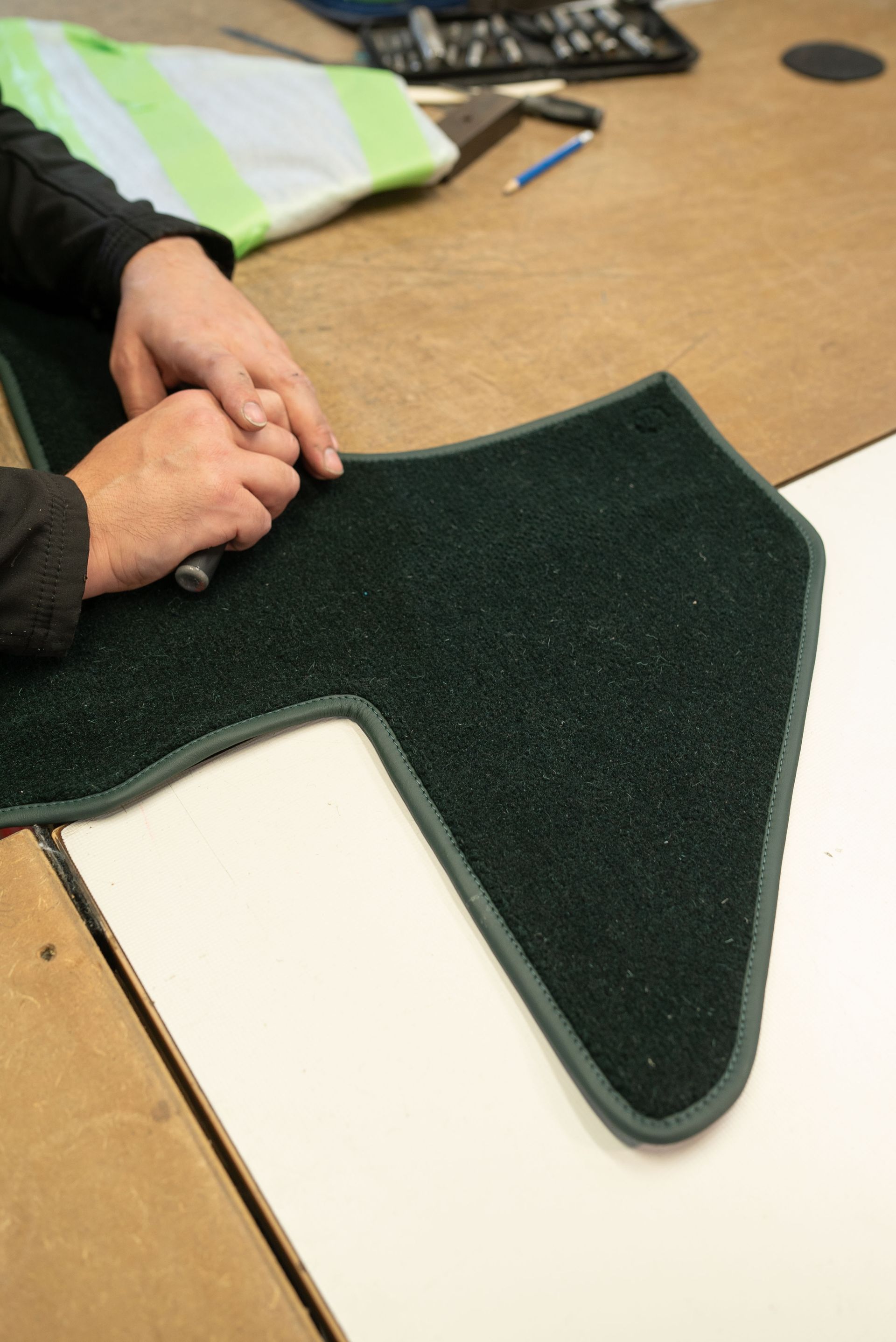 Underneath the seats is the new, and totally bespoke, hunter green carpet from Wilton. The green was selected to match the vehicle's body colour, but a darker shade to emphasize the light tan interior. The carpet has green binding with matching green stitching, this is also found on the floor/over mats.