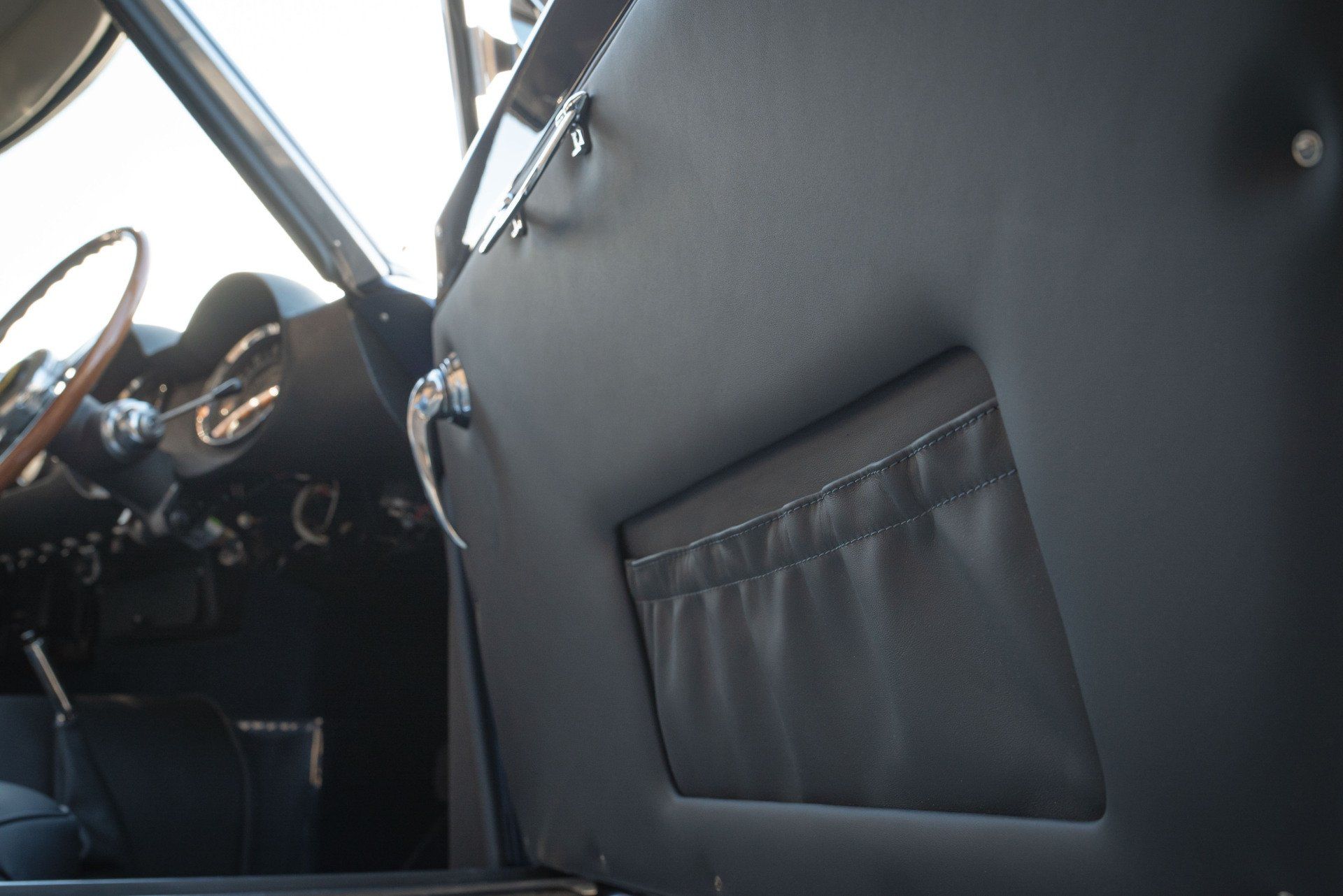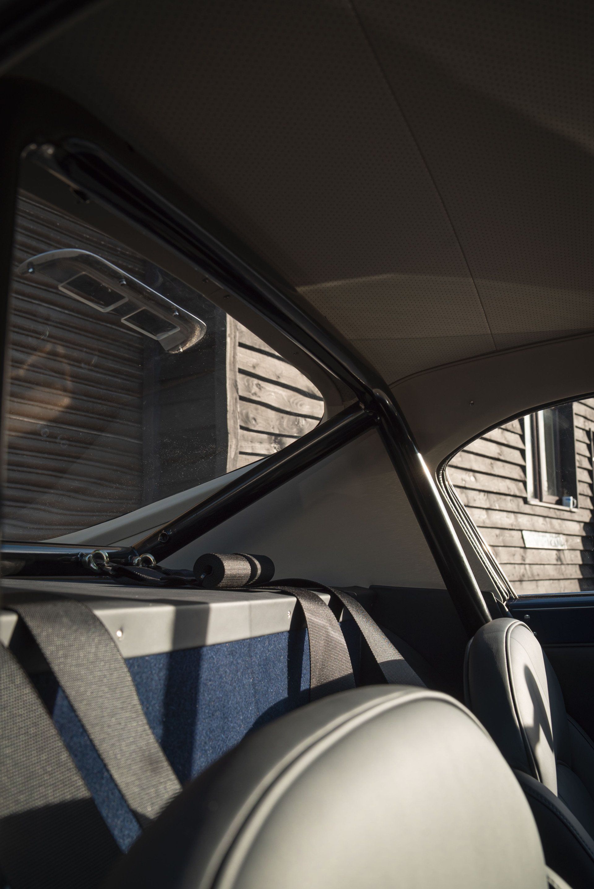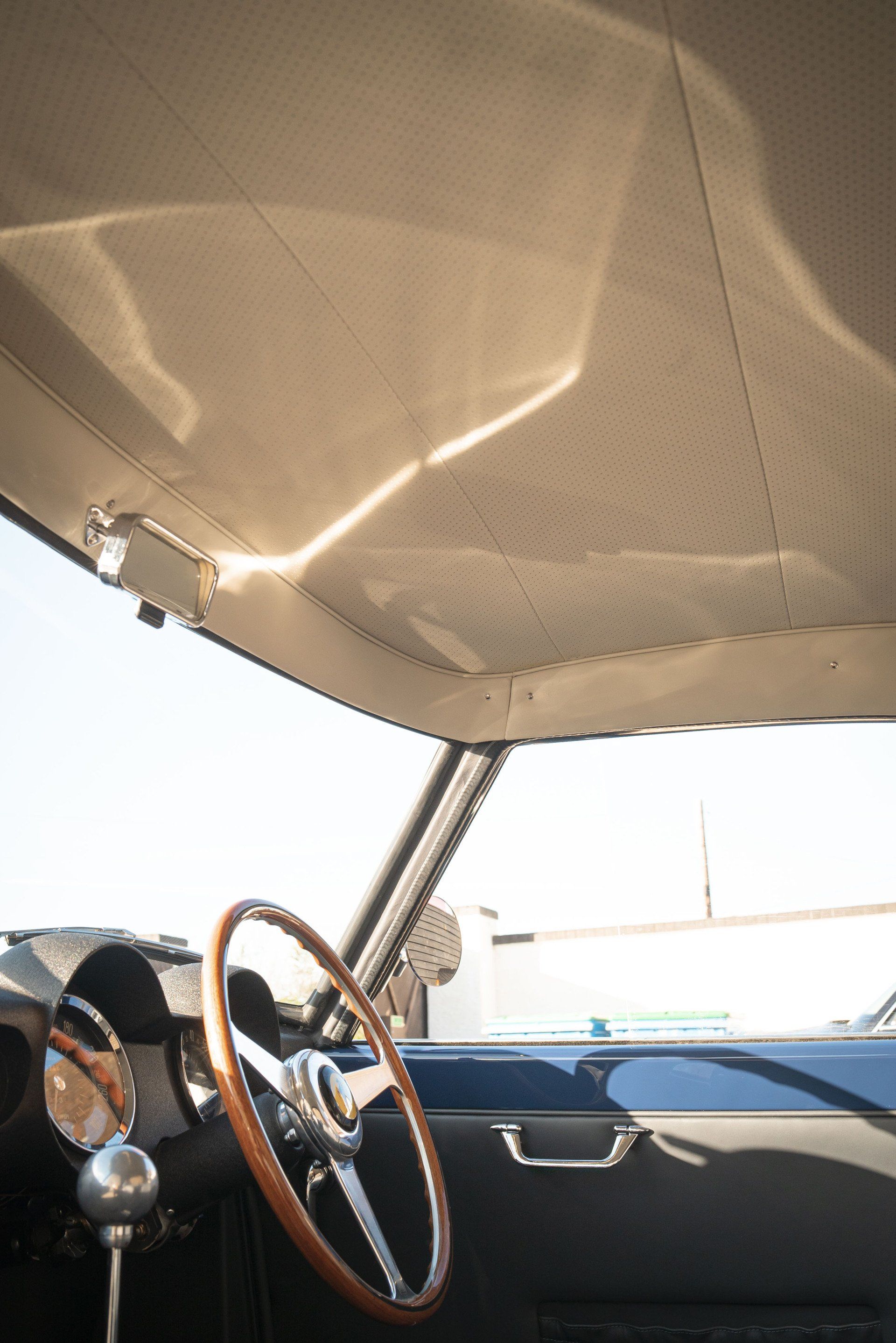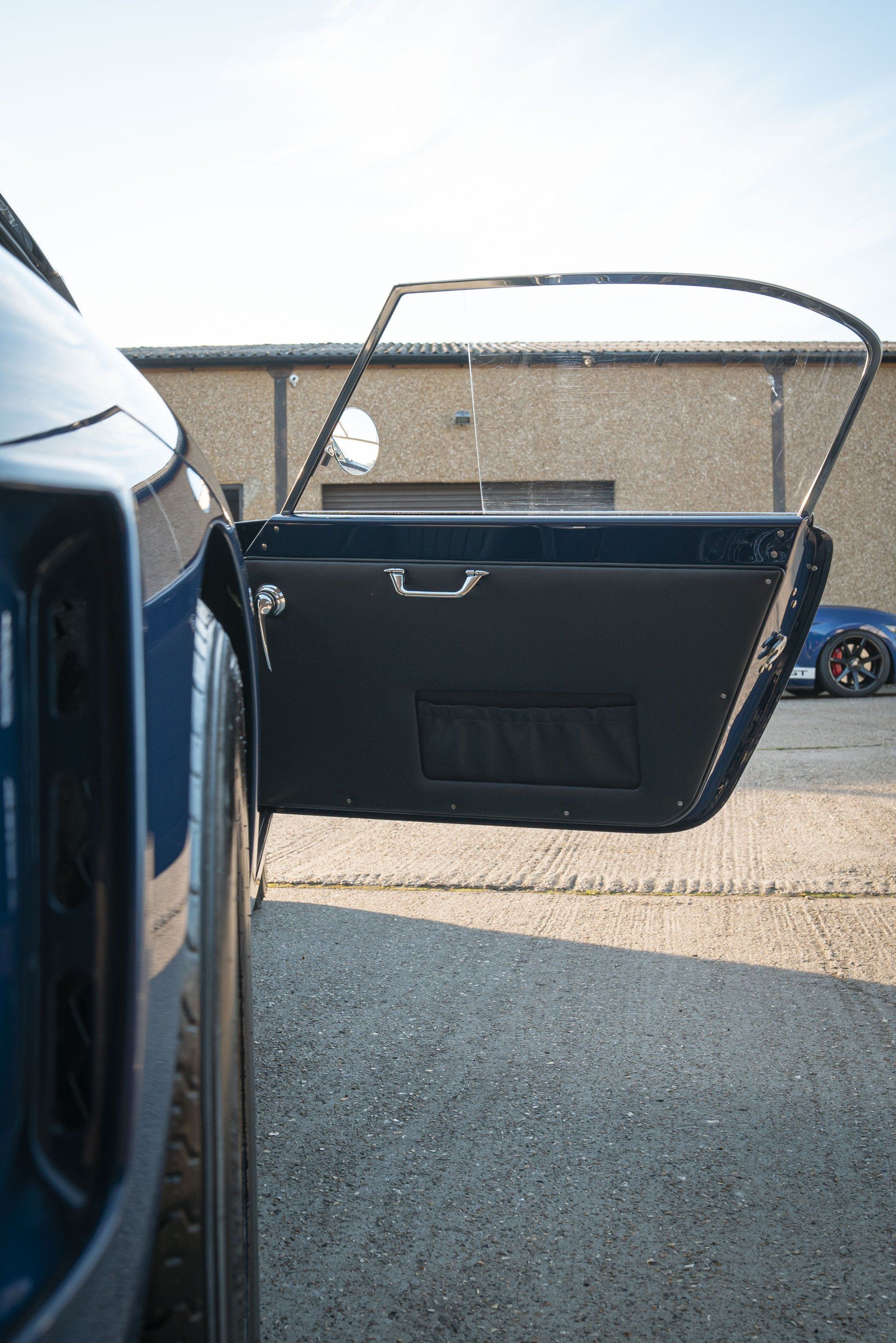 Starting off with the seats, these are very special and totally custom. Essentially starting with just bare mental frames, we have created a totally unique pair of period correct seats that have been trimmed entirely by traditional trimming means. Deep Blue nappa leather from the Autocalf range by UK Hide co has been used for these seats, the leather carries on to the door cards and transmission tunnel. The headliner has also been retrimmed in a cream perforated leather, accompanied with matching B pillar panels. Last but not least is the carpet, made from scratch with Deep Blue Wilton carpet.