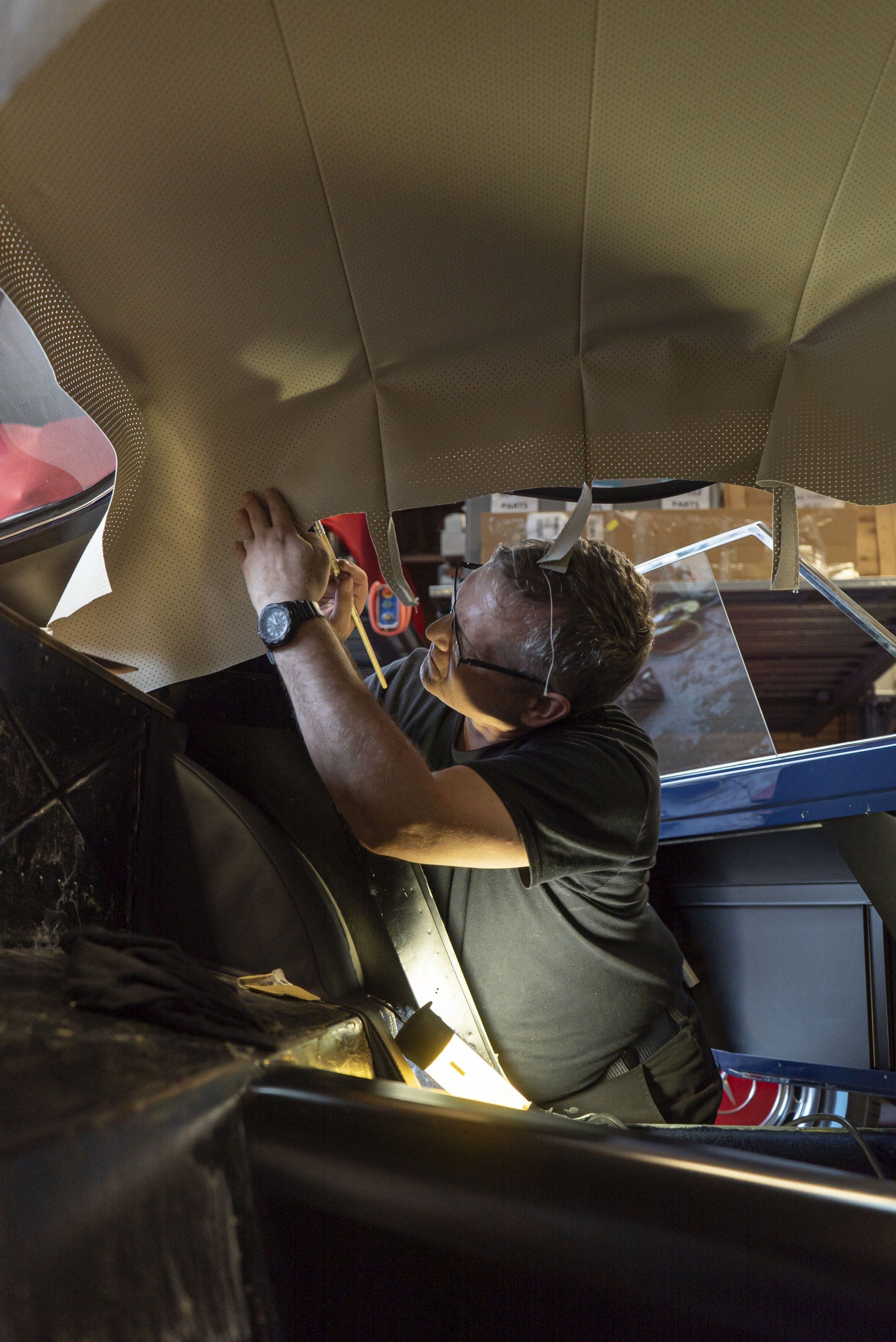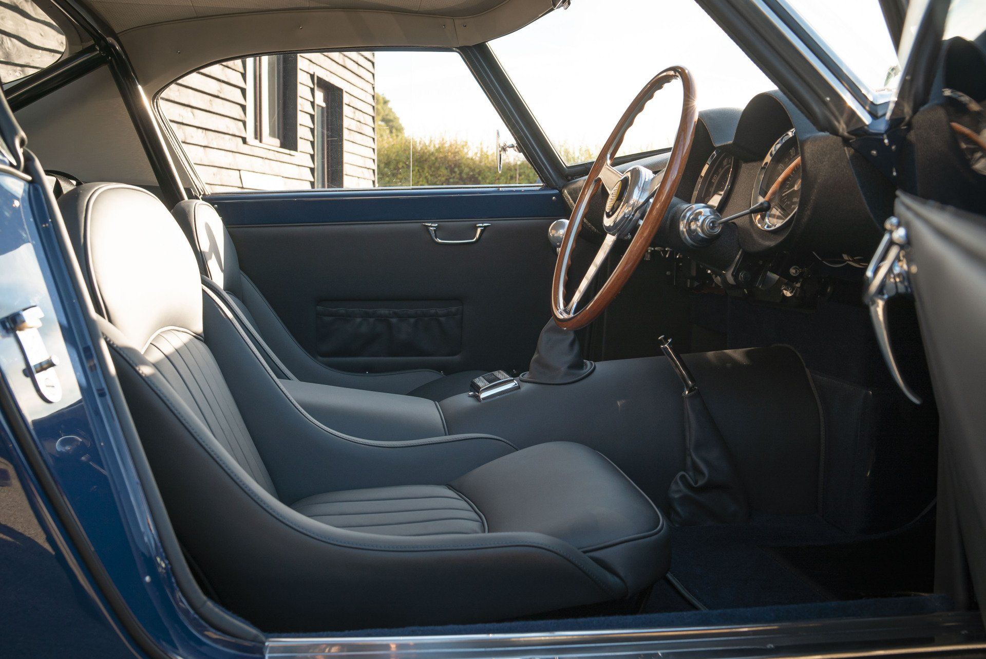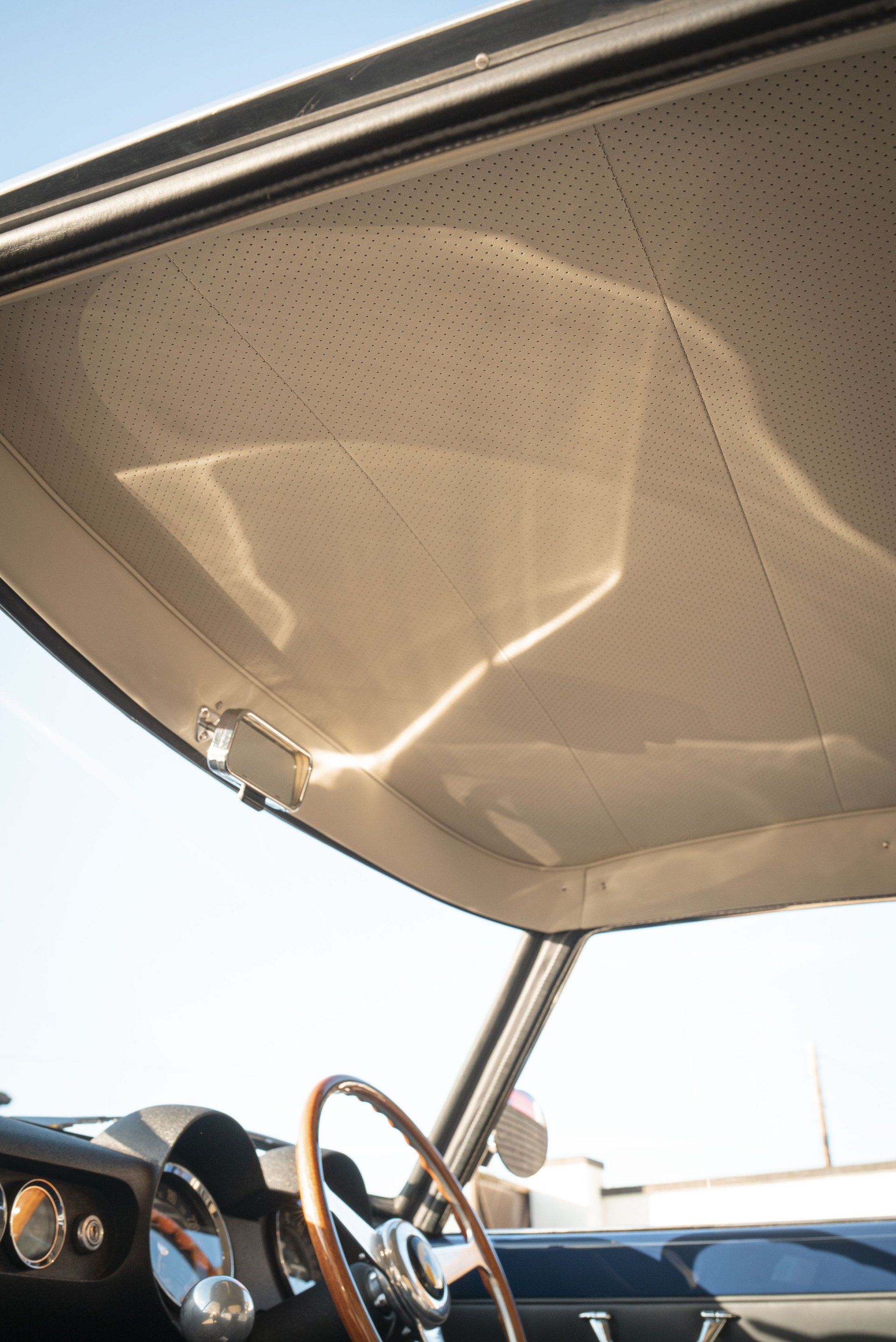 Starting off with the seats, these are very special and totally custom. Essentially starting with just bare mental frames, we have created a totally unique pair of period correct seats that have been trimmed entirely by traditional trimming means. Deep Blue nappa leather from the Autocalf range by UK Hide co has been used for these seats, the leather carries on to the door cards and transmission tunnel. The headliner has also been retrimmed in a cream perforated leather, accompanied with matching B pillar panels. Last but not least is the carpet, made from scratch with Deep Blue Wilton carpet.