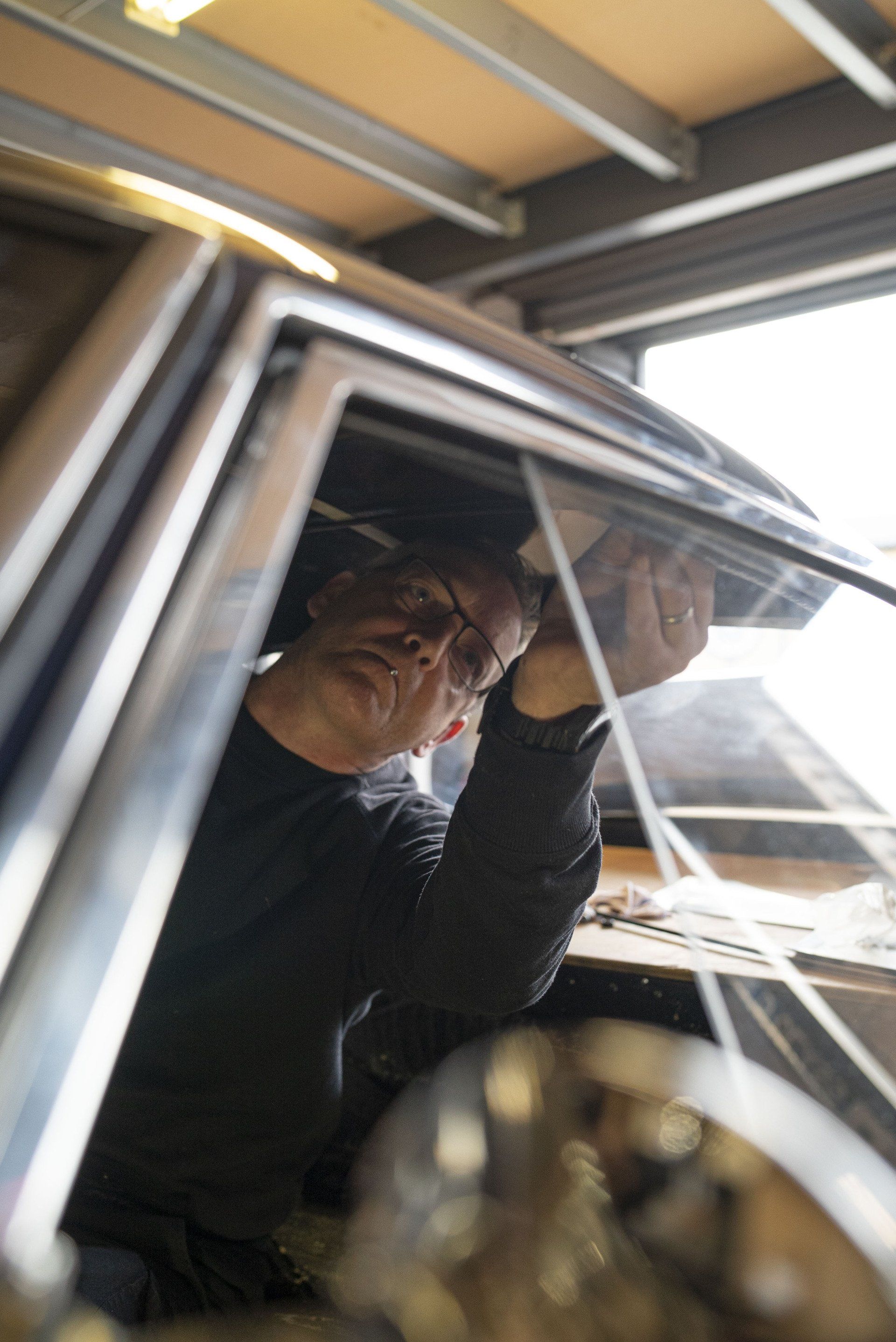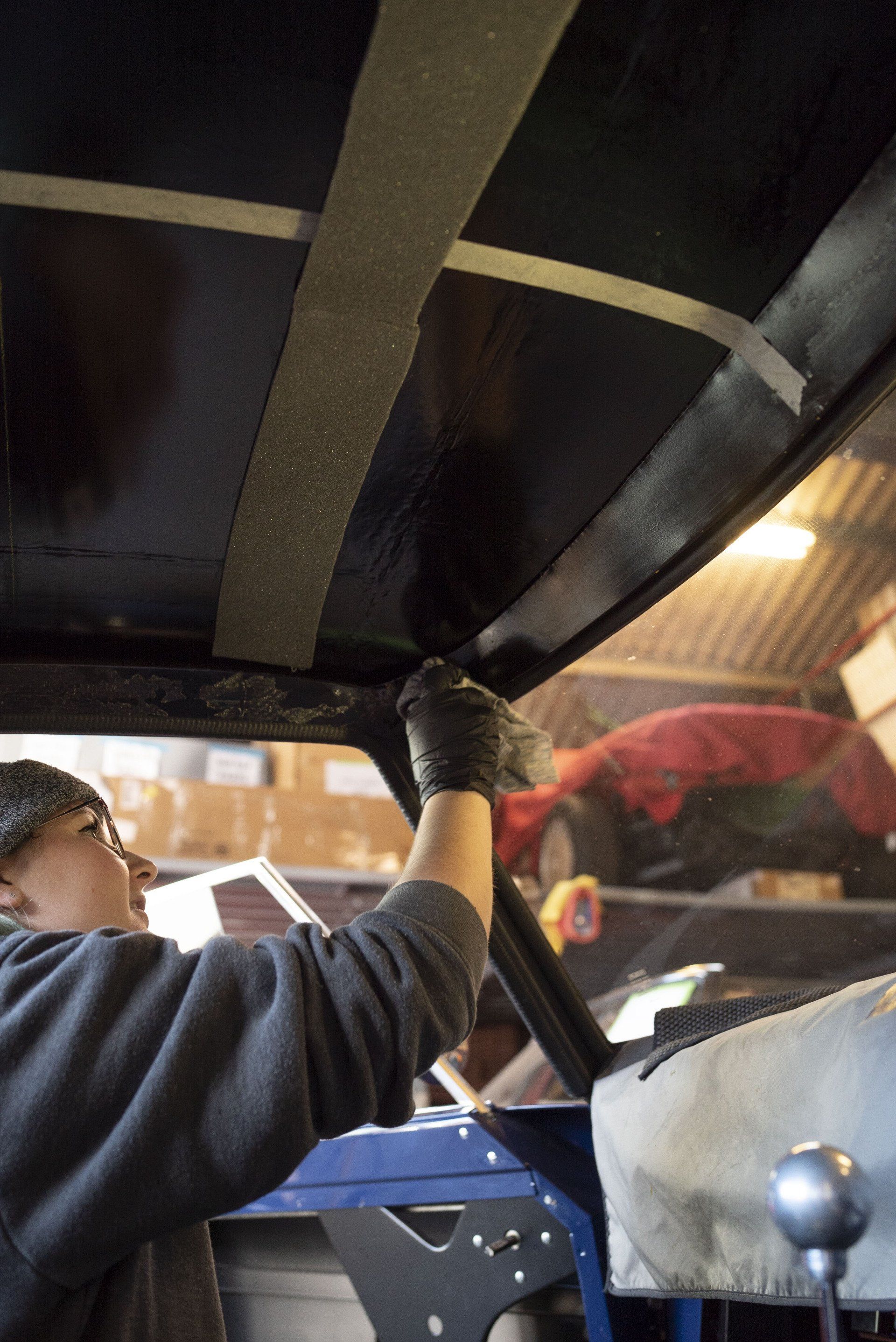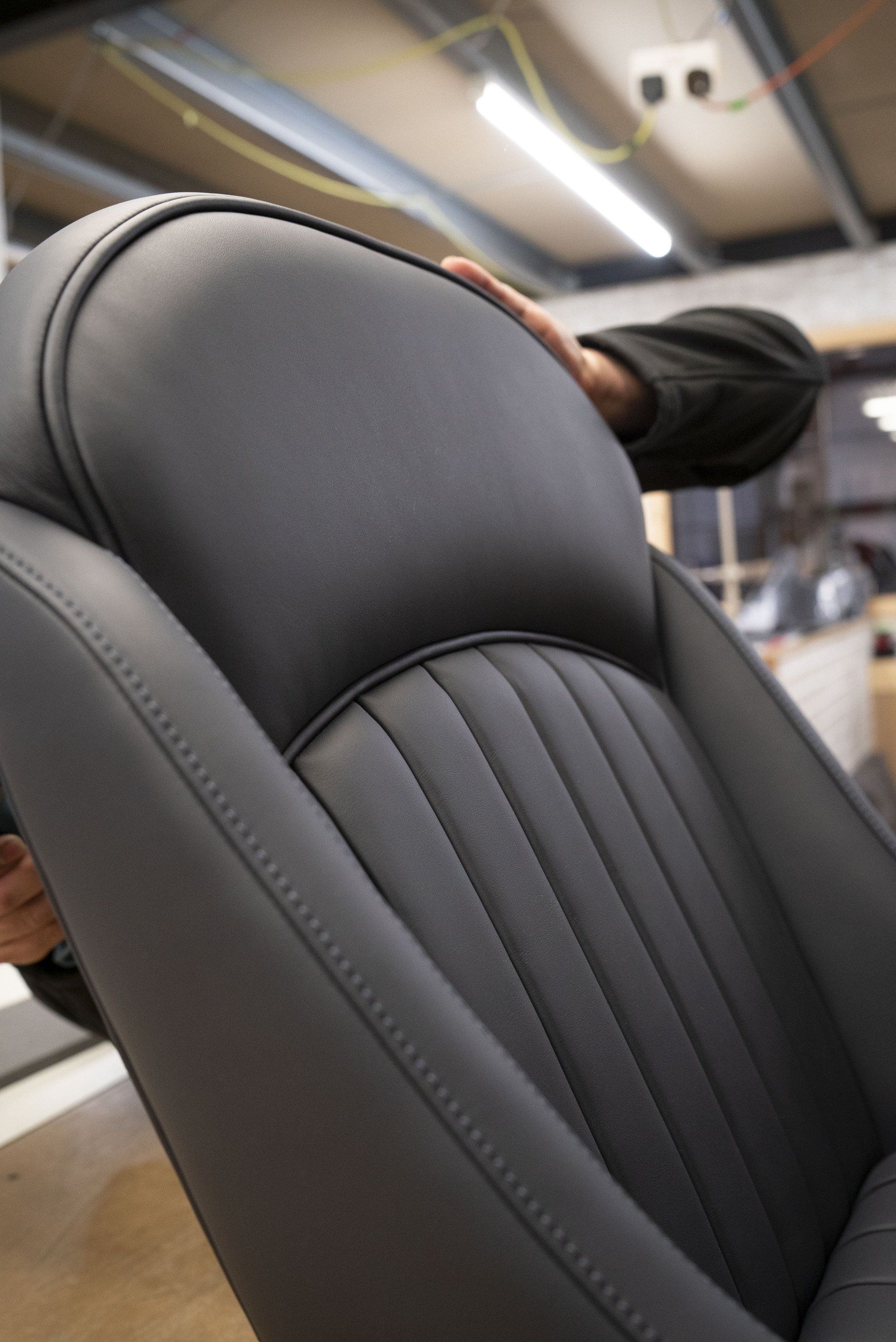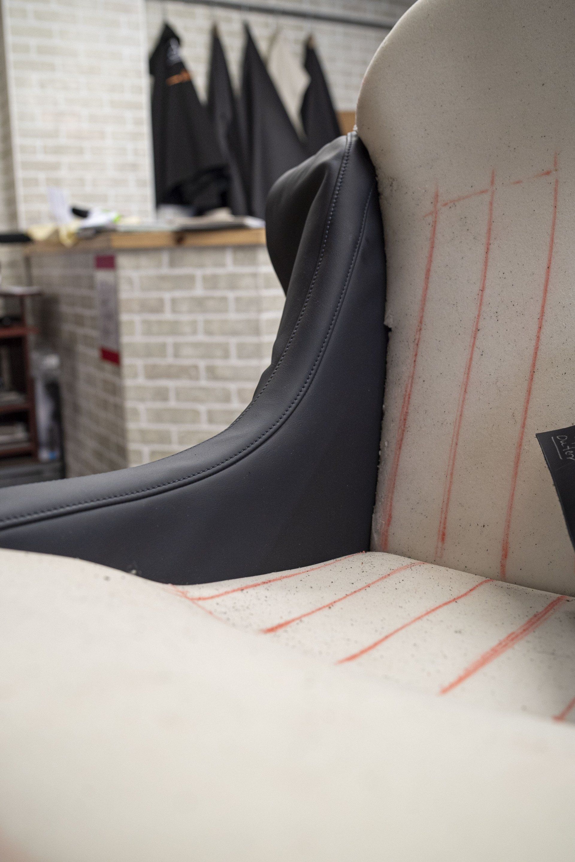 Starting off with the seats, these are very special and totally custom. Essentially starting with just bare mental frames, we have created a totally unique pair of period correct seats that have been trimmed entirely by traditional trimming means. Deep Blue nappa leather from the Autocalf range by UK Hide co has been used for these seats, the leather carries on to the door cards and transmission tunnel. The headliner has also been retrimmed in a cream perforated leather, accompanied with matching B pillar panels. Last but not least is the carpet, made from scratch with Deep Blue Wilton carpet.