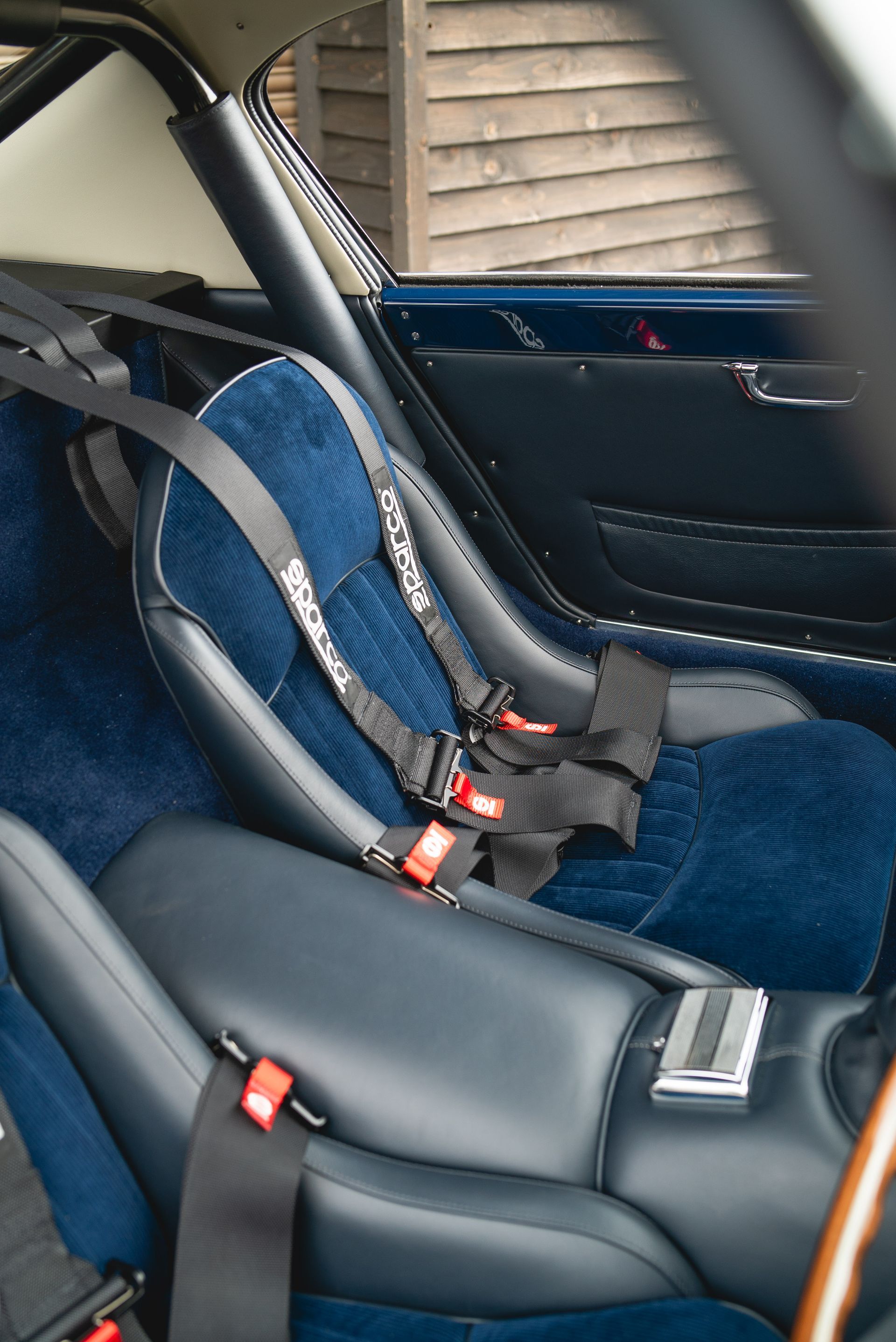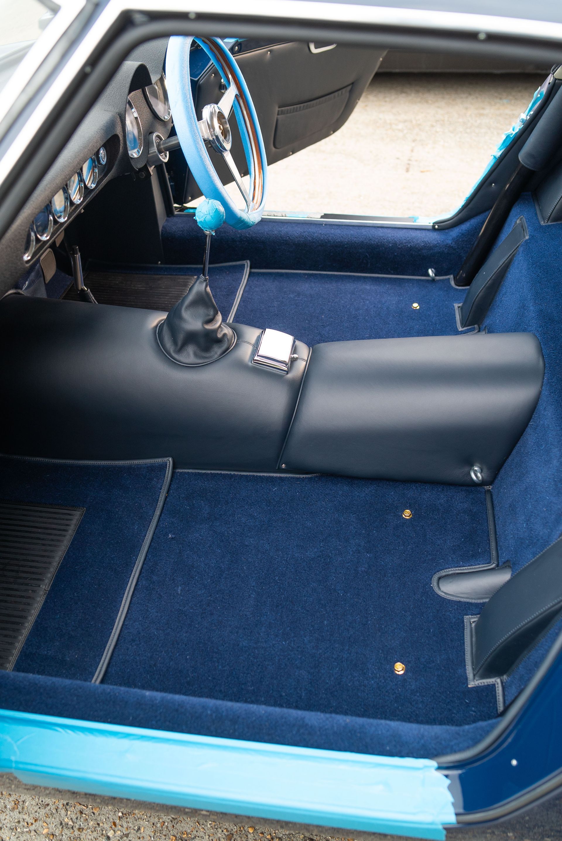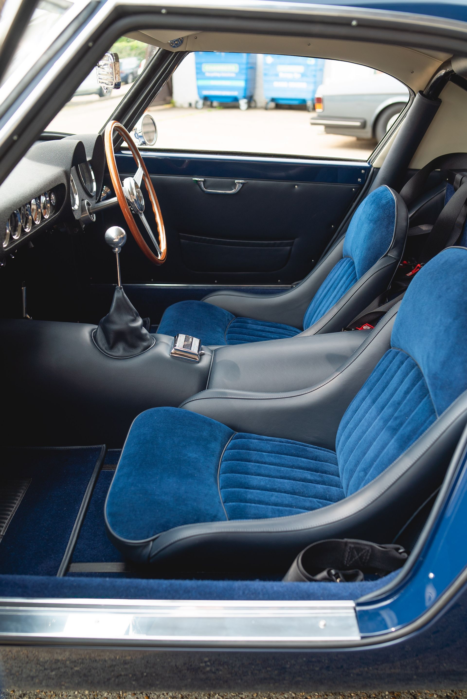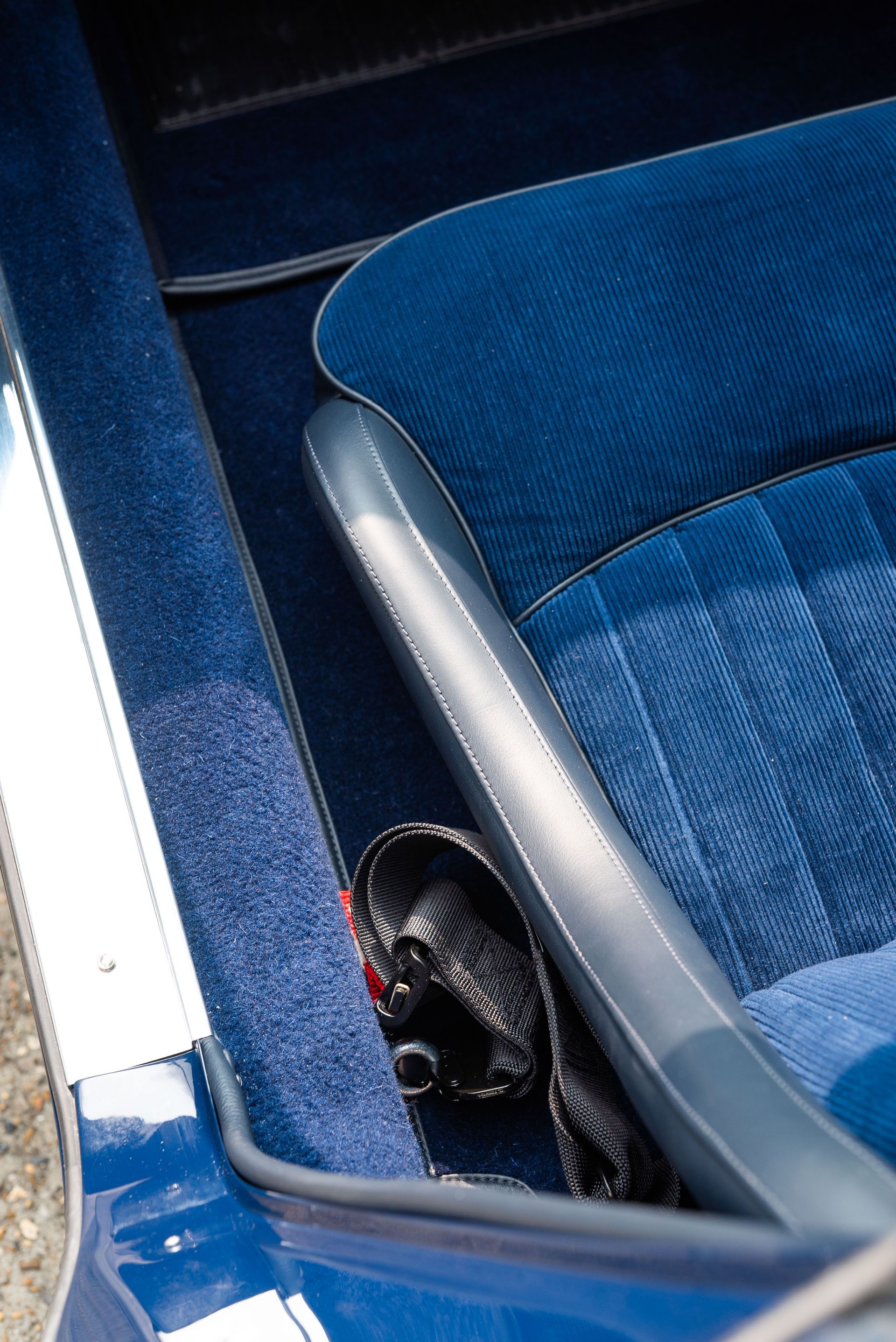 We used Connolly Navy Blue Vaumol leather, supplied by UK Hide, for the bolsters and binding. This is a crushed grain old-timer leather to match the vehicle genre. The same leather has been used for the lower rear quarters, door cards, centre tunnel, gear gaiter, and roll cage padding. Blue corduroy seat centres which match the blue Wilton carpets, supplied by Boyriven. stitched flutes added to the seat back and base centres, matching the original style that Ferrari once created.