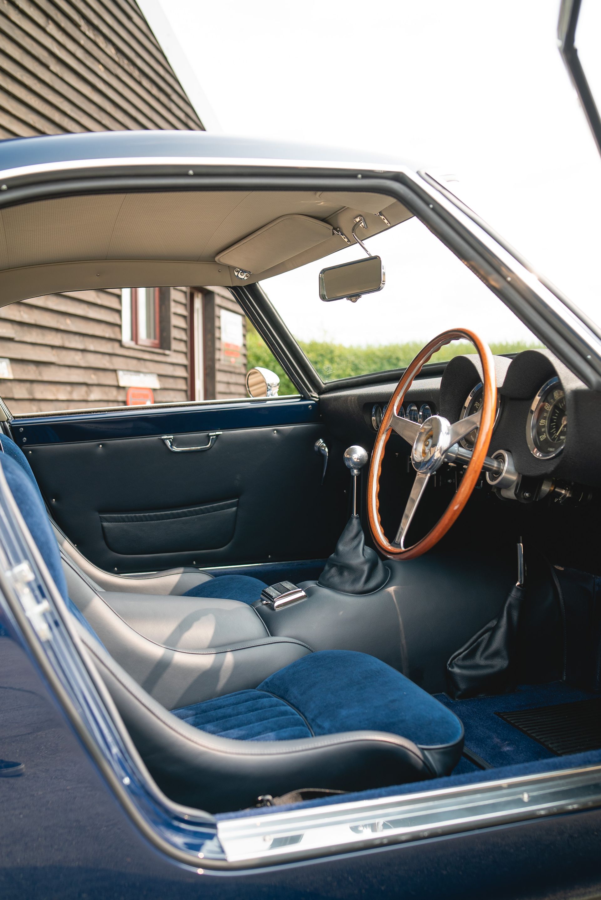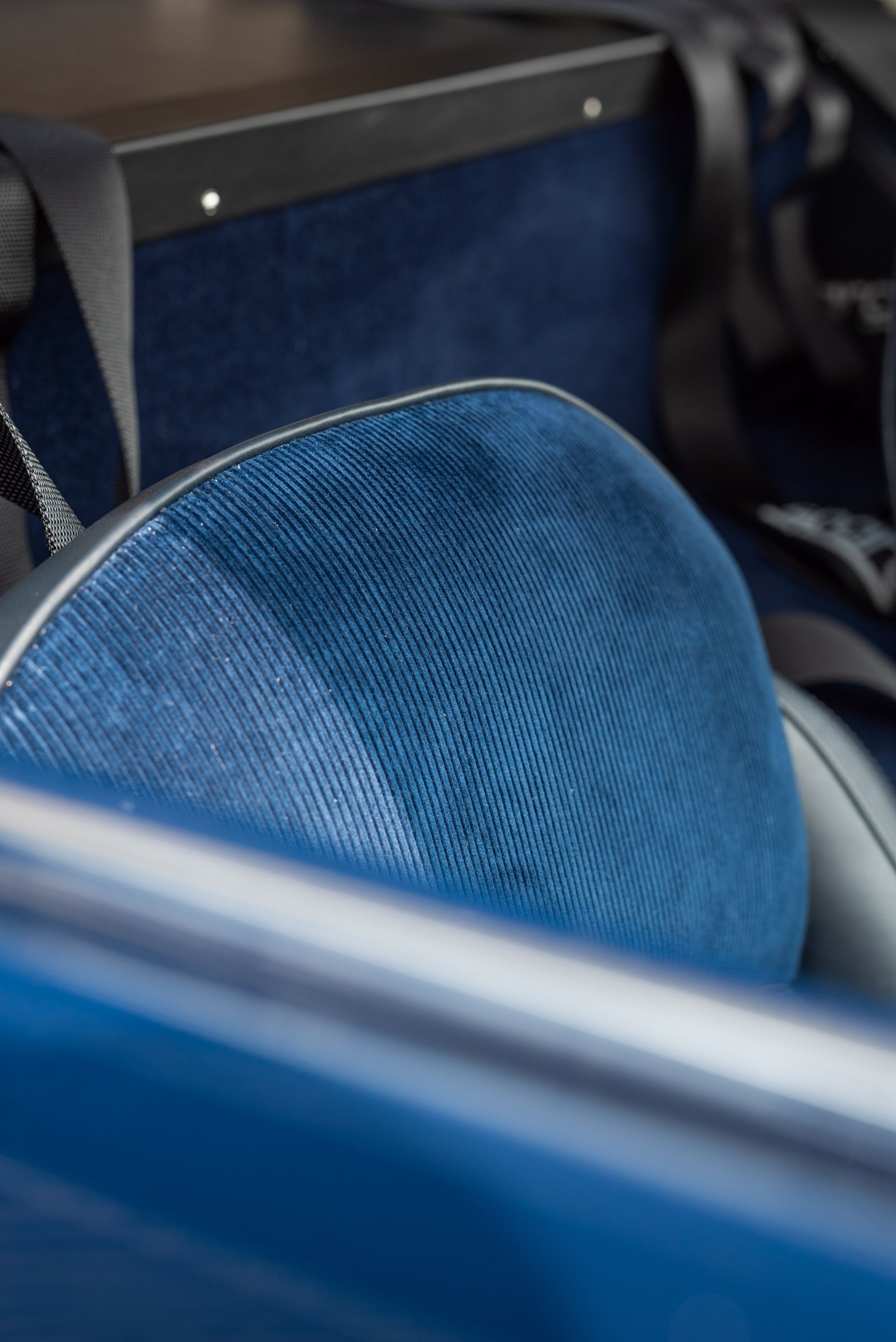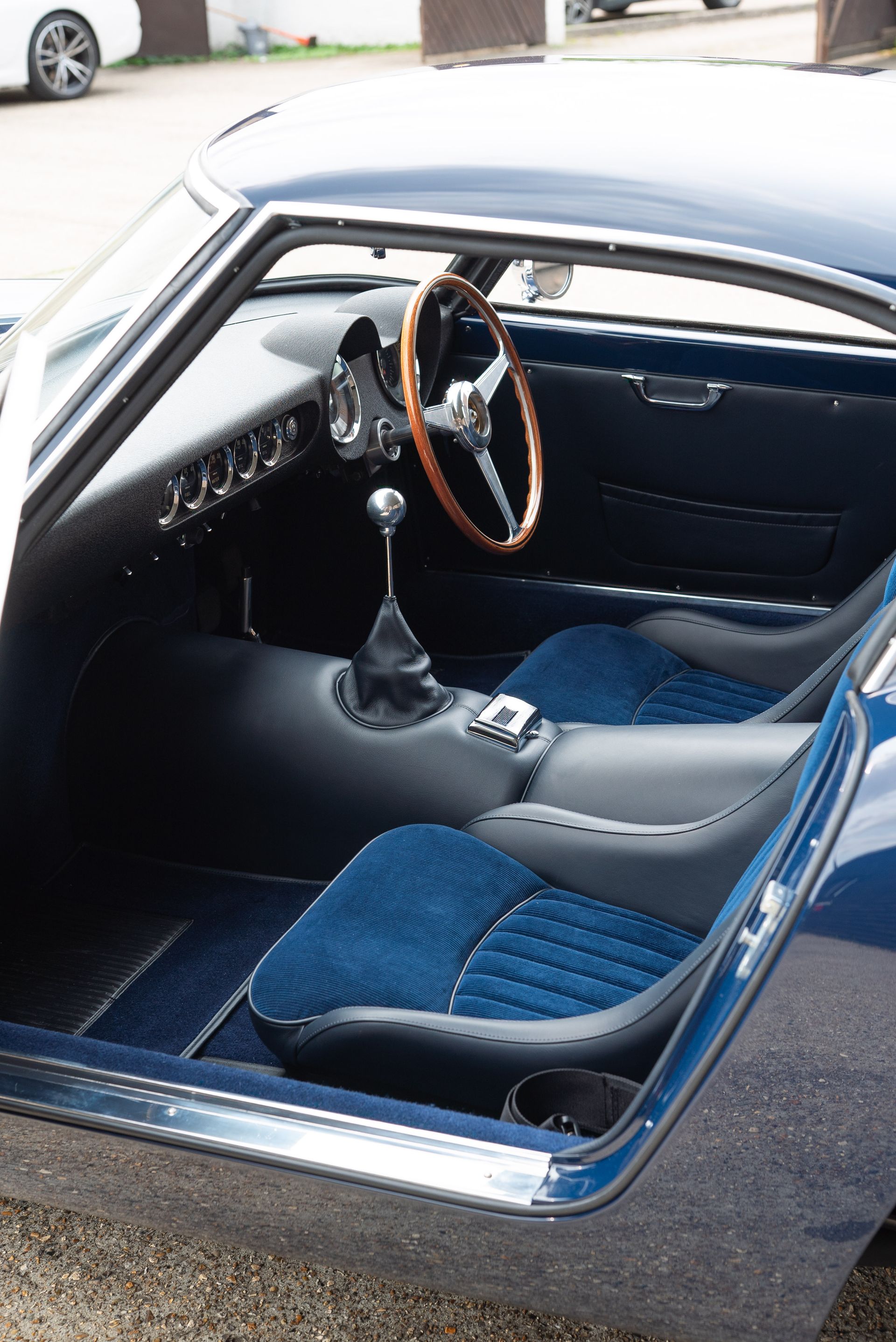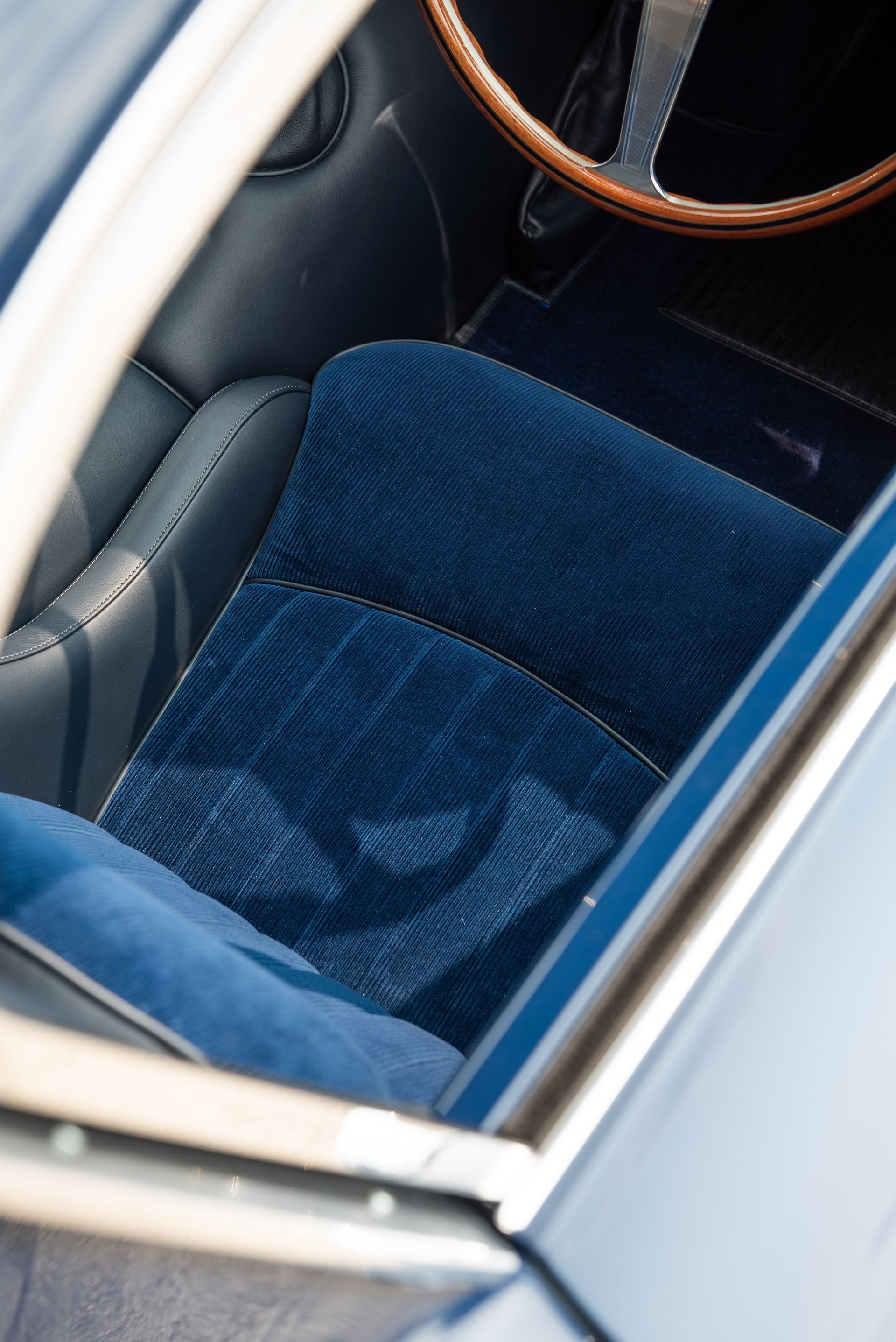 We used Connolly Navy Blue Vaumol leather, supplied by UK Hide, for the bolsters and binding. This is a crushed grain old-timer leather to match the vehicle genre. The same leather has been used for the lower rear quarters, door cards, centre tunnel, gear gaiter, and roll cage padding. Blue corduroy seat centres which match the blue Wilton carpets, supplied by Boyriven. stitched flutes added to the seat back and base centres, matching the original style that Ferrari once created.