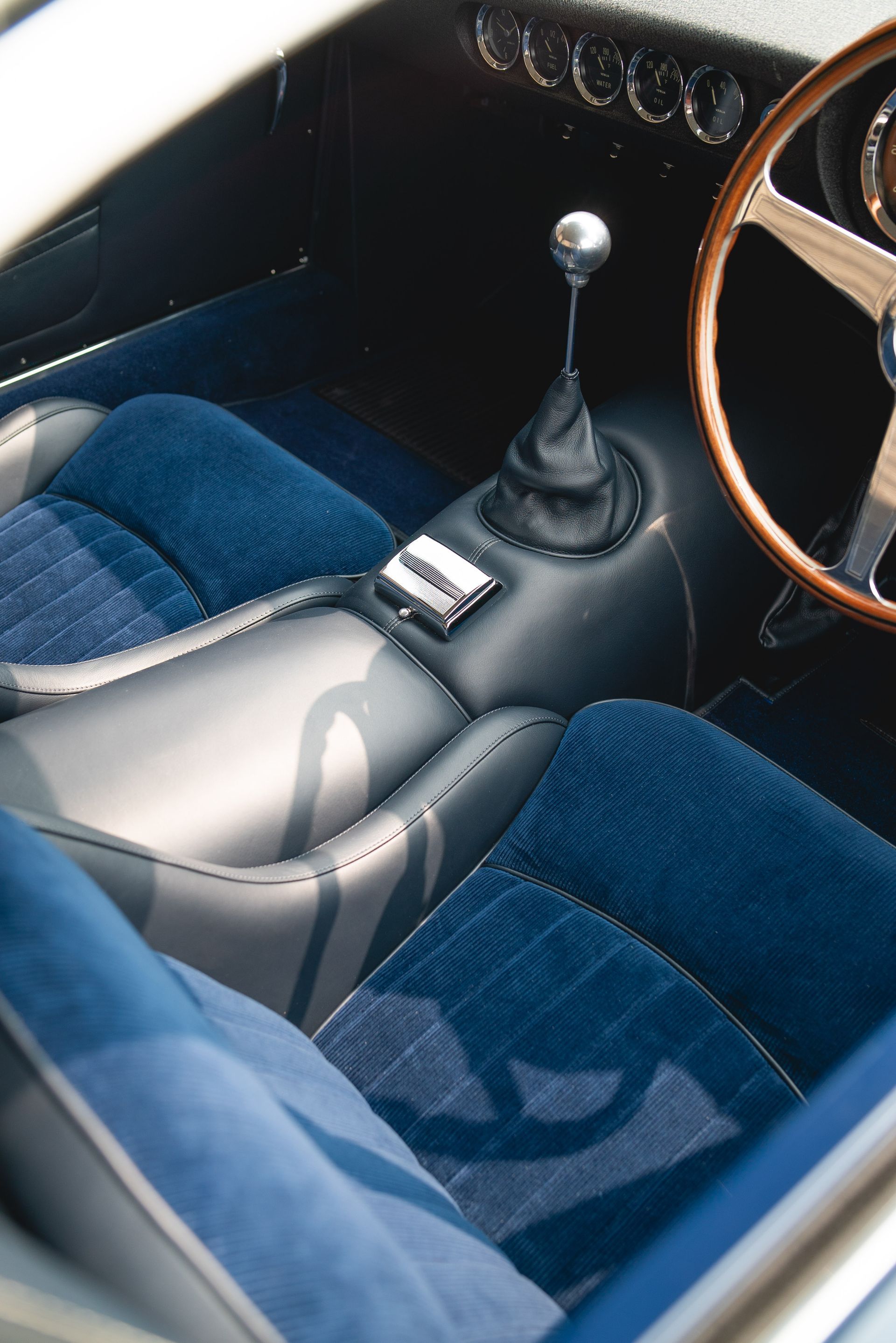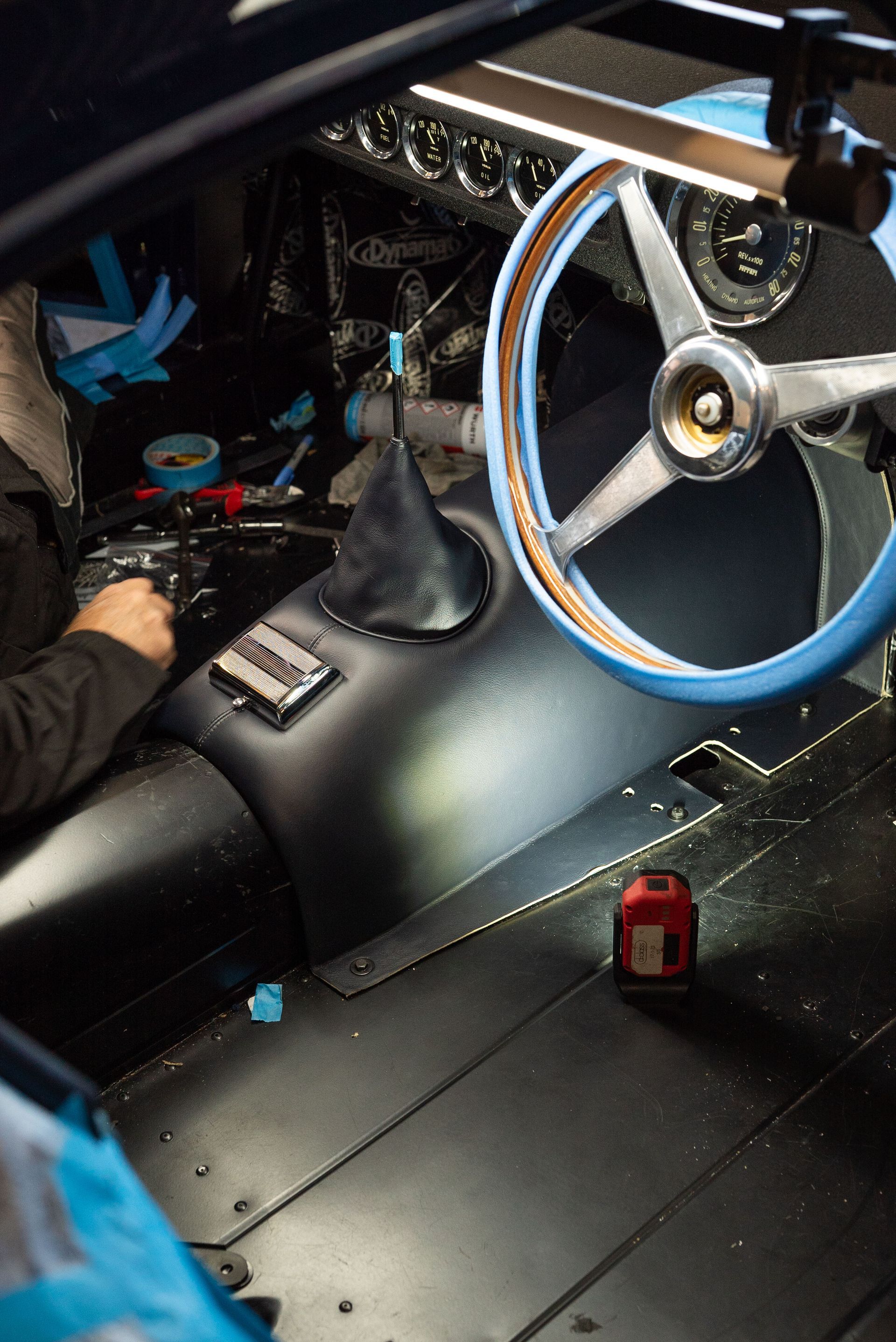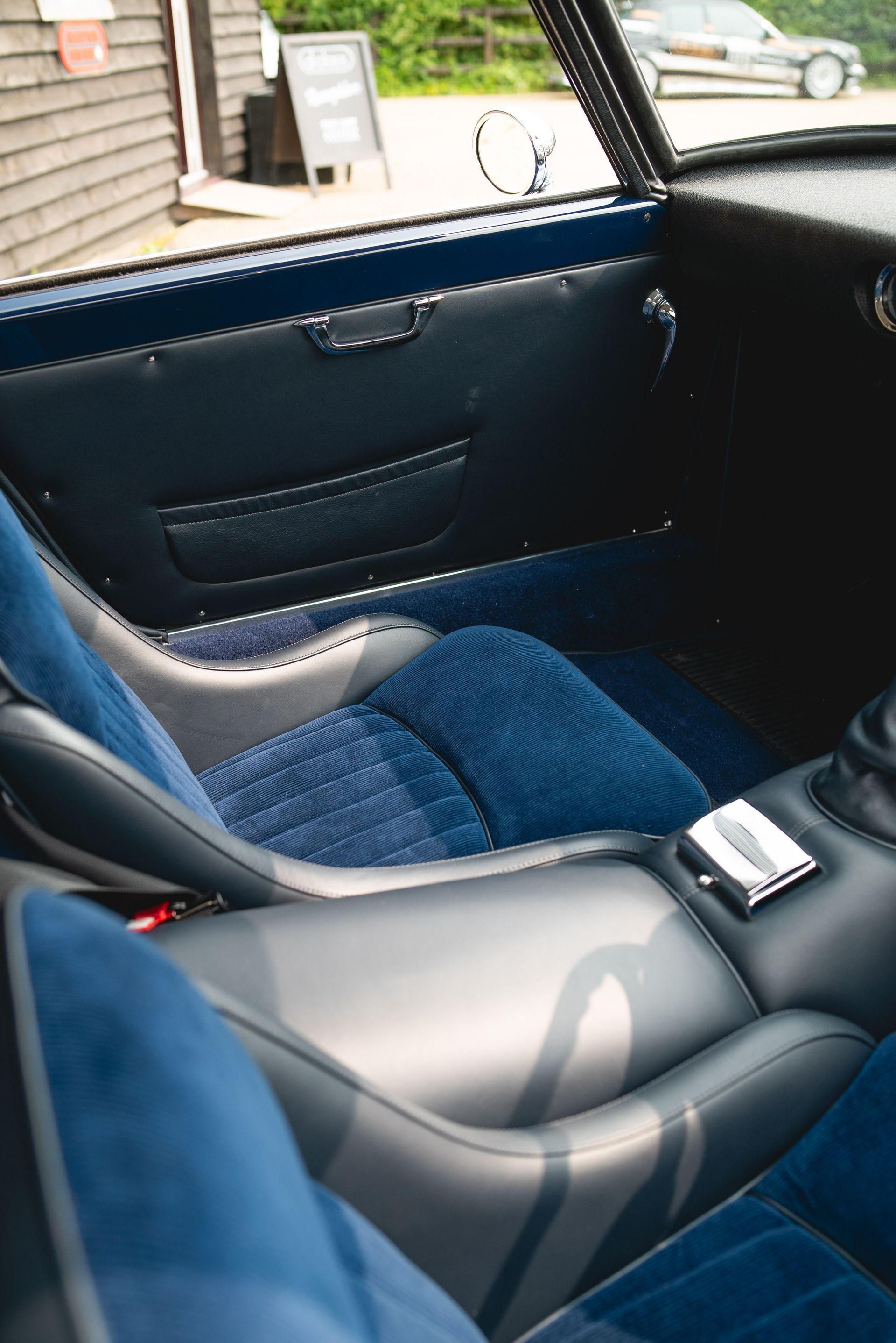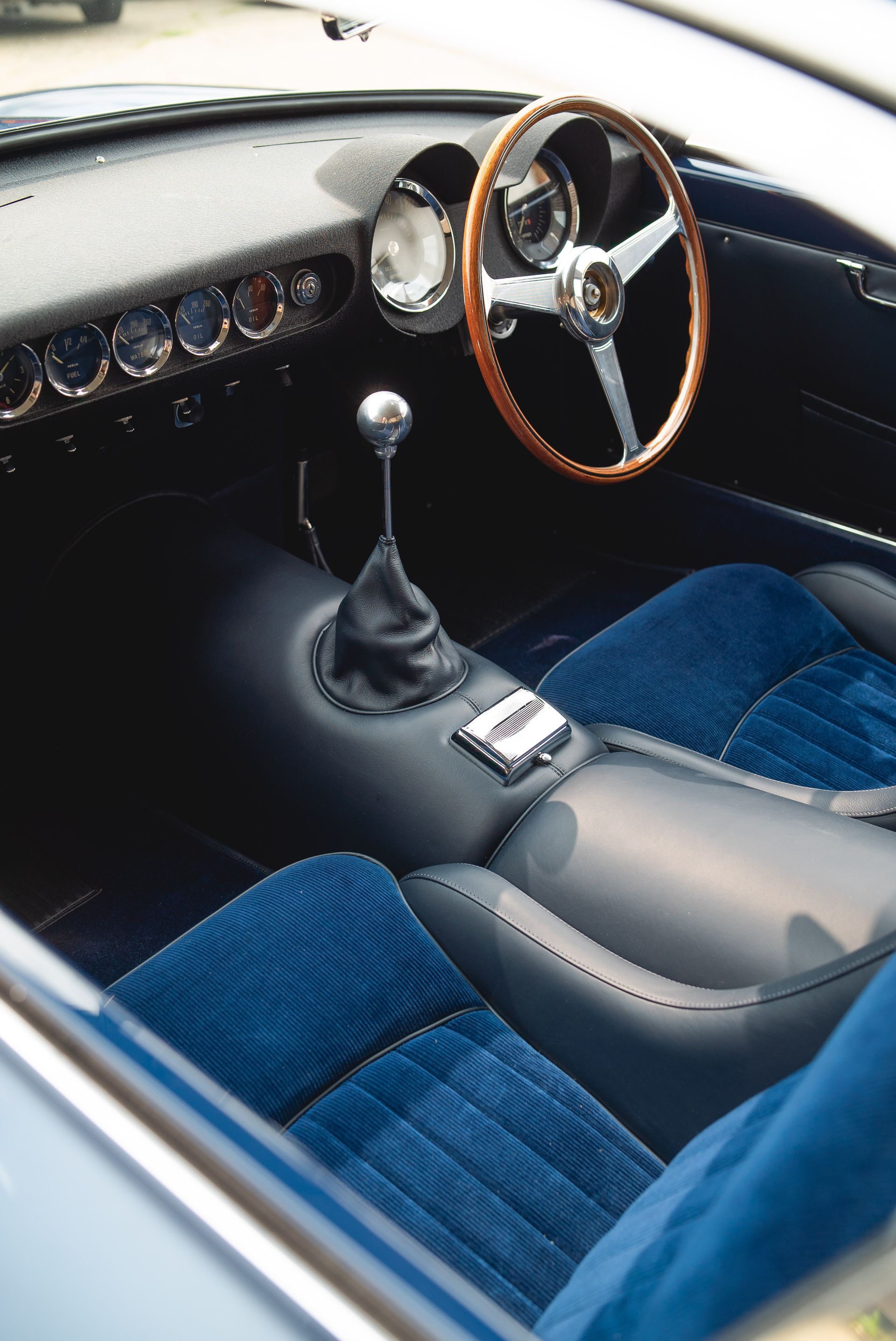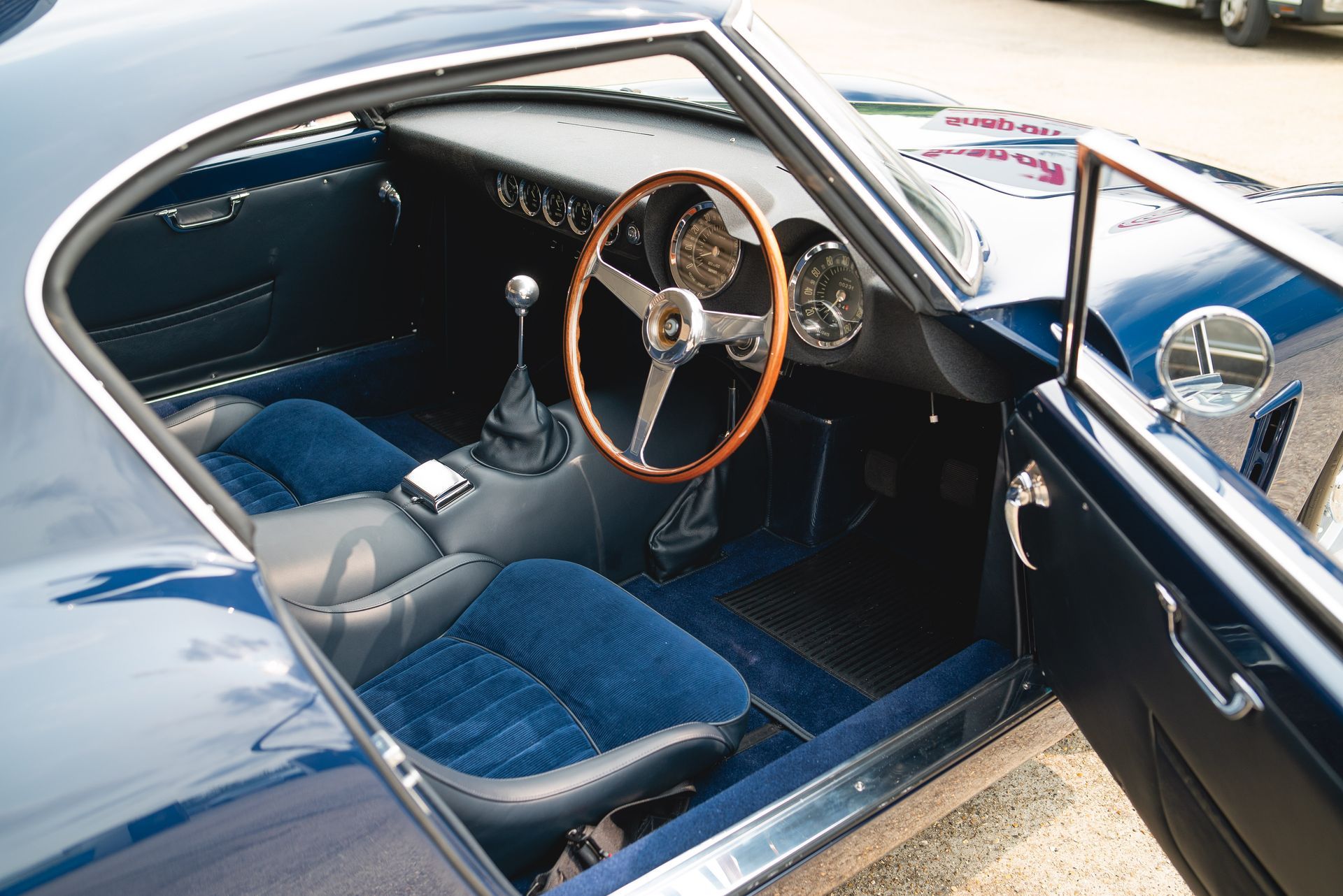 We used Connolly Navy Blue Vaumol leather, supplied by UK Hide, for the bolsters and binding. This is a crushed grain old-timer leather to match the vehicle genre. The same leather has been used for the lower rear quarters, door cards, centre tunnel, gear gaiter, and roll cage padding. Blue corduroy seat centres which match the blue Wilton carpets, supplied by Boyriven. stitched flutes added to the seat back and base centres, matching the original style that Ferrari once created.