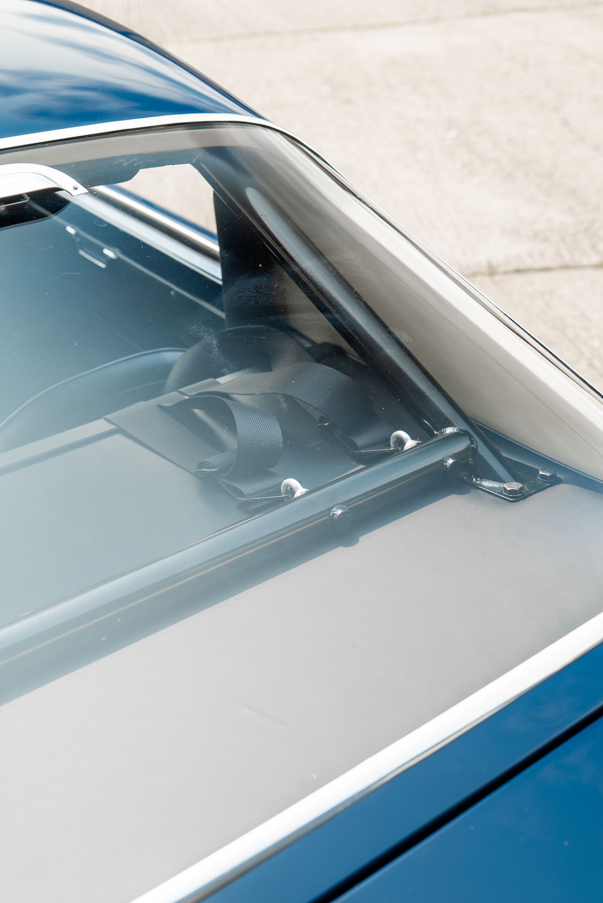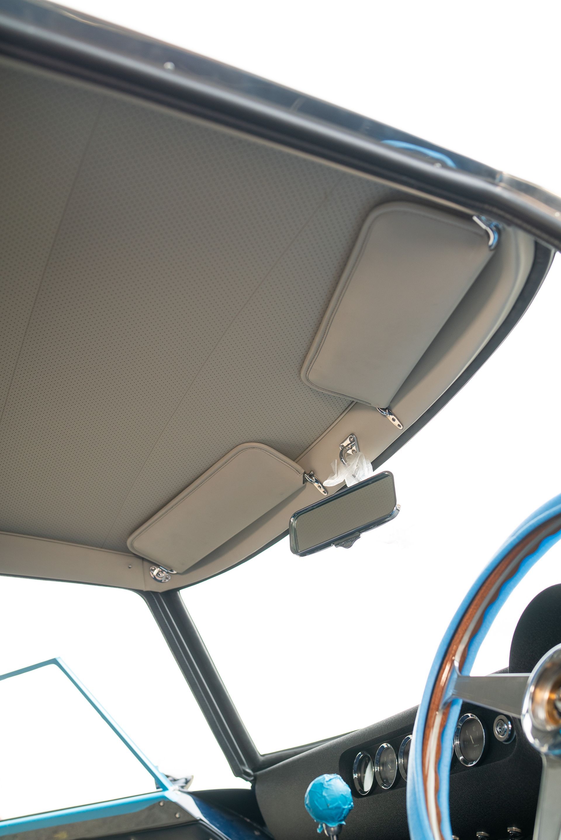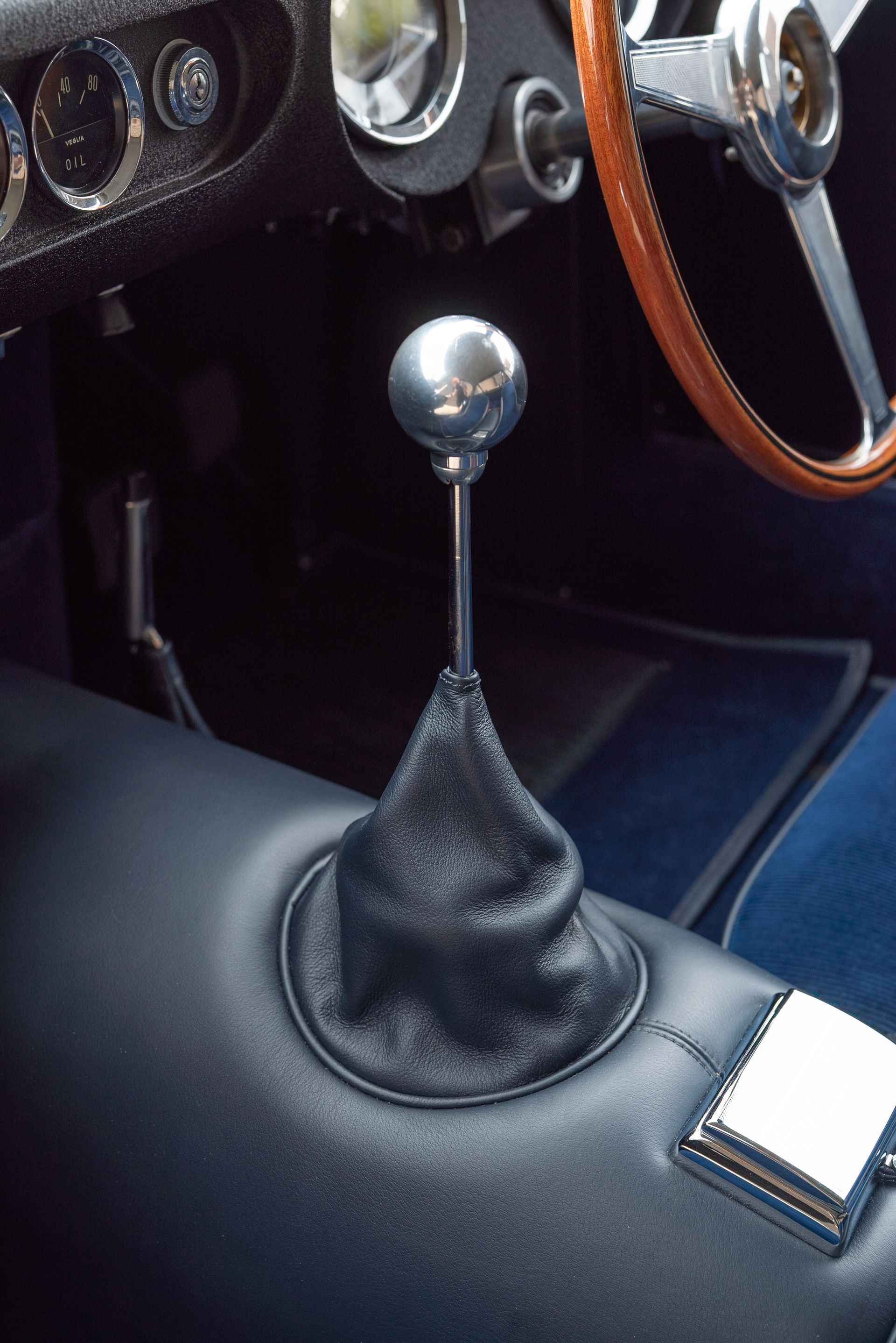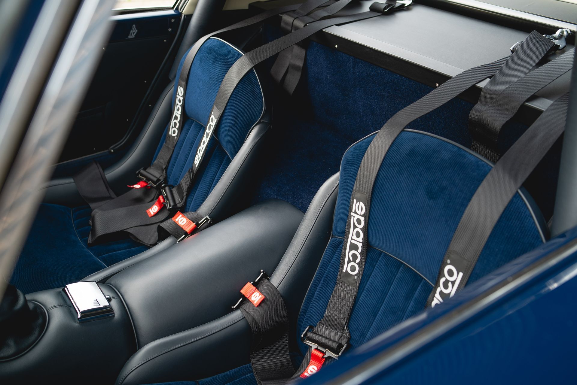 We used Connolly Navy Blue Vaumol leather, supplied by UK Hide, for the bolsters and binding. This is a crushed grain old-timer leather to match the vehicle genre. The same leather has been used for the lower rear quarters, door cards, centre tunnel, gear gaiter, and roll cage padding. Blue corduroy seat centres which match the blue Wilton carpets, supplied by Boyriven. stitched flutes added to the seat back and base centres, matching the original style that Ferrari once created.