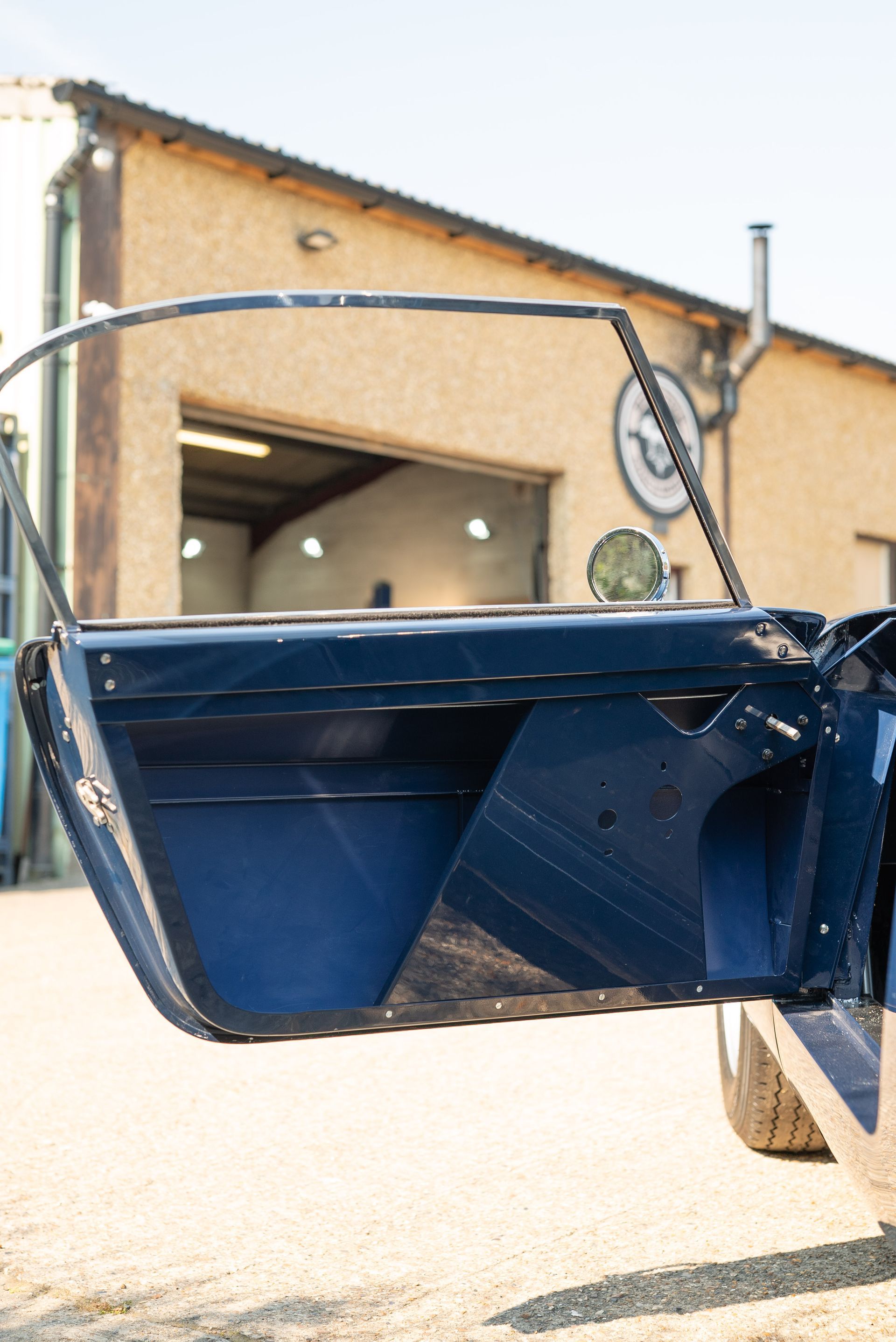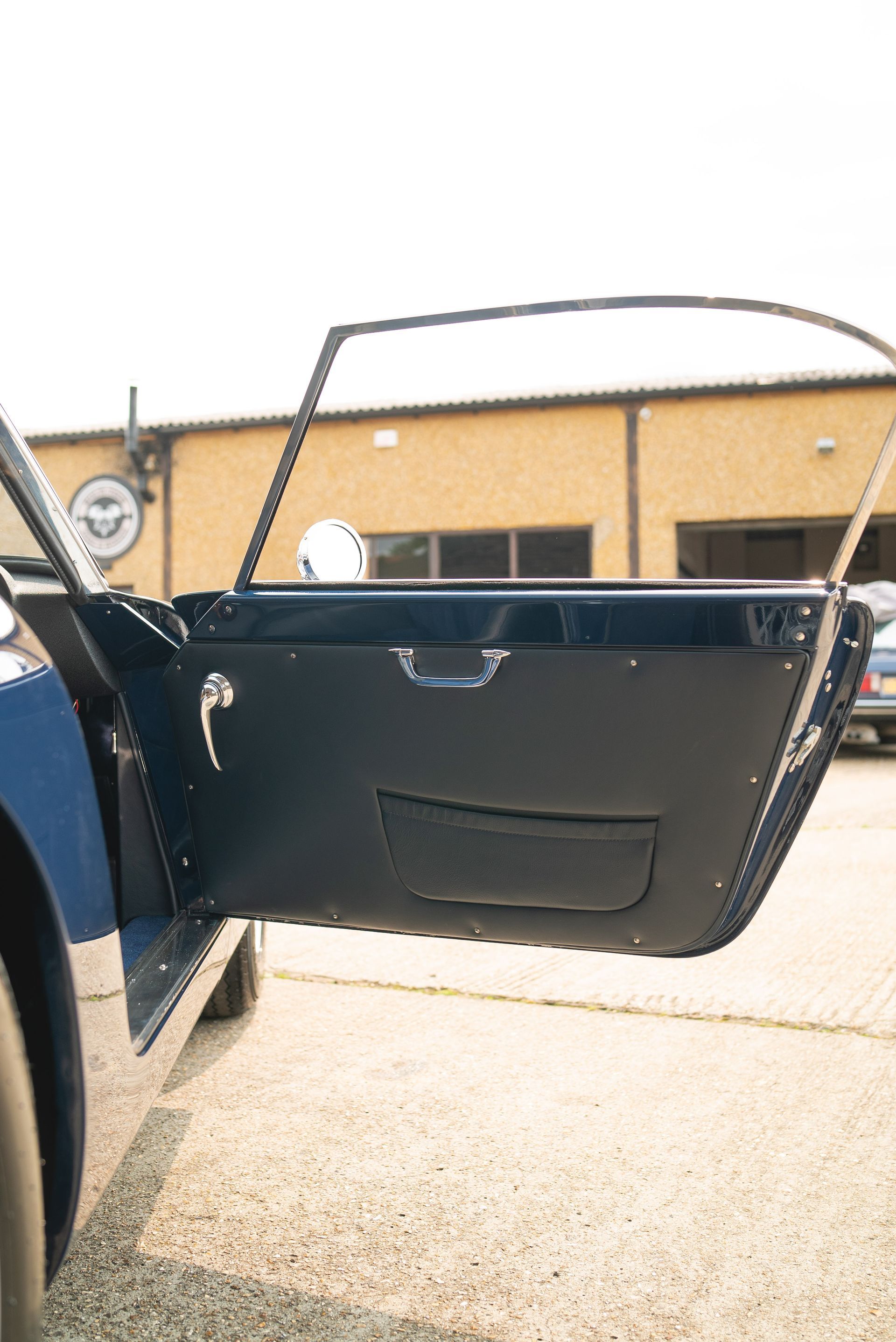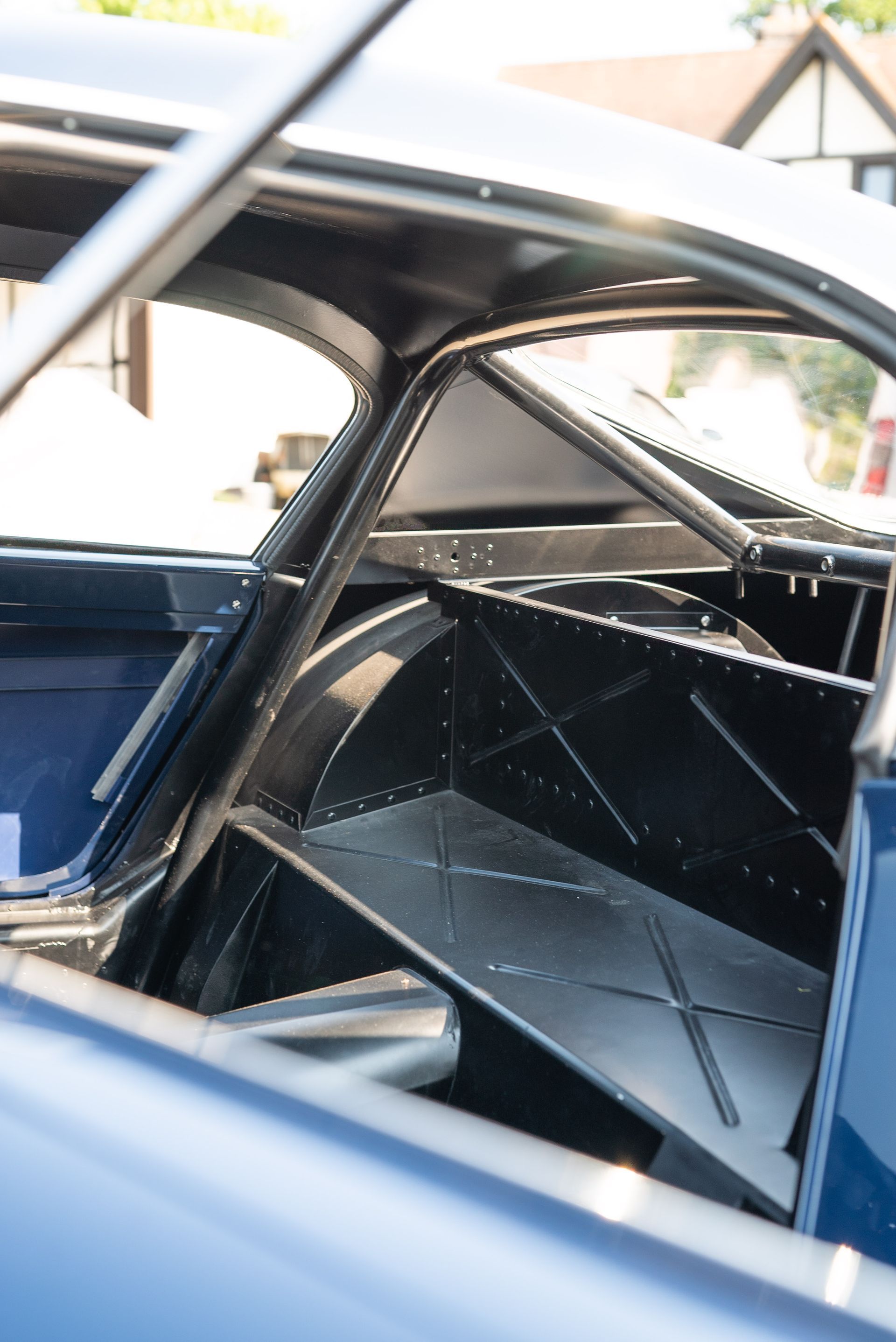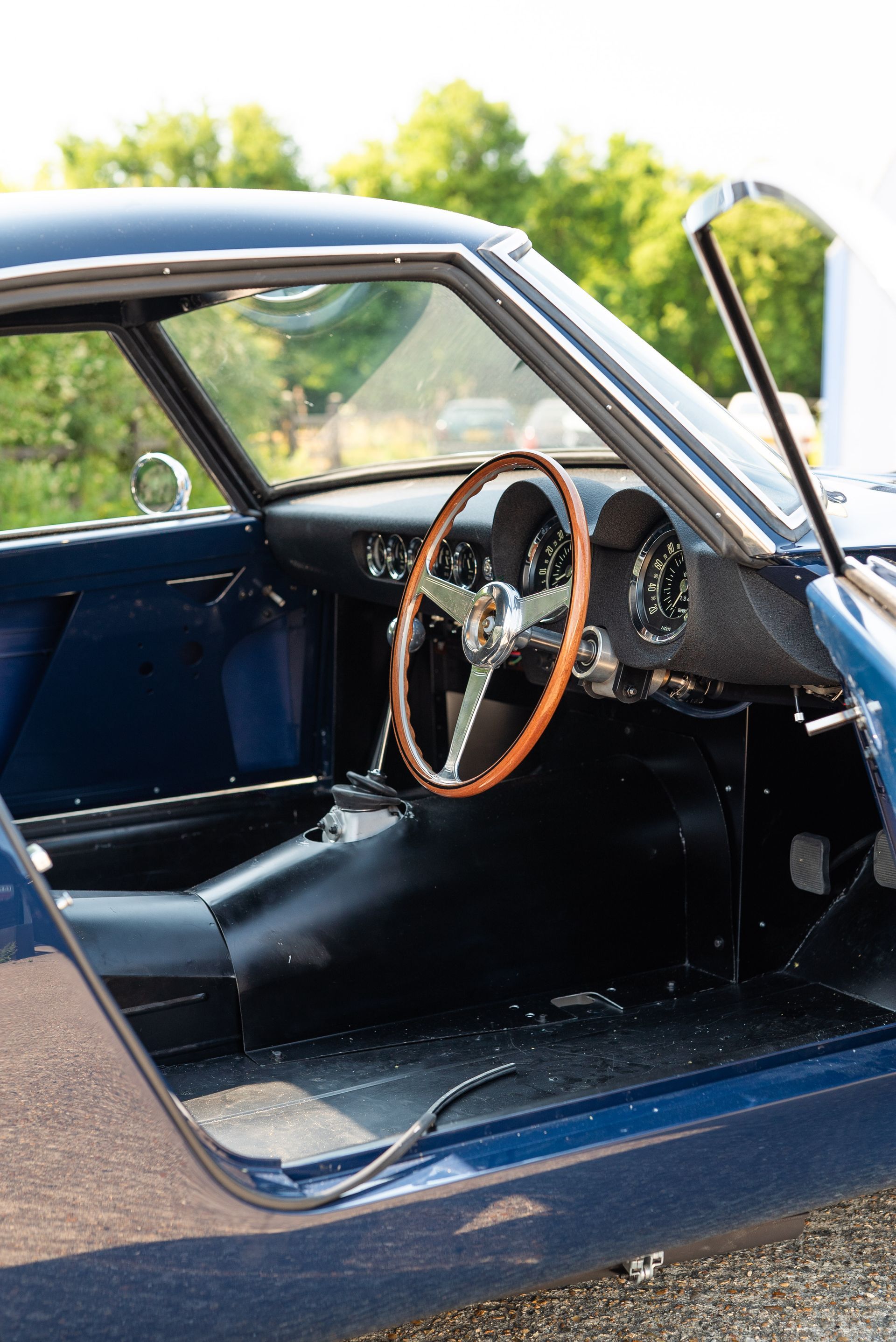 We used Connolly Navy Blue Vaumol leather, supplied by UK Hide, for the bolsters and binding. This is a crushed grain old-timer leather to match the vehicle genre. The same leather has been used for the lower rear quarters, door cards, centre tunnel, gear gaiter, and roll cage padding. Blue corduroy seat centres which match the blue Wilton carpets, supplied by Boyriven. stitched flutes added to the seat back and base centres, matching the original style that Ferrari once created.