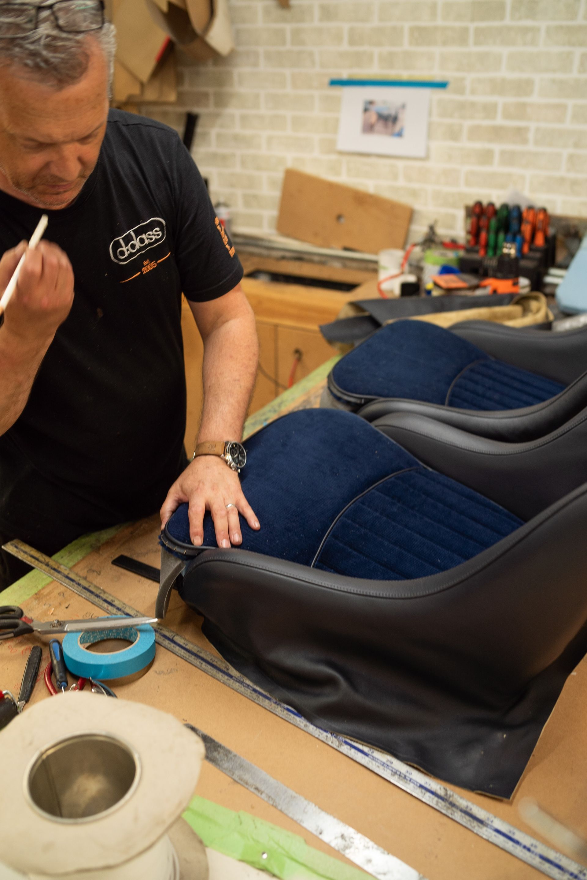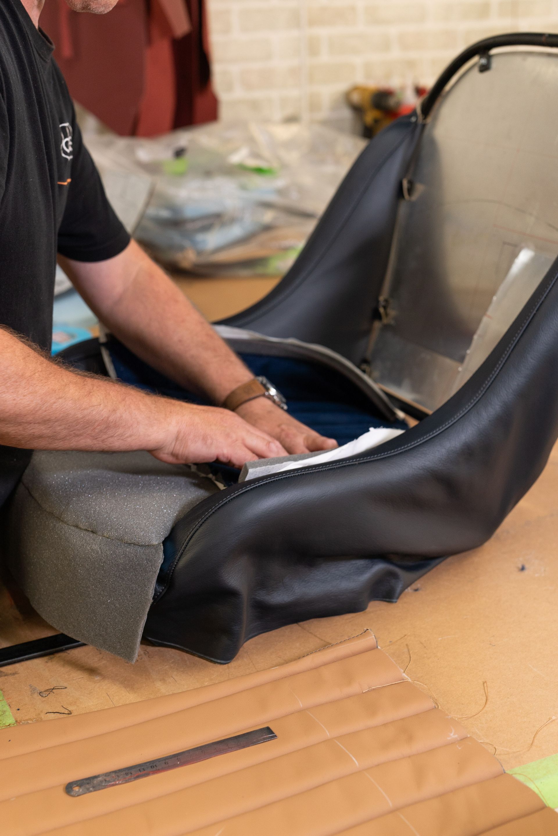 Seats are next, as mentioned before, they were just a metal frame upon arrival to d:class. We created bespoke seat panels from aluminium which were then riveted to the frames. After this, foams are next as we prepare to trim the seats.