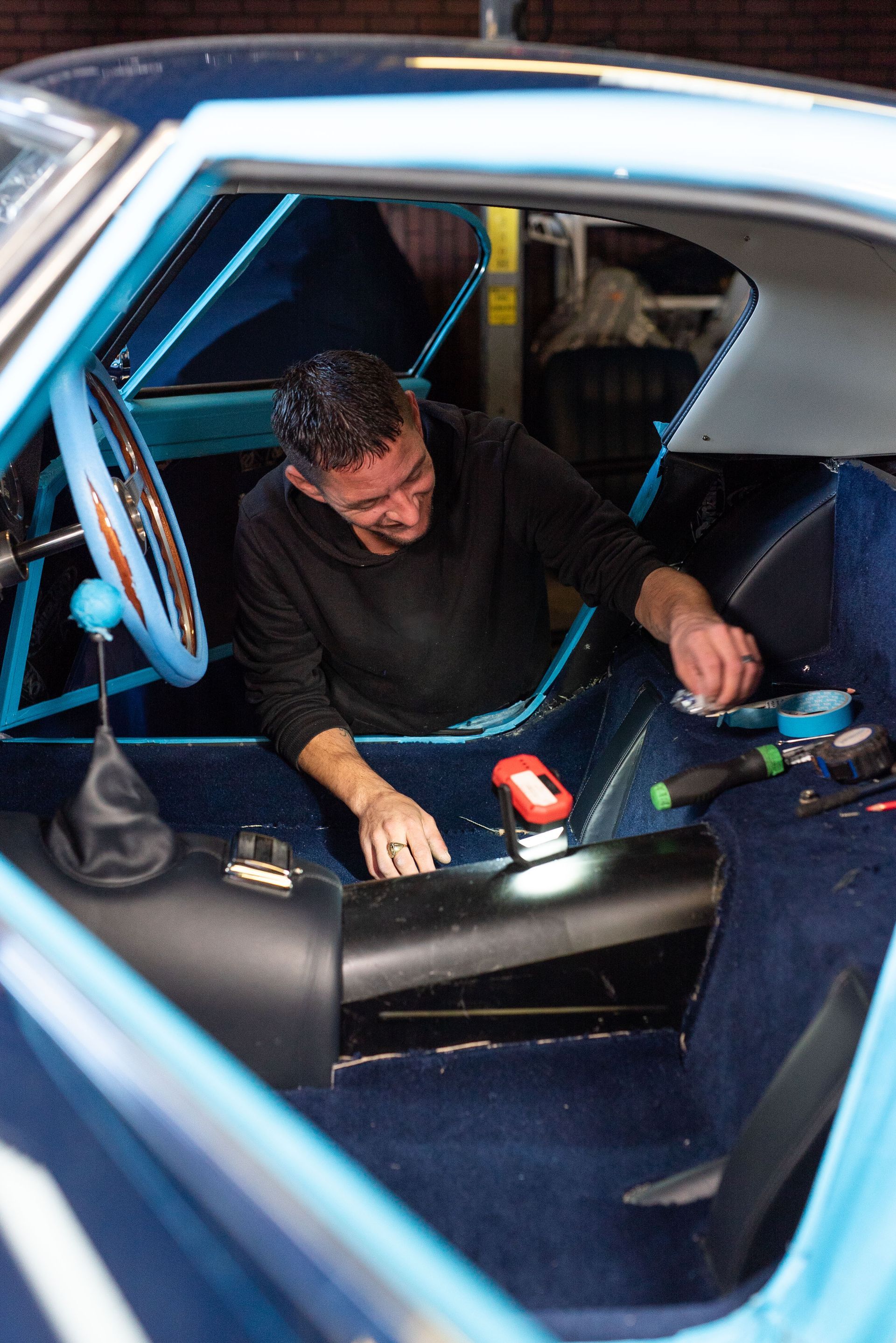 This vehicle came to us fresh from its respray and exterior fit-up, ready for the interior retrim and fabrication from our very talented team here at d:class. The vehicle arrived to us with a bare metal interior, no door cards, seat frames, no parcel shelf, cantrails, and more. Some of the aluminium interior panels still required holes to be correctly drilled and installed.