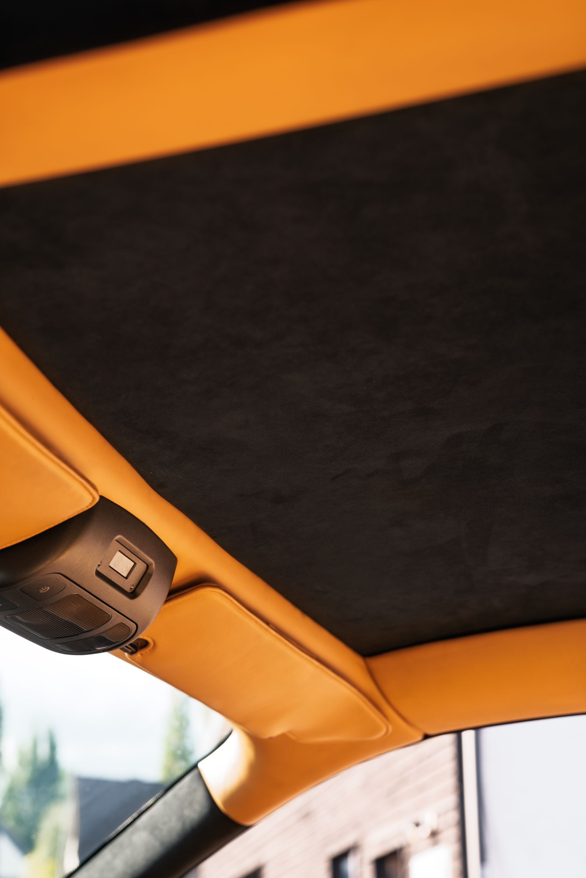 So all of the required work included; retrimming the dash top in black Alcantara with tan twin stitching, Steering wheel retrim in black Alcantara and black perforated nappa leather with tan stitching, Headlining, door card corner panels, door car pockets, centre console facia, and A-pillars. They also requested for us to install some carbon fibre upgrades which were provided by our customer.