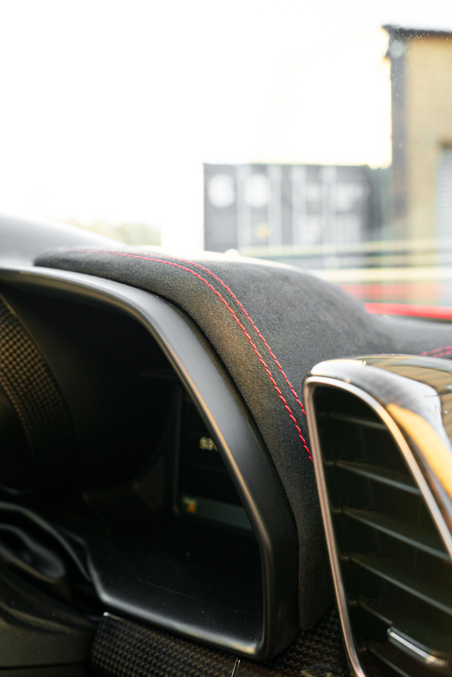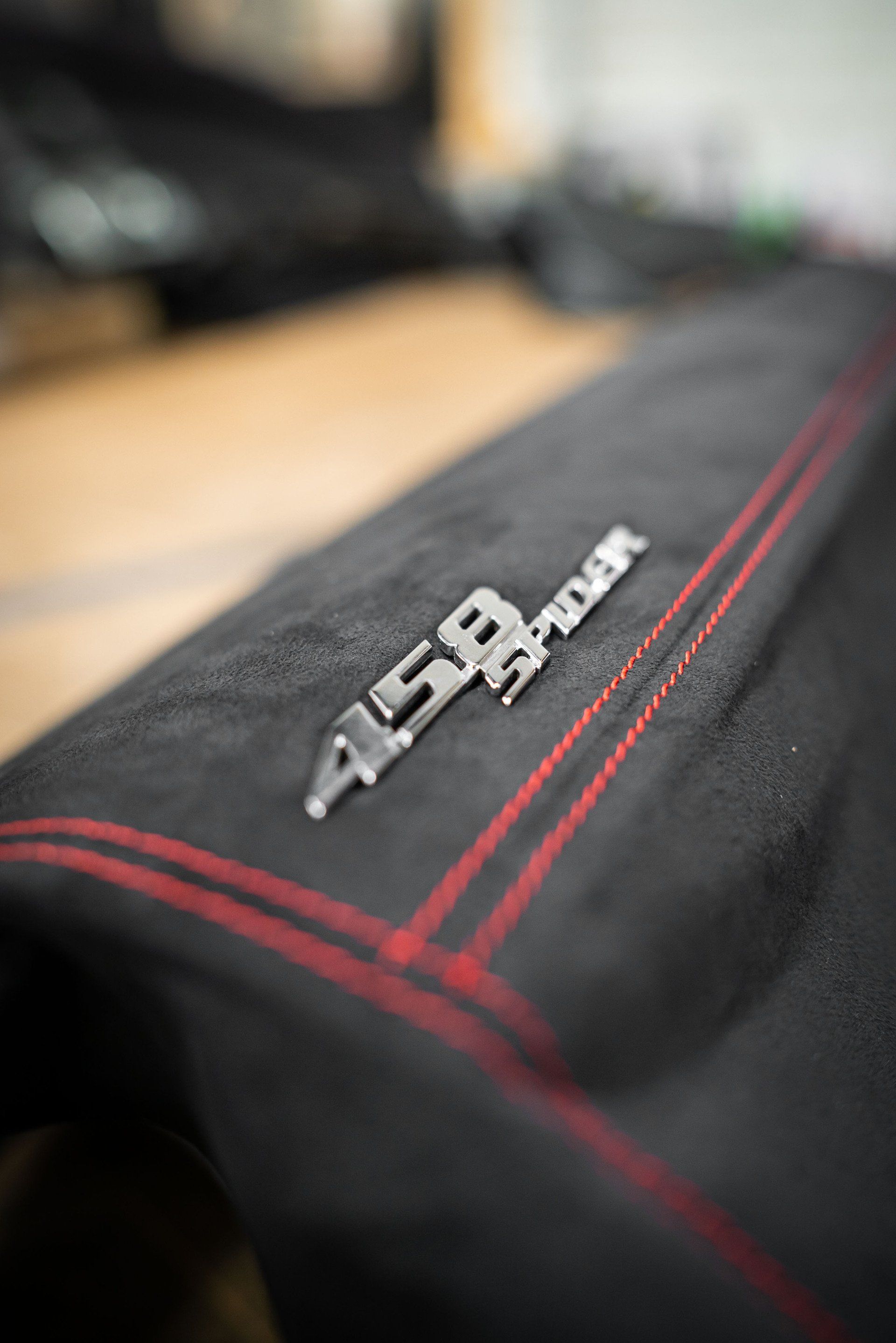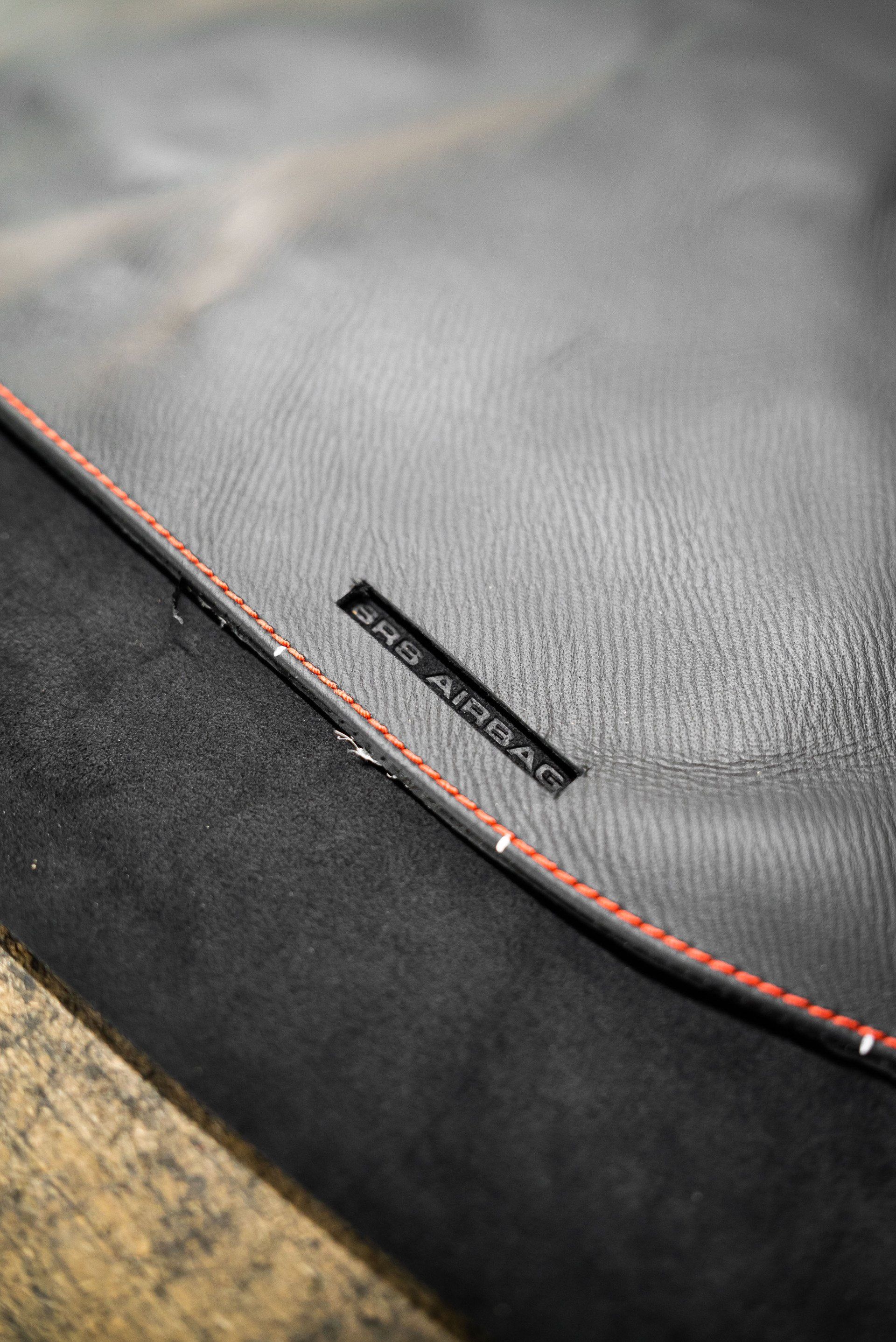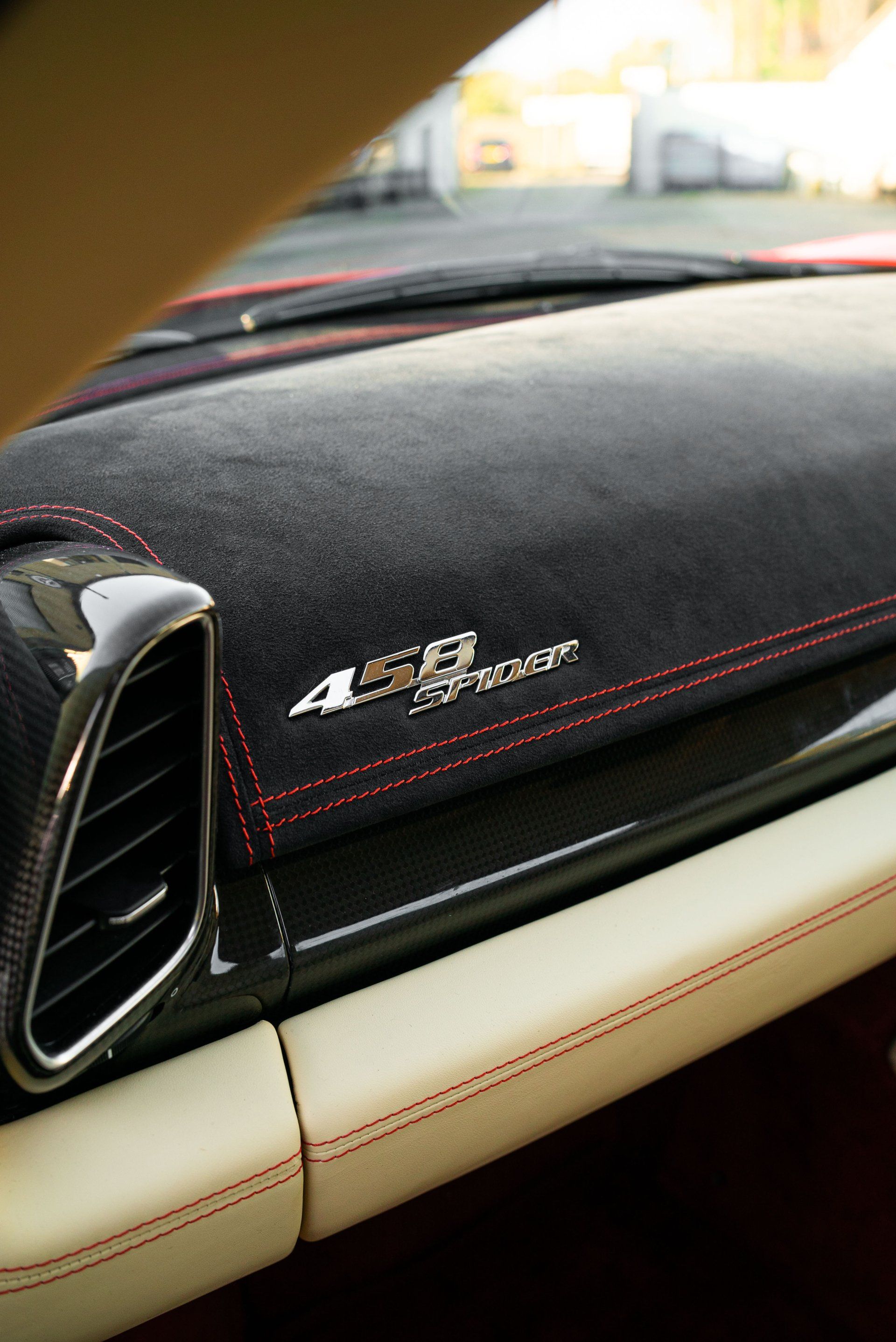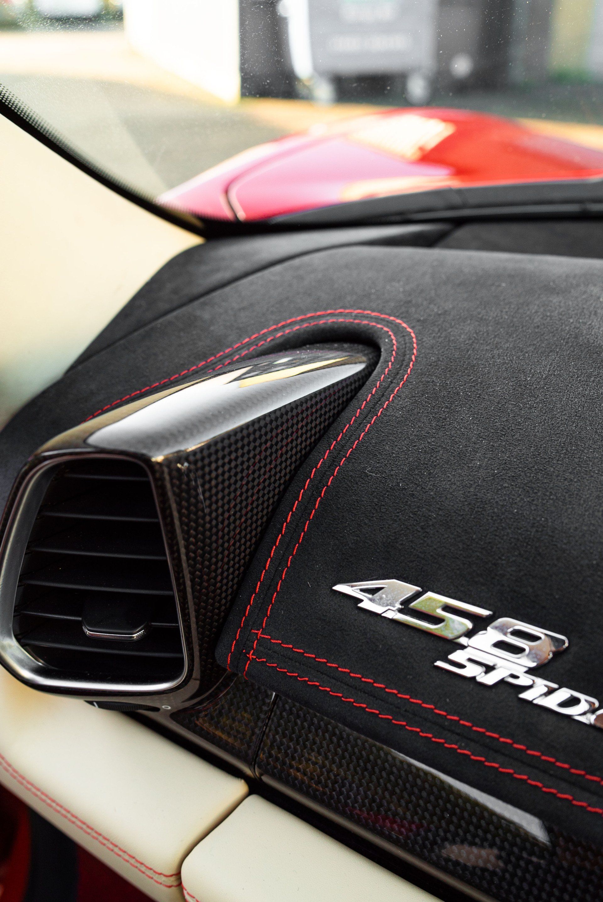 Today we have a Ferrari 458 Spider owned by @rw._.87 which received a new upper and lower dashboard retrim. We replaced the black leather dashboard top with black Alcantara with red stitching. The lower dash was retrimmed in Ferrari Crema nappa leather and red stitching to match the rest of the interior of the car. A steering wheel retrim to OEM spec with black nappa and debossed perforated leather finished the job off nicely.