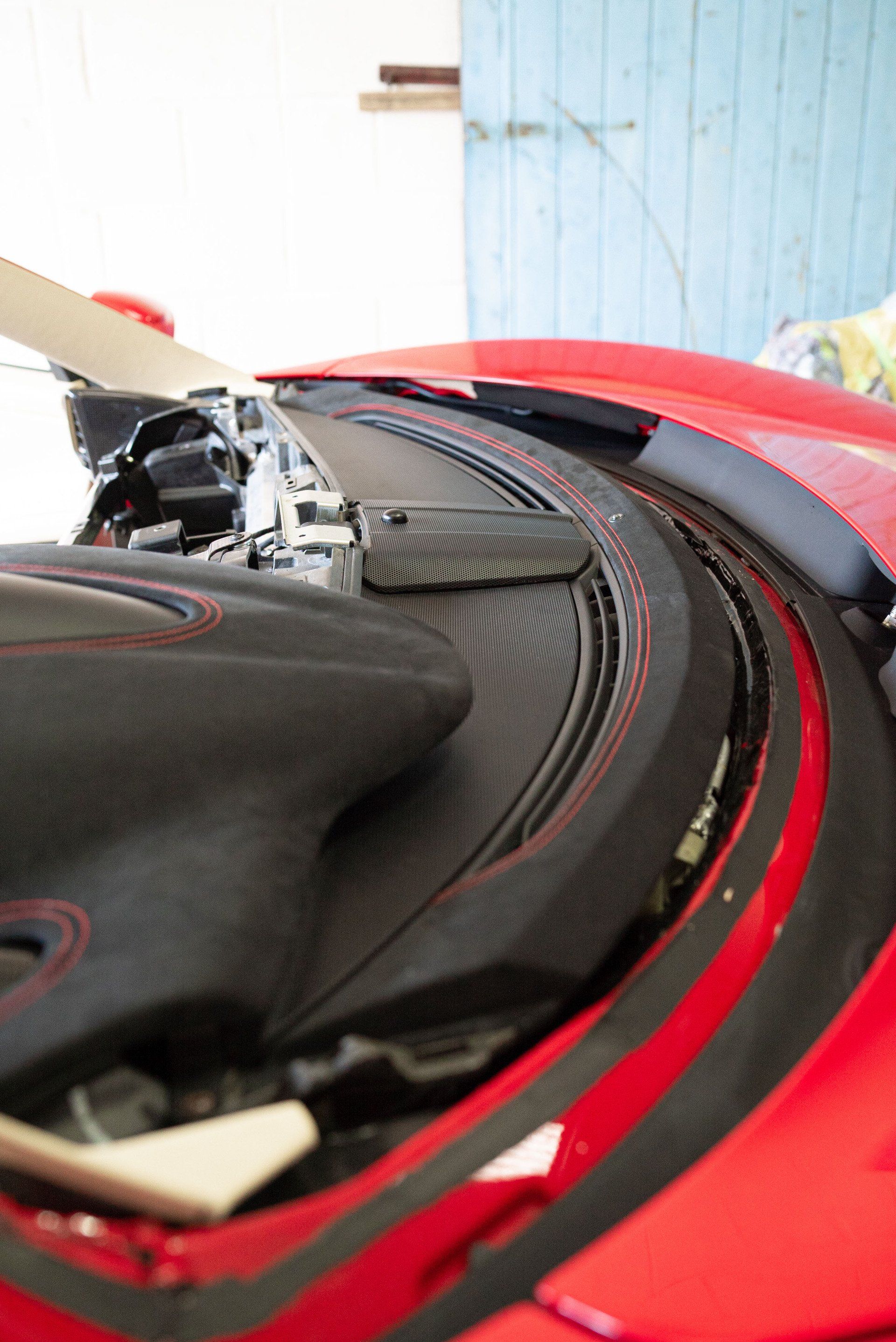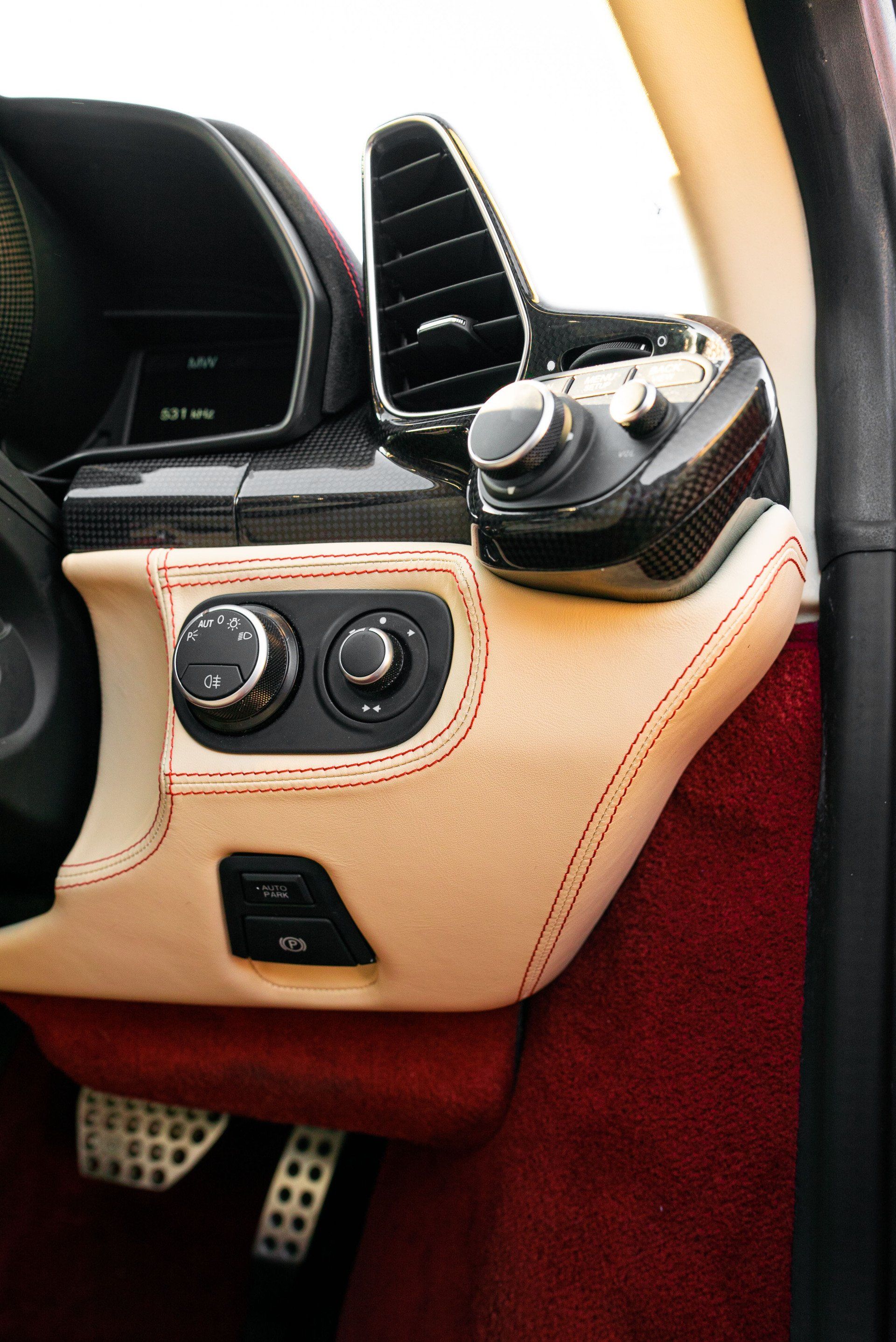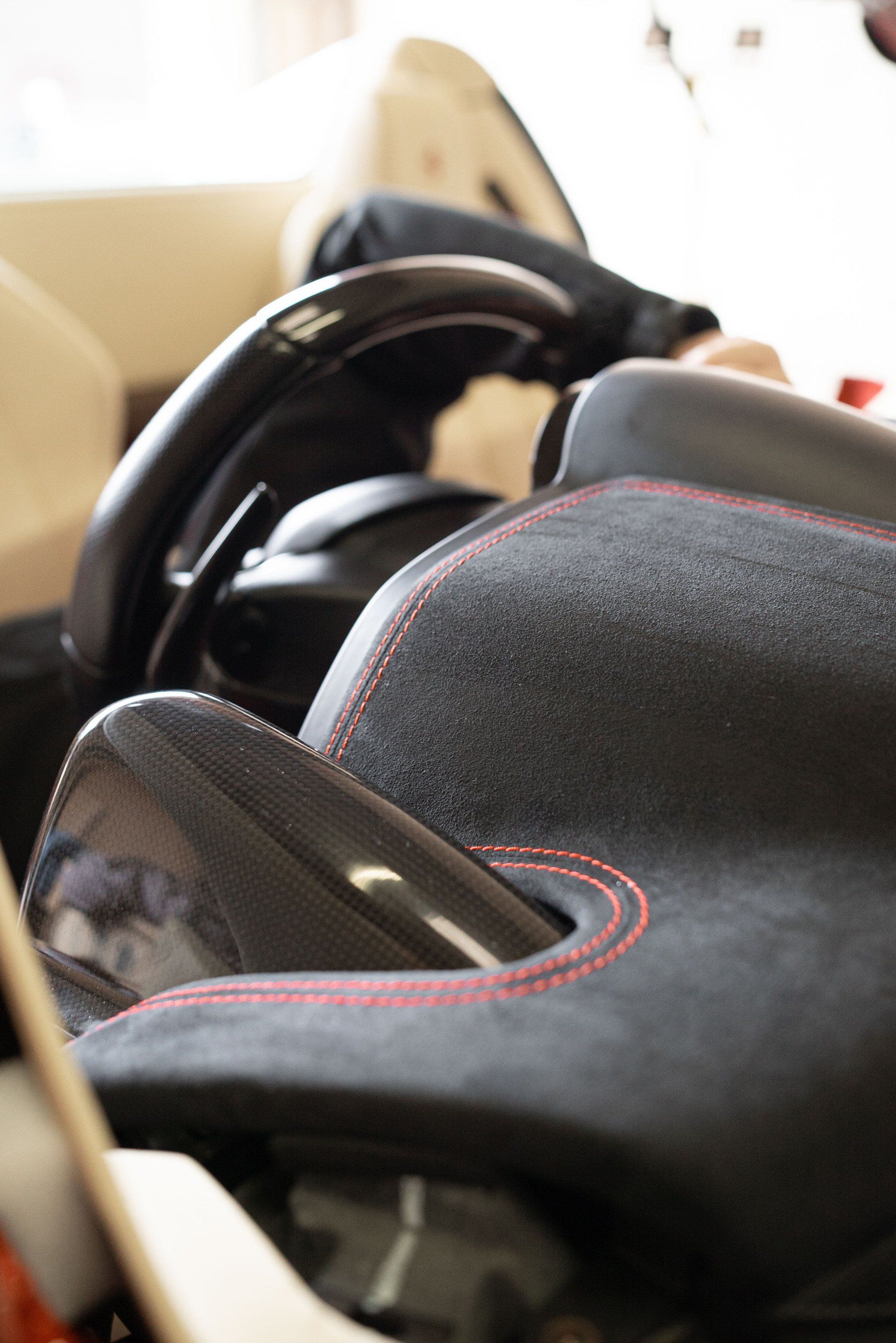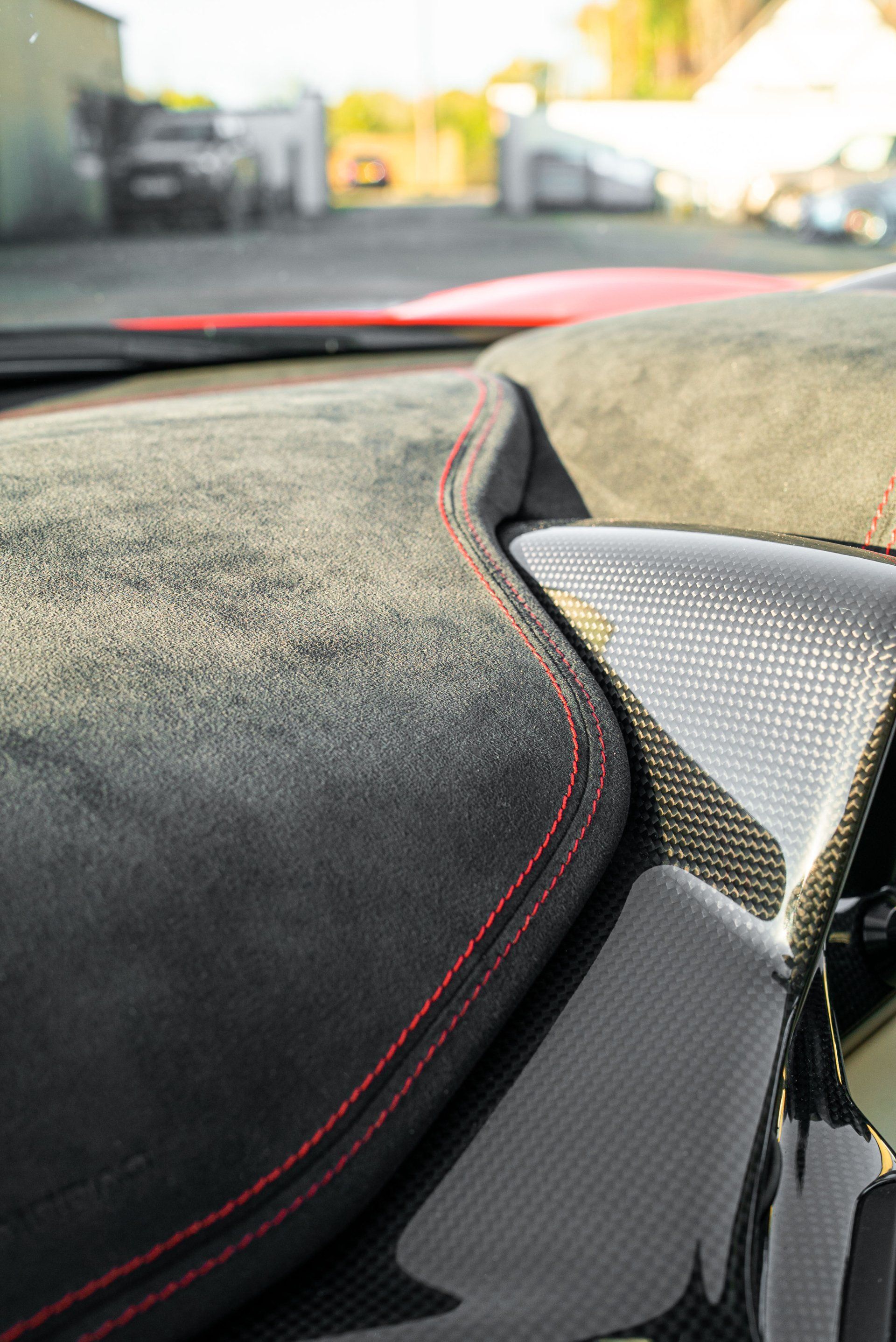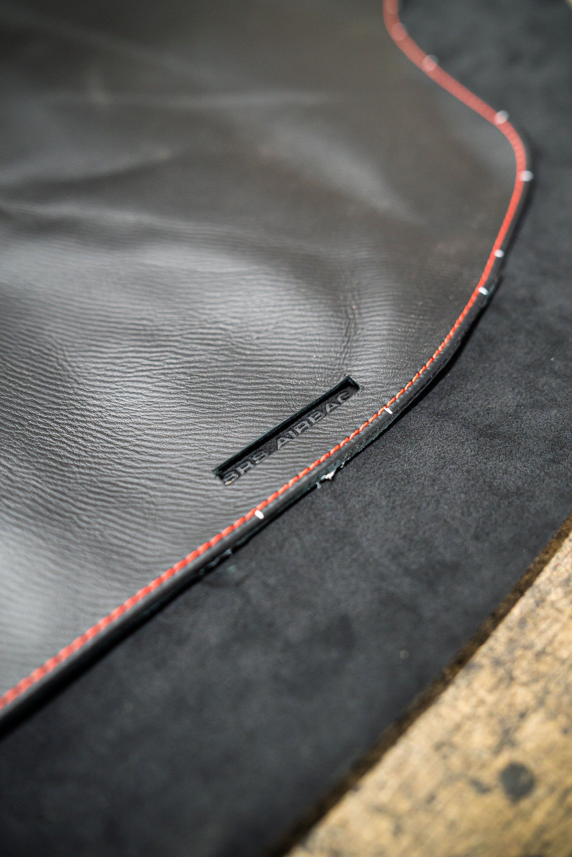 Today we have a Ferrari 458 Spider owned by @rw._.87 which received a new upper and lower dashboard retrim. We replaced the black leather dashboard top with black Alcantara with red stitching. The lower dash was retrimmed in Ferrari Crema nappa leather and red stitching to match the rest of the interior of the car. A steering wheel retrim to OEM spec with black nappa and debossed perforated leather finished the job off nicely.