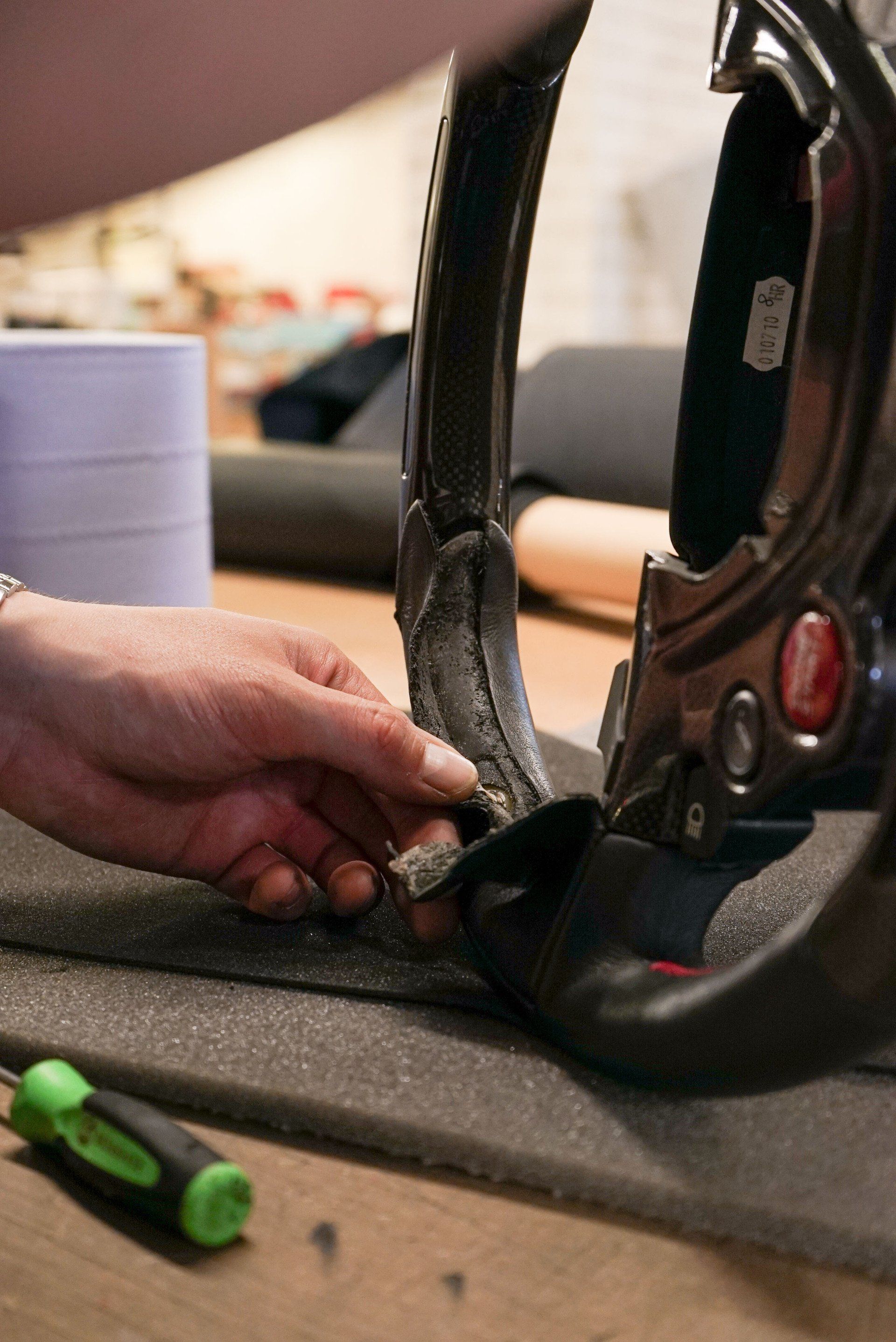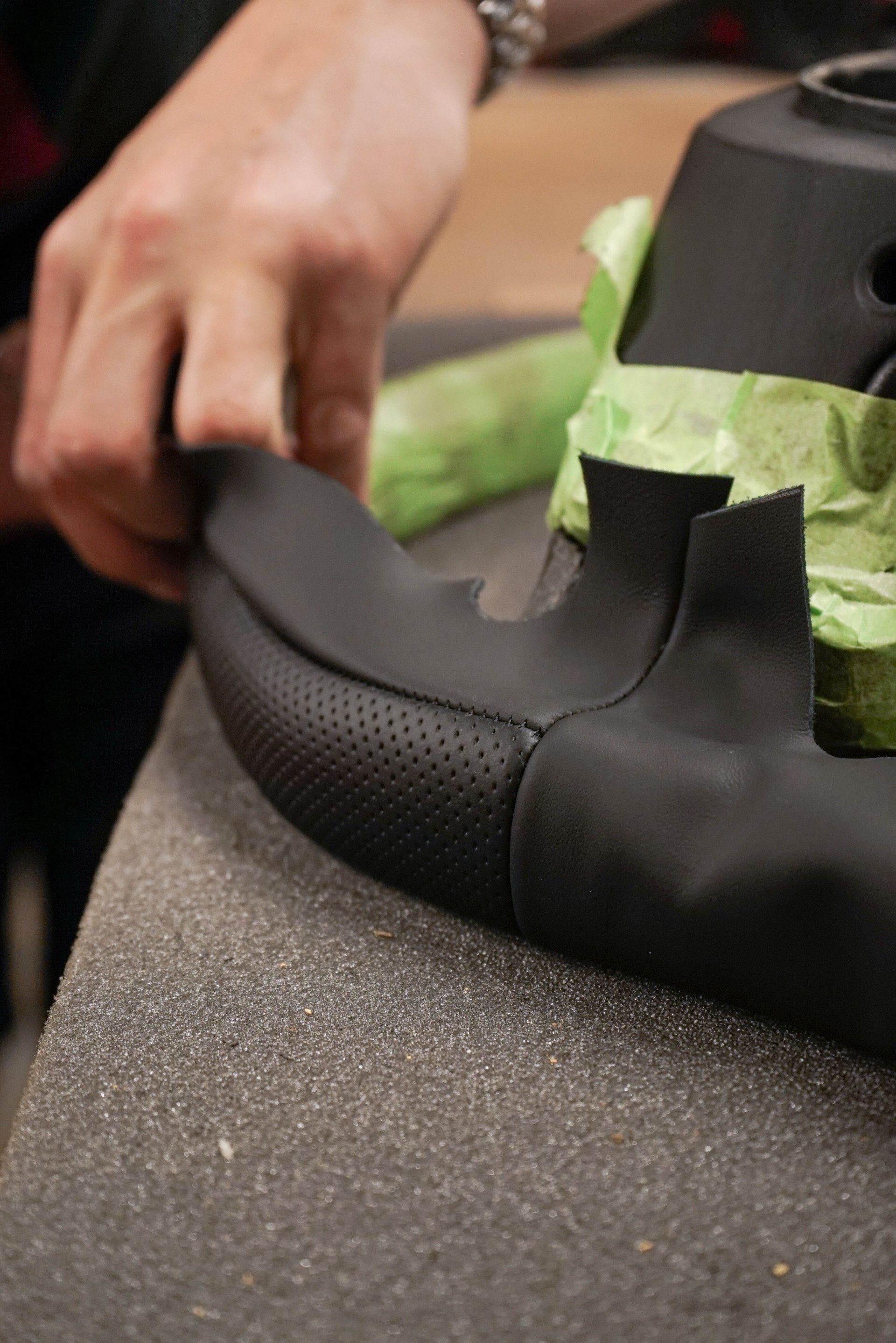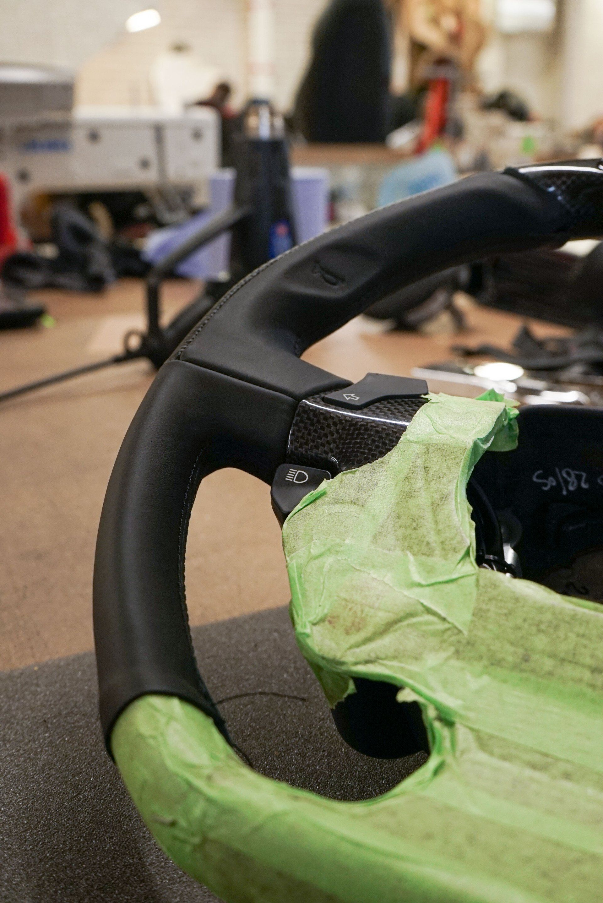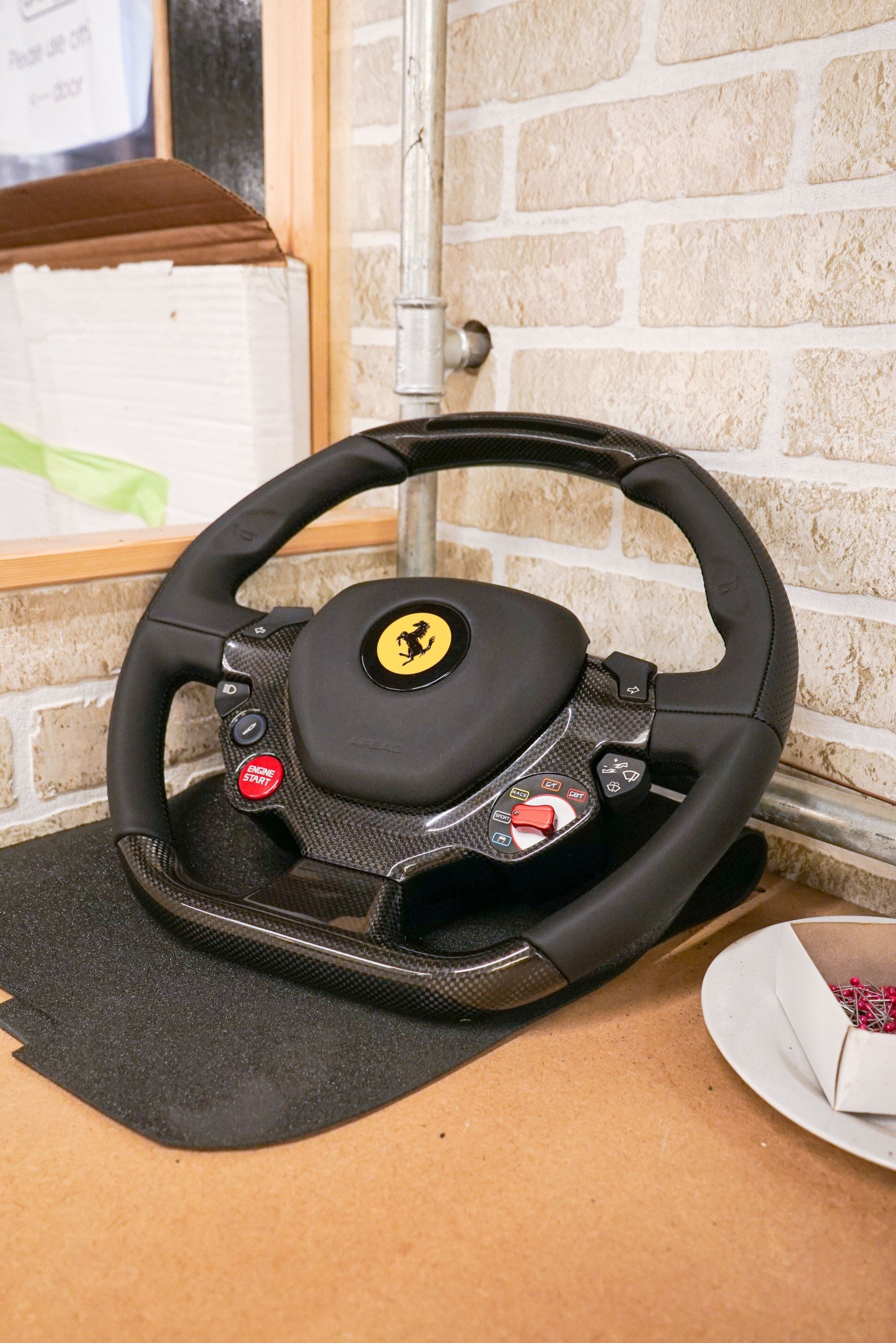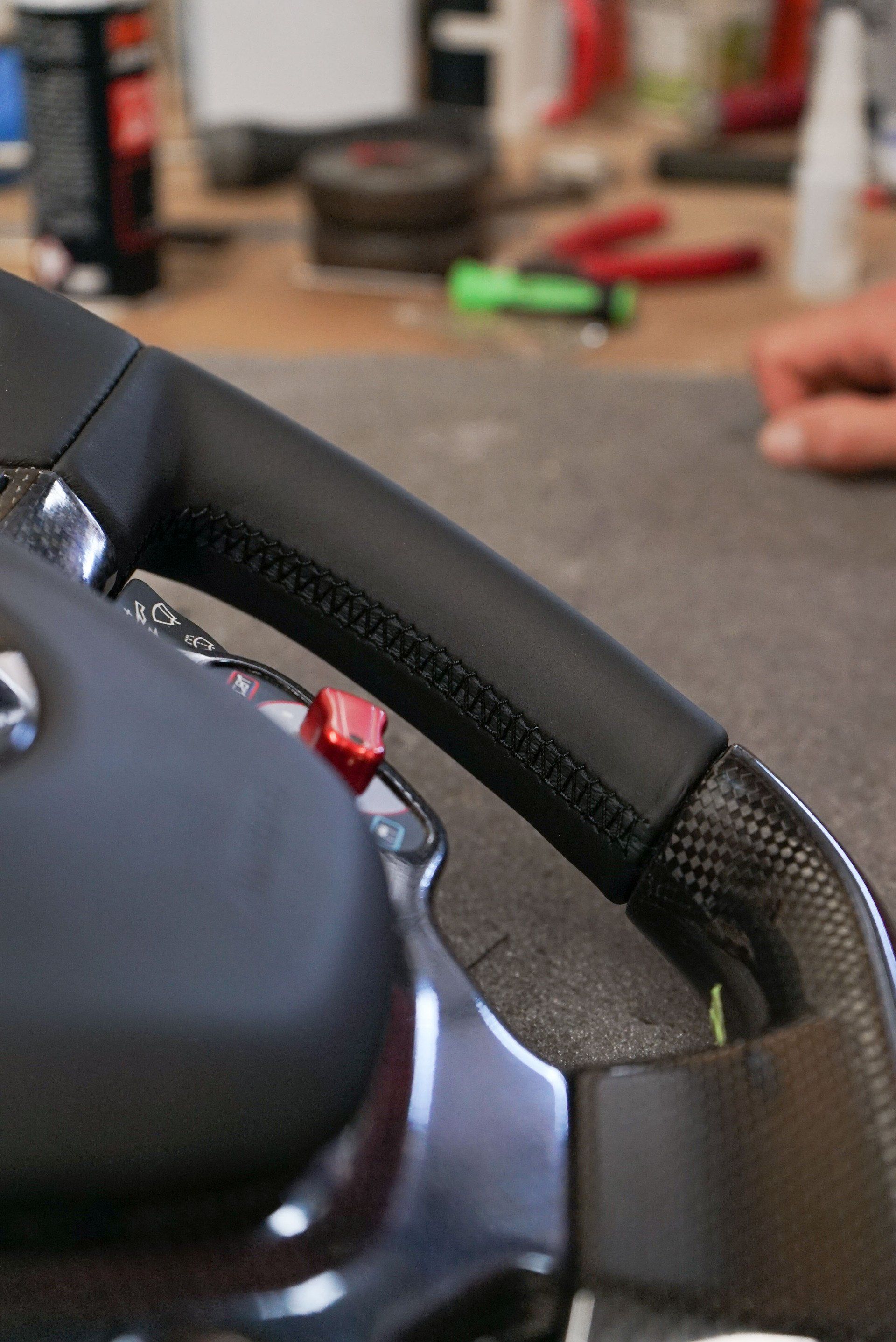 Ferrari 458 wheel retrim. Our customer requested for a stitch colour change from red to black on the steering wheel and dashboard pieces. New black nappa and perforated leather has been used for this wheel to match the OEM specifications from Ferrari. As mentioned we have also retrimmed the leather dashboard pieces and changed the stitching to black. finally, we replaced the silver interior plastic trim pieces with carbon fibre trims supplied by the customer. This customer has a stunning Ferrari collection, some of which are already booked in for future work with us.
