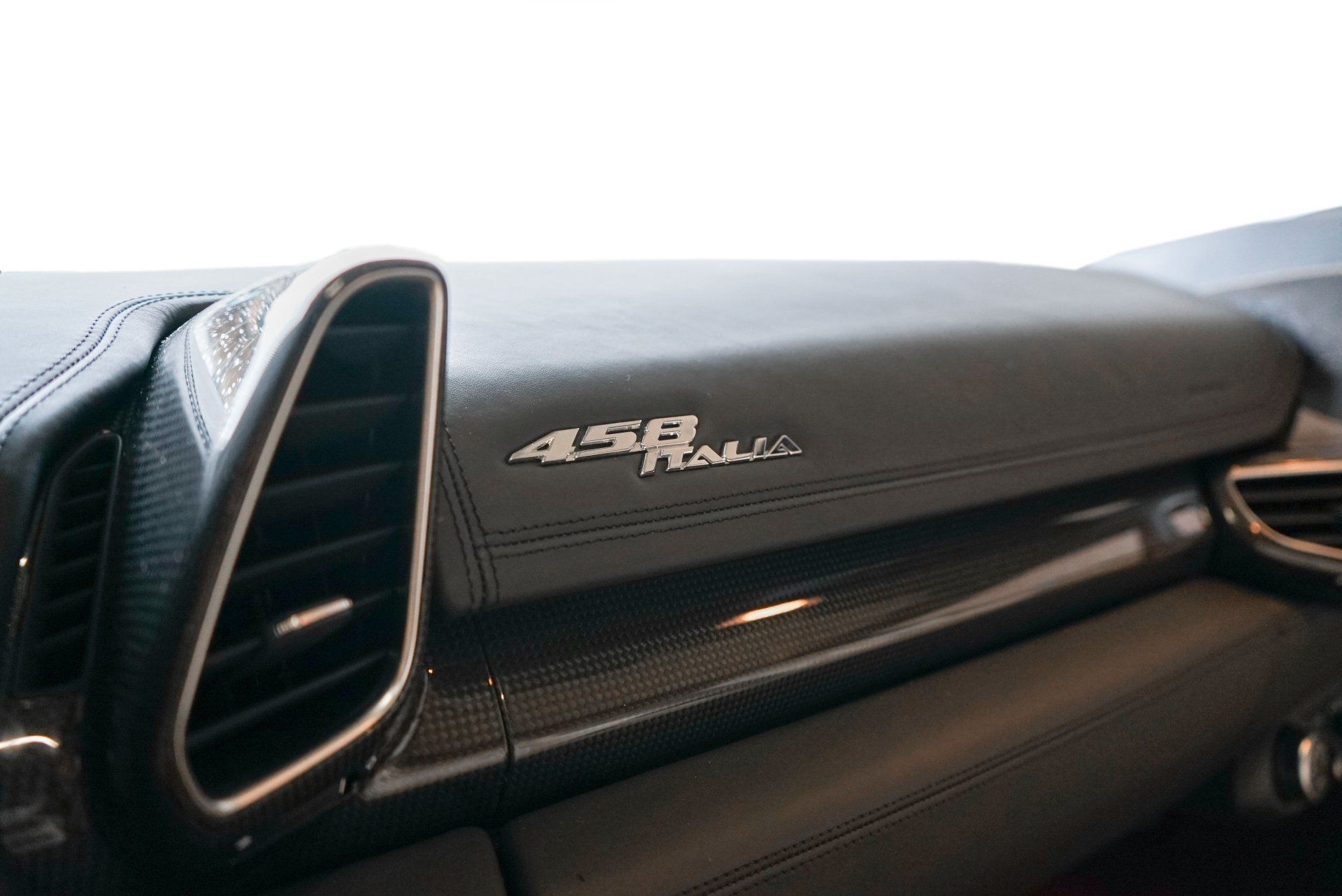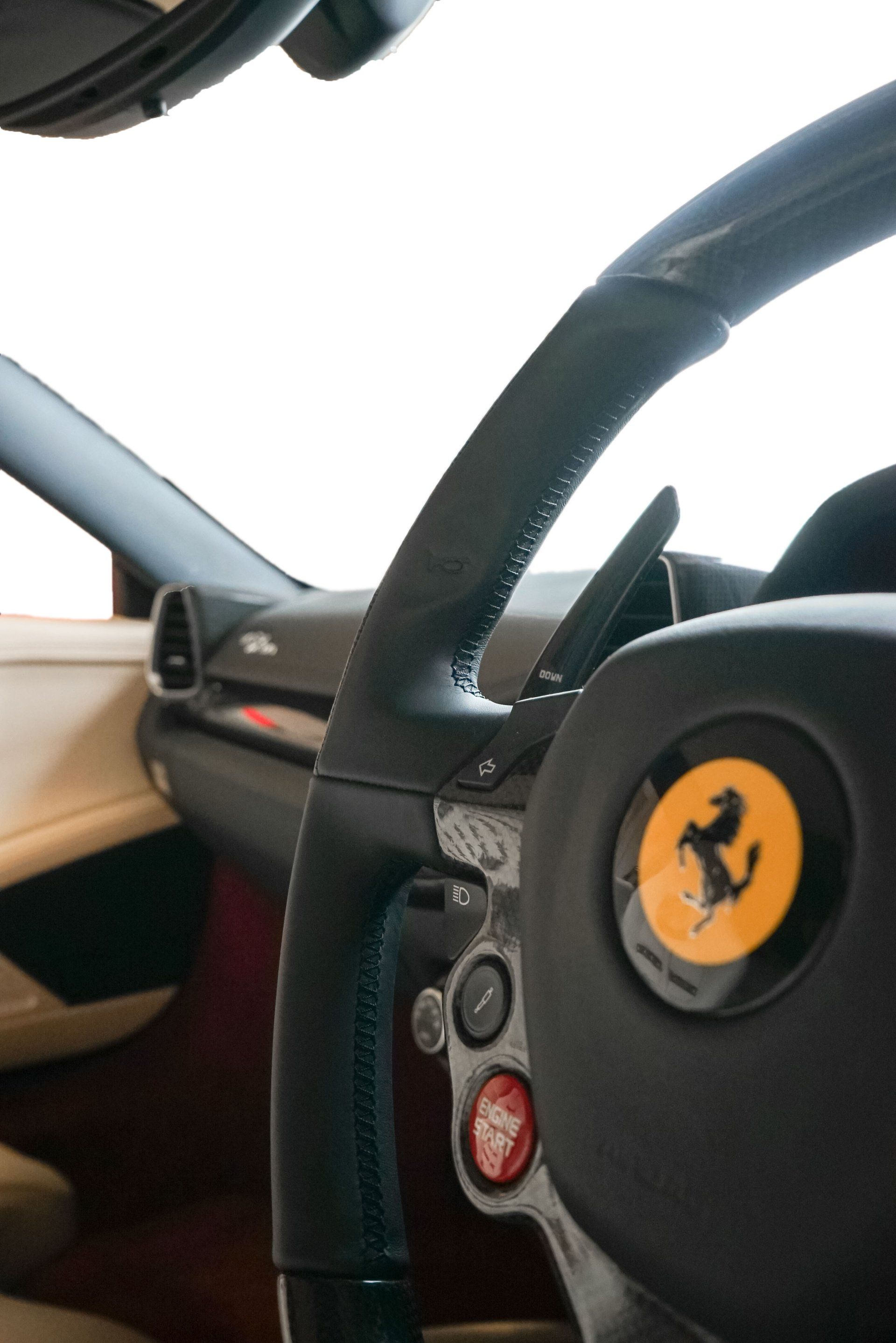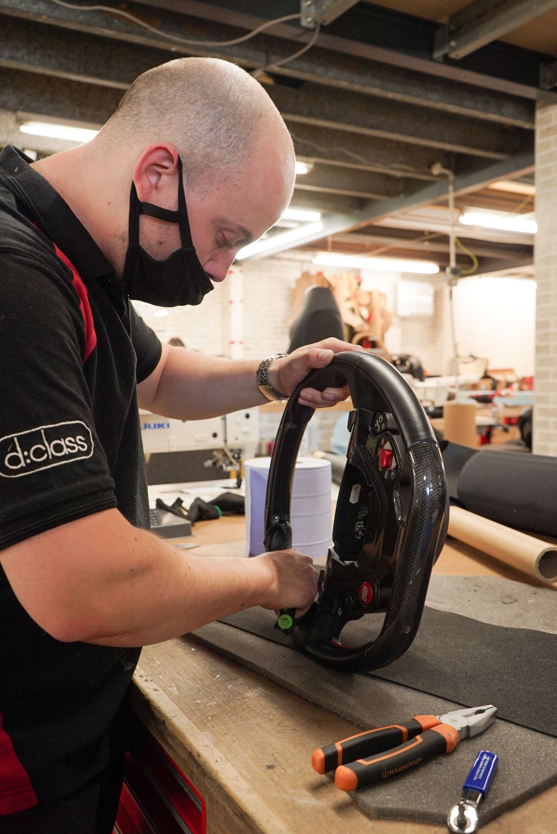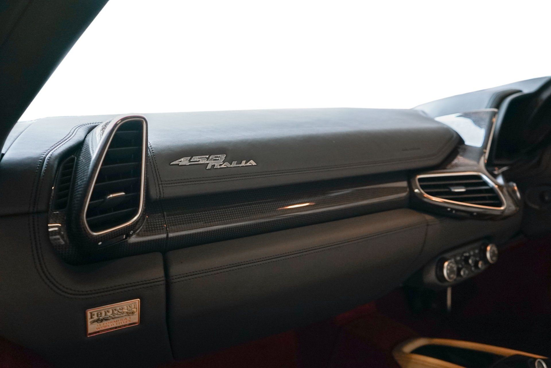 Ferrari 458 wheel retrim. Our customer requested for a stitch colour change from red to black on the steering wheel and dashboard pieces. New black nappa and perforated leather has been used for this wheel to match the OEM specifications from Ferrari. As mentioned we have also retrimmed the leather dashboard pieces and changed the stitching to black. finally, we replaced the silver interior plastic trim pieces with carbon fibre trims supplied by the customer. This customer has a stunning Ferrari collection, some of which are already booked in for future work with us.