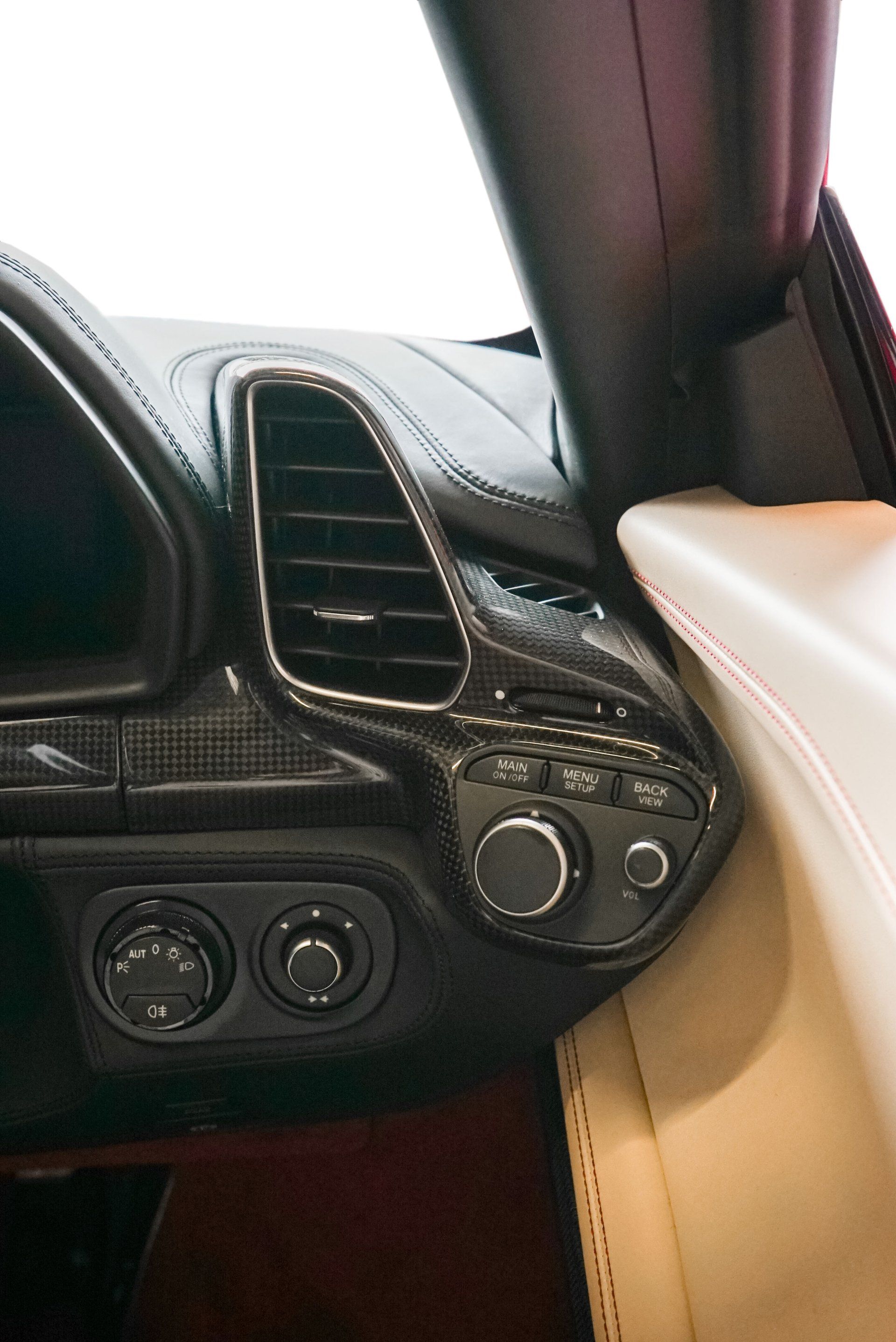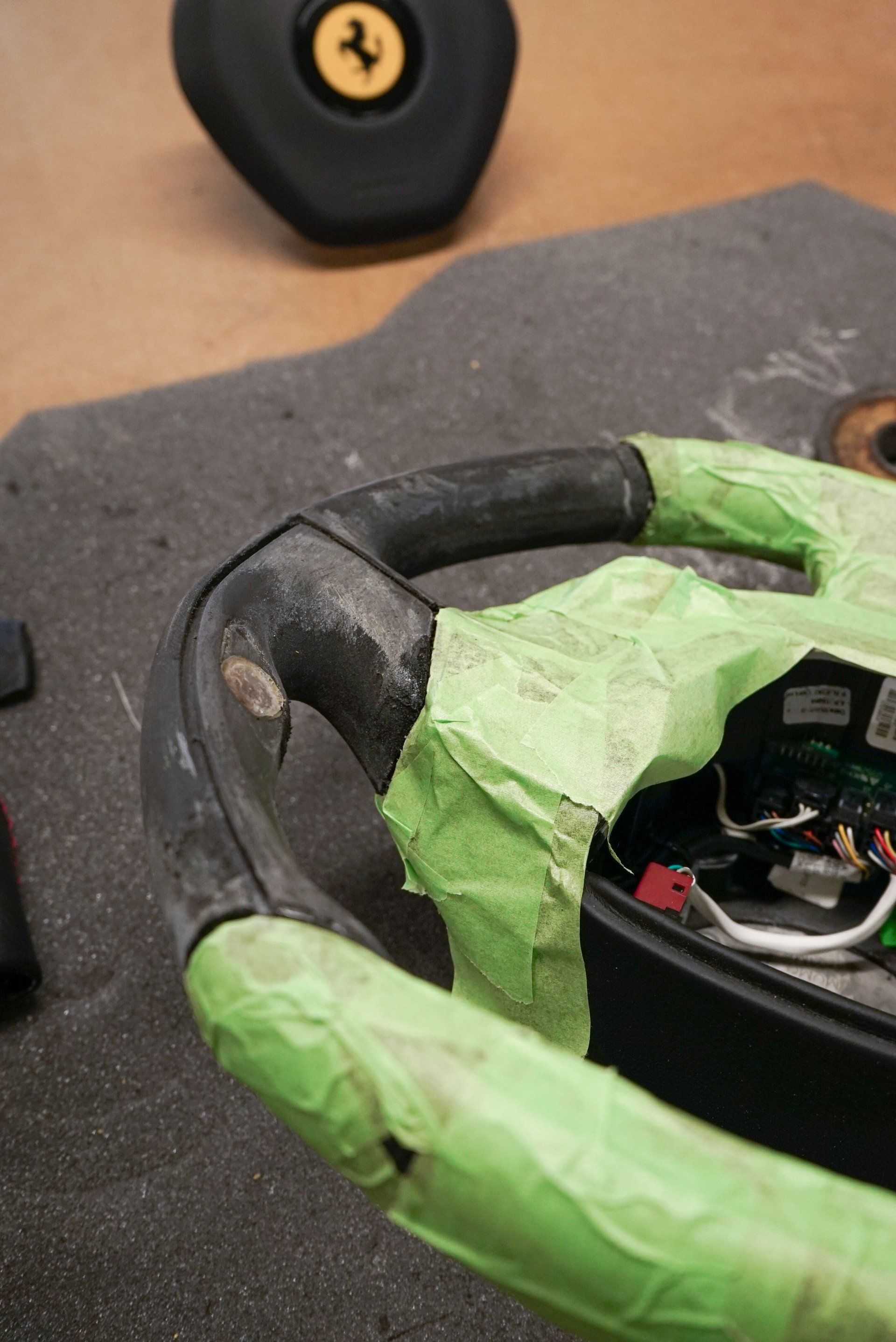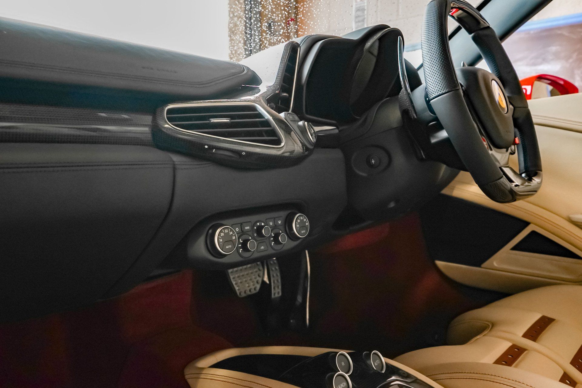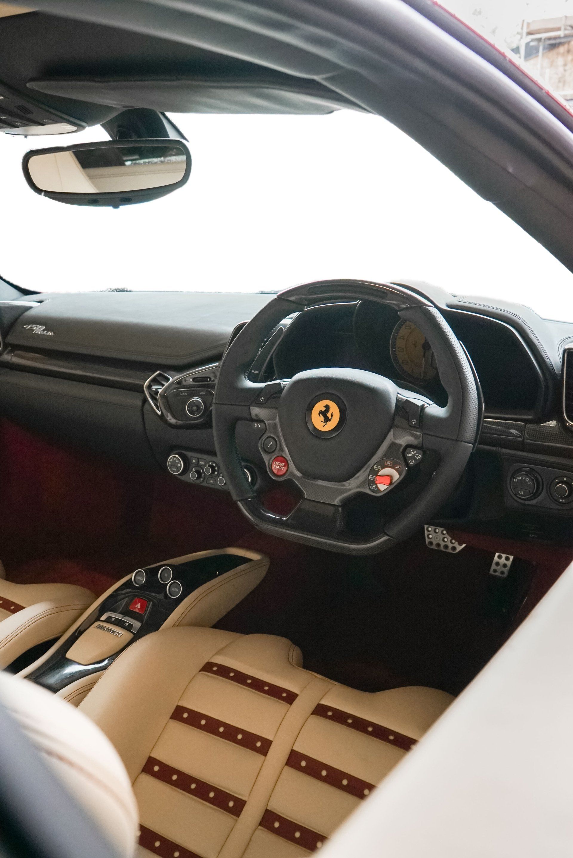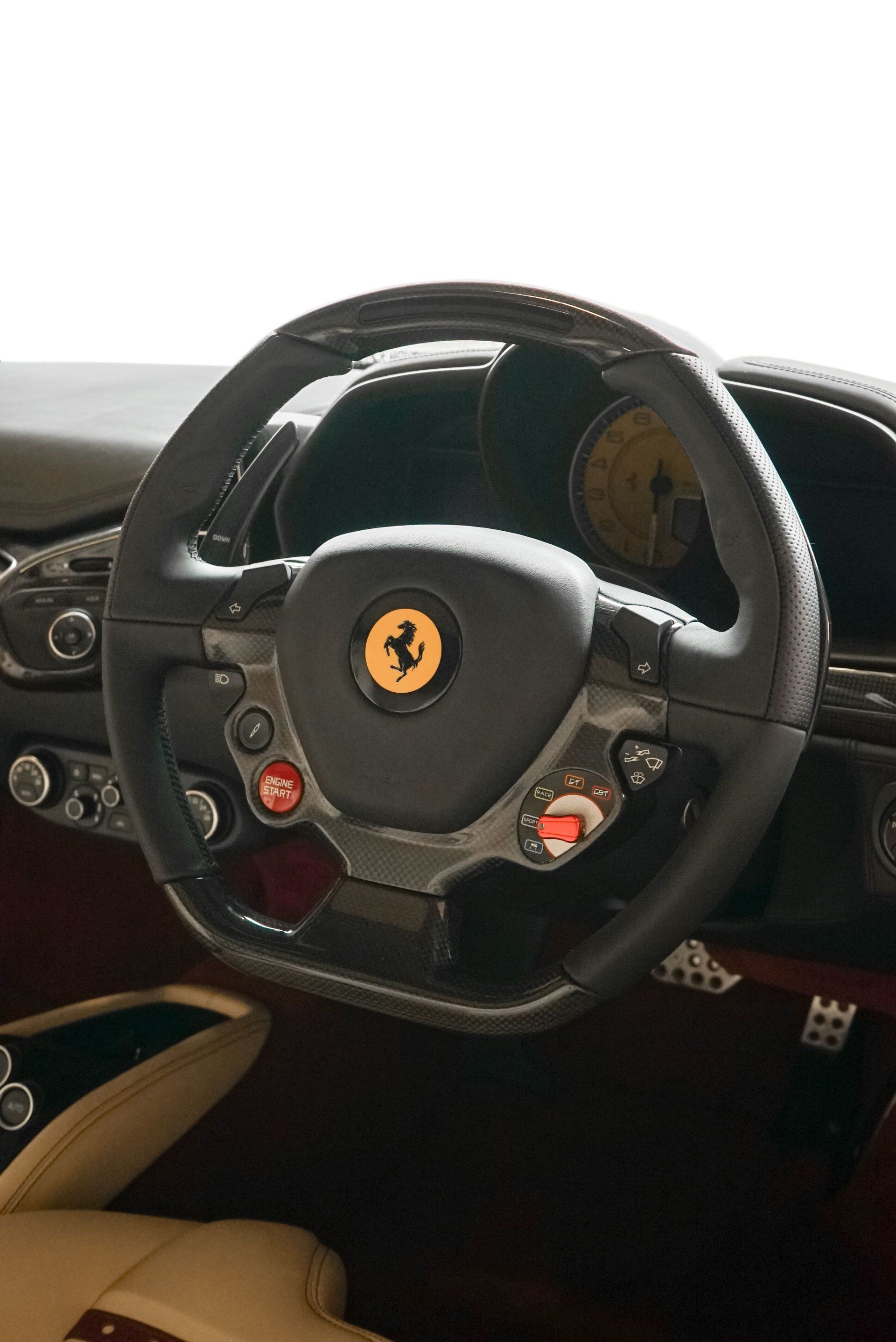 Ferrari 458 wheel retrim. Our customer requested for a stitch colour change from red to black on the steering wheel and dashboard pieces. New black nappa and perforated leather has been used for this wheel to match the OEM specifications from Ferrari. As mentioned we have also retrimmed the leather dashboard pieces and changed the stitching to black. finally, we replaced the silver interior plastic trim pieces with carbon fibre trims supplied by the customer. This customer has a stunning Ferrari collection, some of which are already booked in for future work with us.
