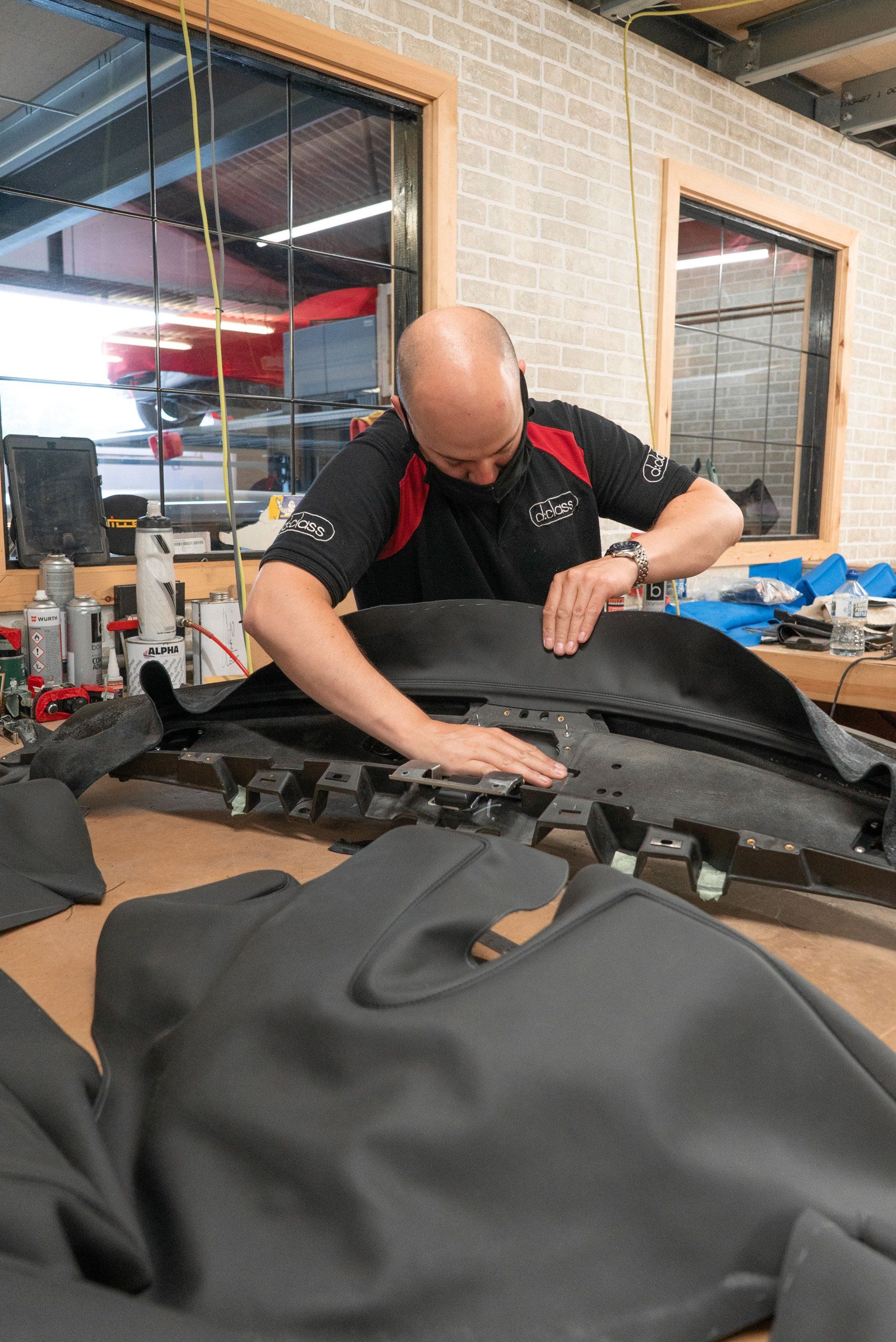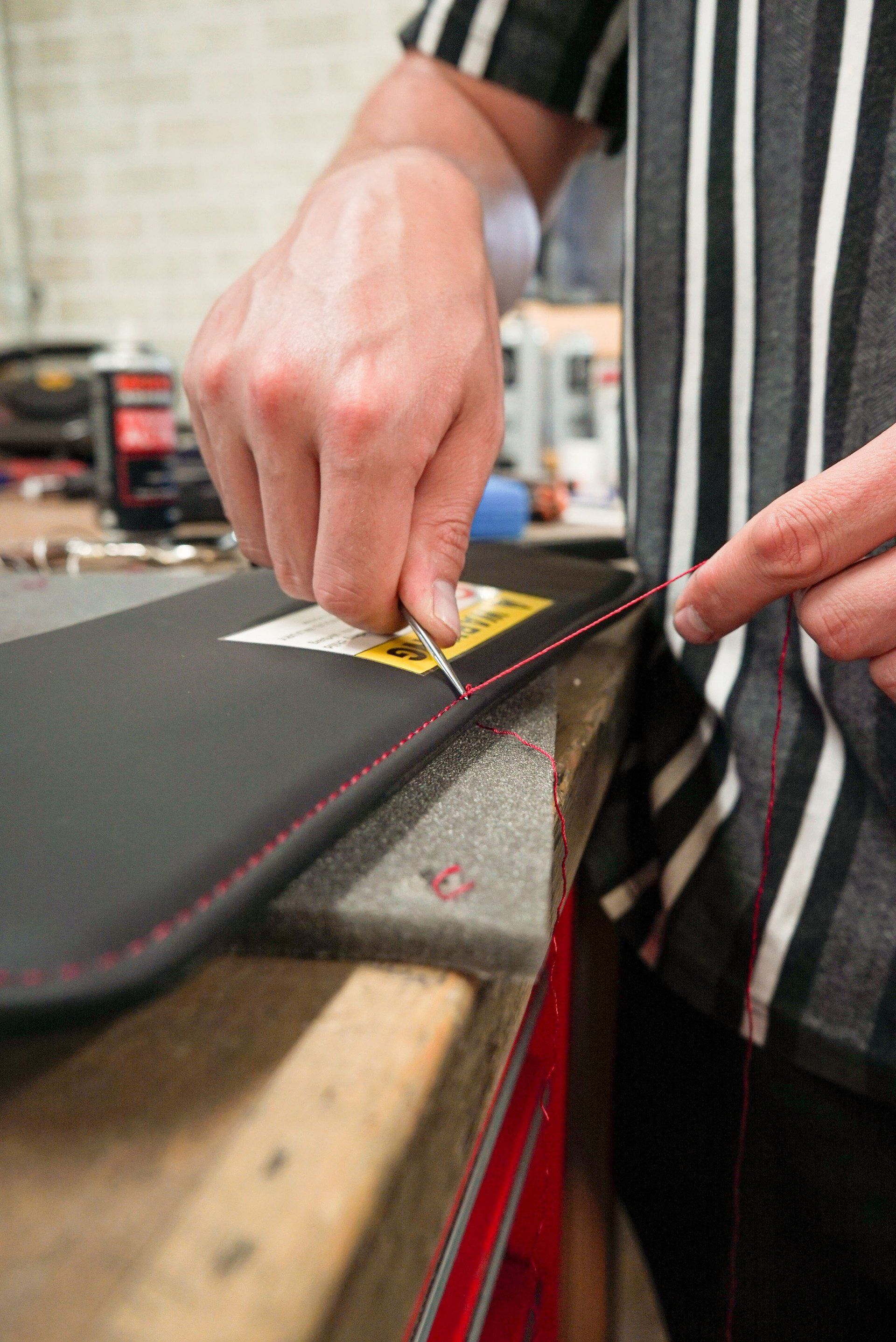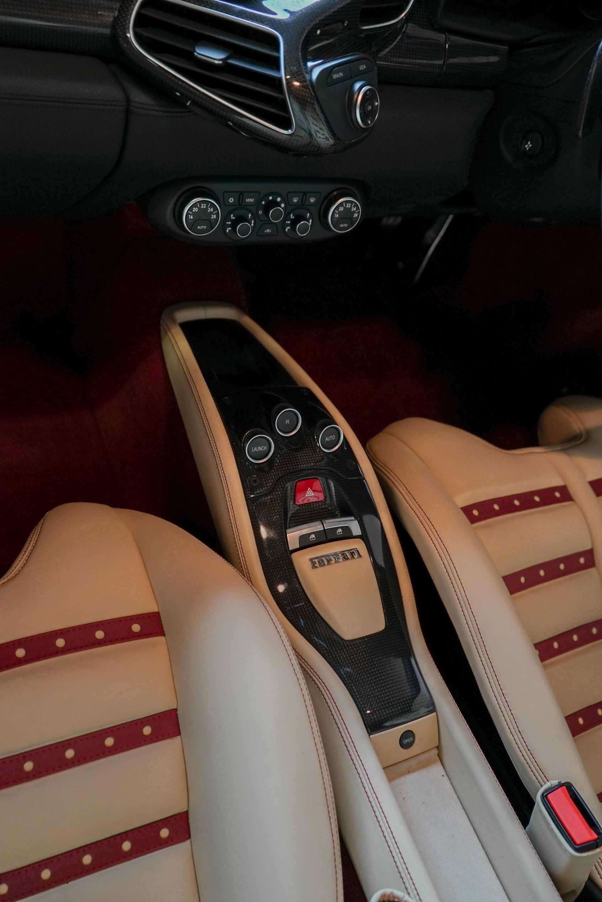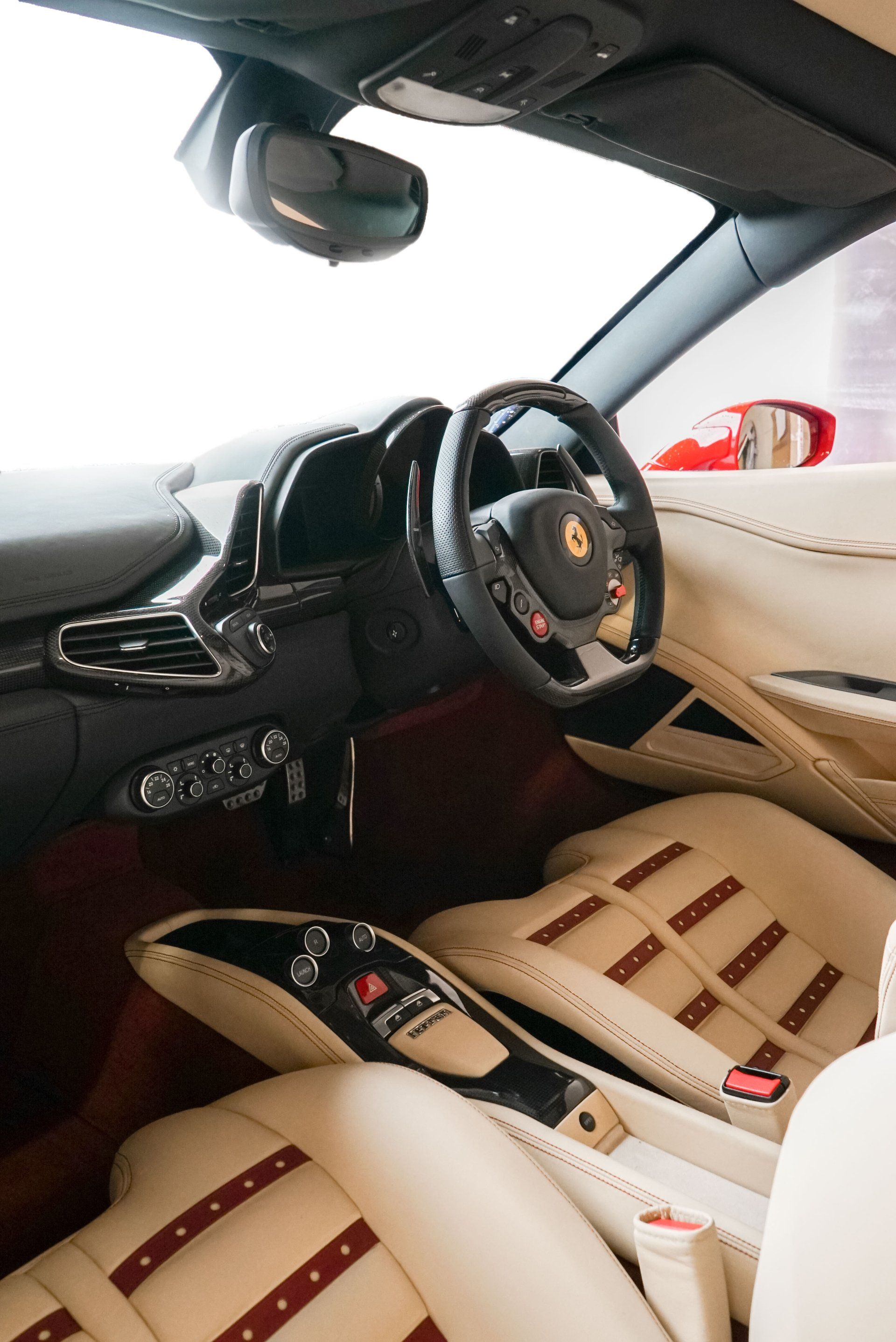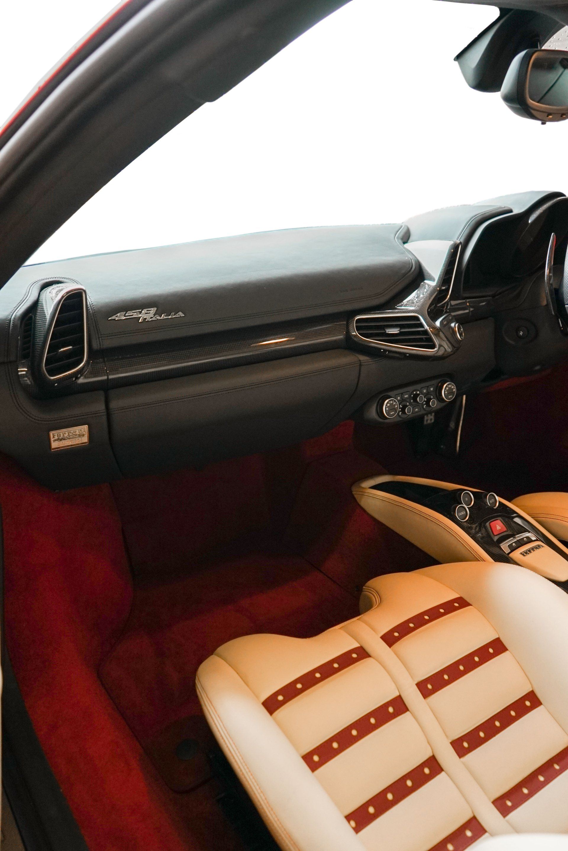 Ferrari 458 wheel retrim. Our customer requested for a stitch colour change from red to black on the steering wheel and dashboard pieces. New black nappa and perforated leather has been used for this wheel to match the OEM specifications from Ferrari. As mentioned we have also retrimmed the leather dashboard pieces and changed the stitching to black. finally, we replaced the silver interior plastic trim pieces with carbon fibre trims supplied by the customer. This customer has a stunning Ferrari collection, some of which are already booked in for future work with us.