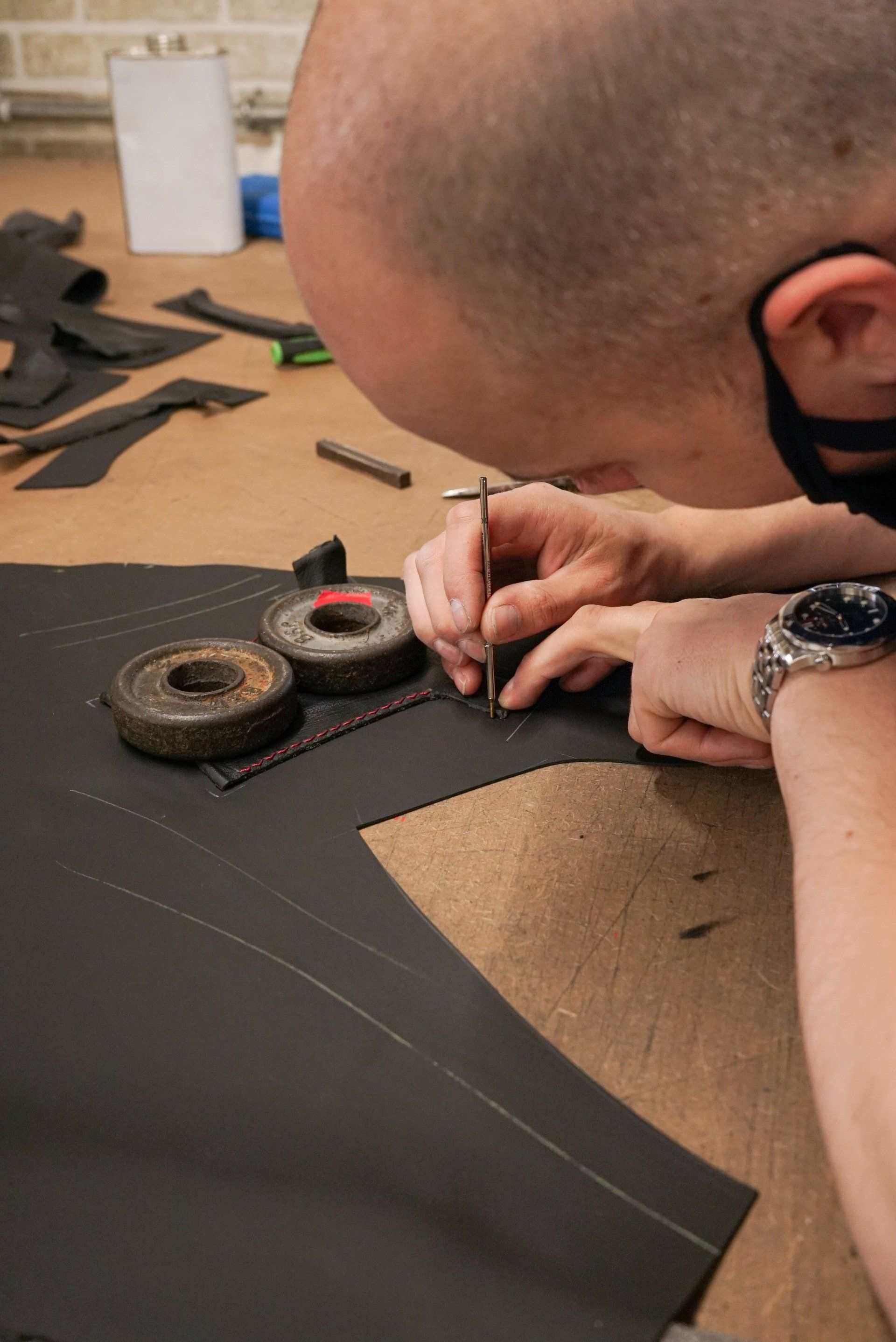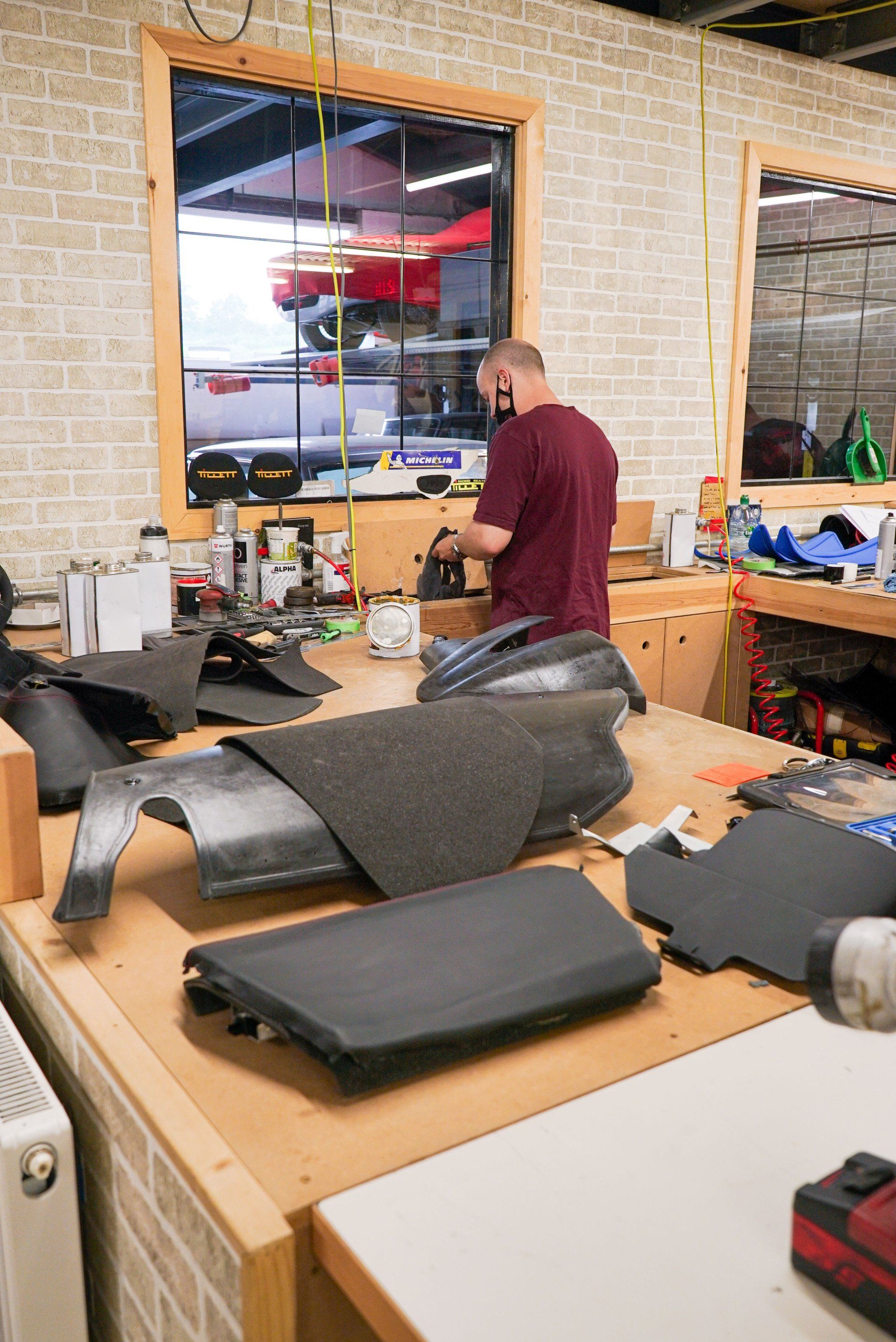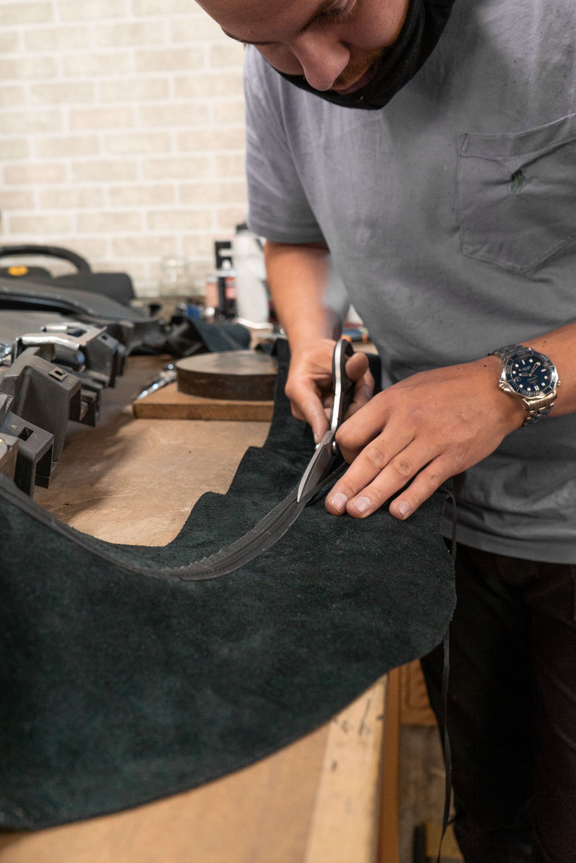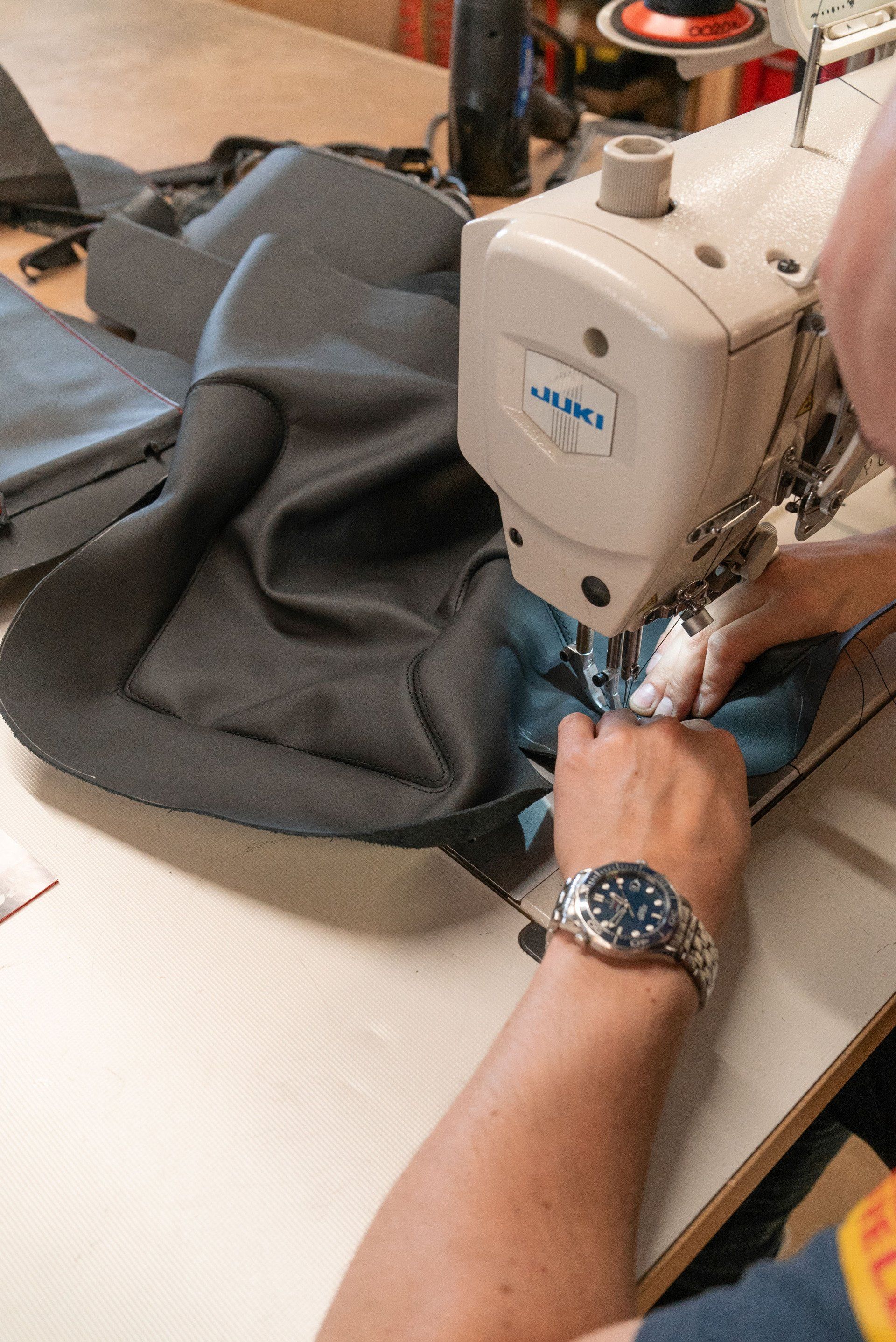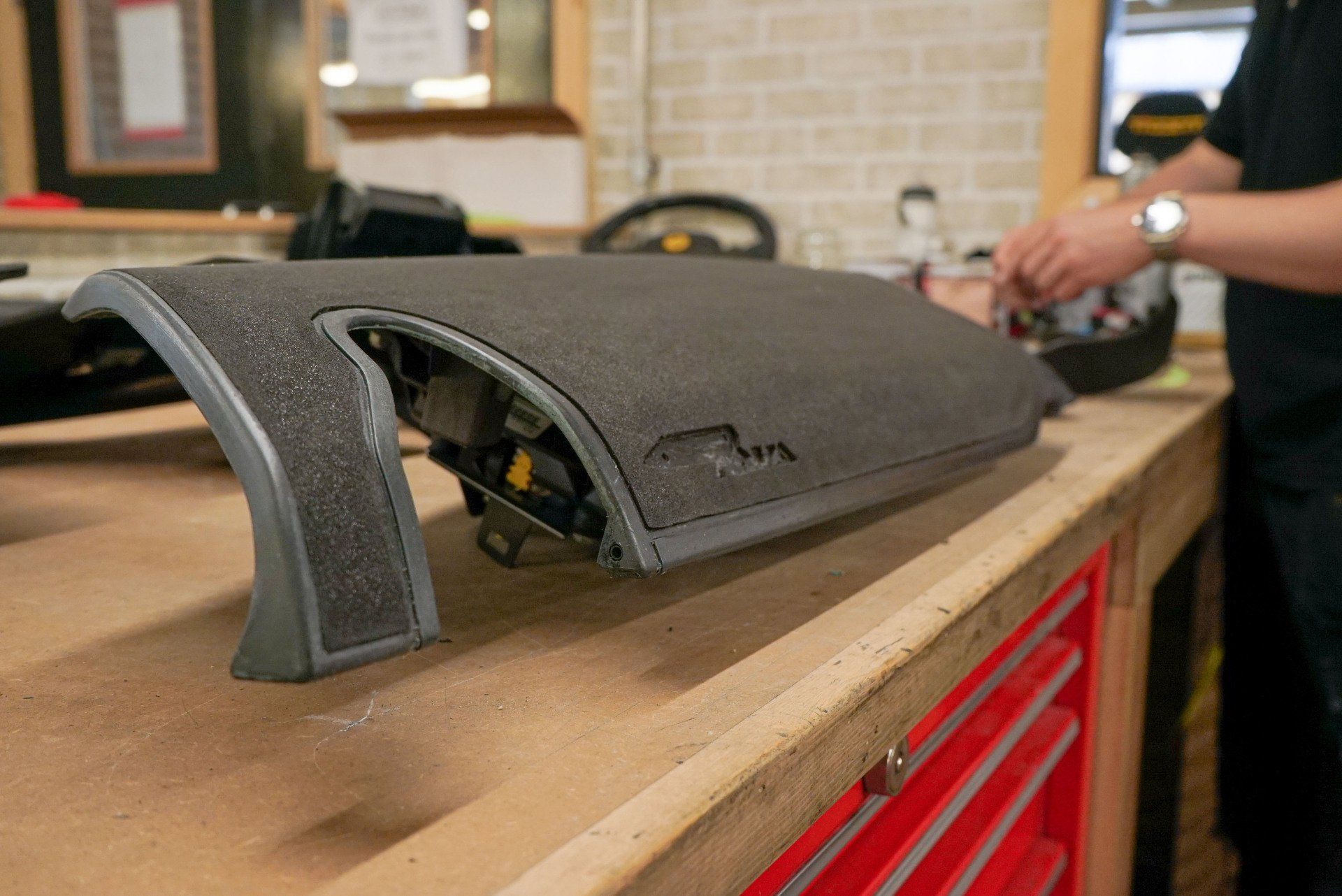 Ferrari 458 wheel retrim. Our customer requested for a stitch colour change from red to black on the steering wheel and dashboard pieces. New black nappa and perforated leather has been used for this wheel to match the OEM specifications from Ferrari. As mentioned we have also retrimmed the leather dashboard pieces and changed the stitching to black. finally, we replaced the silver interior plastic trim pieces with carbon fibre trims supplied by the customer. This customer has a stunning Ferrari collection, some of which are already booked in for future work with us.