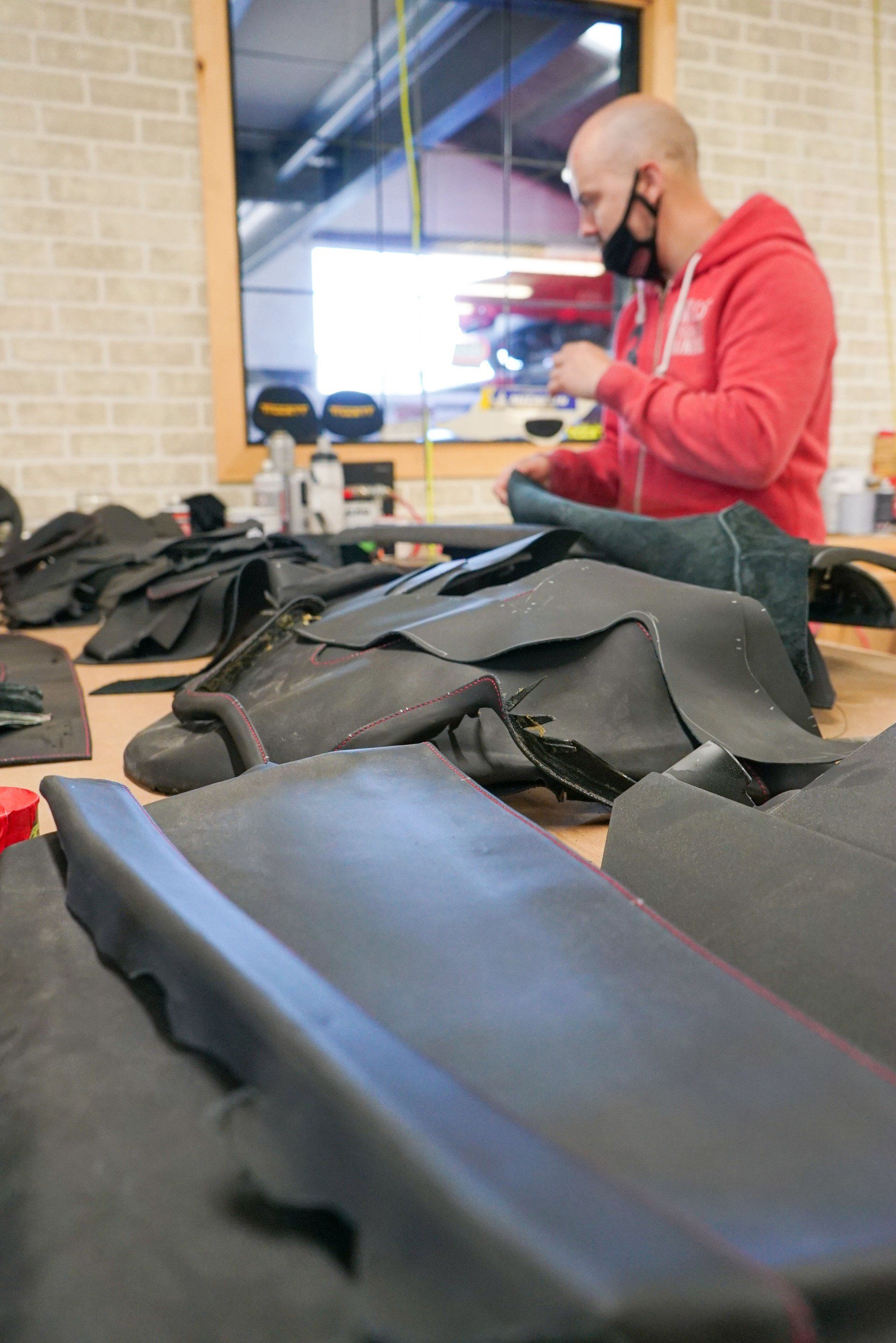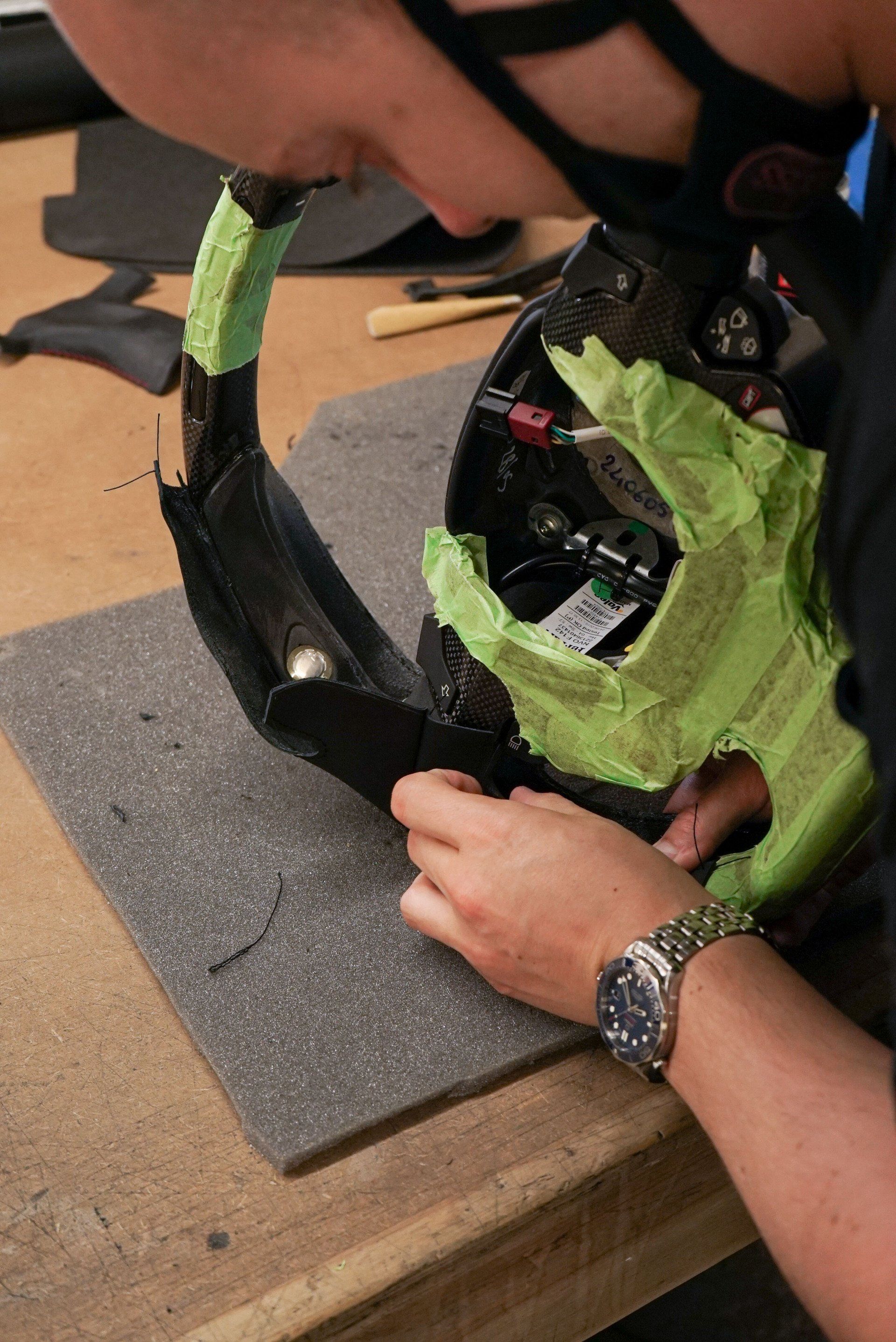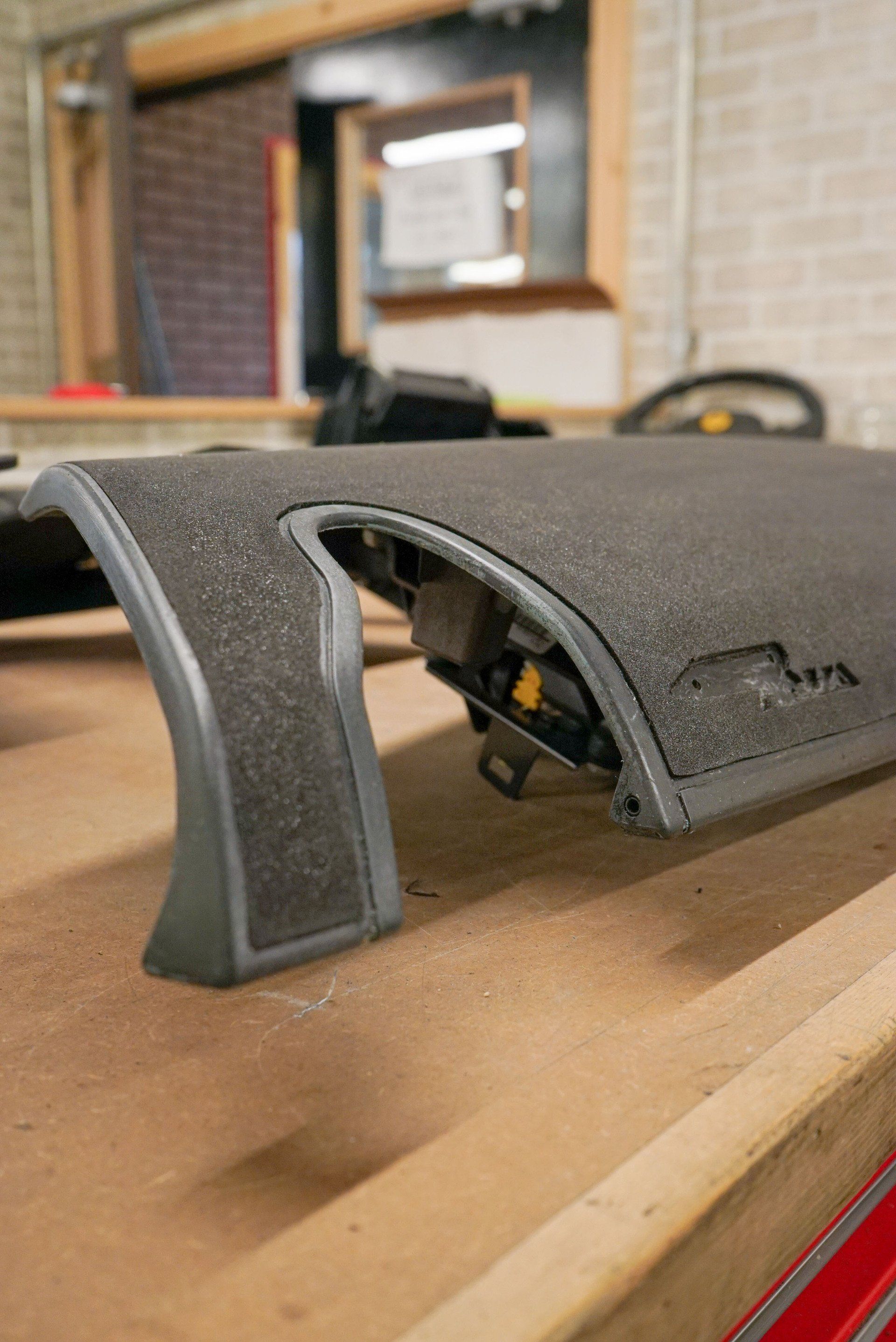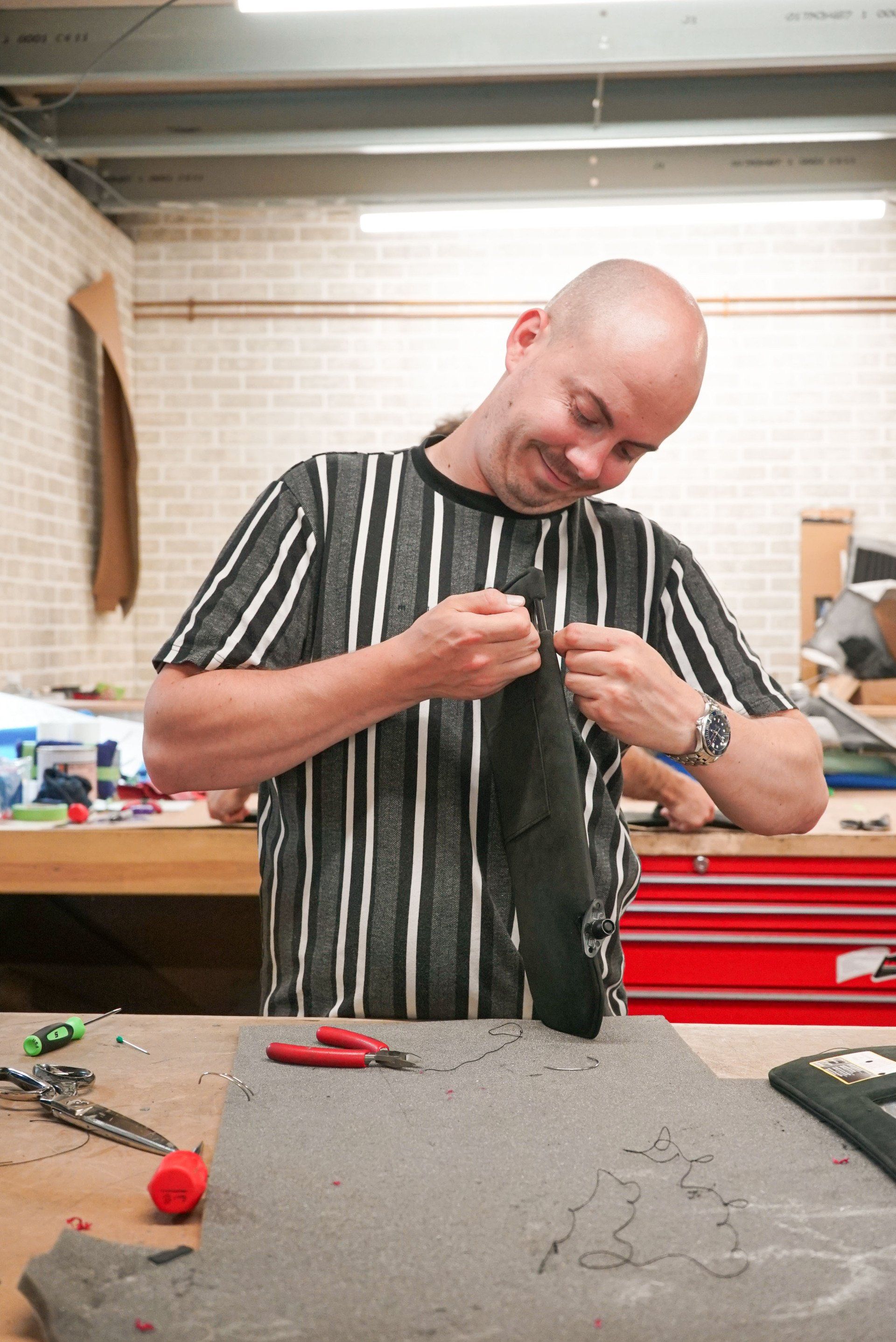 Ferrari 458 wheel retrim. Our customer requested for a stitch colour change from red to black on the steering wheel and dashboard pieces. New black nappa and perforated leather has been used for this wheel to match the OEM specifications from Ferrari. As mentioned we have also retrimmed the leather dashboard pieces and changed the stitching to black. finally, we replaced the silver interior plastic trim pieces with carbon fibre trims supplied by the customer. This customer has a stunning Ferrari collection, some of which are already booked in for future work with us.