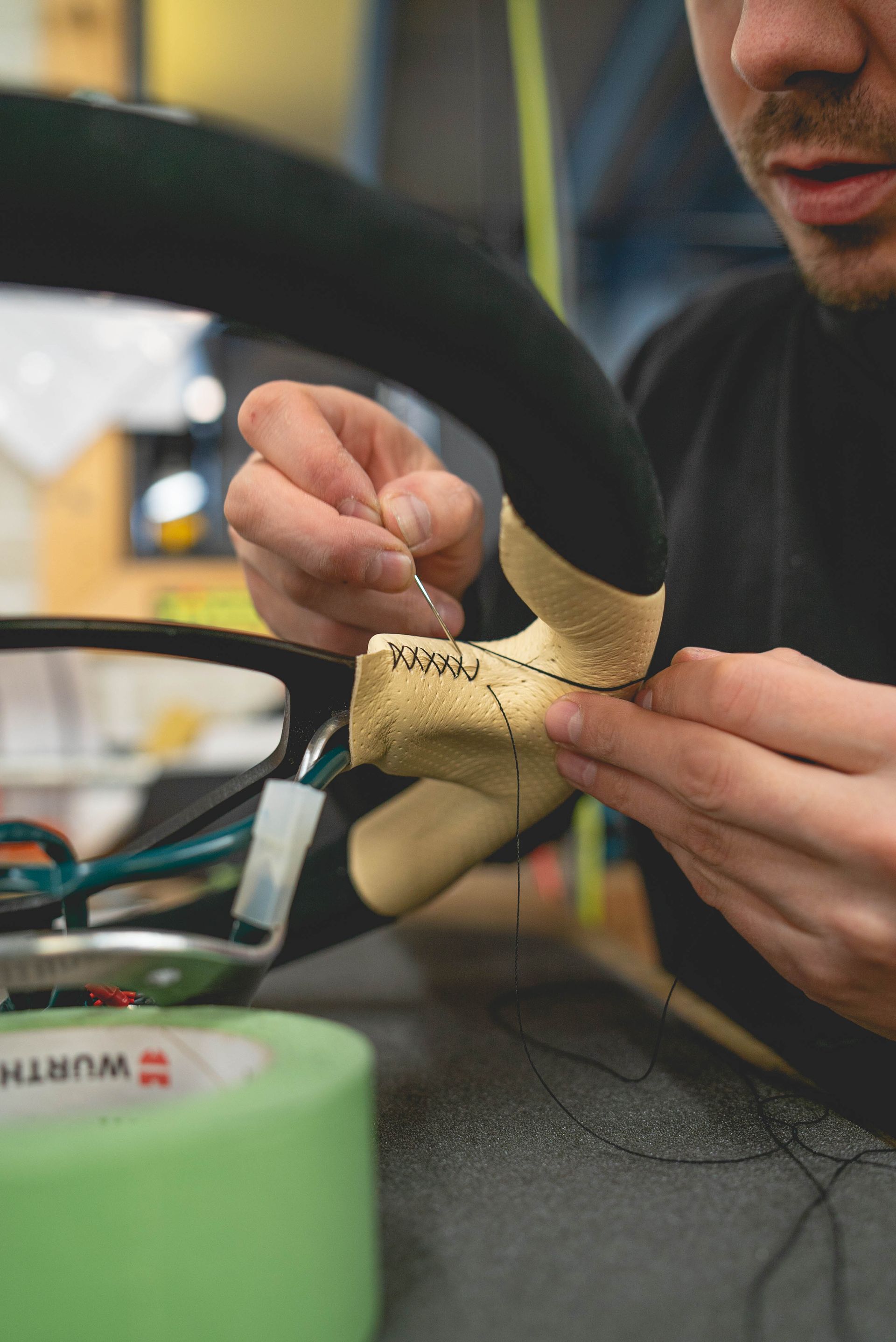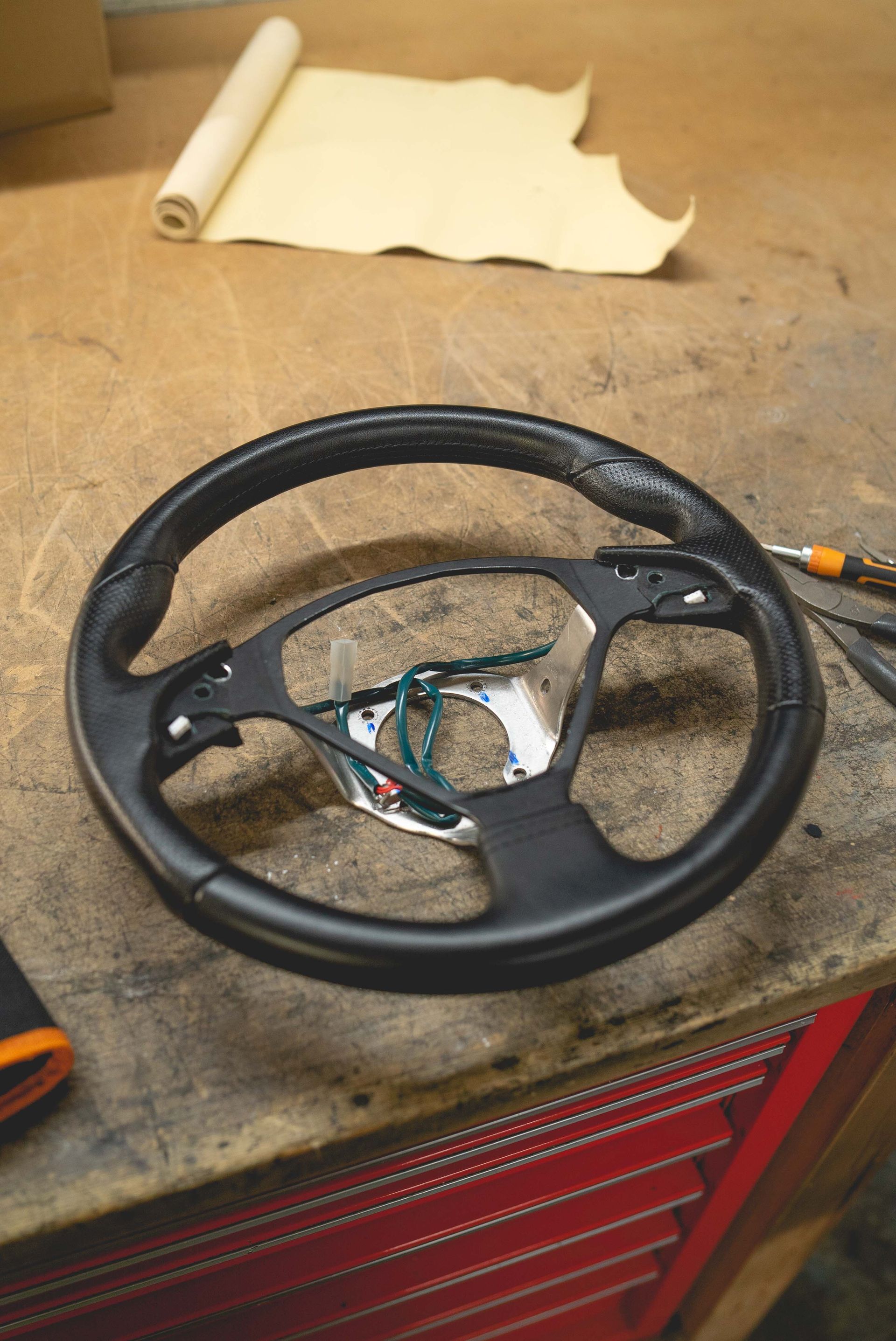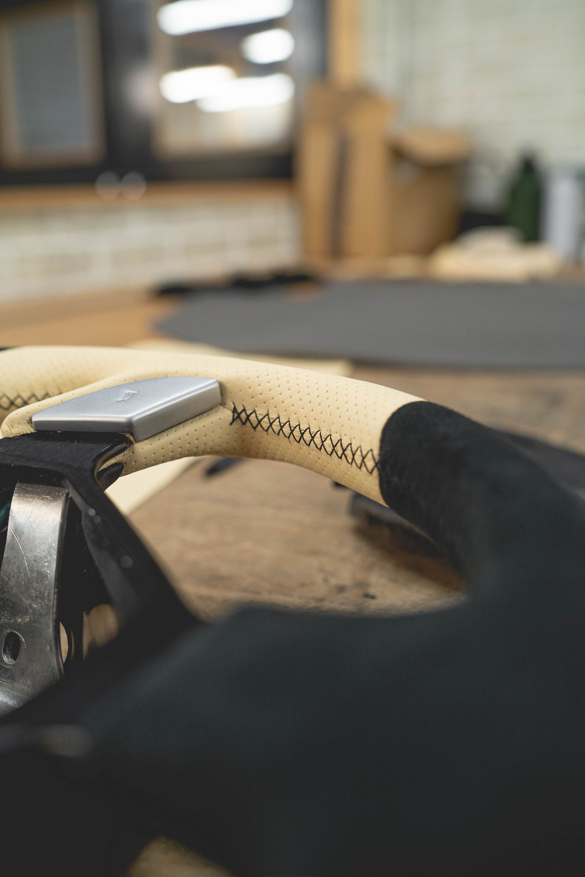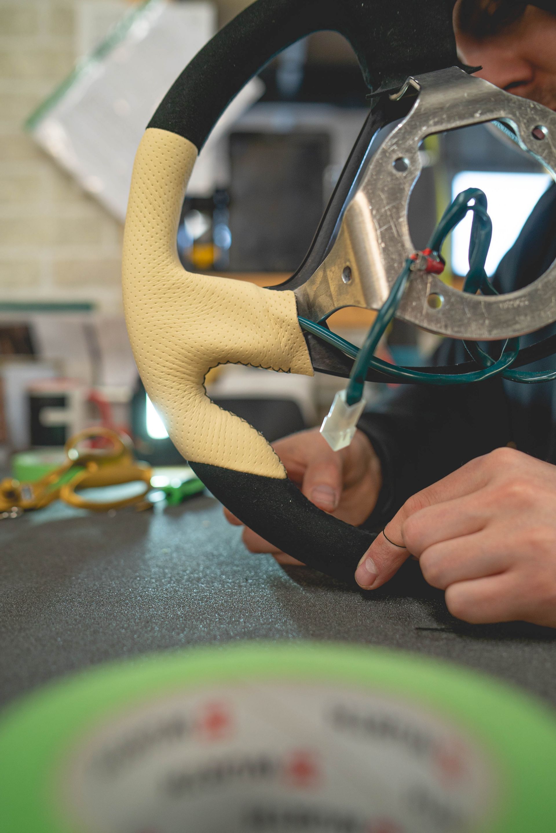 Wheel Wednesday this week with a lovely Ferrari 575 steering wheel retrim. The black leather has been swapped out with a mixture of crema nappa perforated leather and black Alcantara trimmed to OEM spec with black cross hand stitching. The airbag/horn push has also been retrimmed with crema nappa leather with "airbag" debossing.
