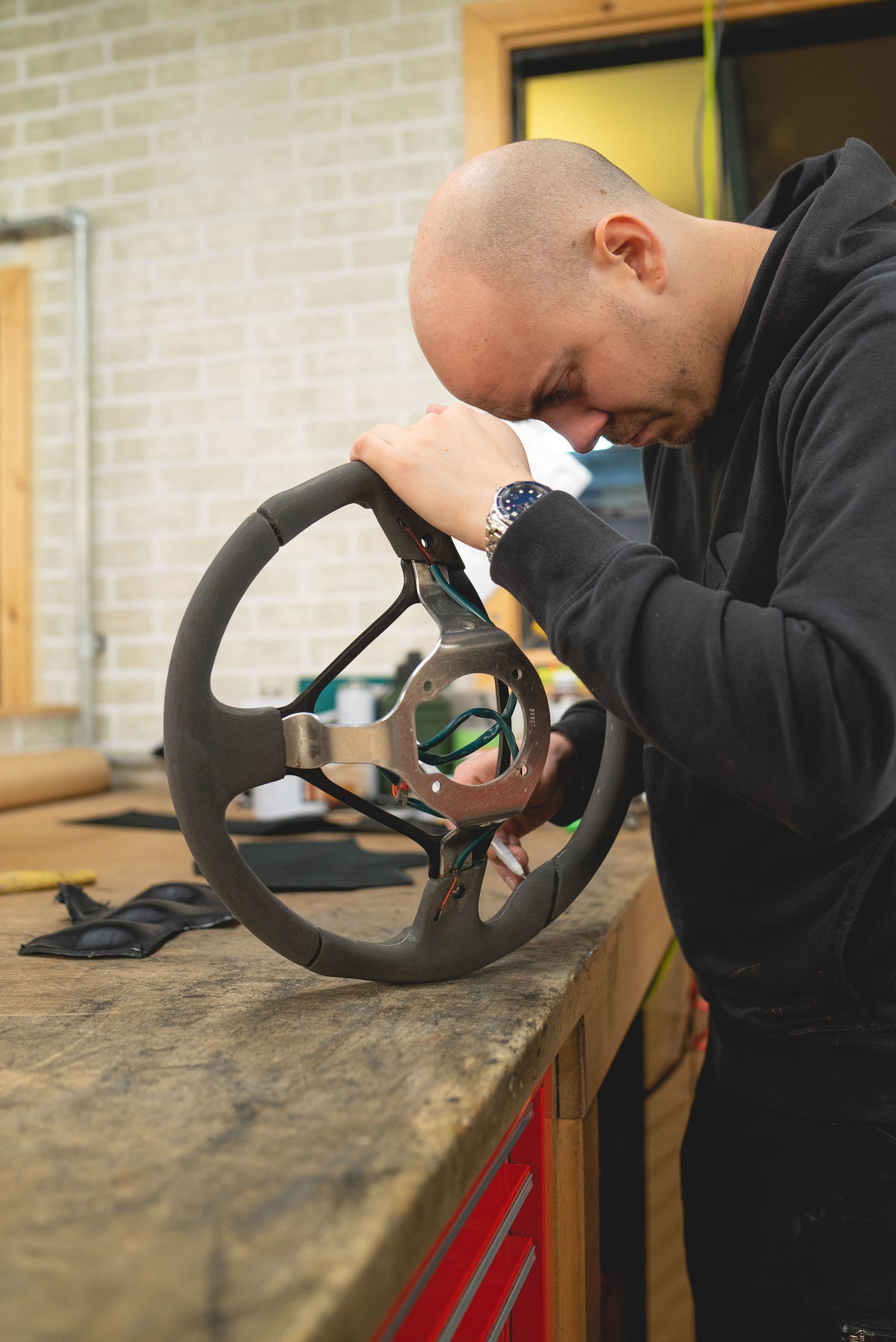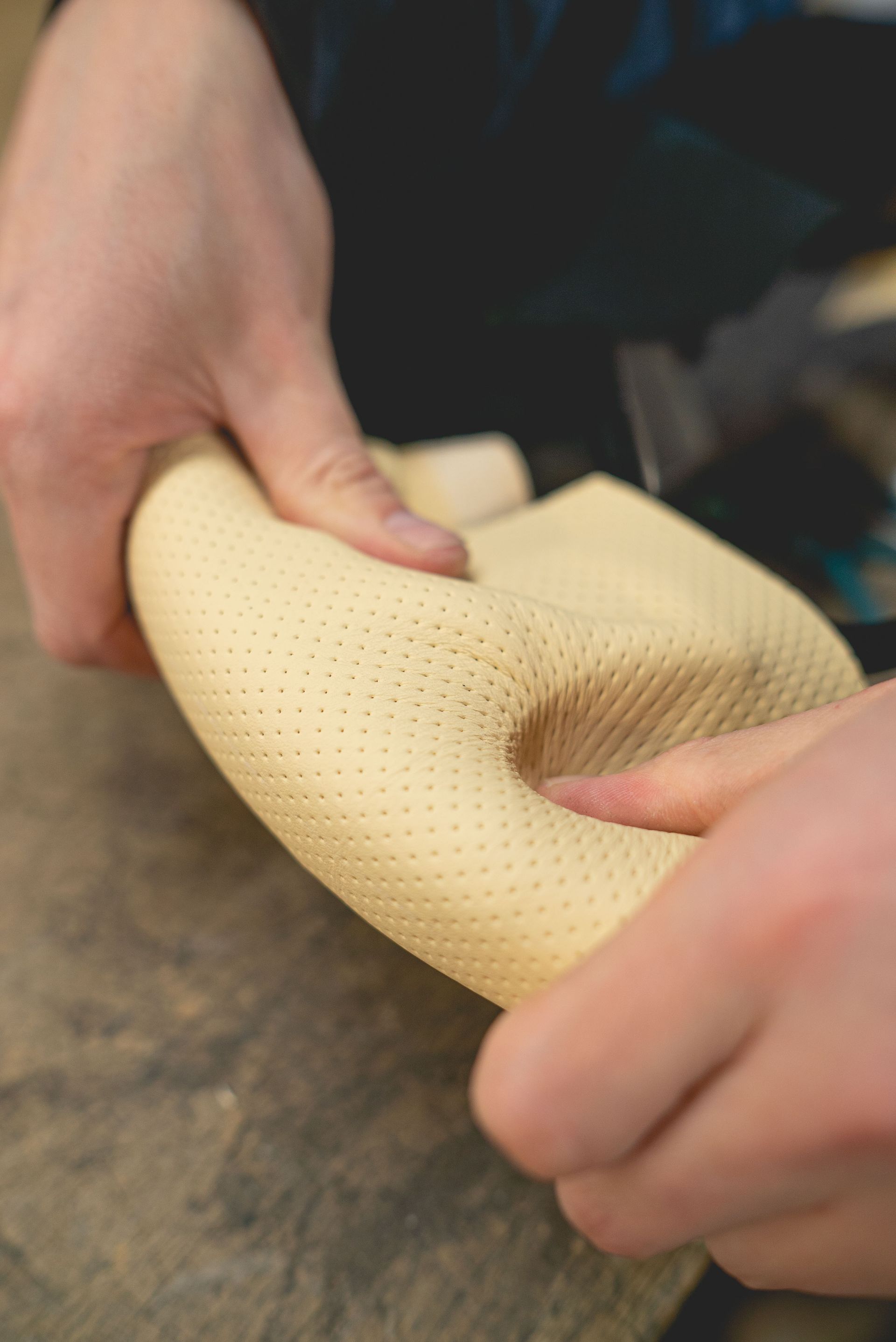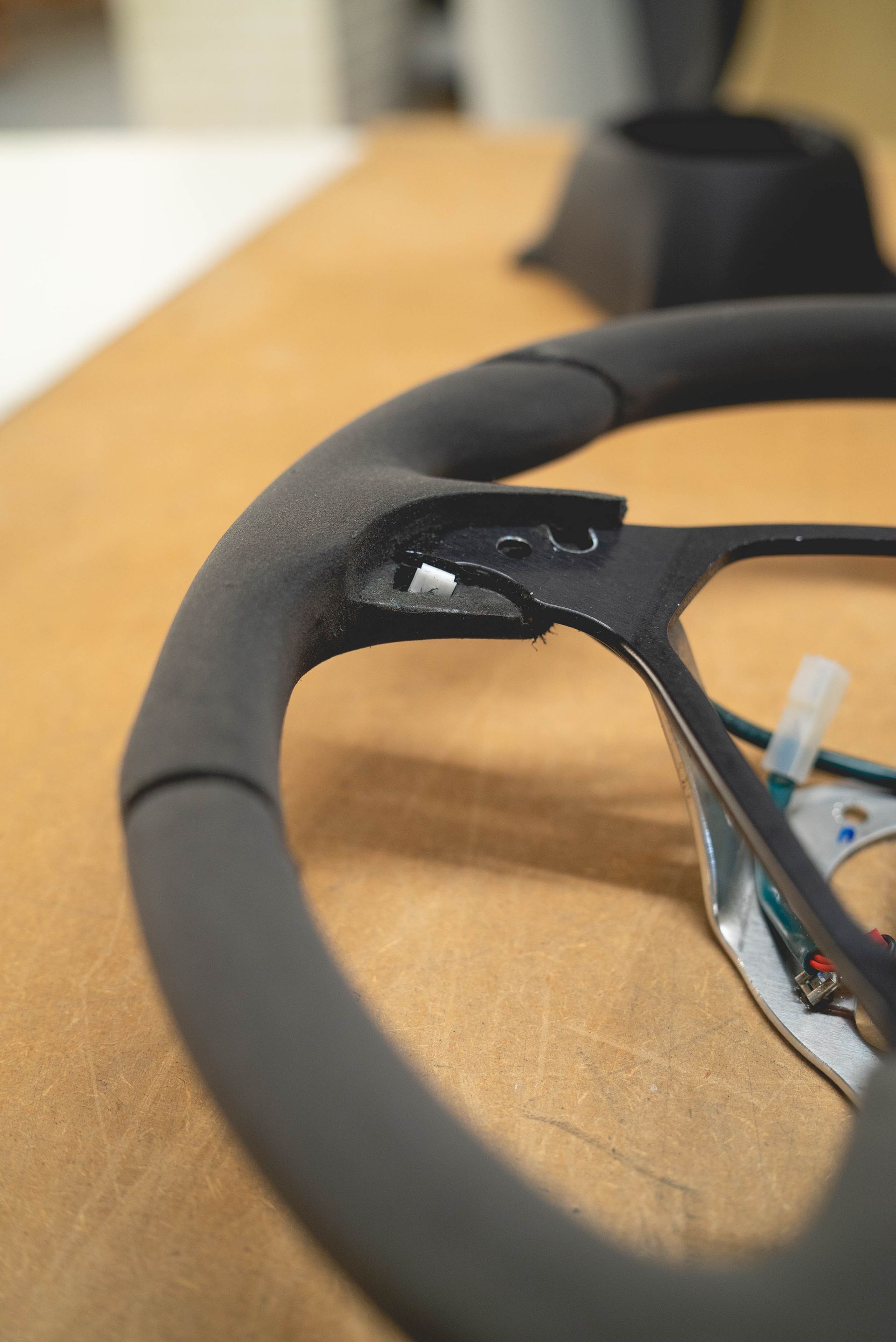 Wheel Wednesday this week with a lovely Ferrari 575 steering wheel retrim. The black leather has been swapped out with a mixture of crema nappa perforated leather and black Alcantara trimmed to OEM spec with black cross hand stitching. The airbag/horn push has also been retrimmed with crema nappa leather with "airbag" debossing.