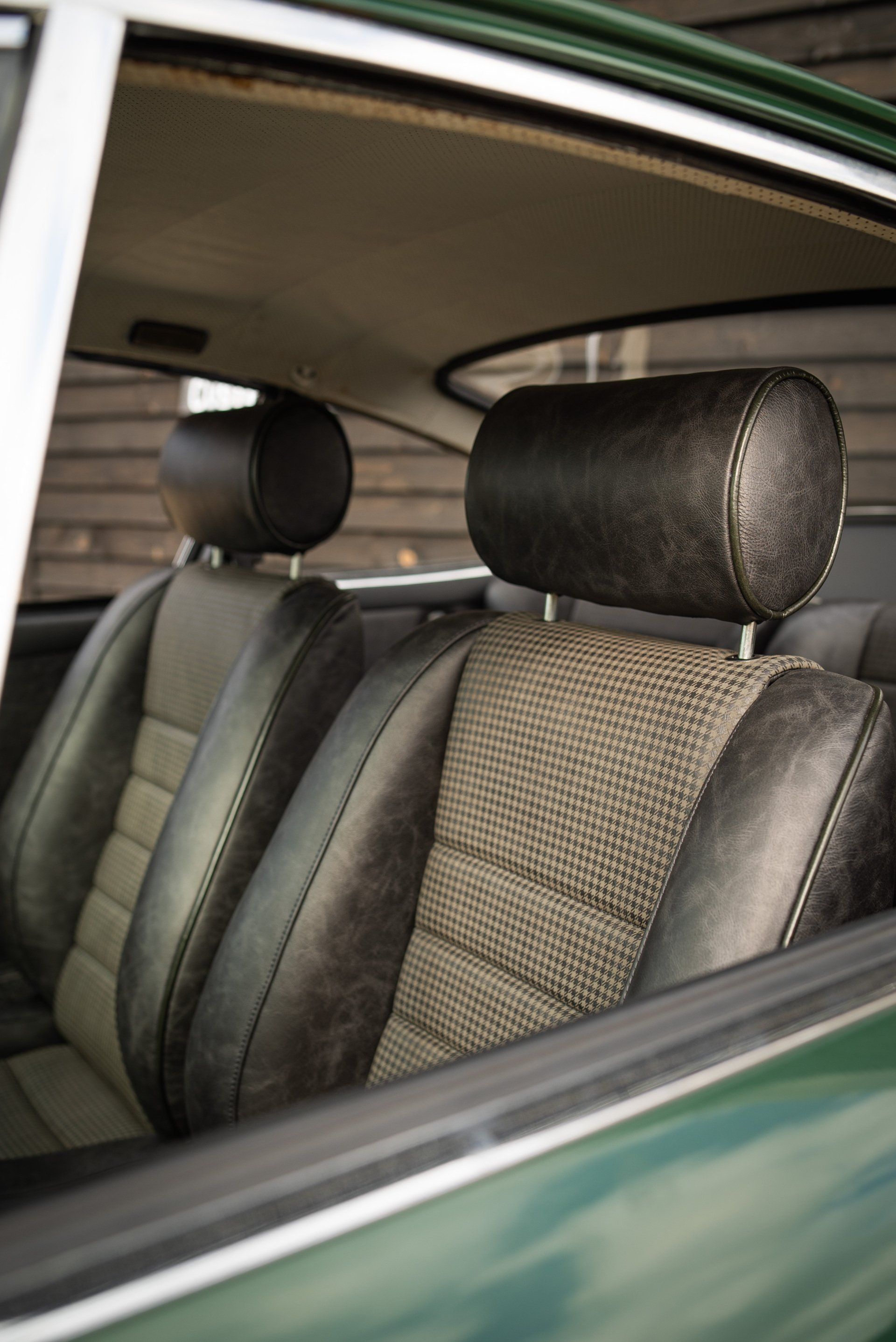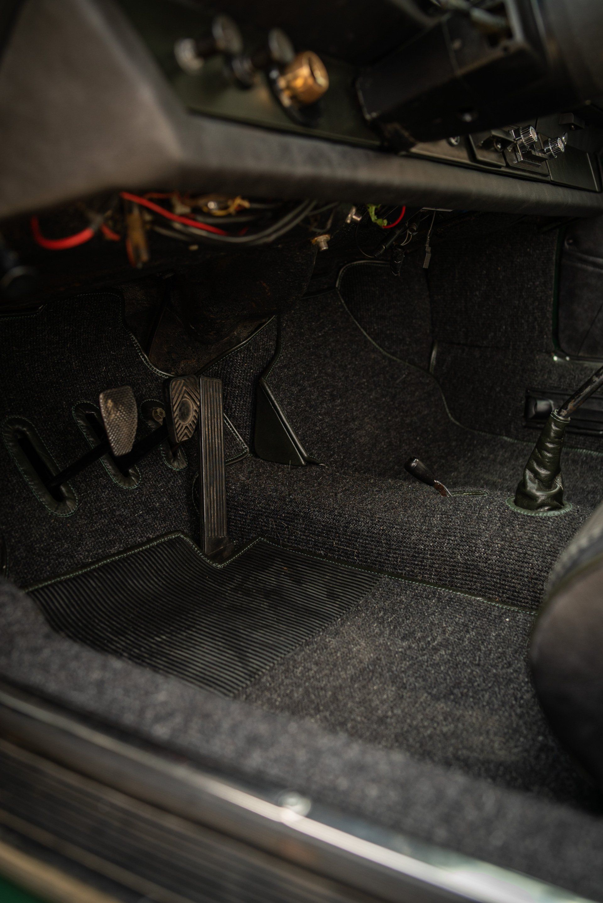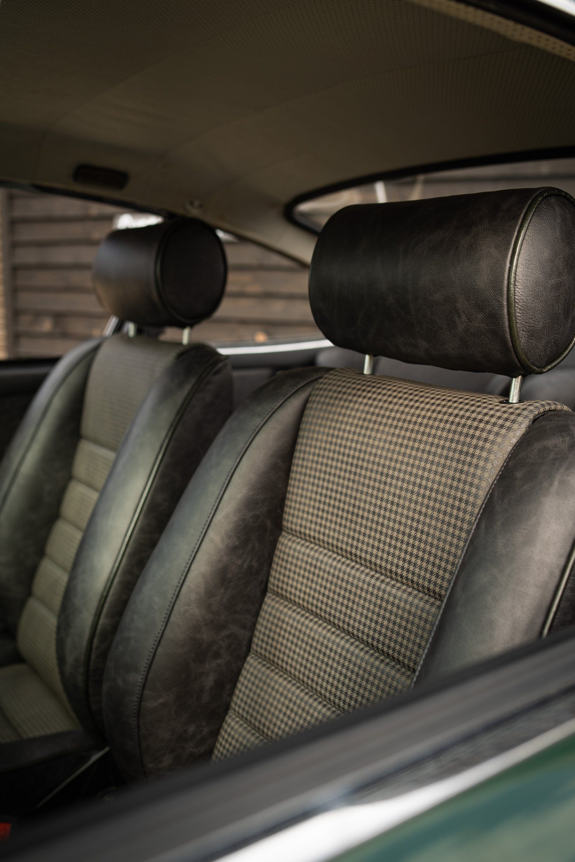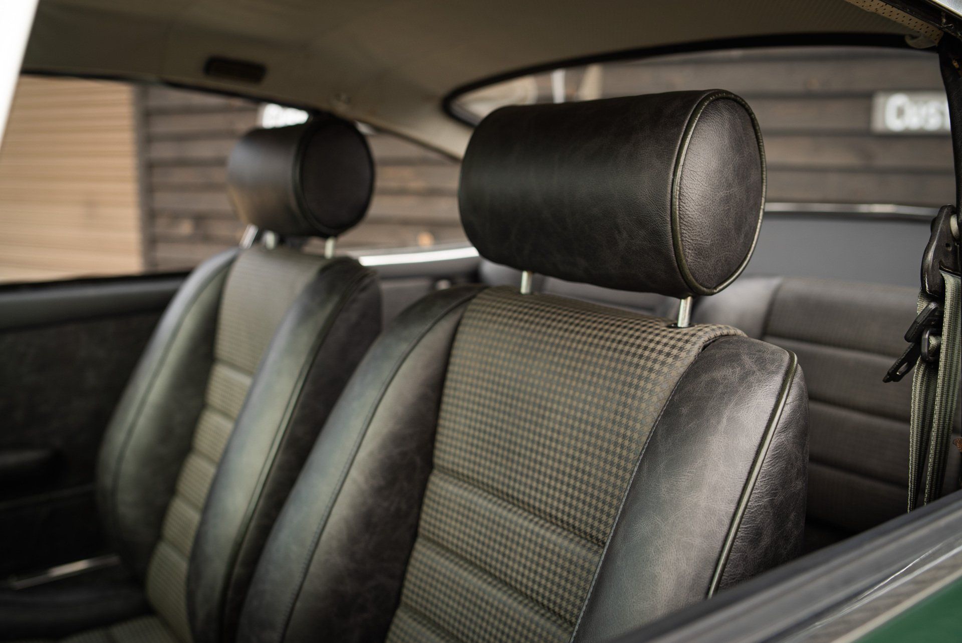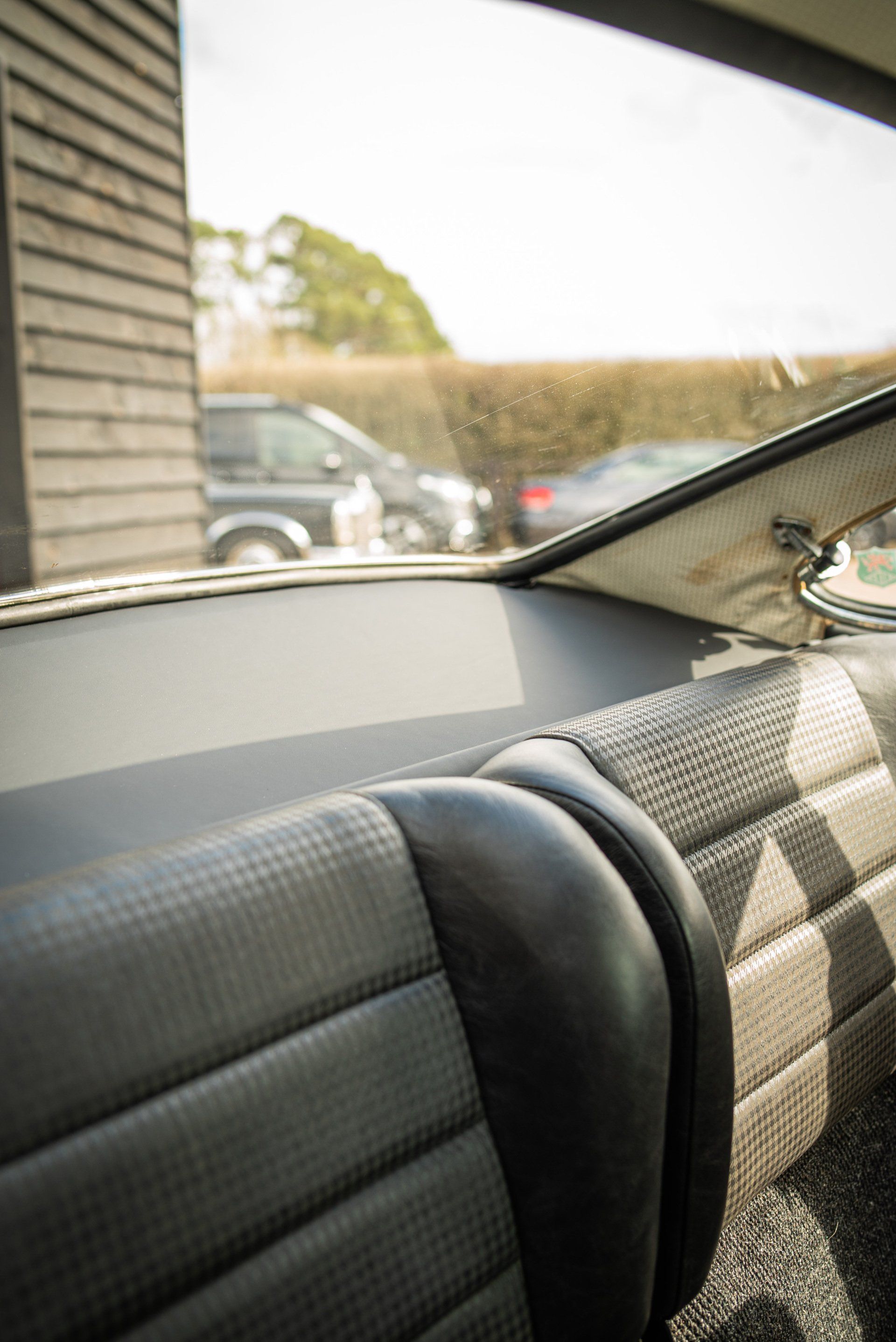 The upper bolsters, lower and seat backs have been retrimmed in a black distressed leather. David, the boss, and Tom discussed in episode one the perks of having a more vintage style leather as apposed to perfect nappa leather. This being that we feel a more stylised and 'worn' interior is more period correct, and of course making it totally unique to anything else out there. The seats also have green leather piping, which is also distressed, to fit in with the aesthetic of this retrim. The same green leather can be found on the binding for the carpets and even the gear gator.