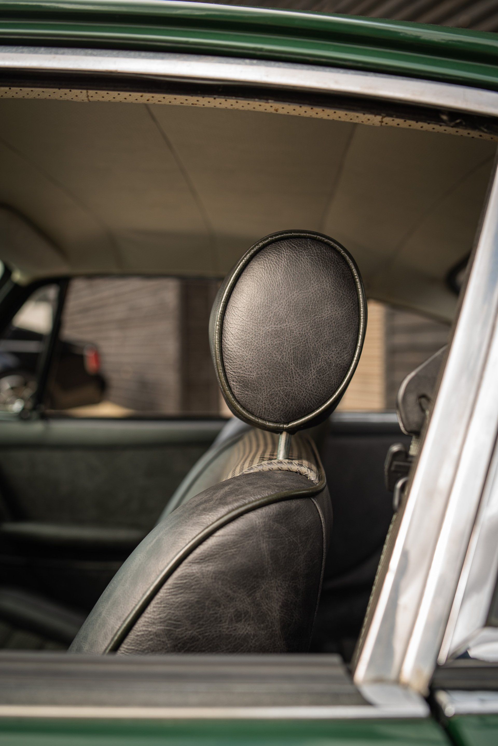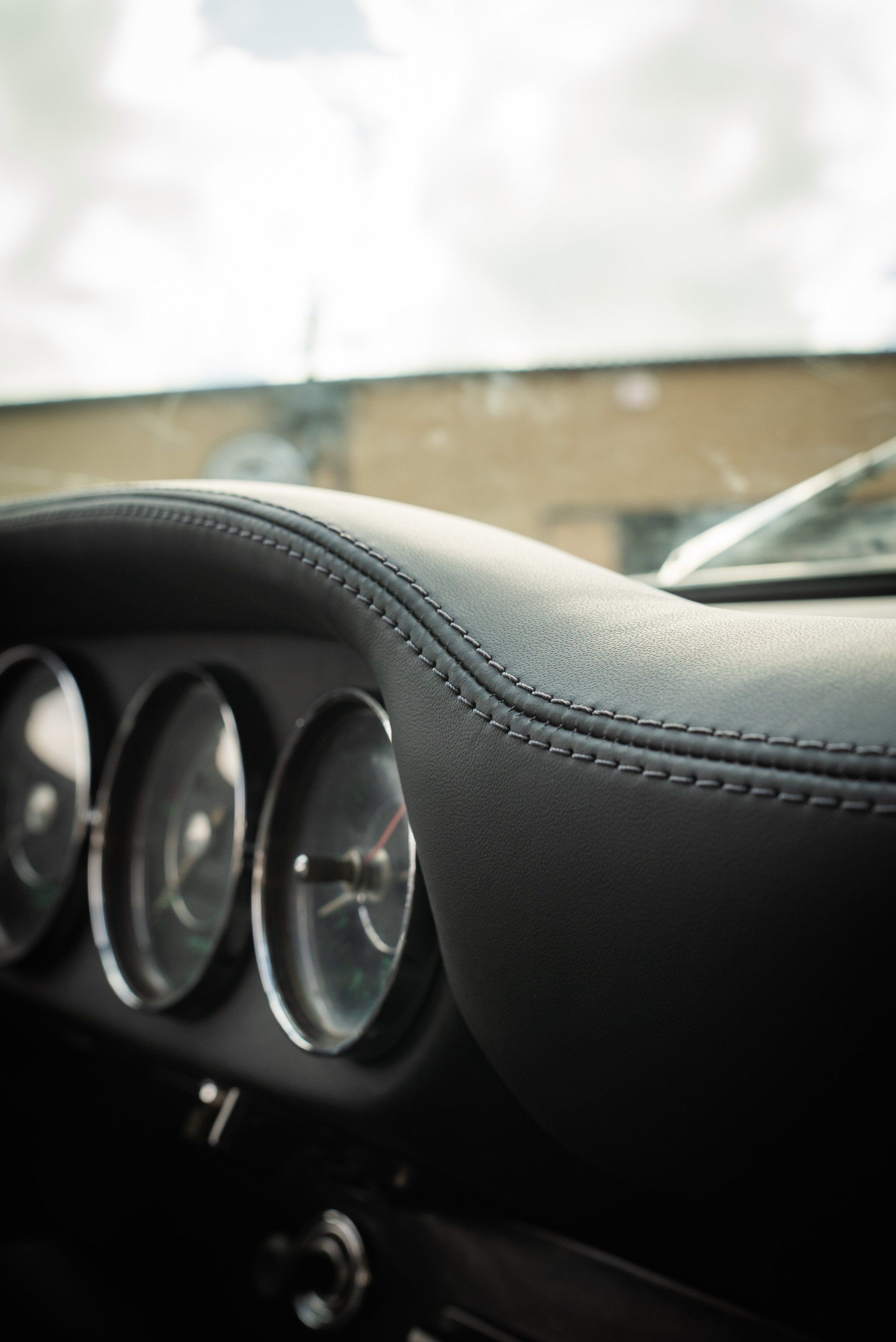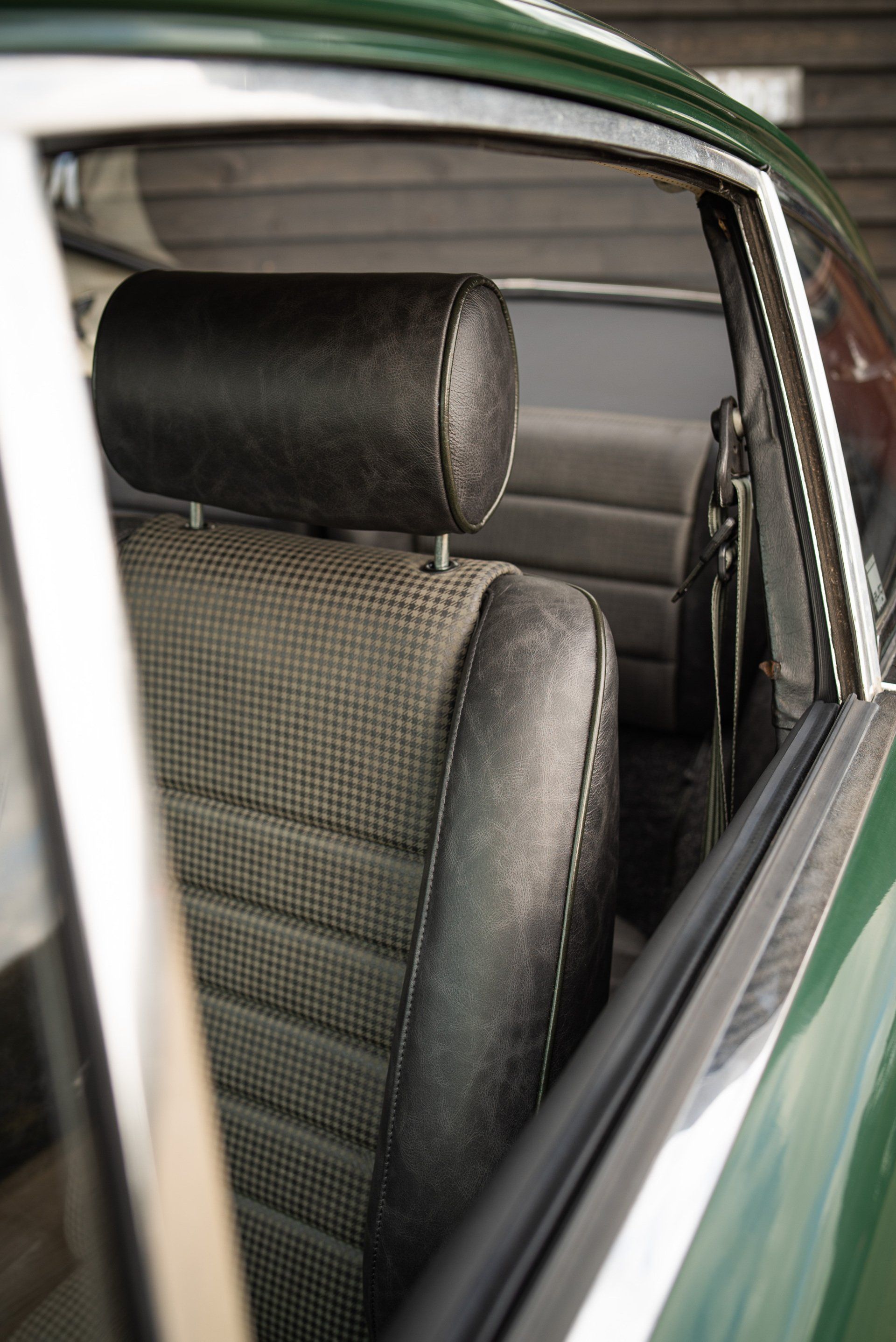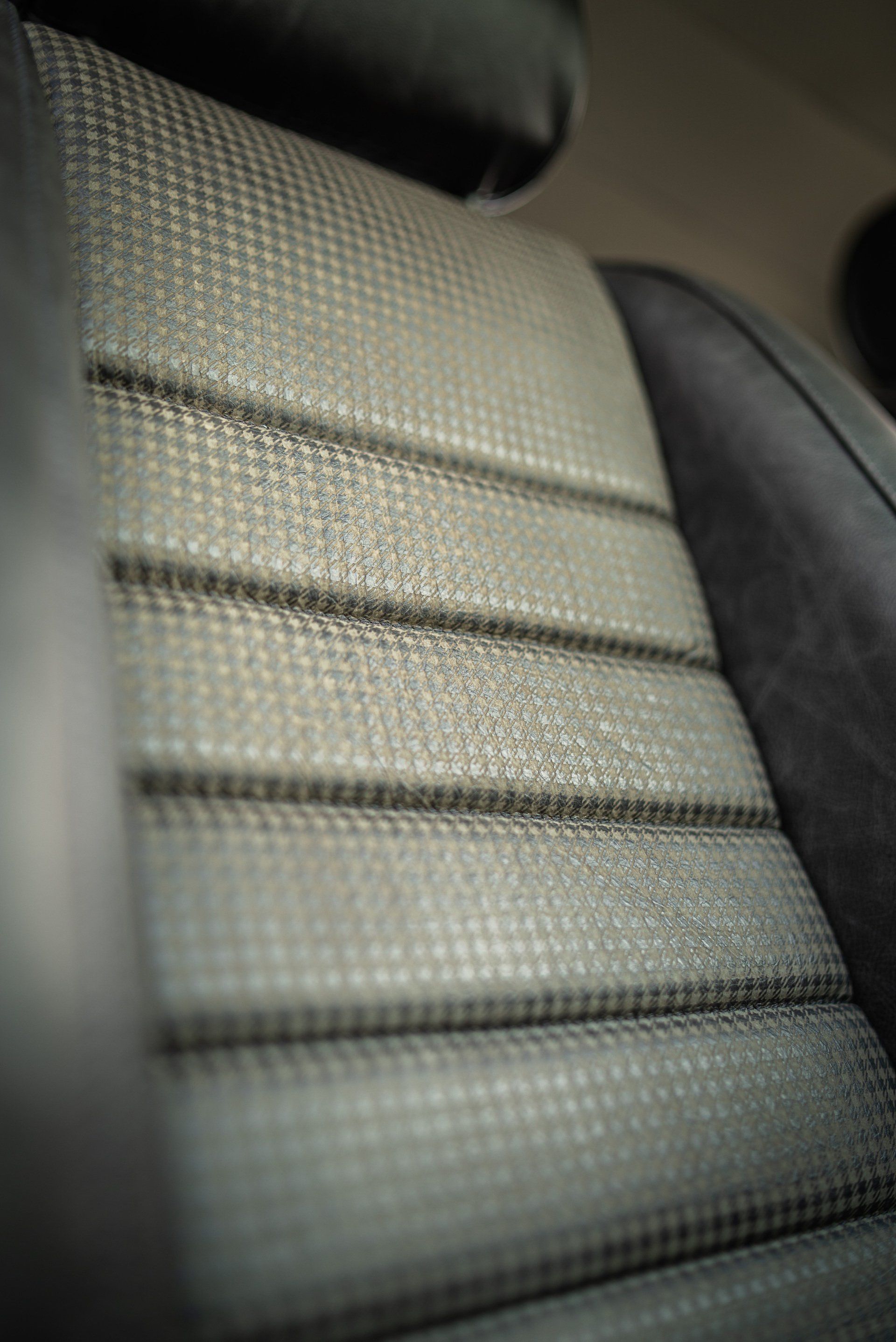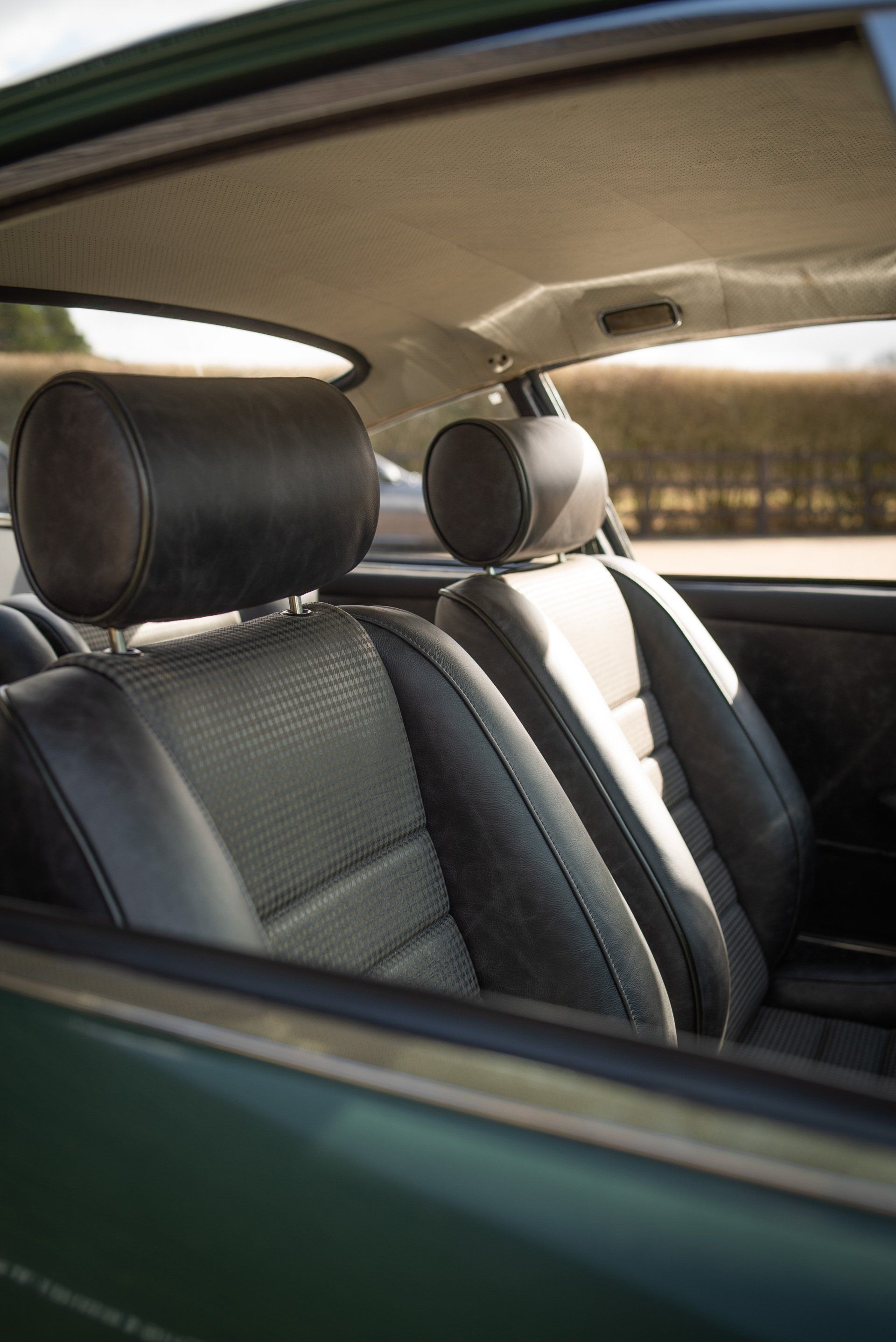The upper bolsters, lower and seat backs have been retrimmed in a black distressed leather. David, the boss, and Tom discussed in episode one the perks of having a more vintage style leather as apposed to perfect nappa leather. This being that we feel a more stylised and 'worn' interior is more period correct, and of course making it totally unique to anything else out there. The seats also have green leather piping, which is also distressed, to fit in with the aesthetic of this retrim. The same green leather can be found on the binding for the carpets and even the gear gator.