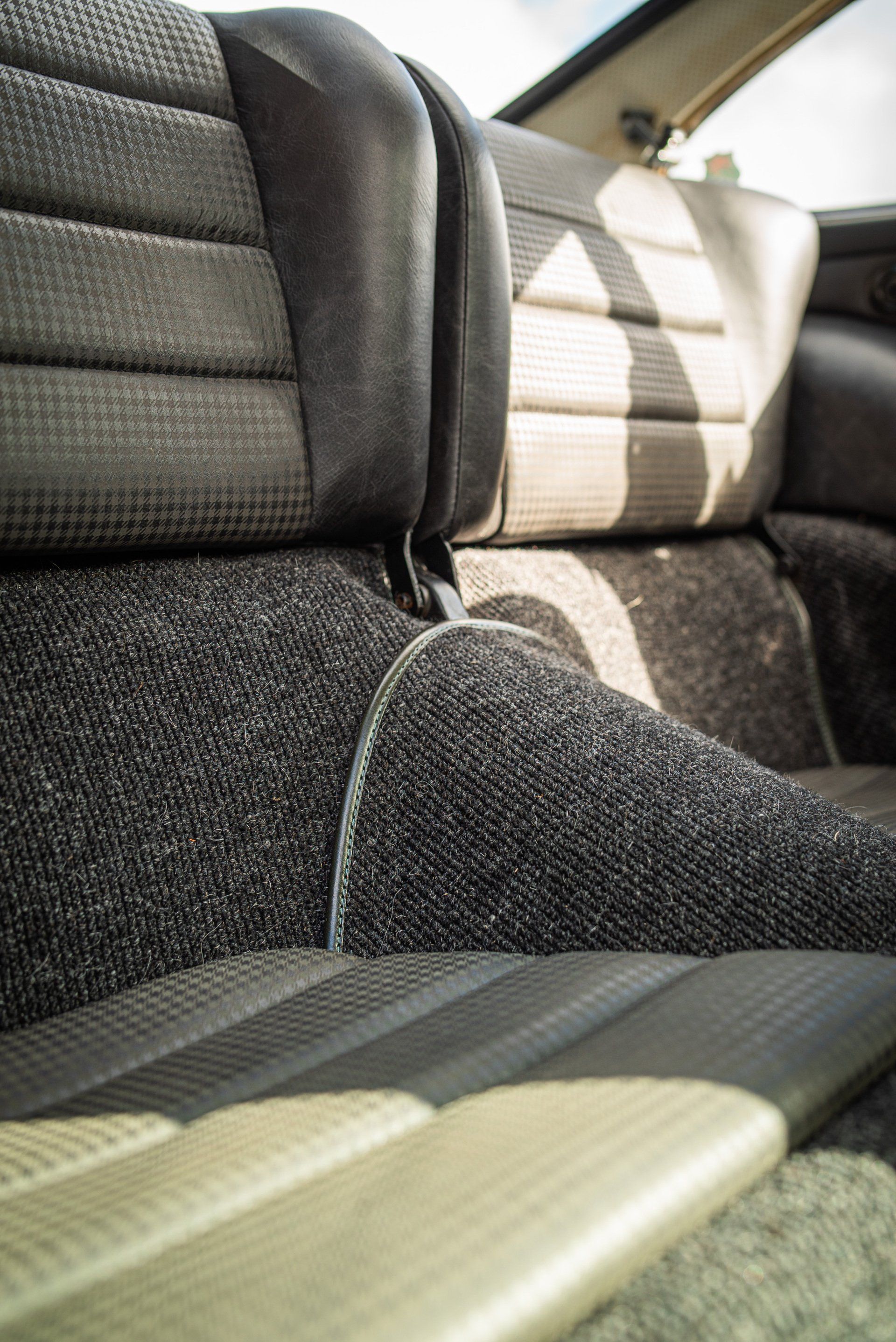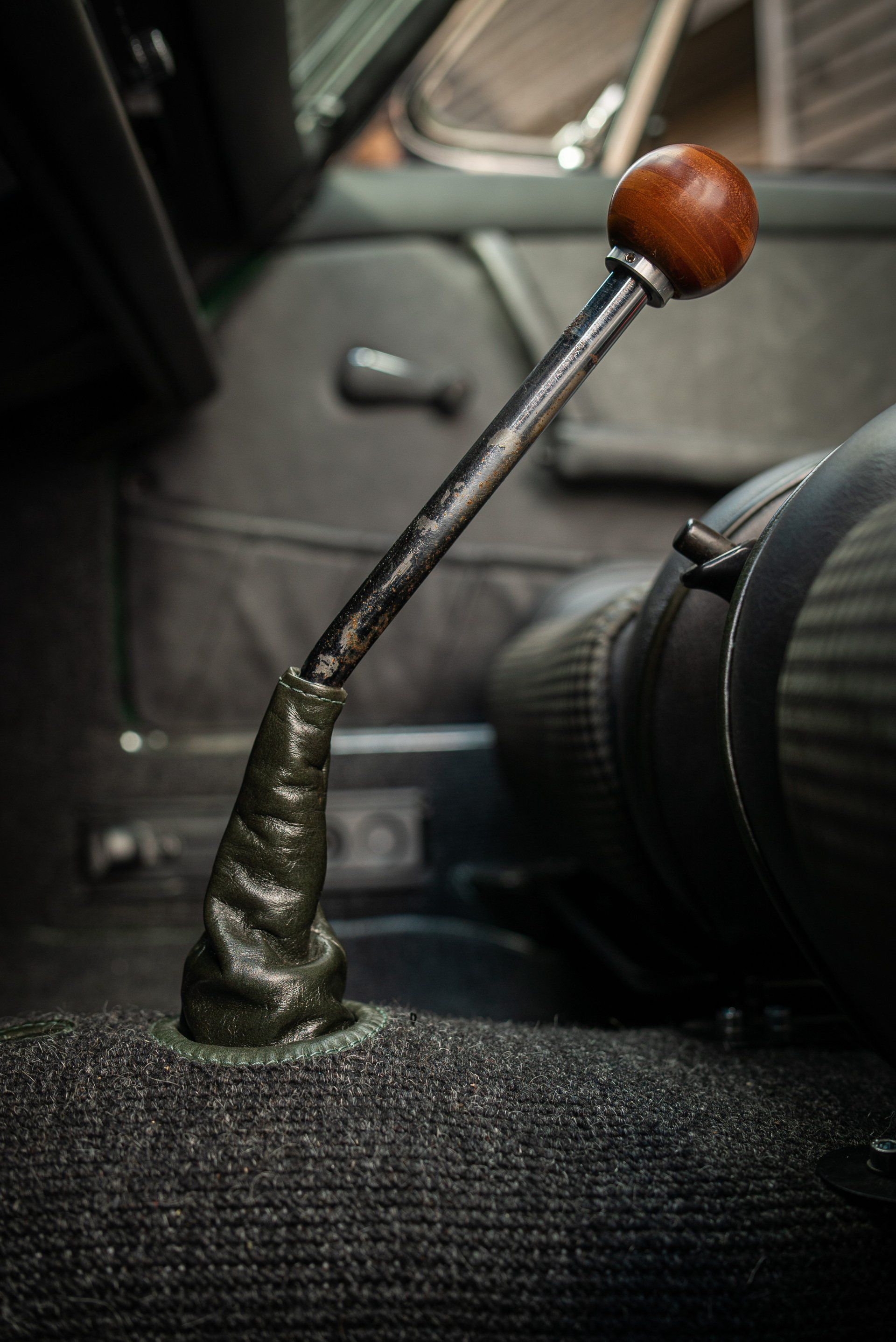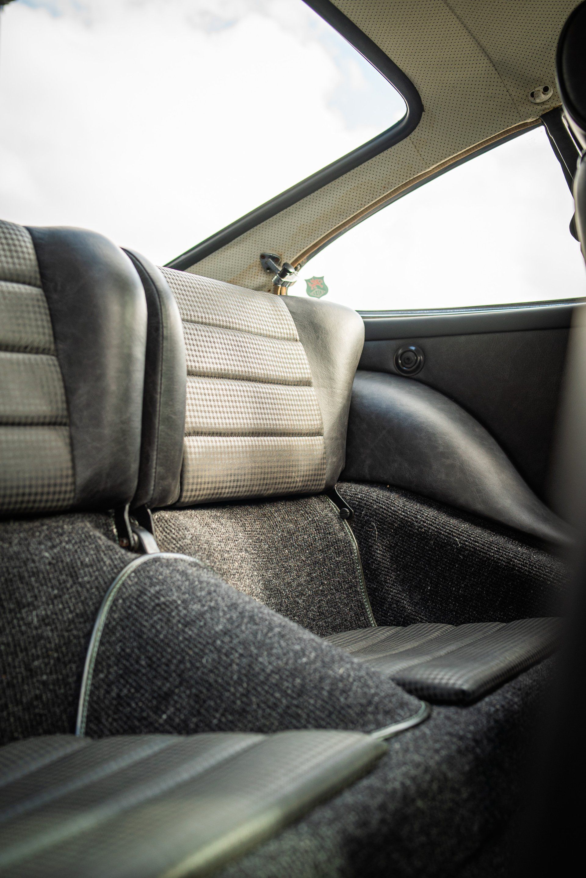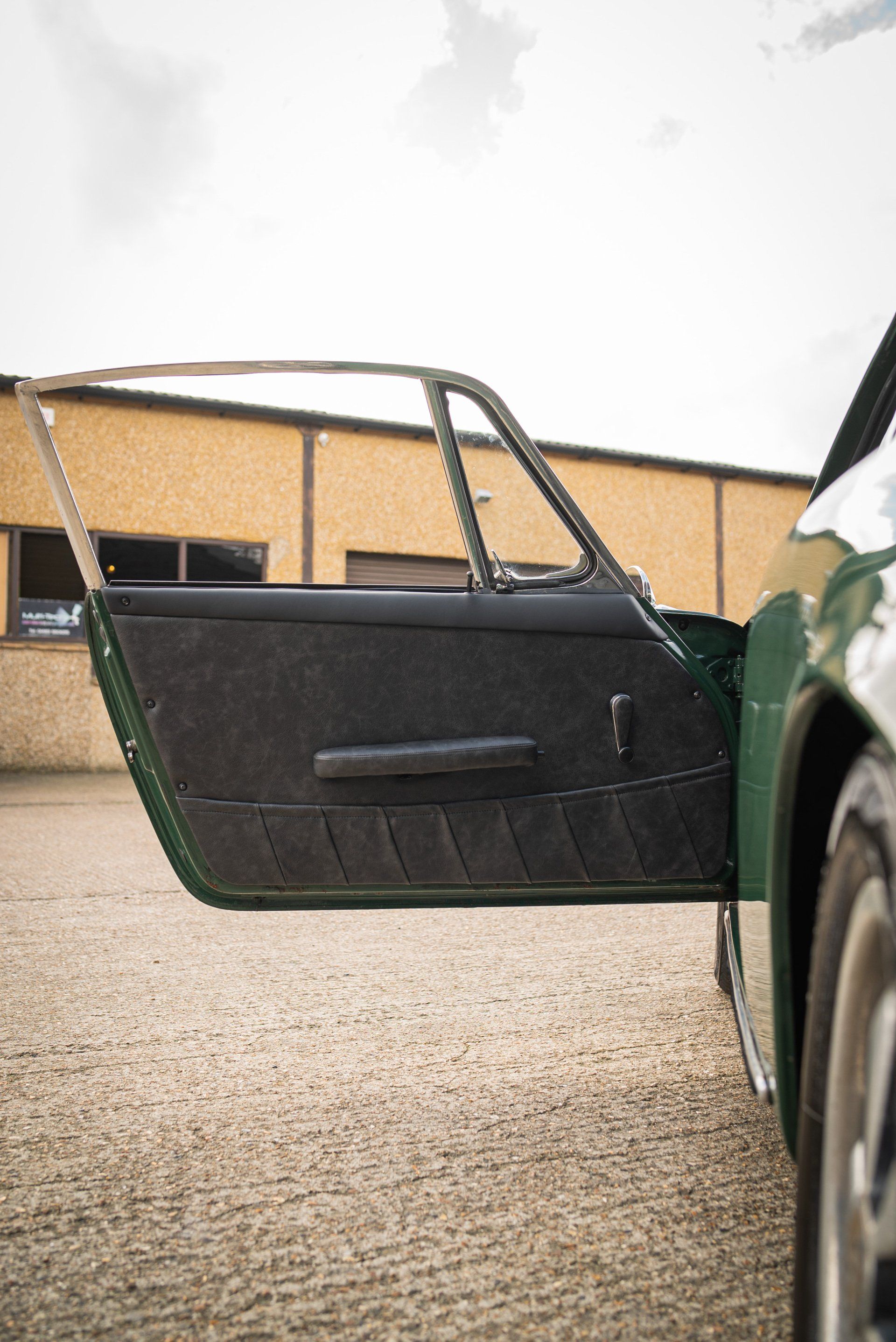The upper bolsters, lower and seat backs have been retrimmed in a black distressed leather. David, the boss, and Tom discussed in episode one the perks of having a more vintage style leather as apposed to perfect nappa leather. This being that we feel a more stylised and 'worn' interior is more period correct, and of course making it totally unique to anything else out there. The seats also have green leather piping, which is also distressed, to fit in with the aesthetic of this retrim. The same green leather can be found on the binding for the carpets and even the gear gator.