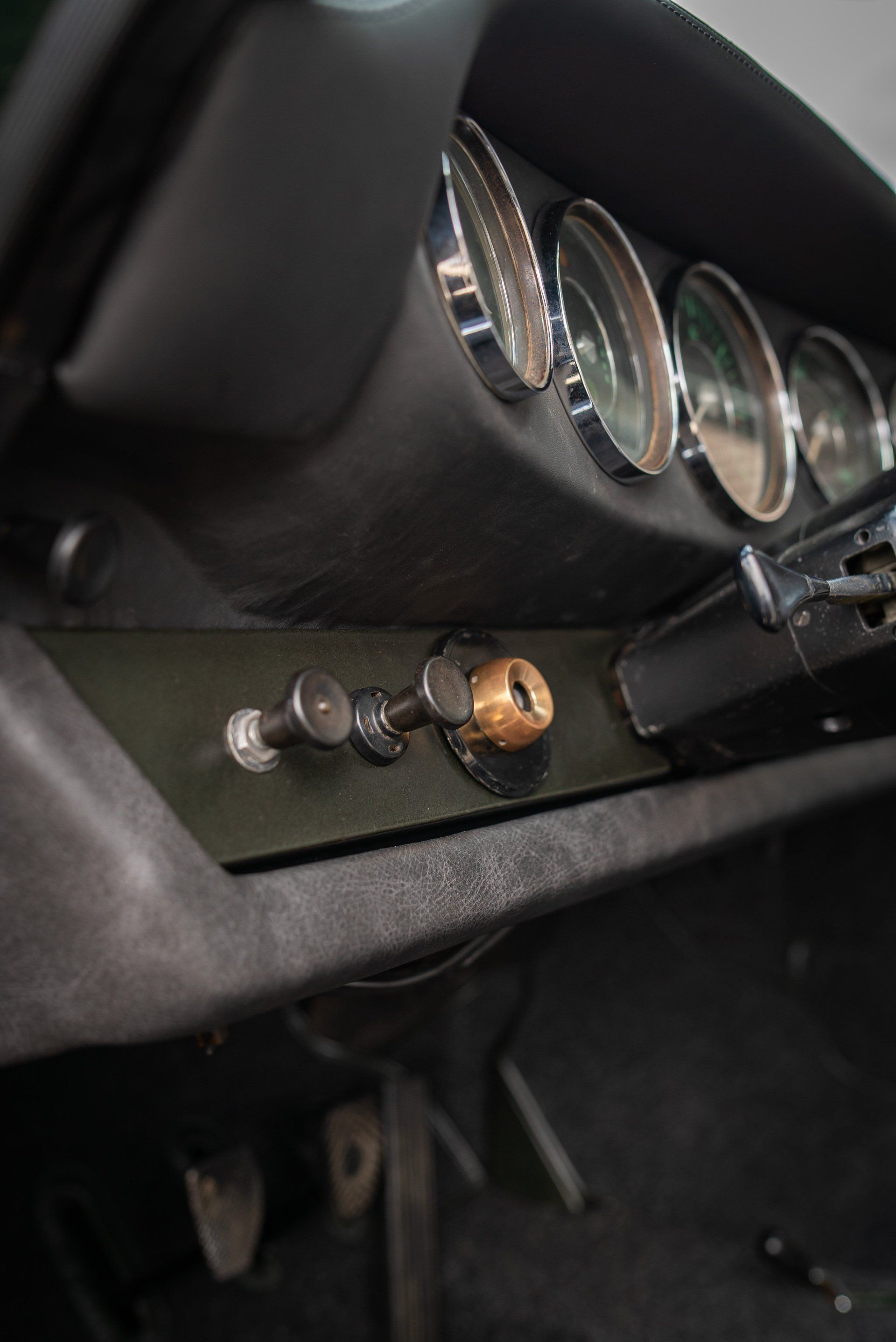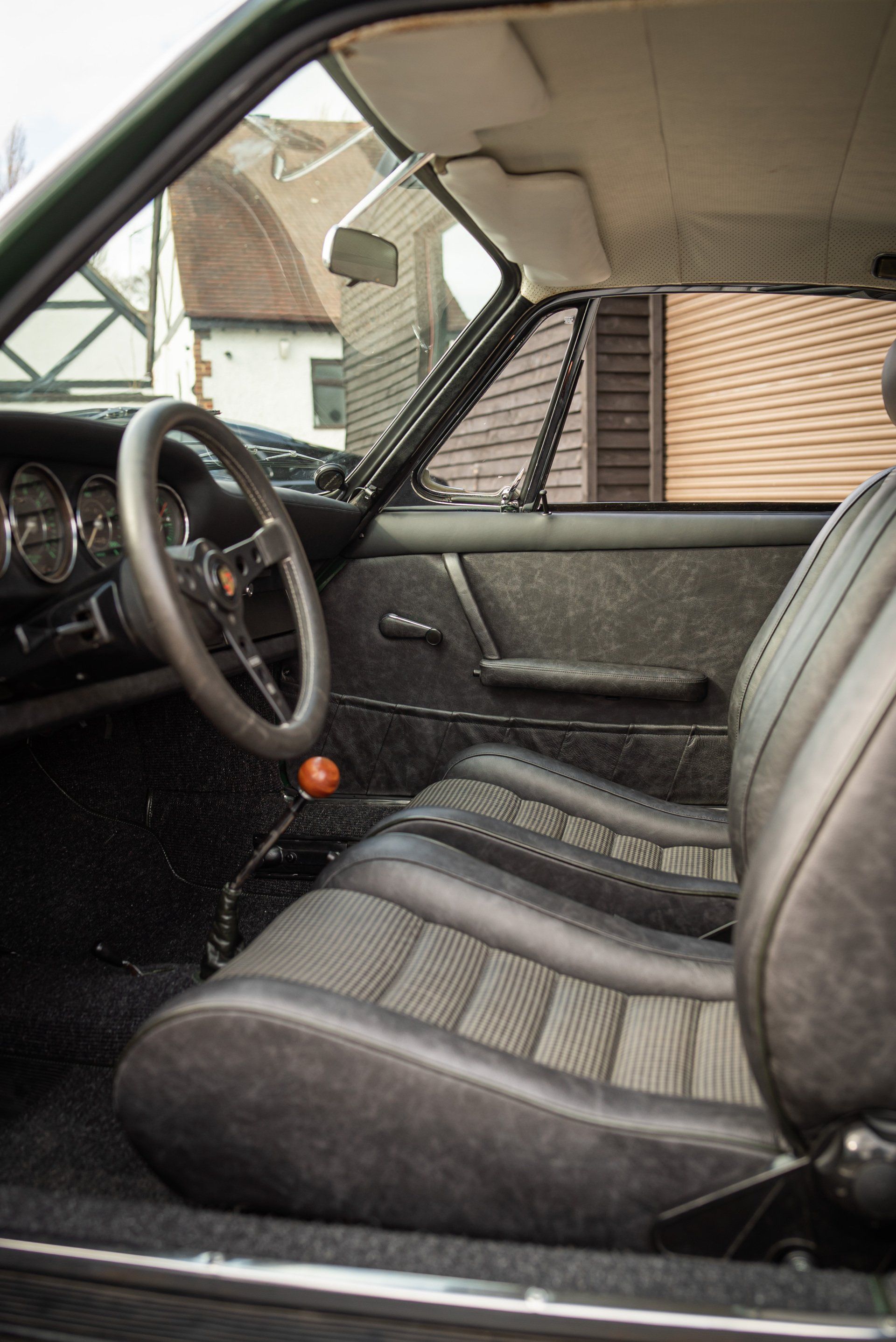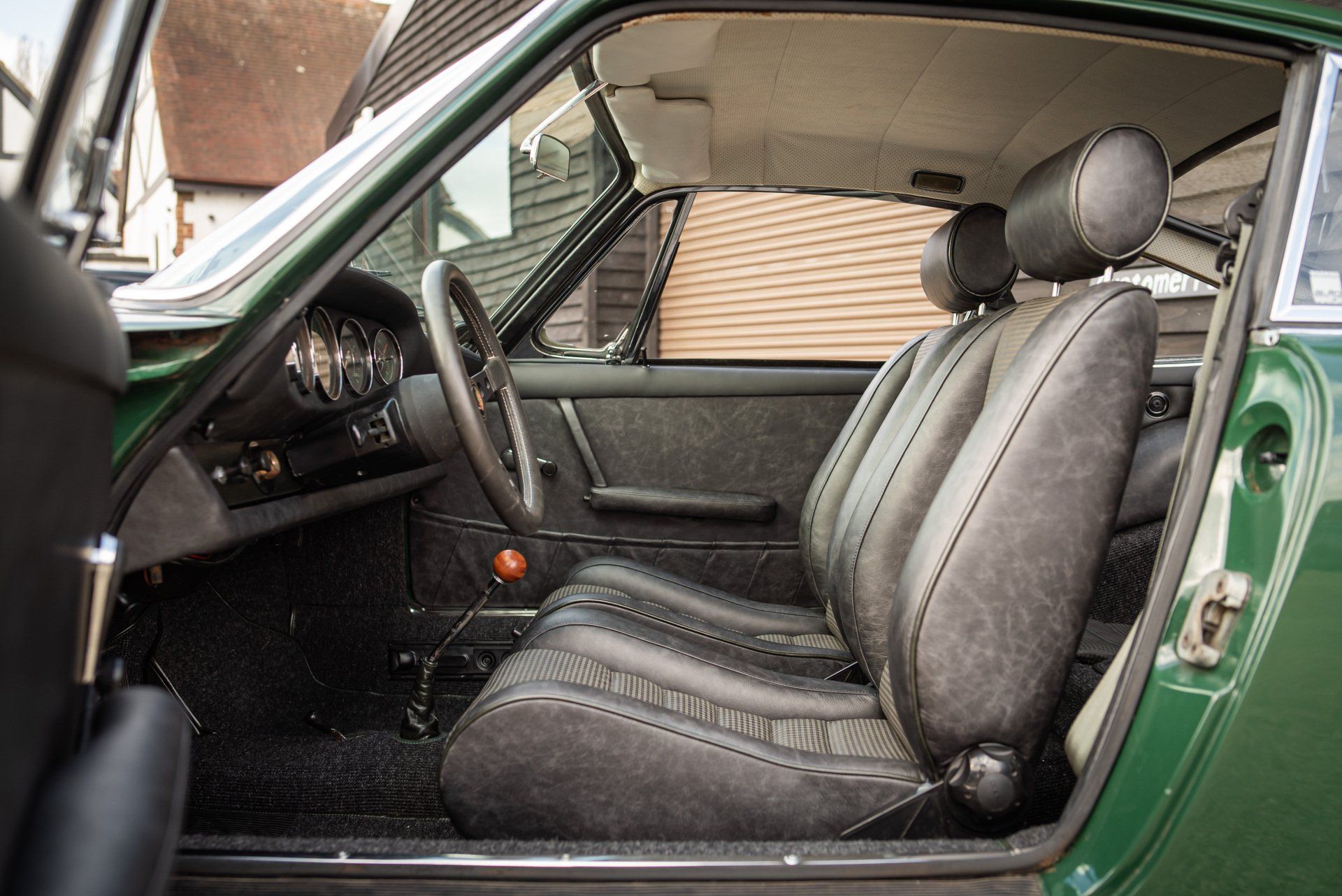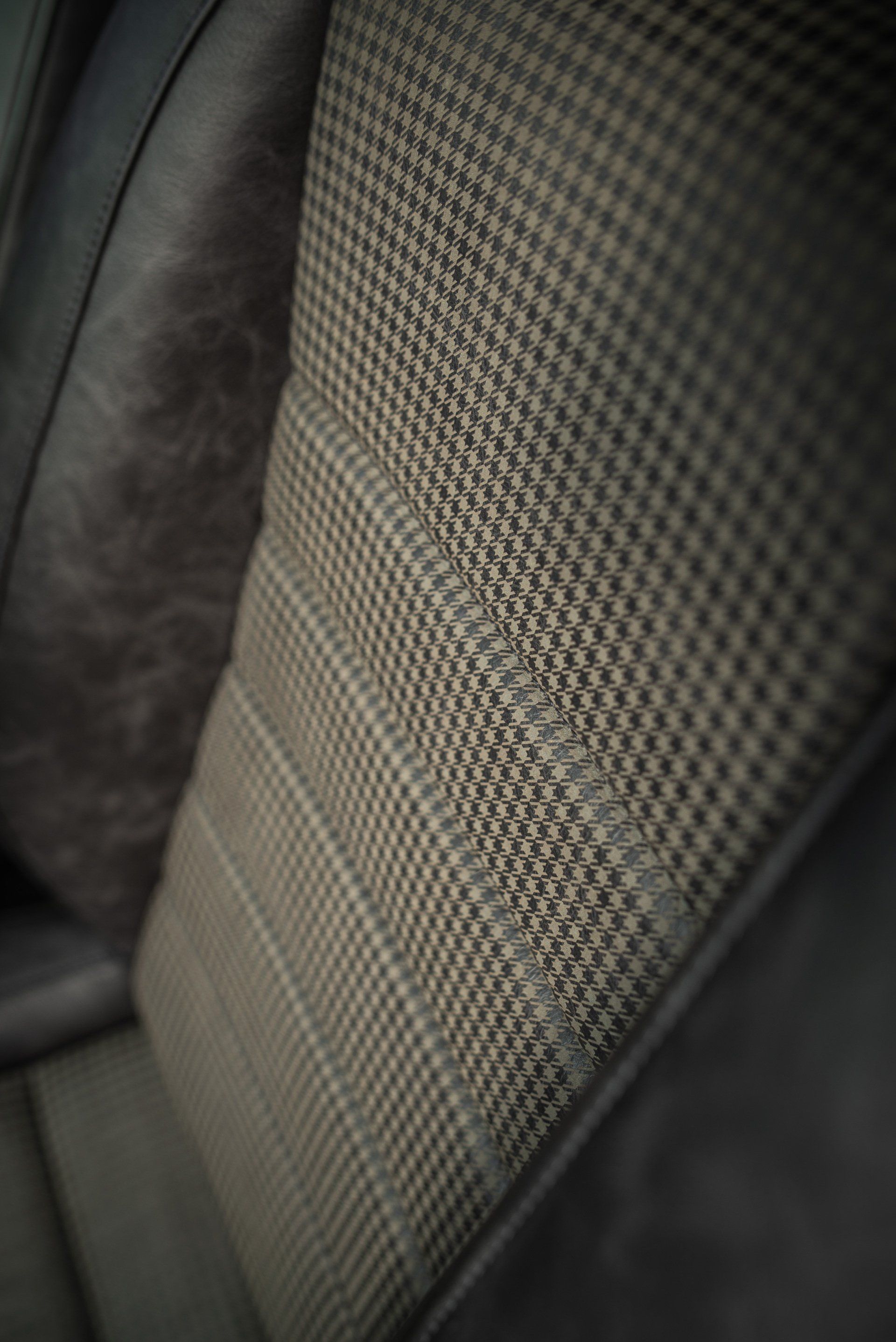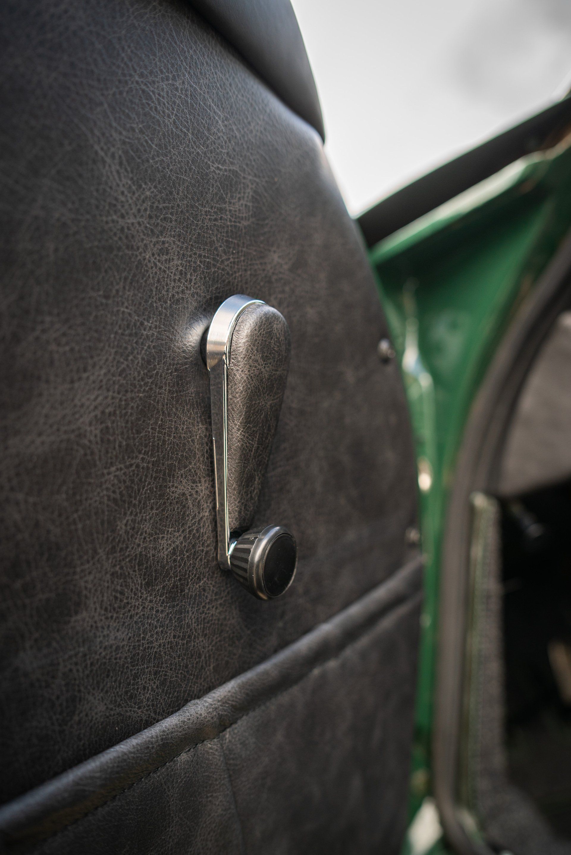 The upper bolsters, lower and seat backs have been retrimmed in a black distressed leather. David, the boss, and Tom discussed in episode one the perks of having a more vintage style leather as apposed to perfect nappa leather. This being that we feel a more stylised and 'worn' interior is more period correct, and of course making it totally unique to anything else out there. The seats also have green leather piping, which is also distressed, to fit in with the aesthetic of this retrim. The same green leather can be found on the binding for the carpets and even the gear gator.