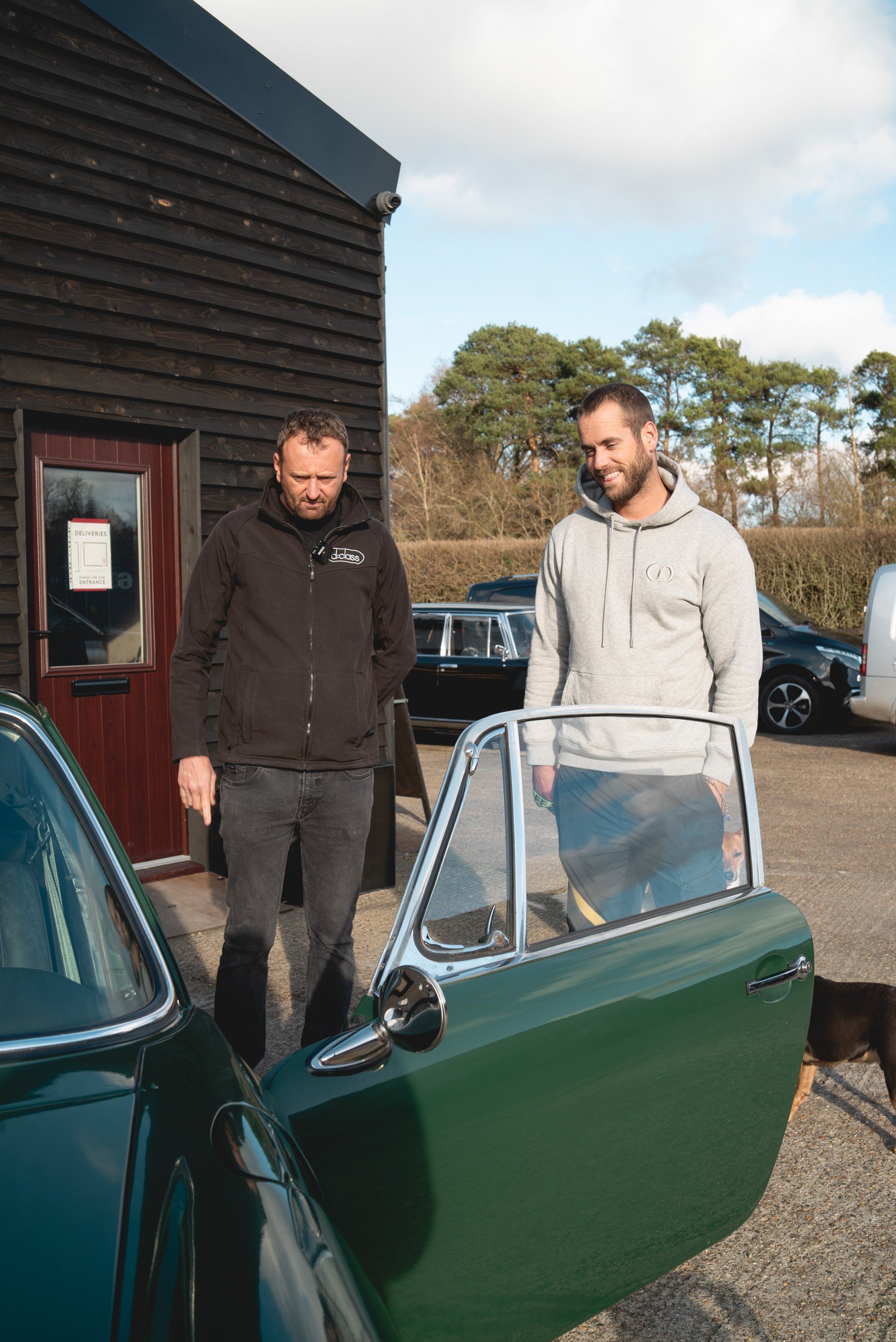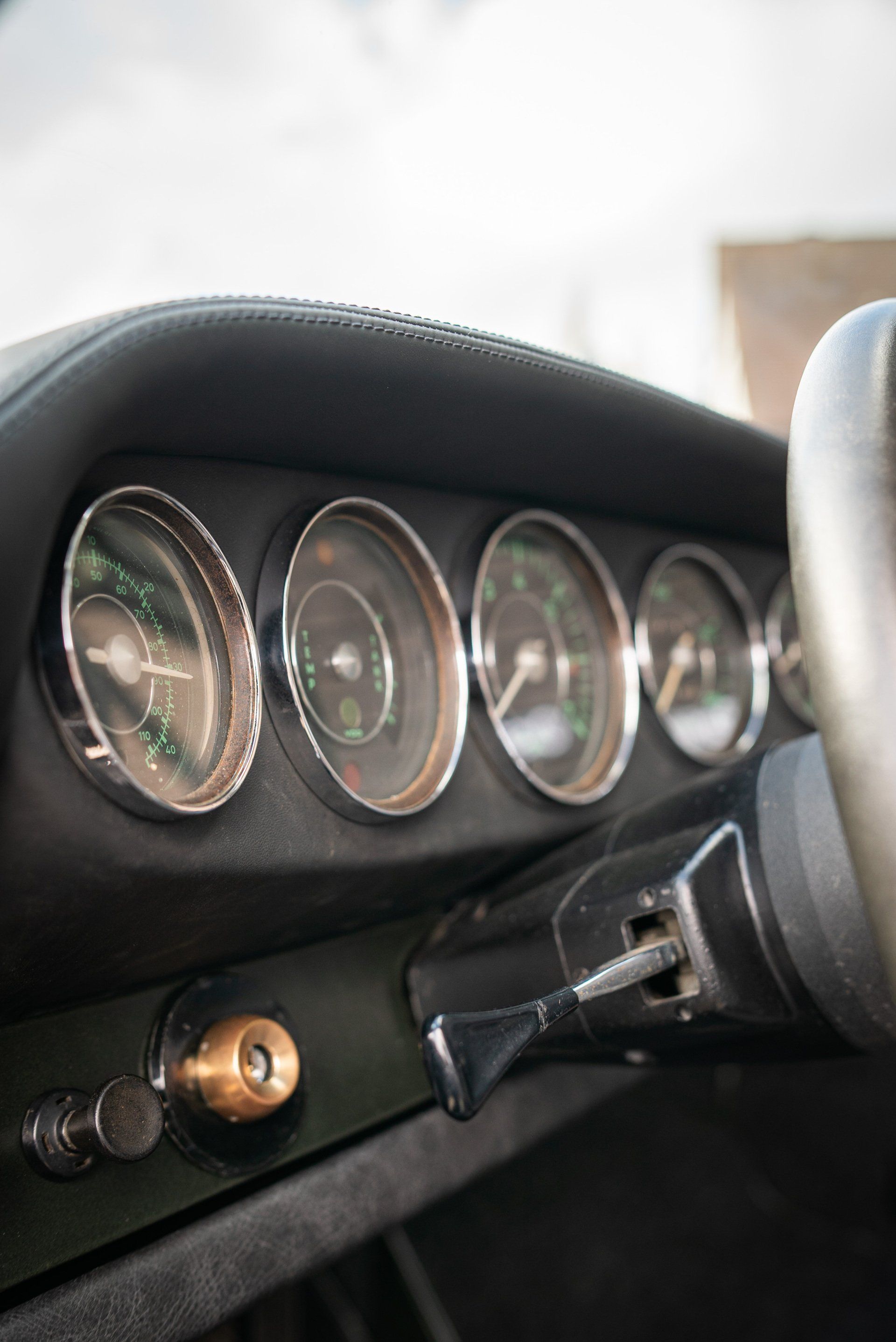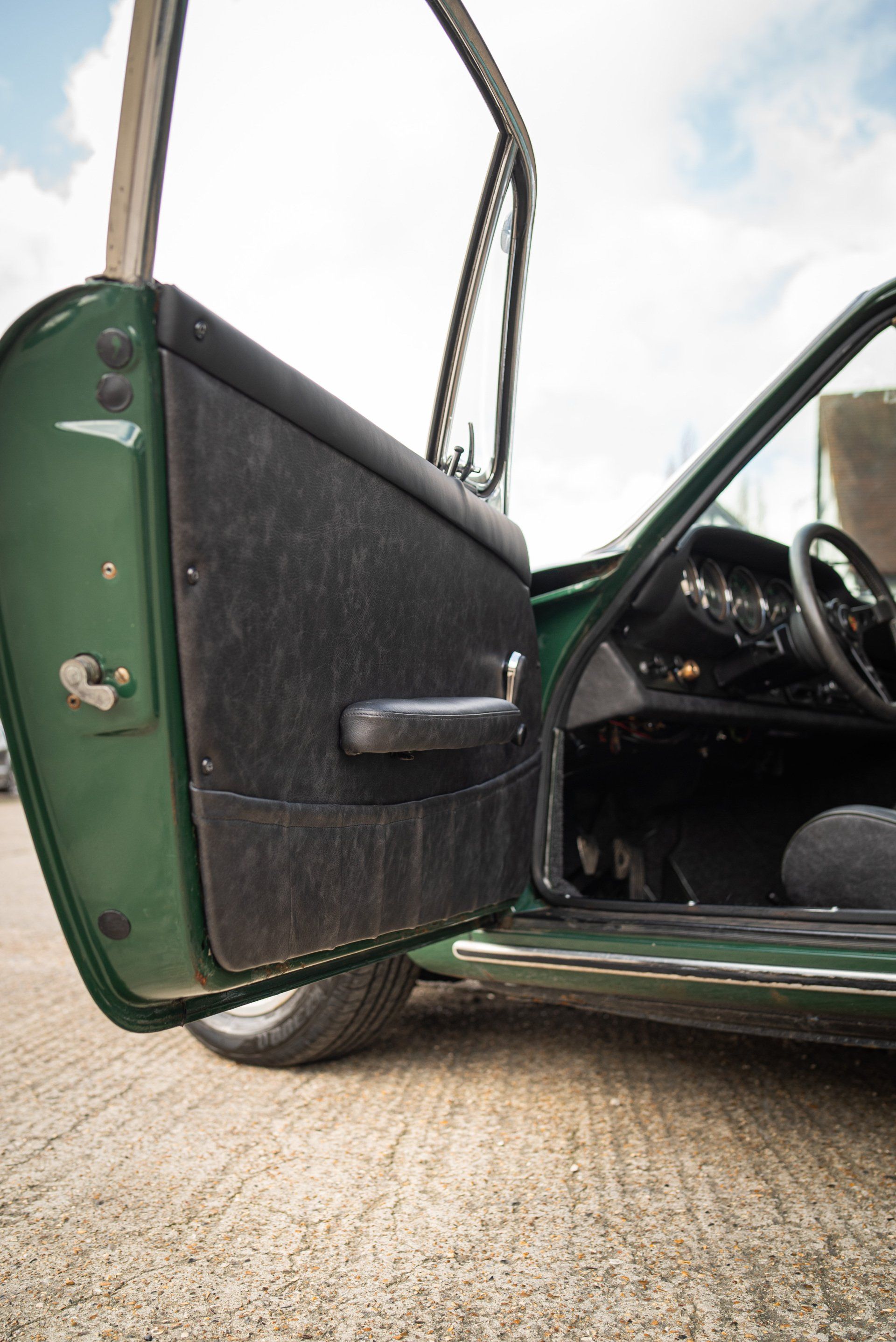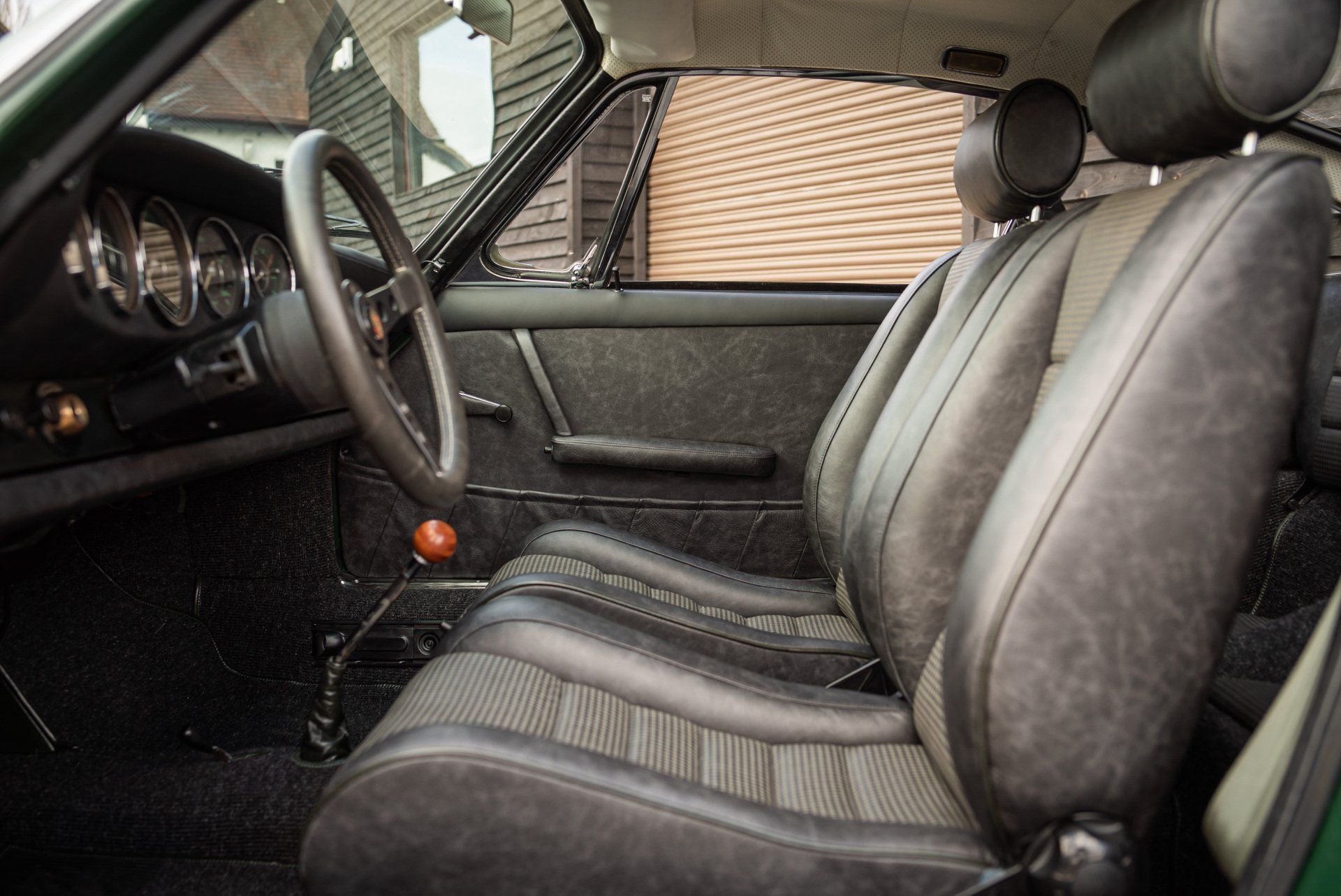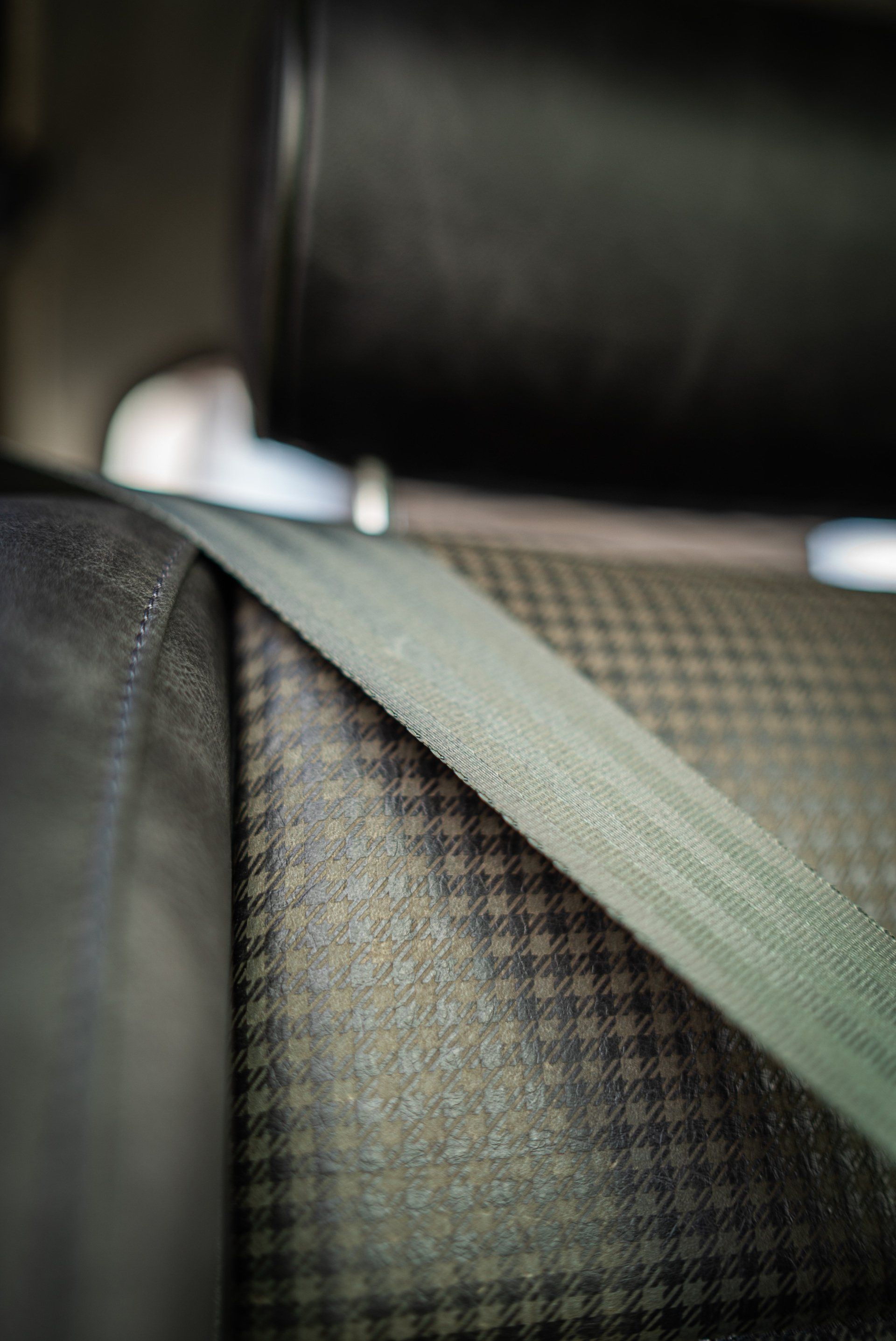The upper bolsters, lower and seat backs have been retrimmed in a black distressed leather. David, the boss, and Tom discussed in episode one the perks of having a more vintage style leather as apposed to perfect nappa leather. This being that we feel a more stylised and 'worn' interior is more period correct, and of course making it totally unique to anything else out there. The seats also have green leather piping, which is also distressed, to fit in with the aesthetic of this retrim. The same green leather can be found on the binding for the carpets and even the gear gator.