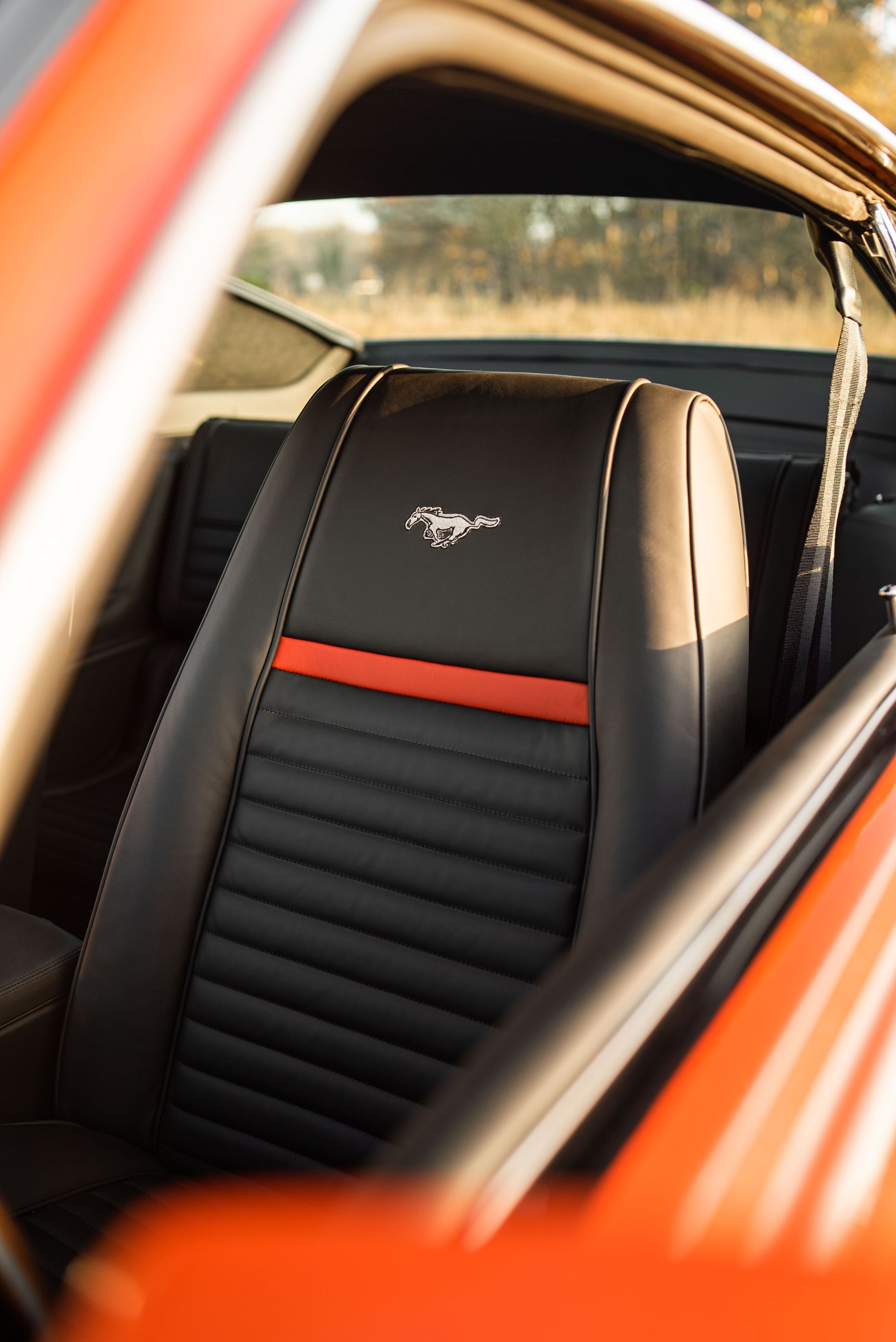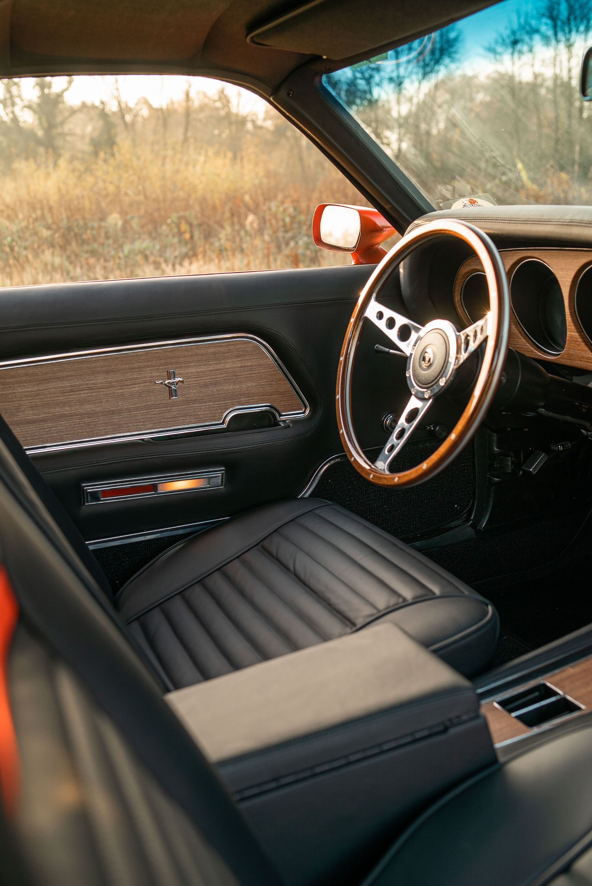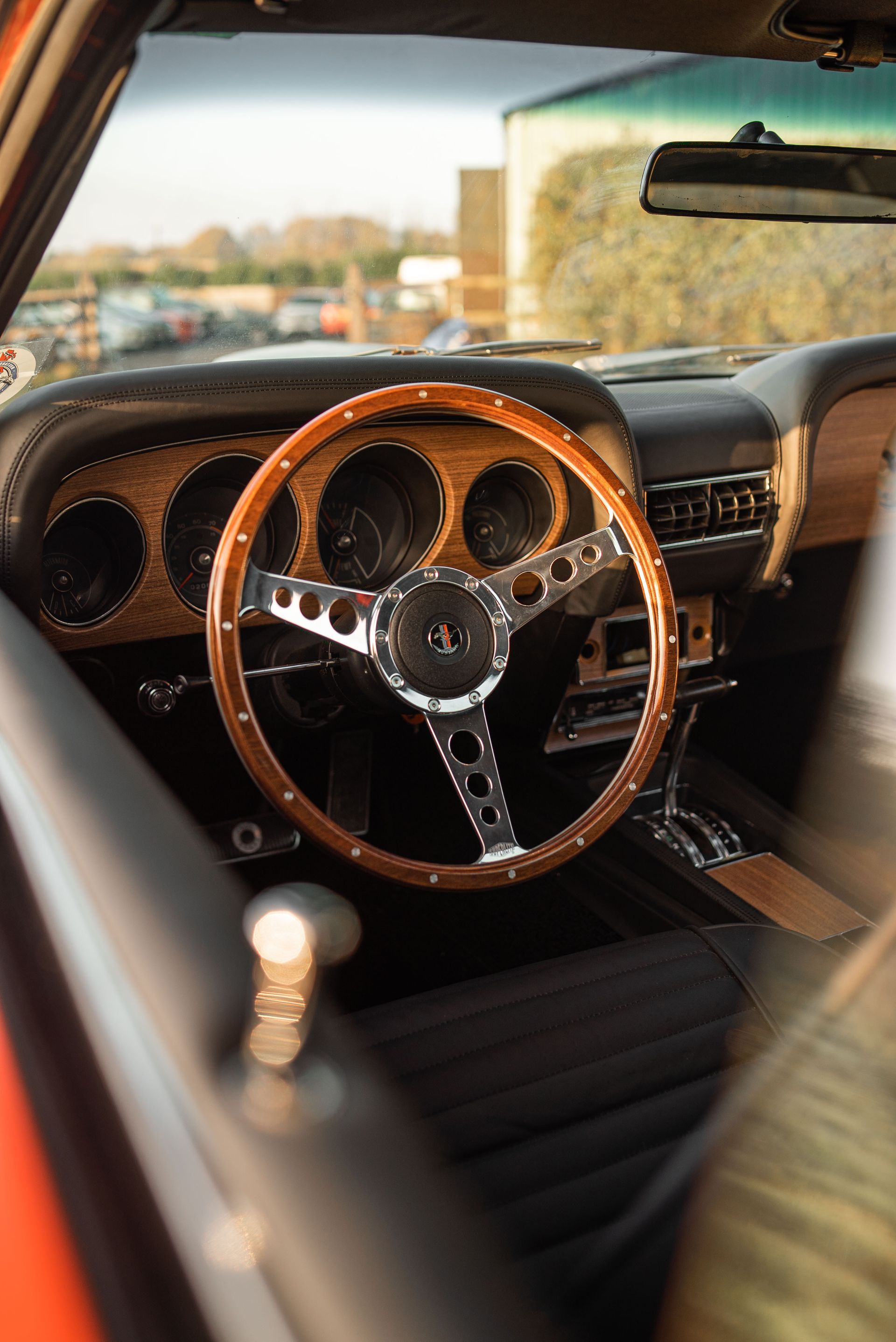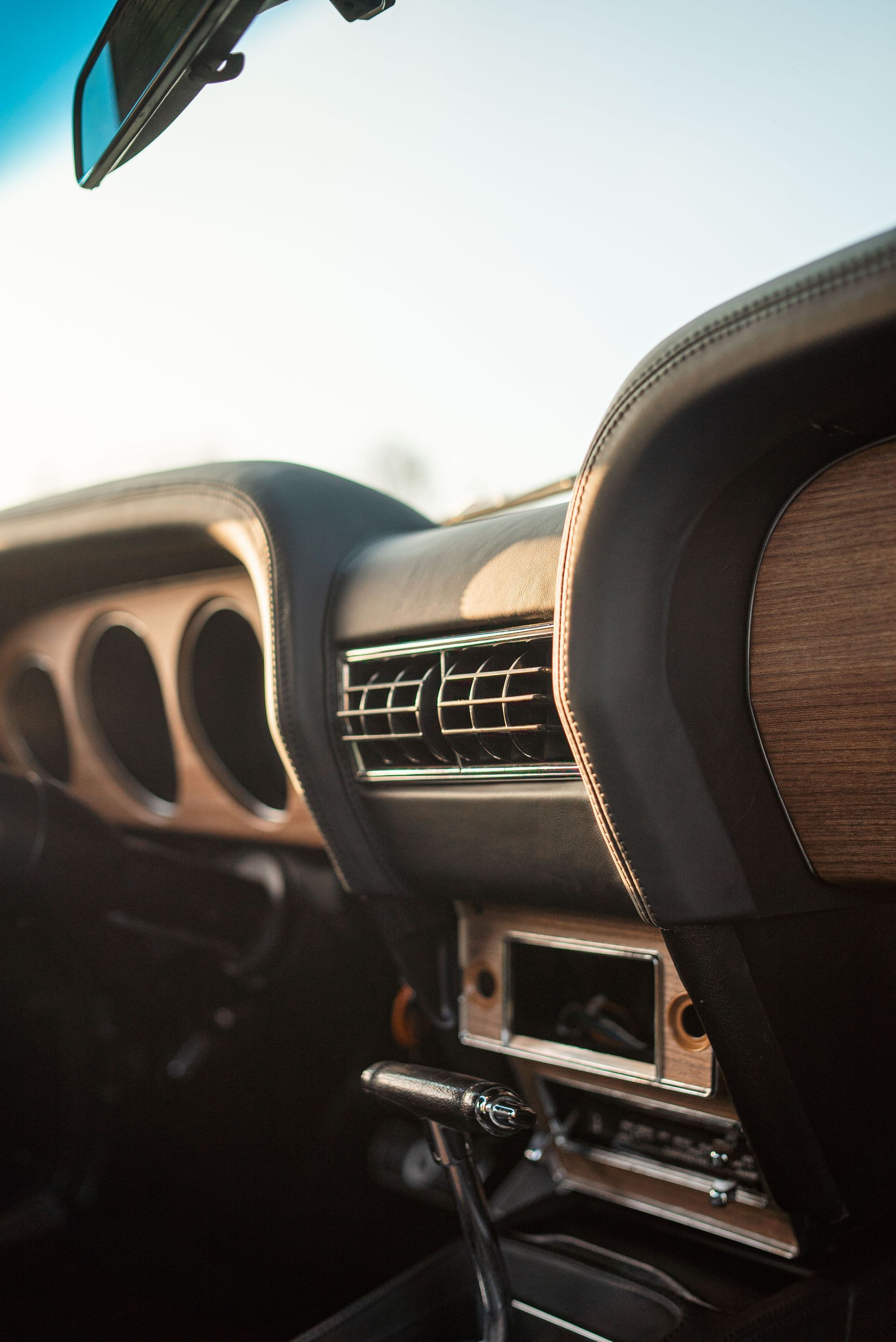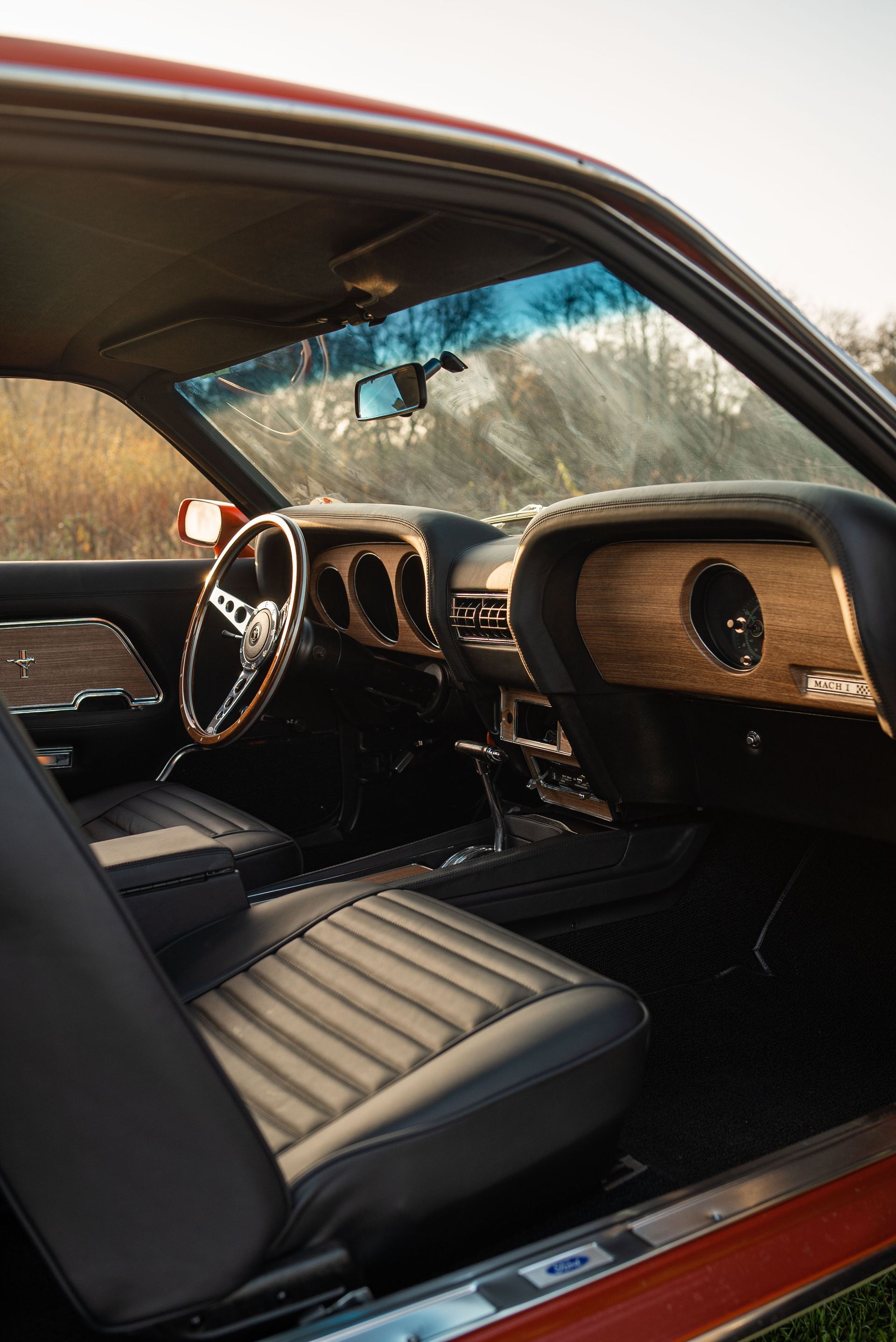 Ford Mustang Mach 1 1969 survivor for you all today with a full interior retrim. This vehicle came to d:class with the interior in pieces but has now left looking entirely different. Black nappa leather seats with a mustang embroidery and Mach 1 red leather stripe. Brand new black twinloop carpet with black vinyl binding. The dashboard has been retrimmed with the same black nappa leather with twin black stitching. This was the same for the rear quarters and doorcards. The plastic woods have been replaced with a modern solution, vinyl wood style wrapping
