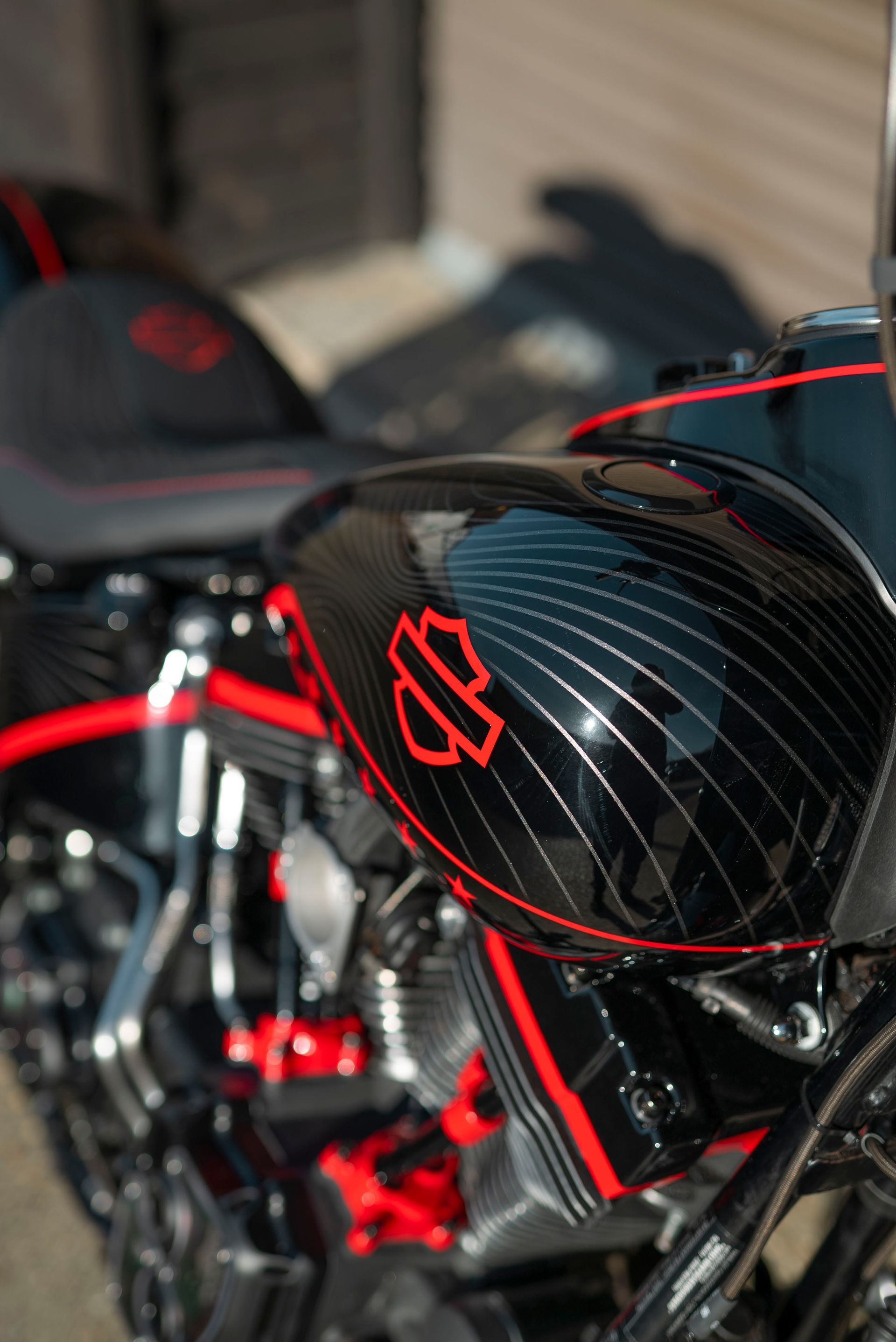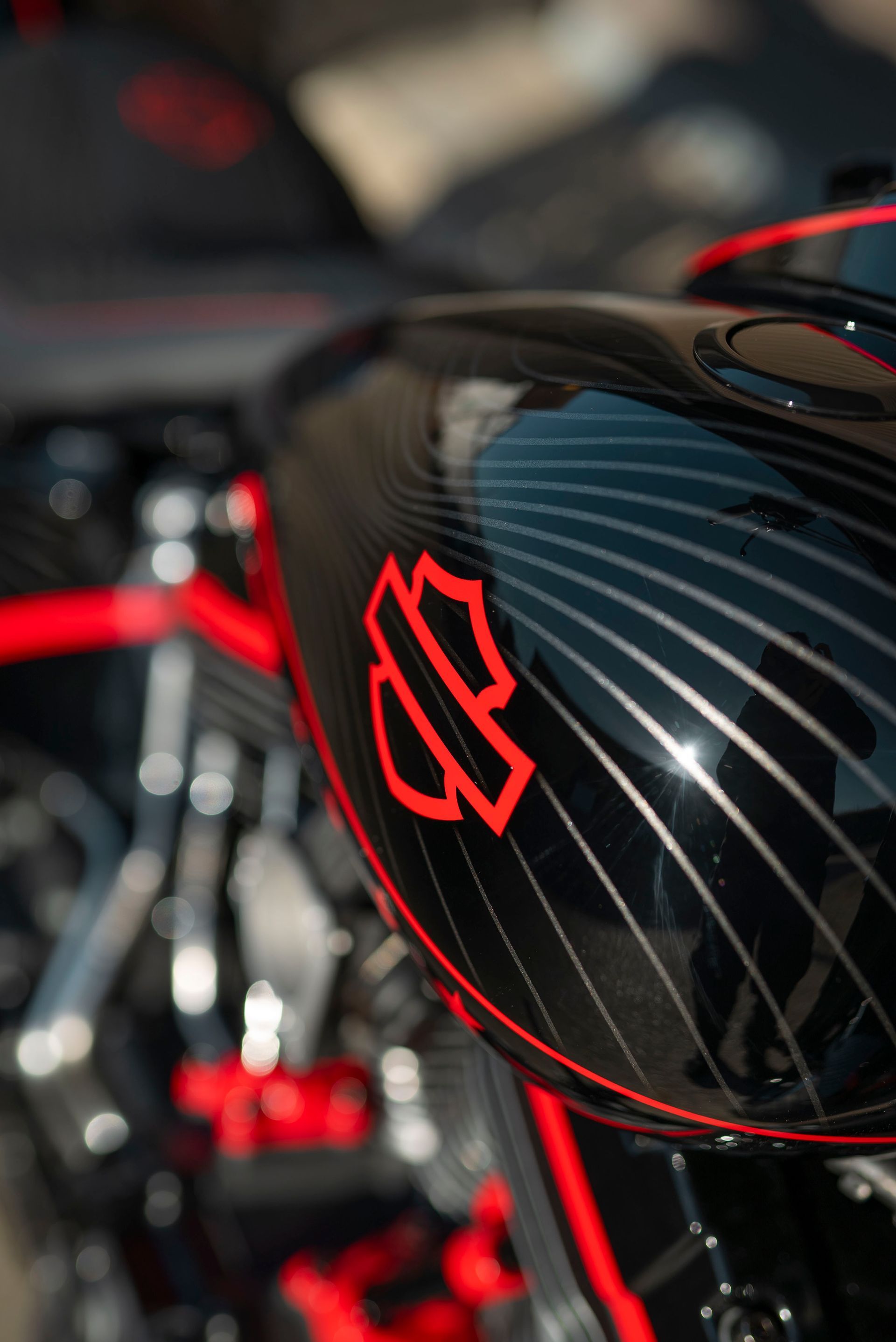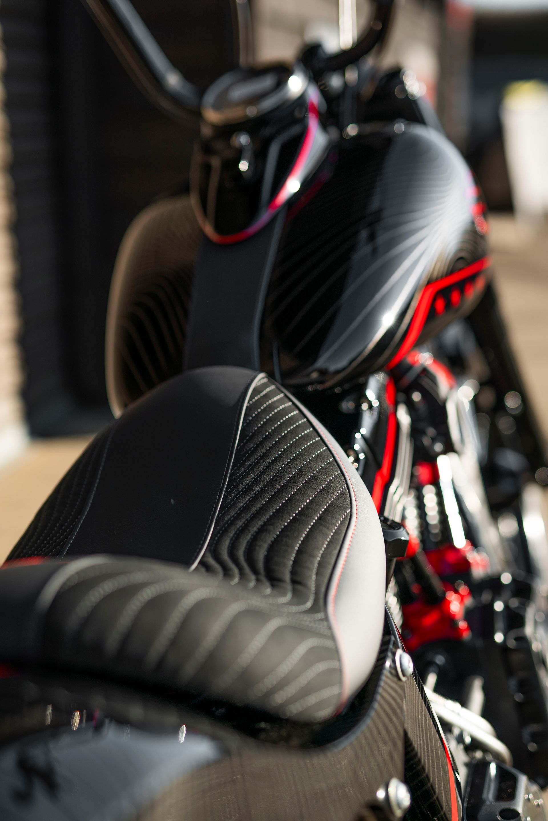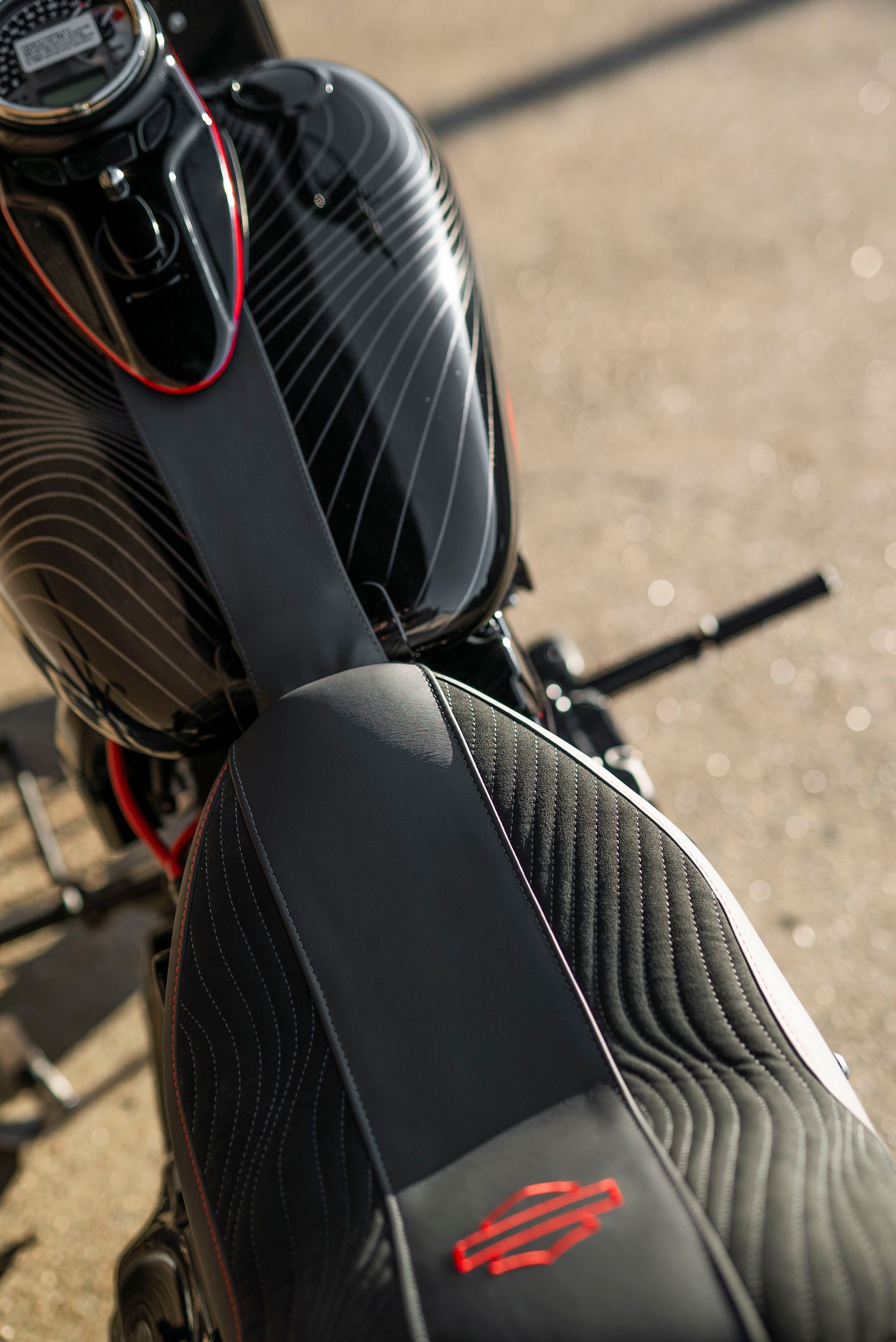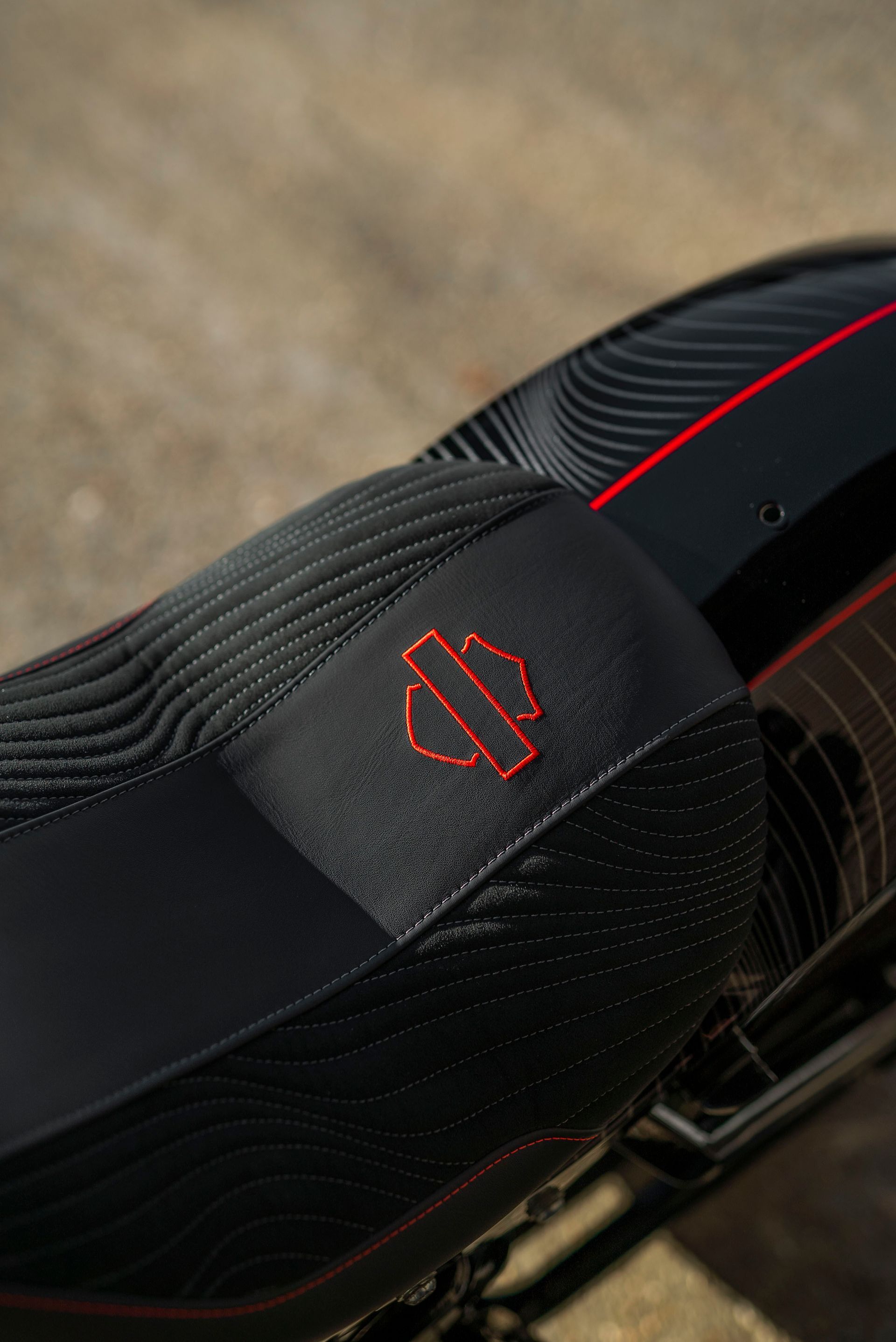The team at Guildford Custom gave us free rein to design the bike seat; the only request was that it needed to feature some black Alcantara. We got to planning and sharing ideas for the seat, where the idea of mimicking the hand-painted design was chosen. The design was created and then sent to our CNC Machine where it was stitched onto black Alcantara. Black nappa leather was selected for the centre band, which features the simplified Harley-Davidson logo in a vibrant red thread.