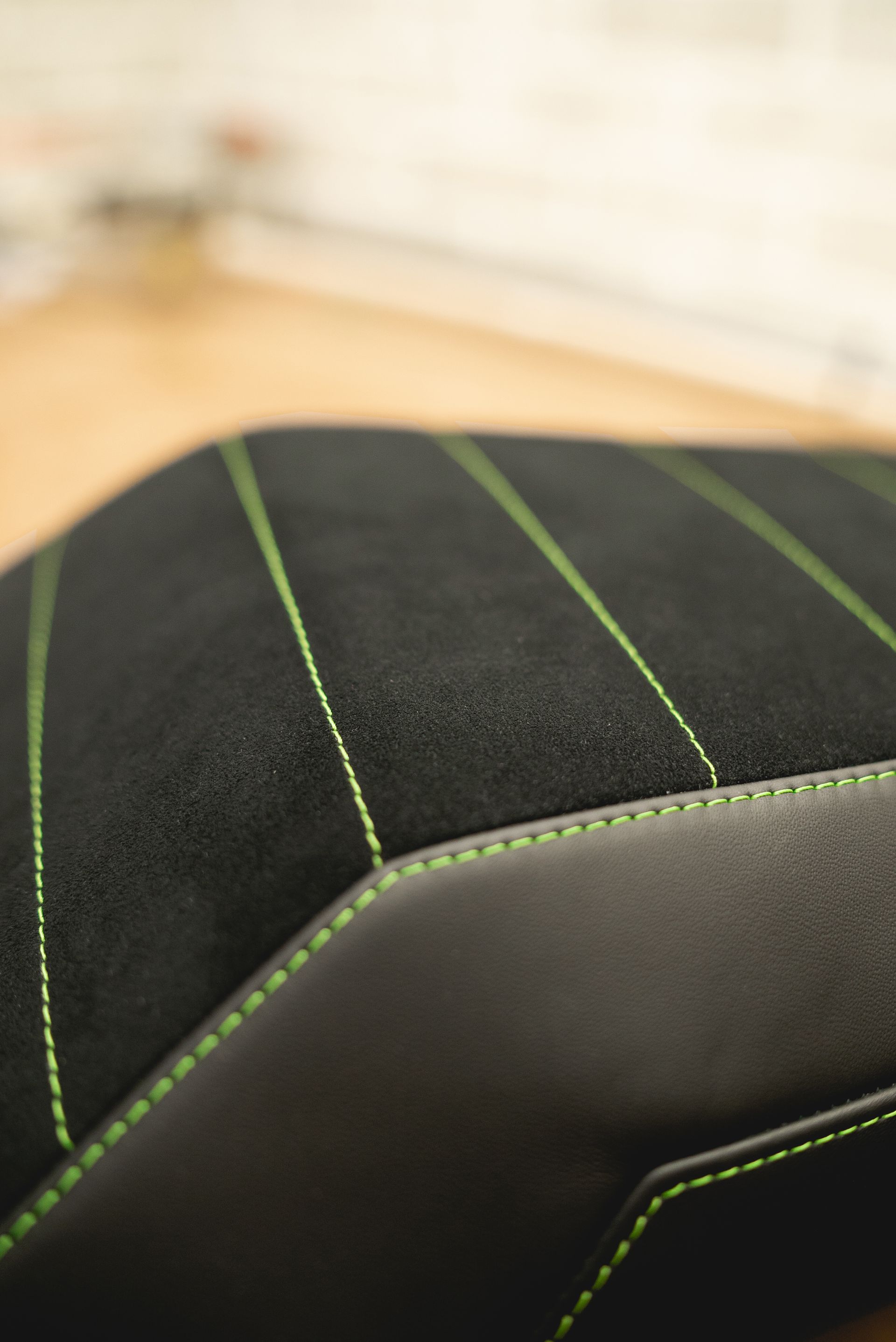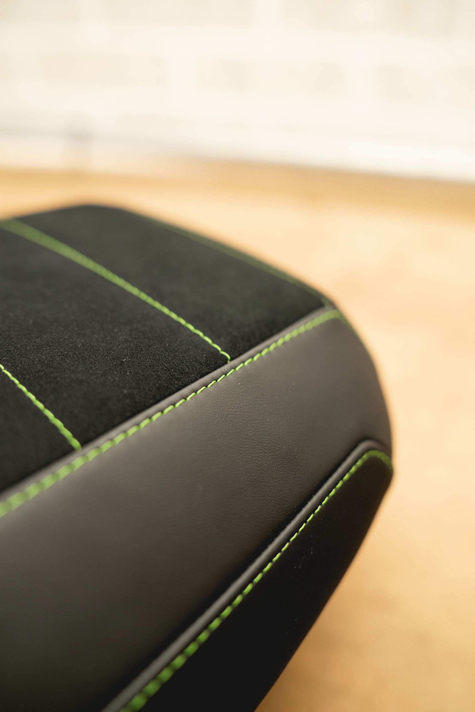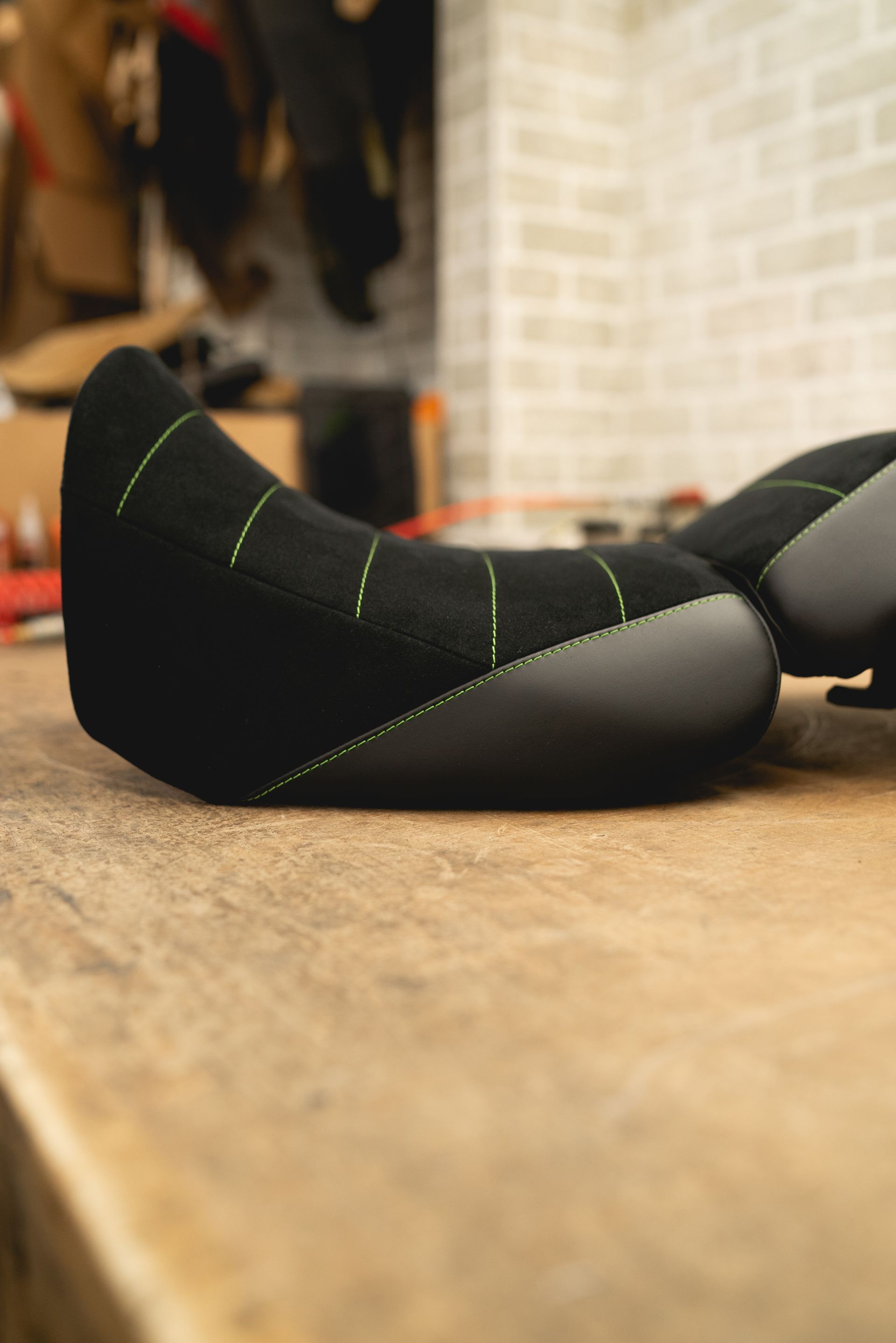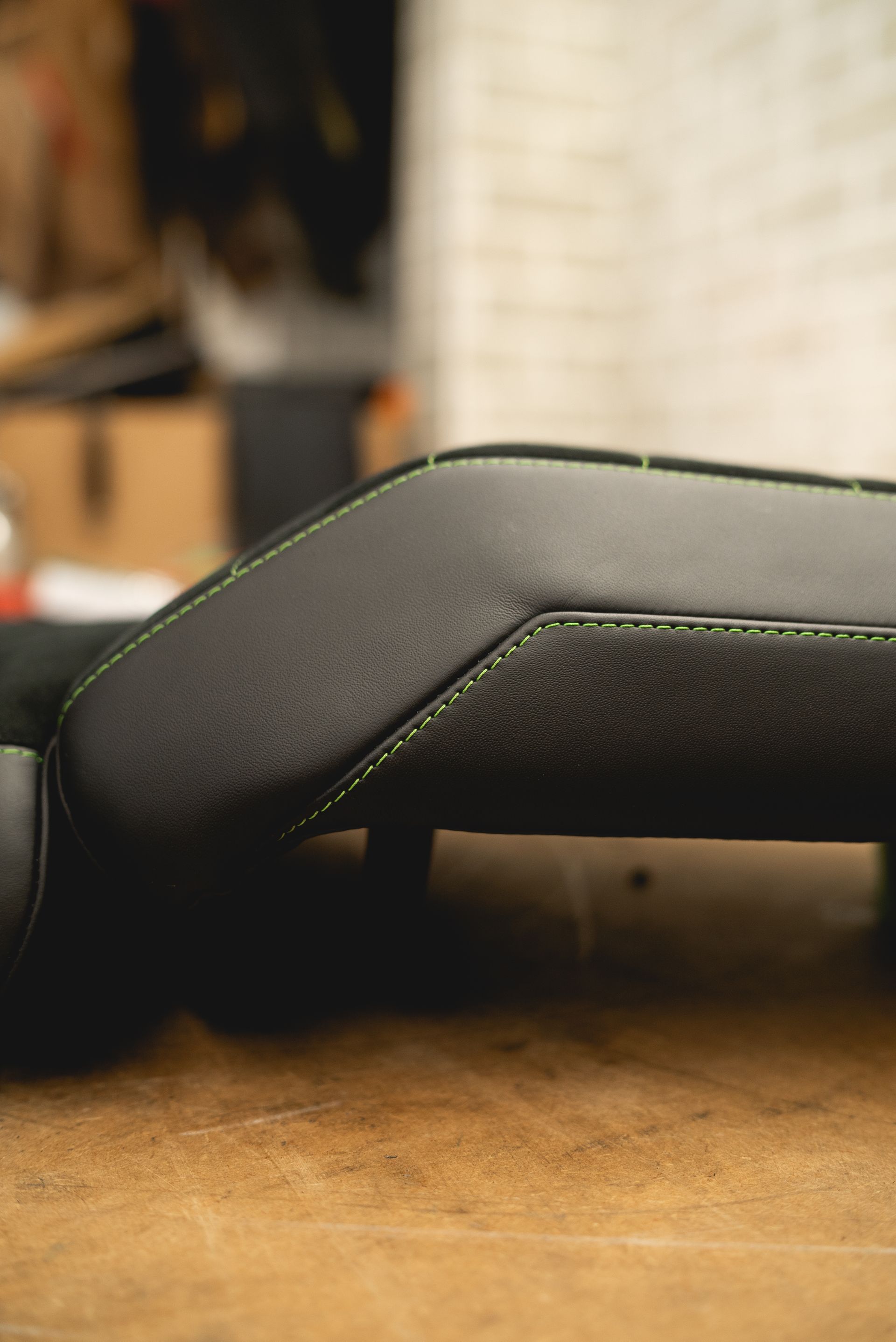 For this seat, we were tasked with creating a simple yet stylish design with a mixture of materials. The use of black nappa leather and black Alcantara was specified by the customer. To connect the seat and bike together, we chose a thread that was as similar as possible to the green vinyl stickers and framework of the bicycle.