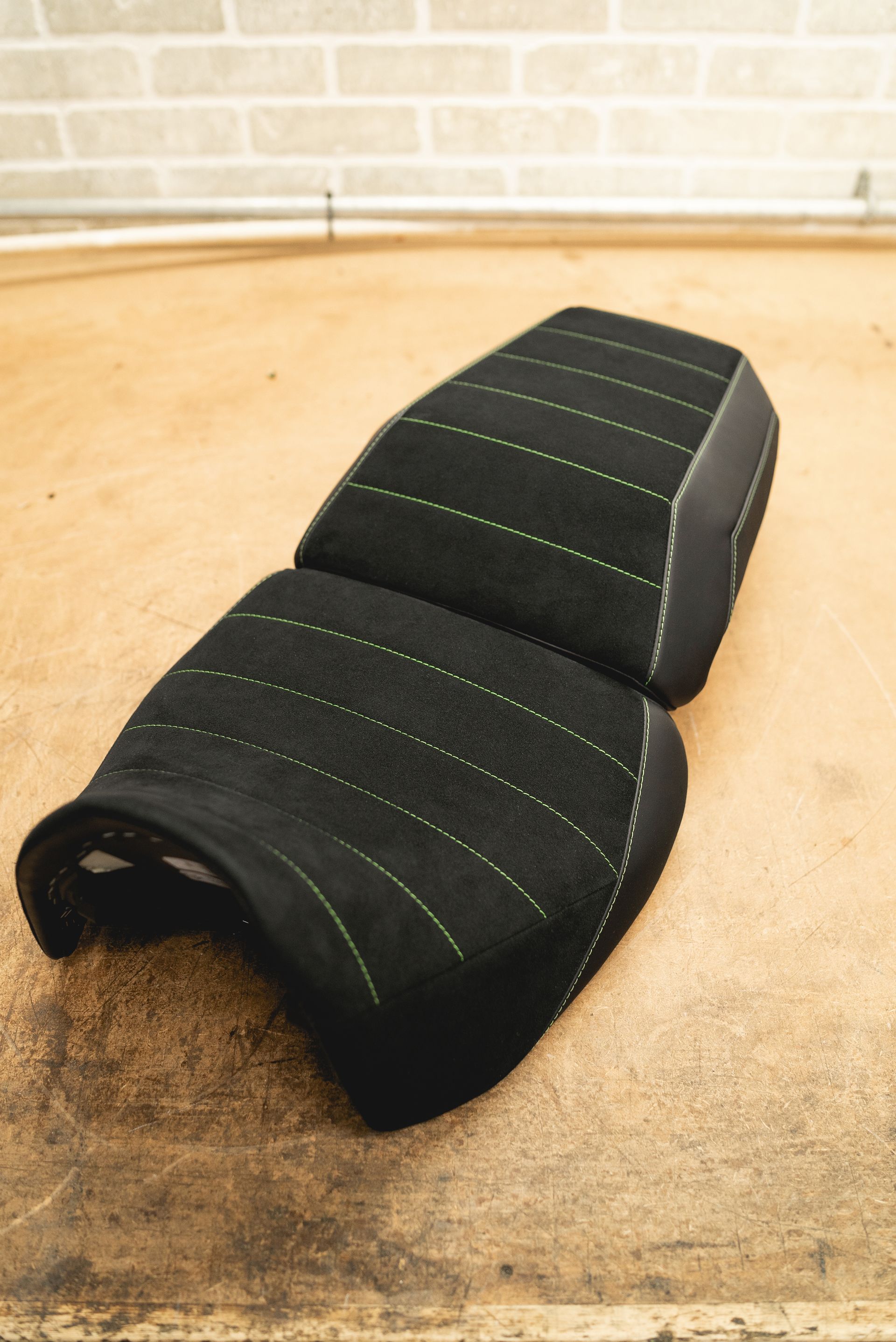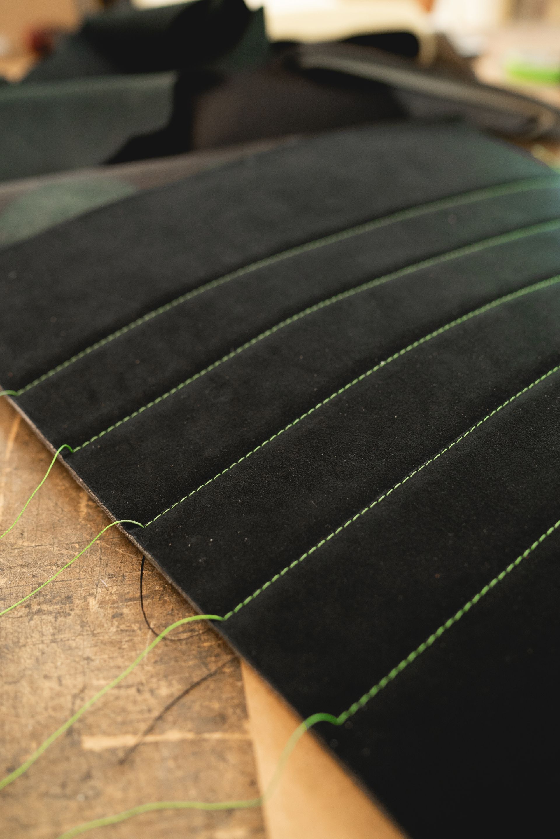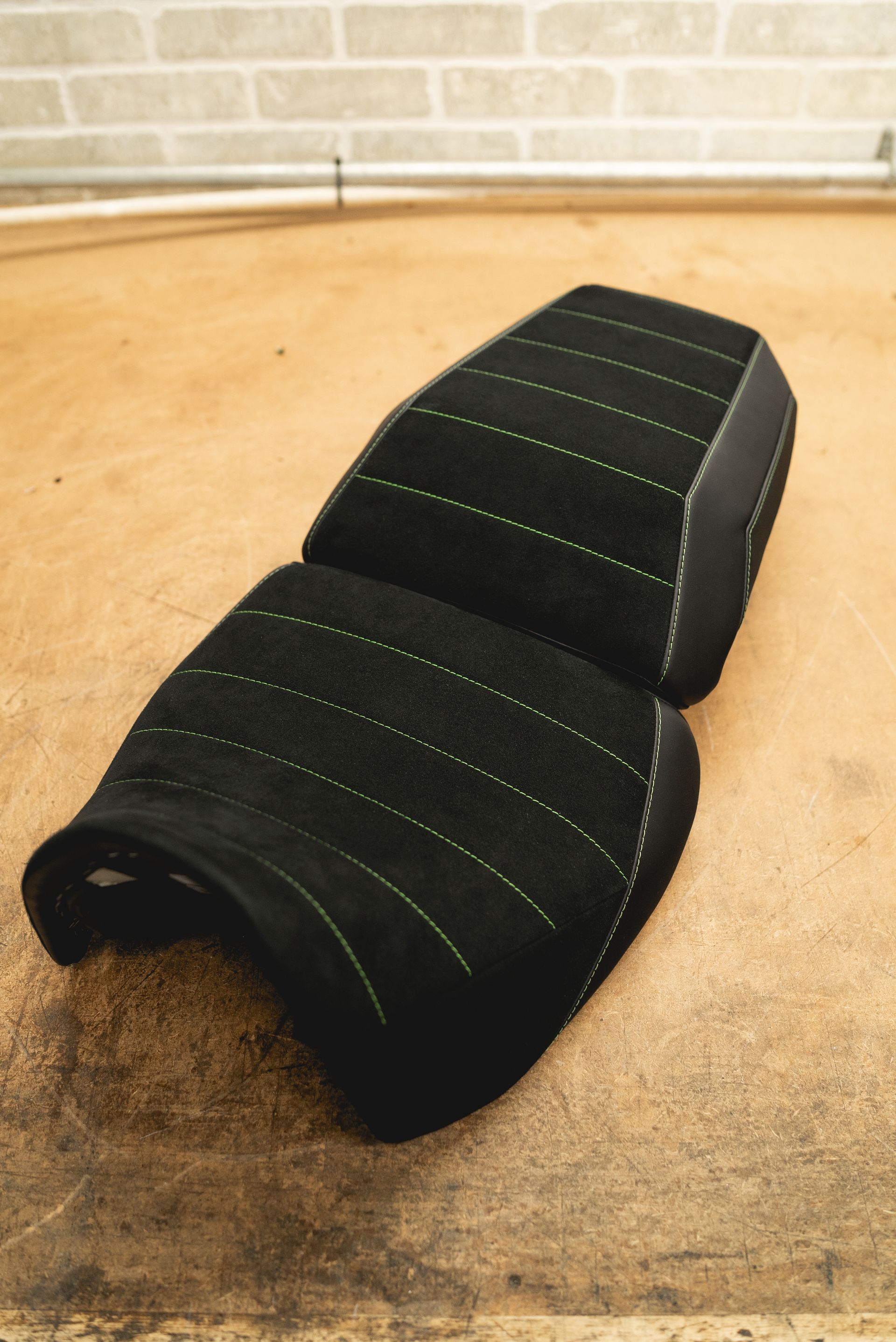 For this seat, we were tasked with creating a simple yet stylish design with a mixture of materials. The use of black nappa leather and black Alcantara was specified by the customer. To connect the seat and bike together, we chose a thread that was as similar as possible to the green vinyl stickers and framework of the bicycle.