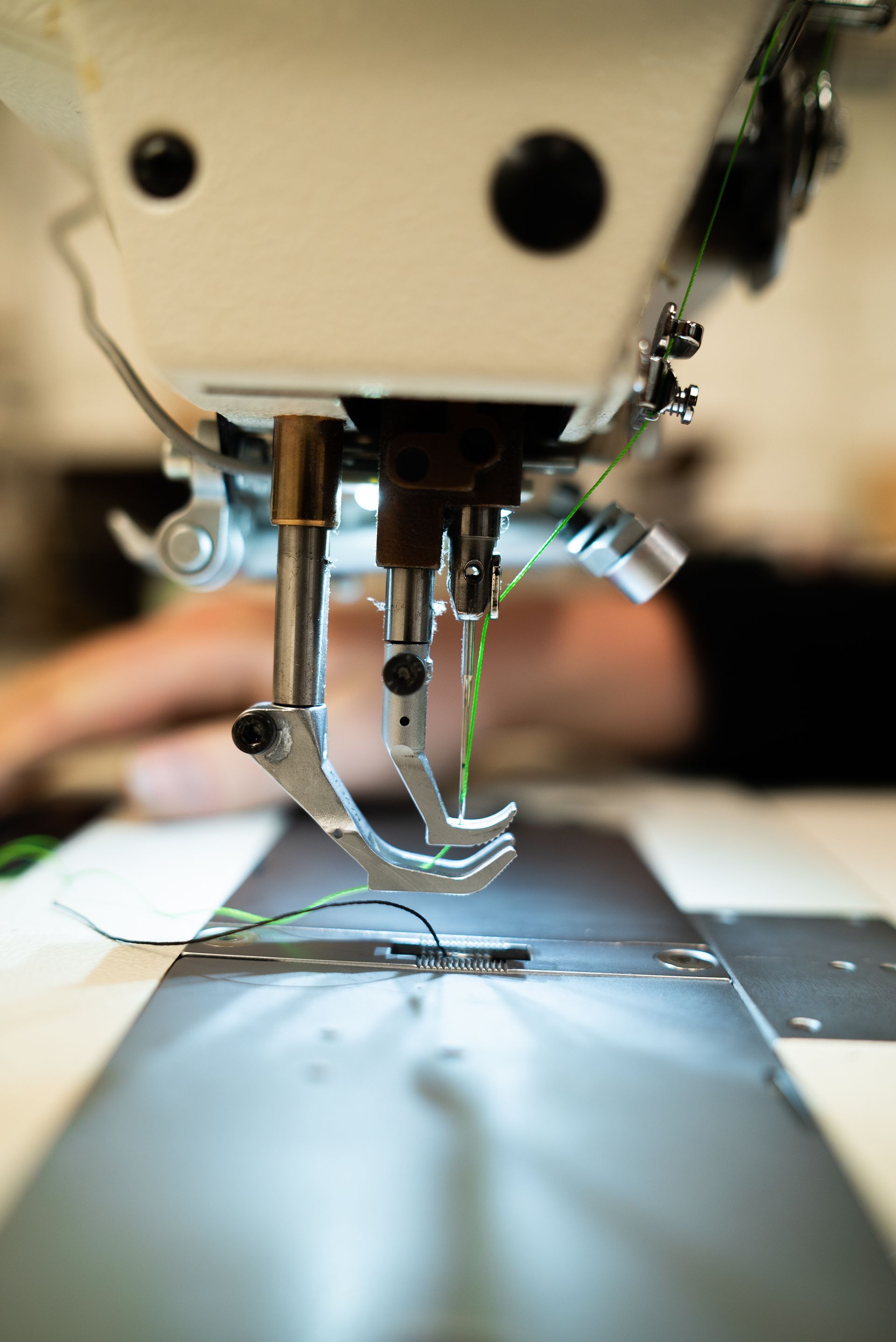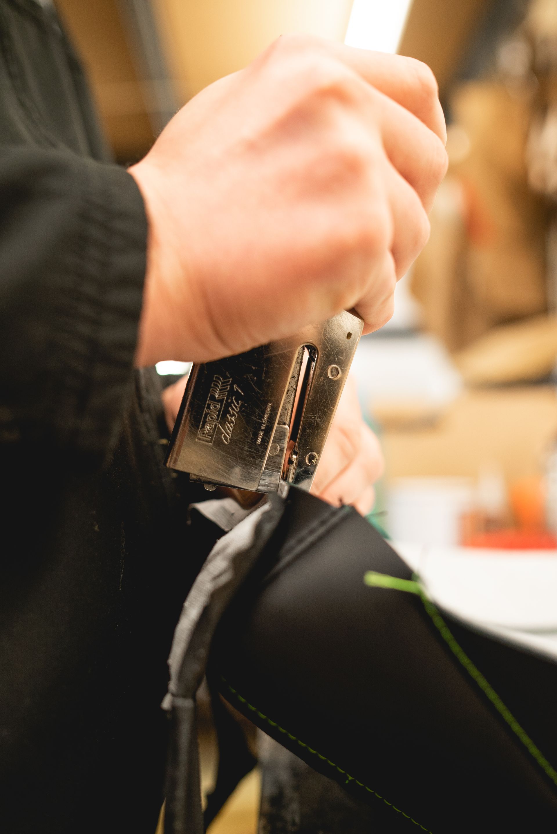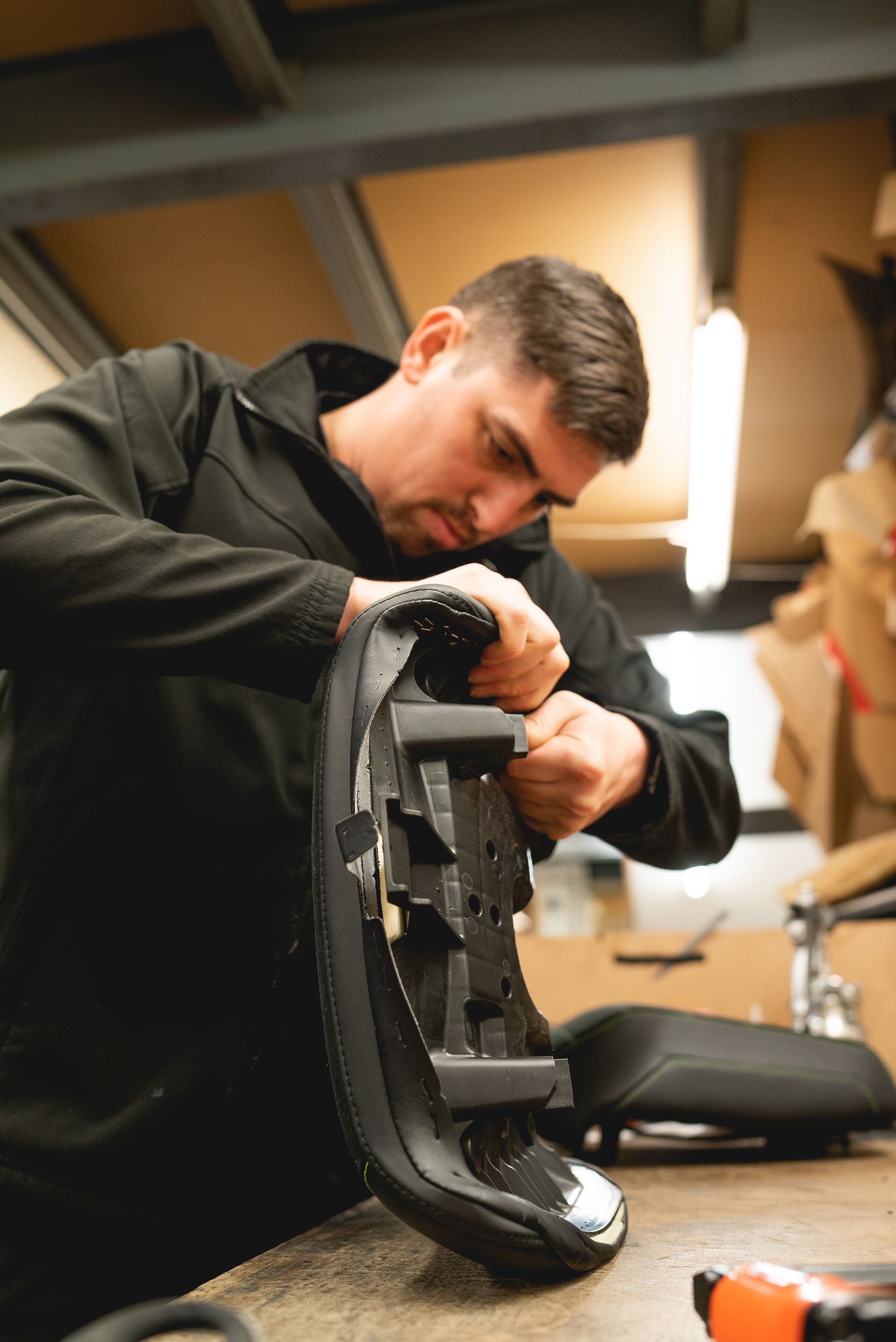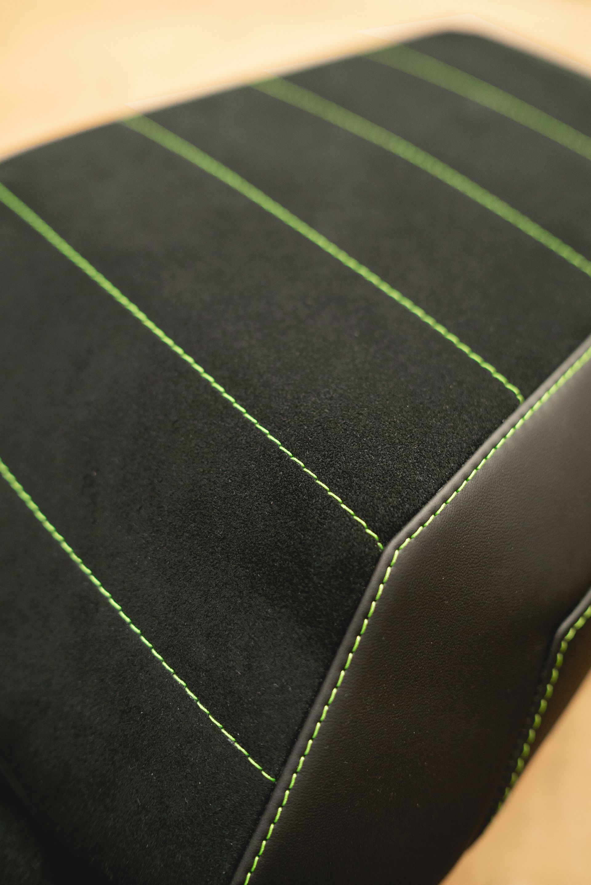 For this seat, we were tasked with creating a simple yet stylish design with a mixture of materials. The use of black nappa leather and black Alcantara was specified by the customer. To connect the seat and bike together, we chose a thread that was as similar as possible to the green vinyl stickers and framework of the bicycle.