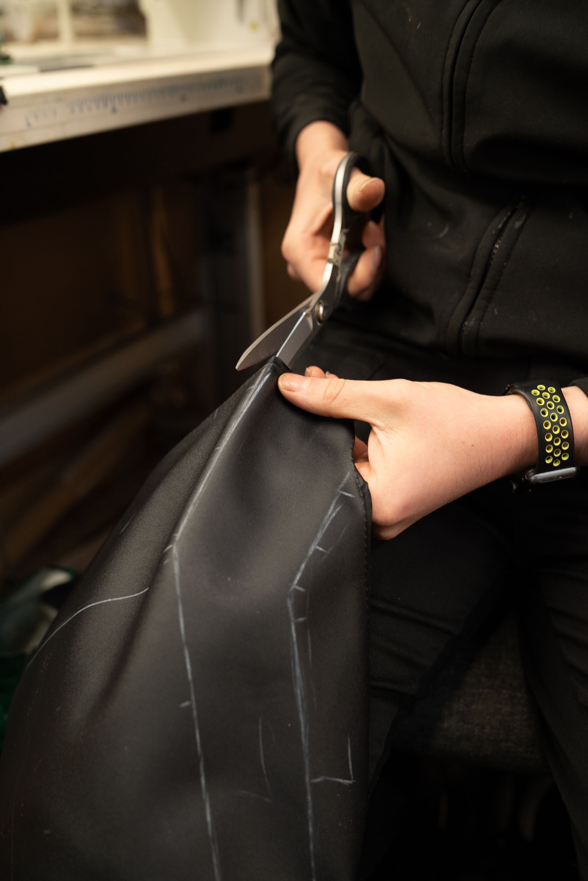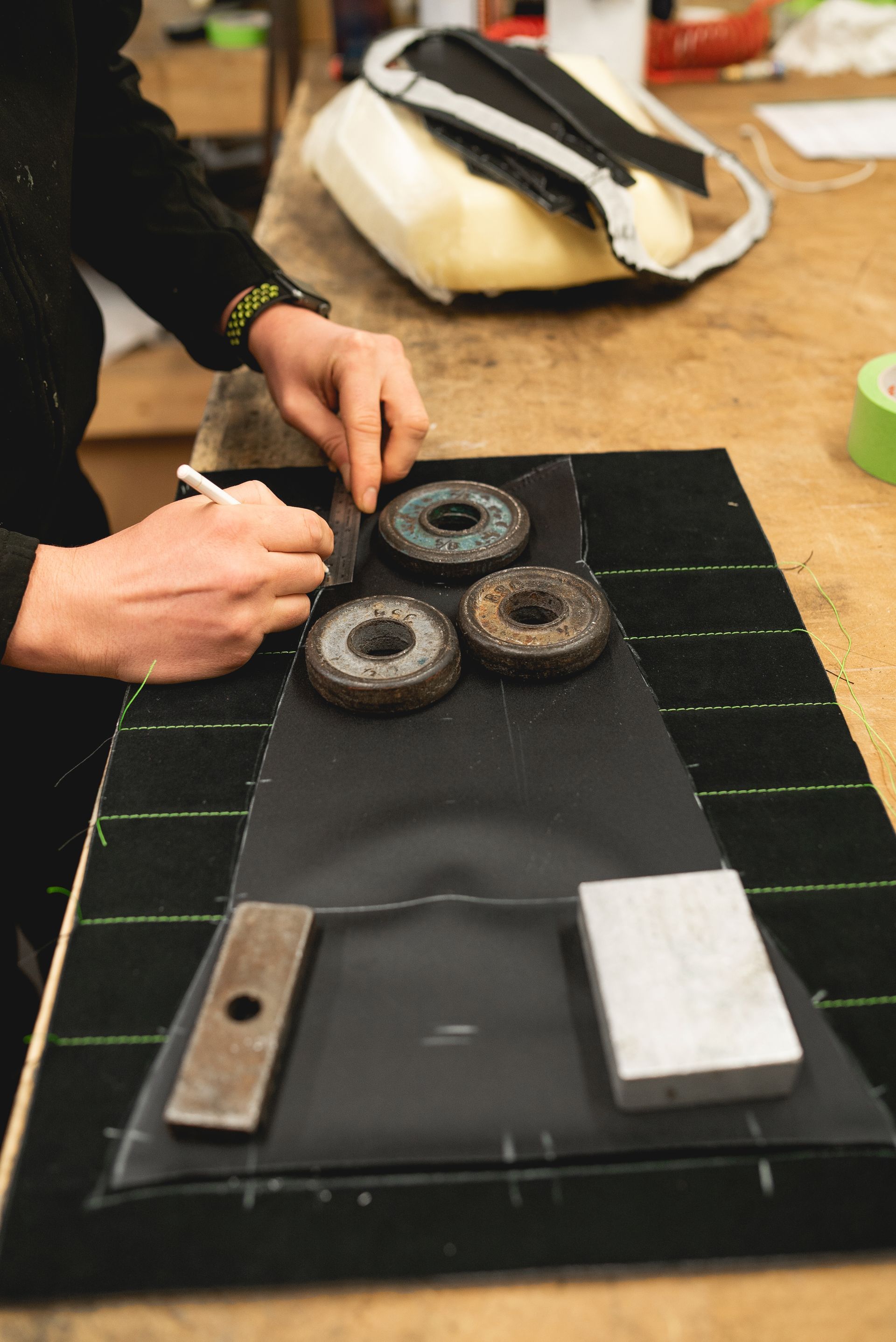 The first step is to plan the design of the cover by mocking up potential stitch lines on the original cover. Next is to draw out the design onto the material and cut out. Once all patterned pieces are stitched together, it is just a matter of fitting the cover over the foam and installing it.