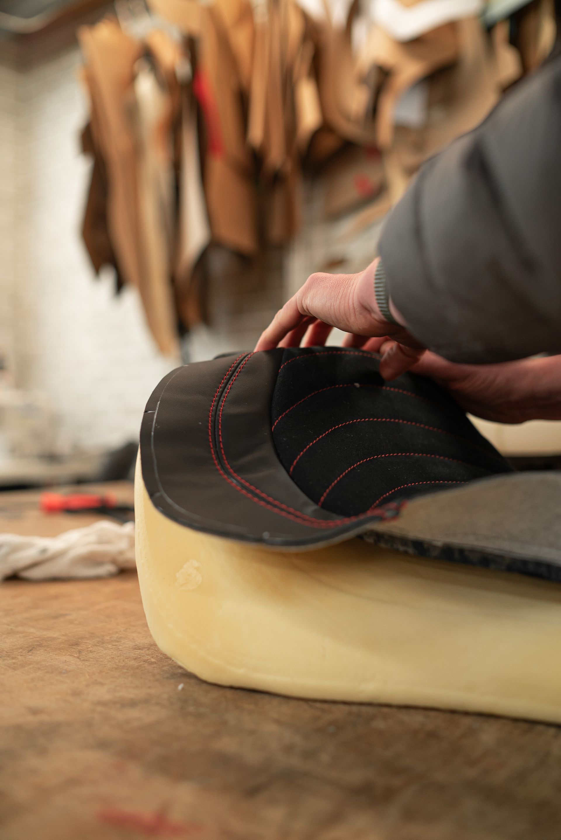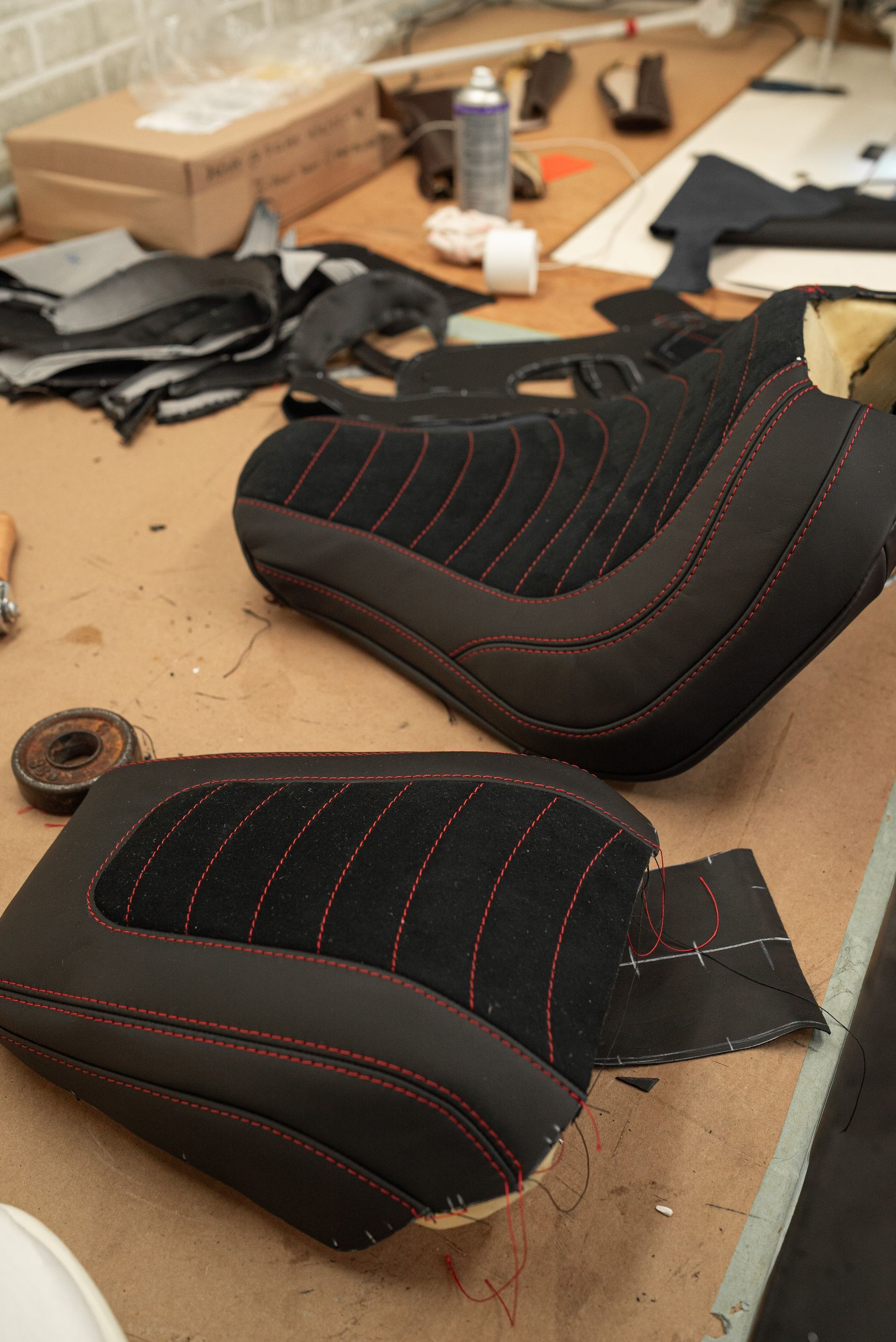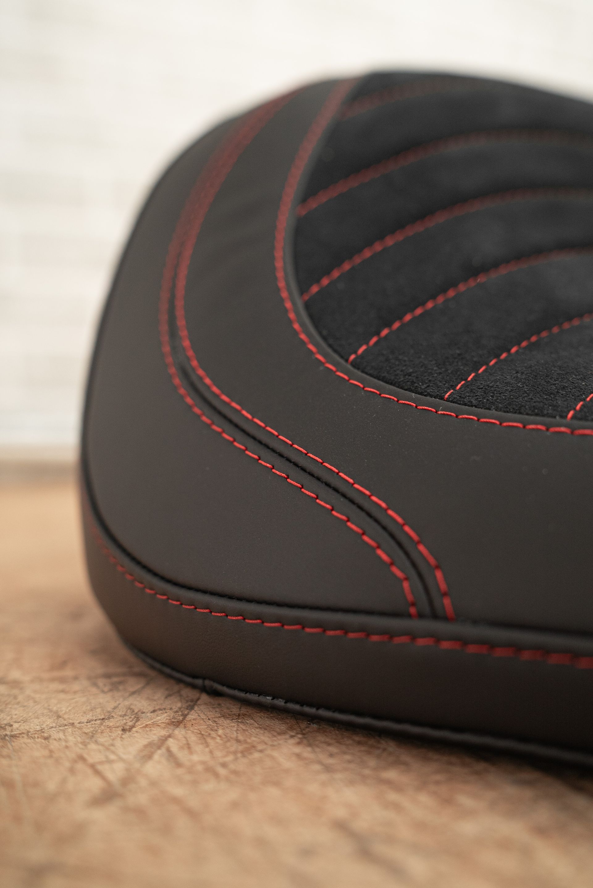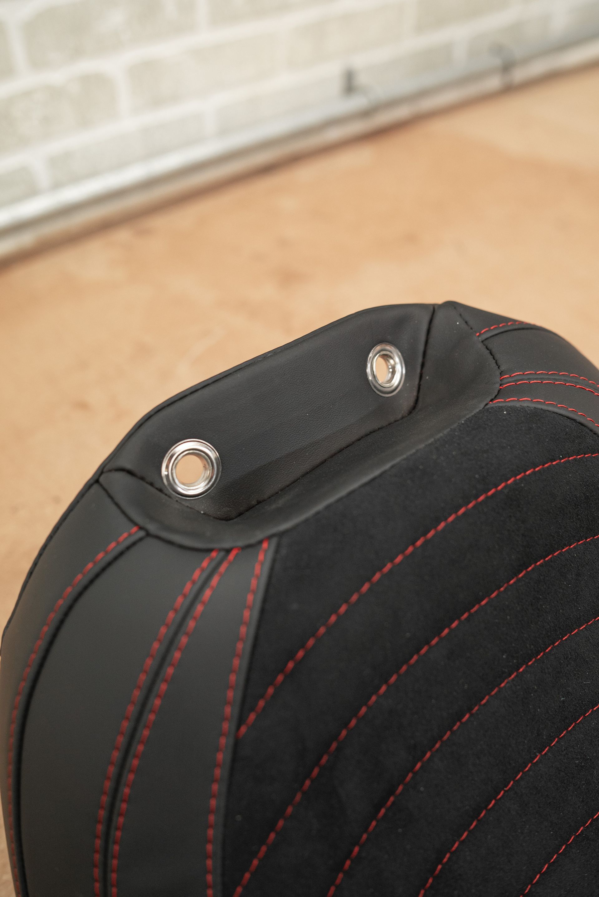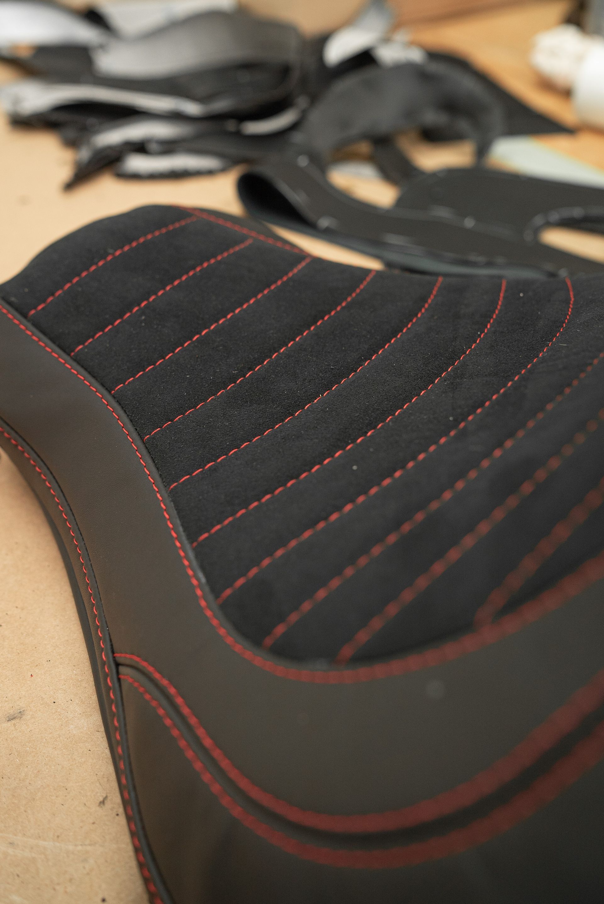 Our motorcycle seat retrims normally involve just a single section, sometimes maybe two, but this time we have three pieces to retrim. The customer requested a simple yet effective pattern to blend into the other pieces of the seat, plenty of red stitching was also asked to match the colour theme of the bike.