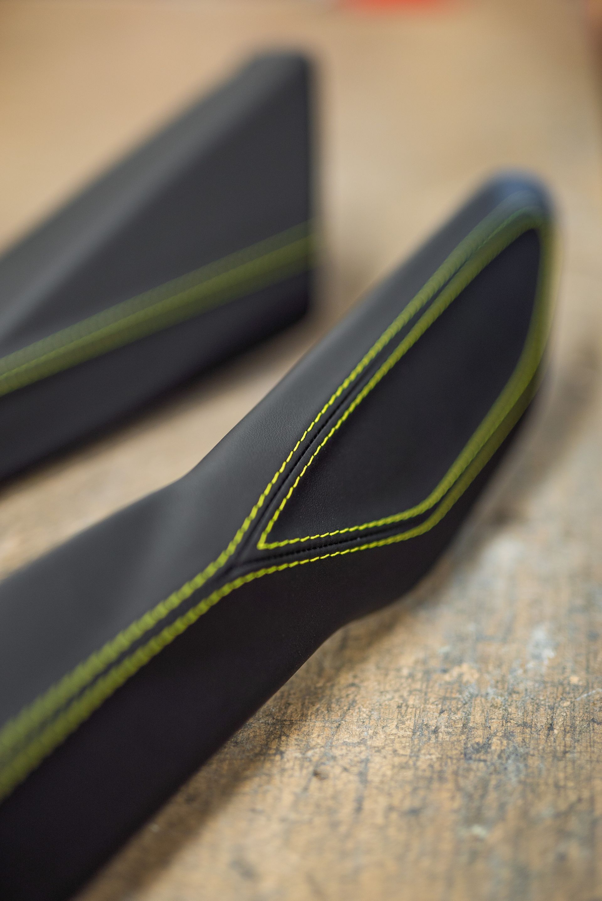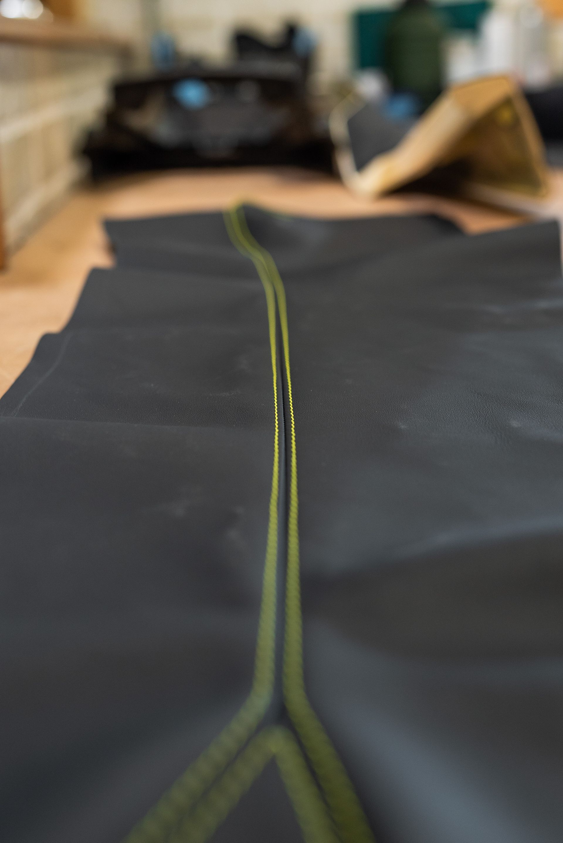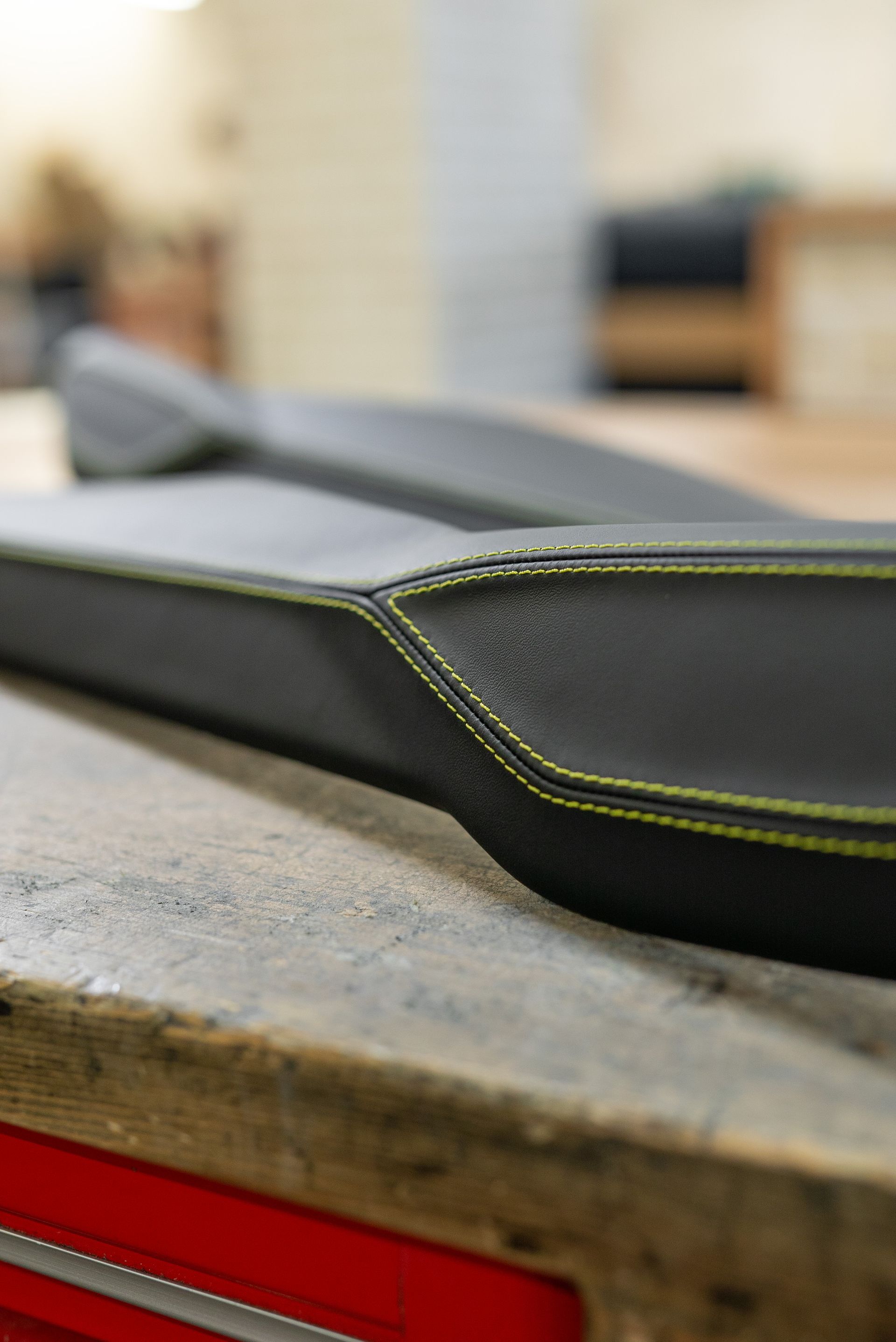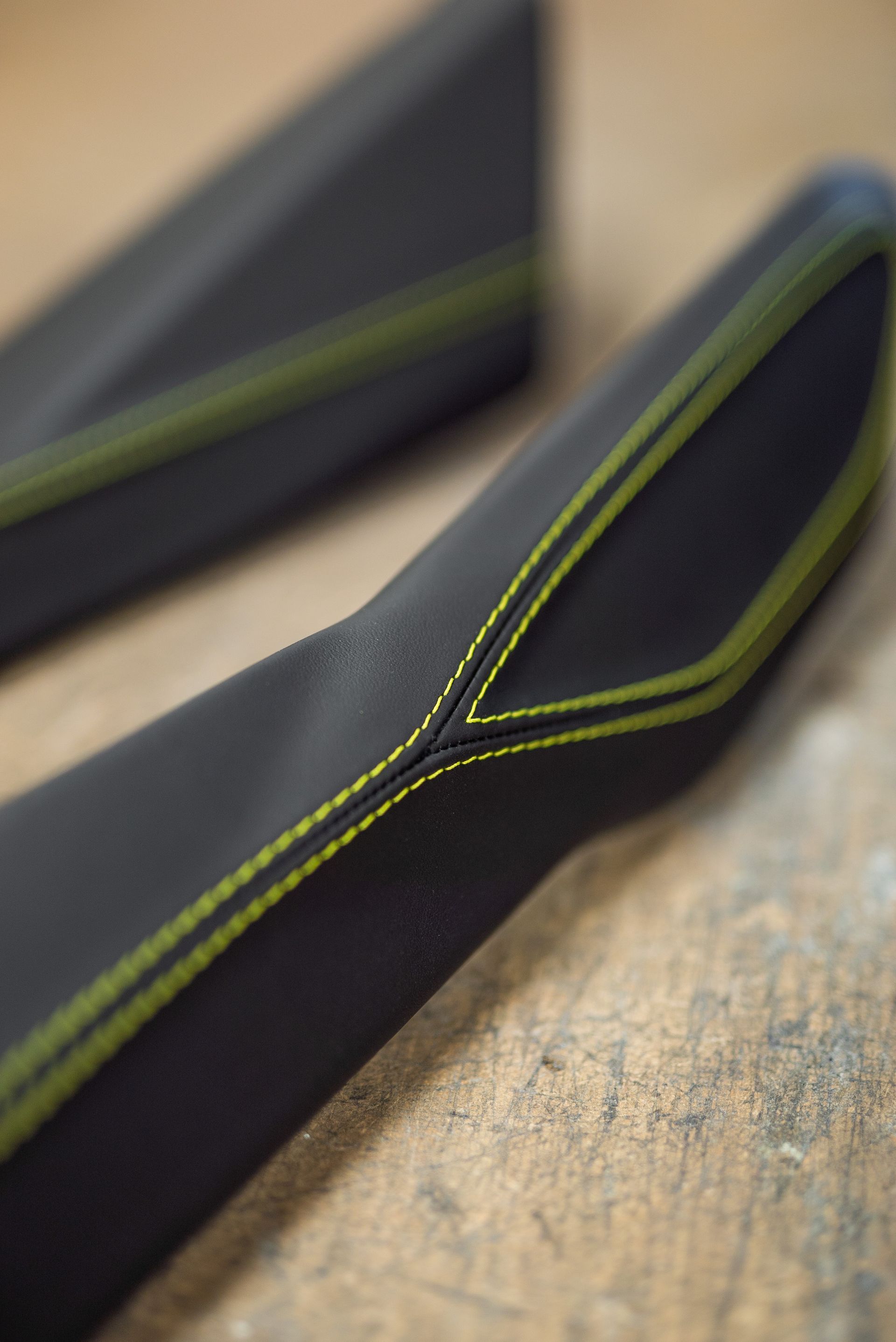 We stock Serafil Amann automotive threads in our own store, so a thread matching the Verde Scandal green was selected. Be sure to check out our store at dclassautoshop.co.uk where you can buy threads just like this one for your own projects. A twin stitch, which then splits, decorates these panels, creating a very cool and unique finish to the already outrageous interior.