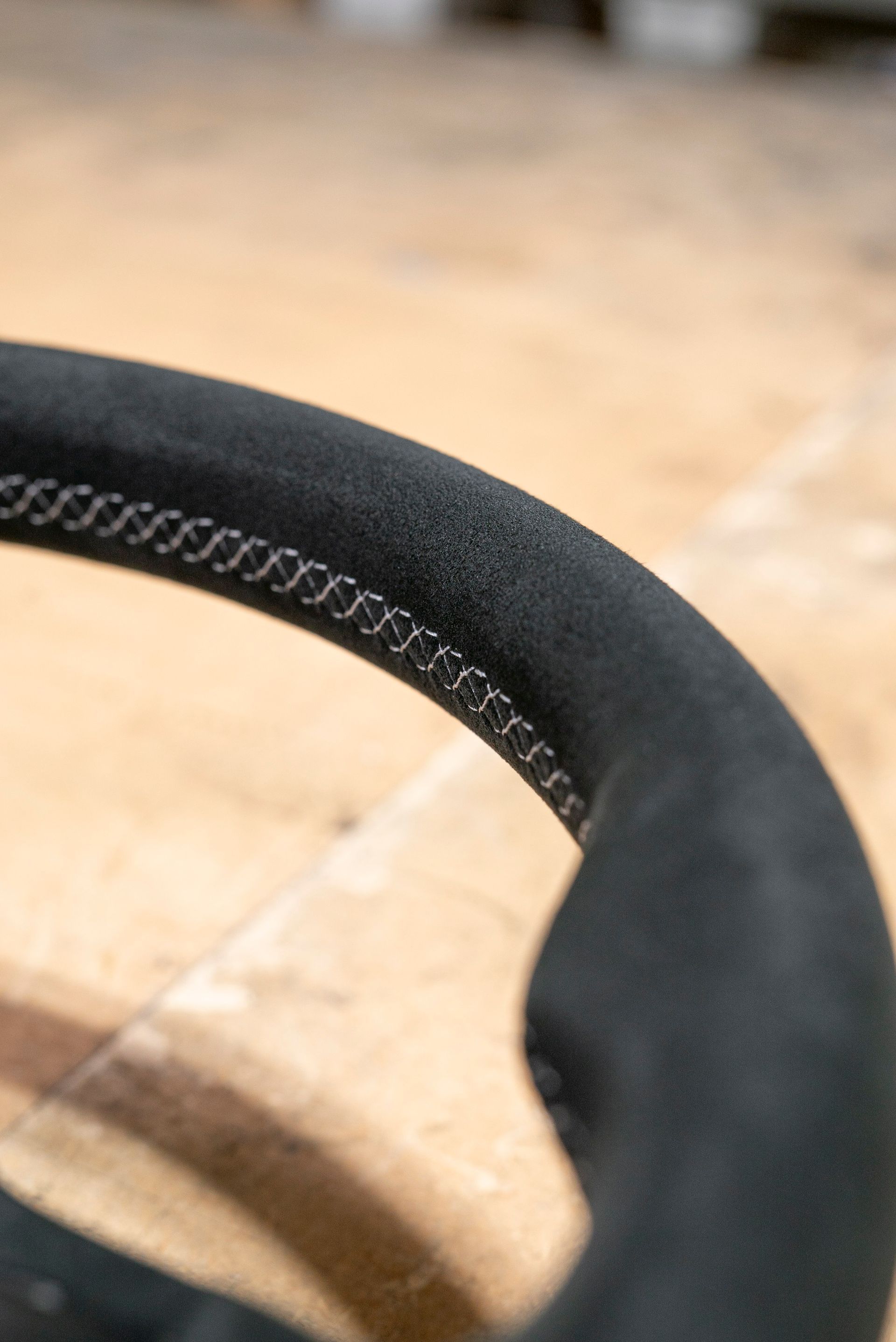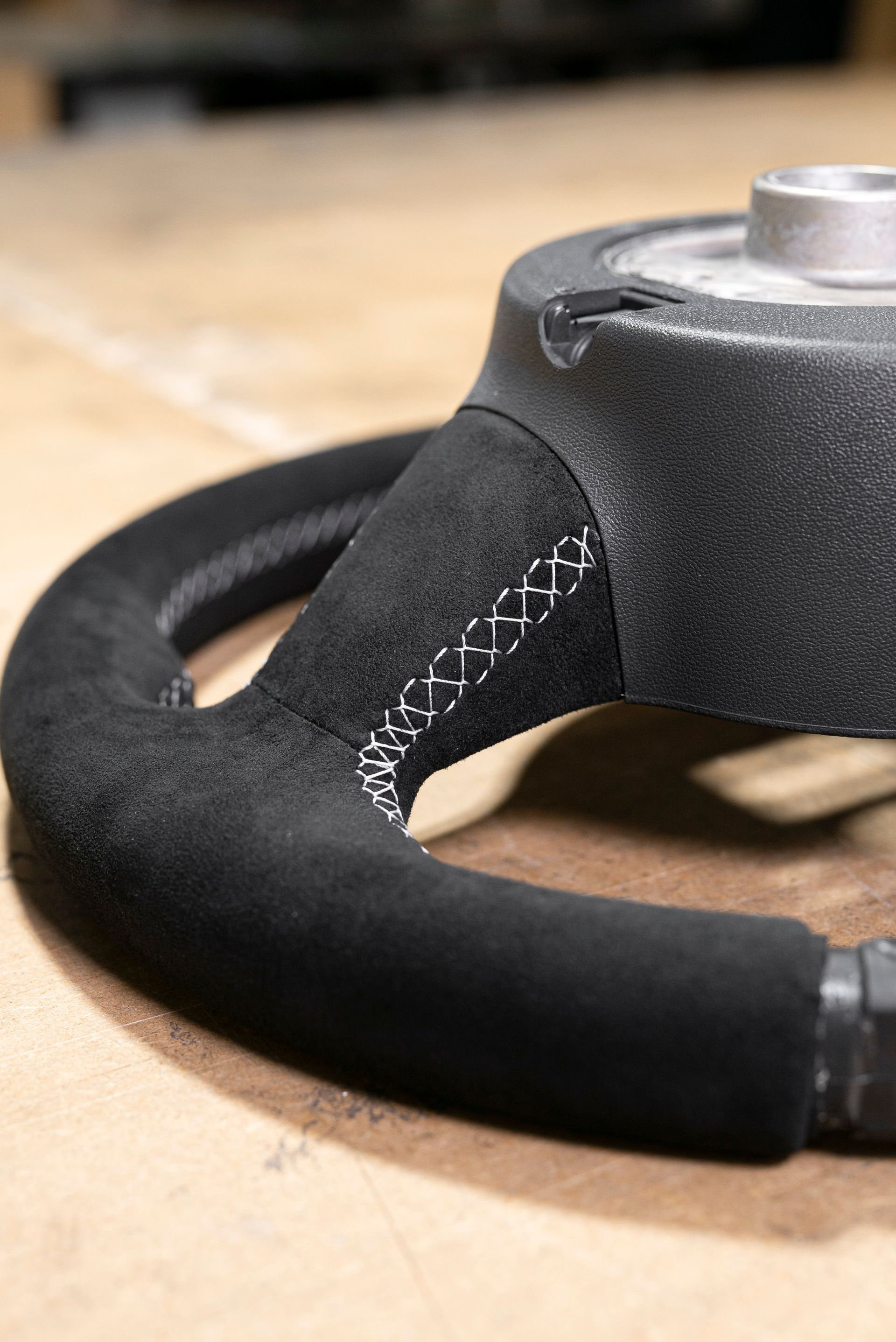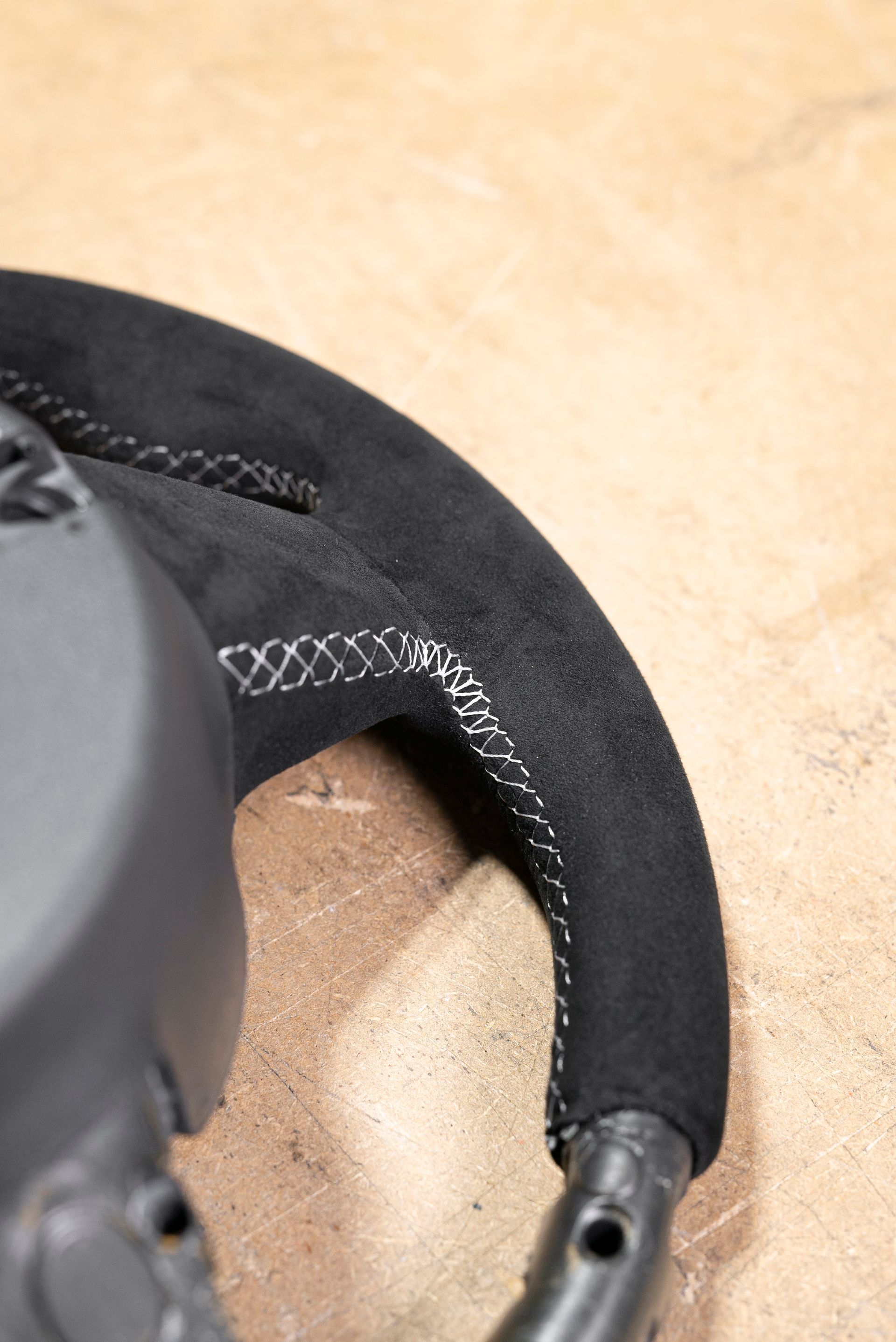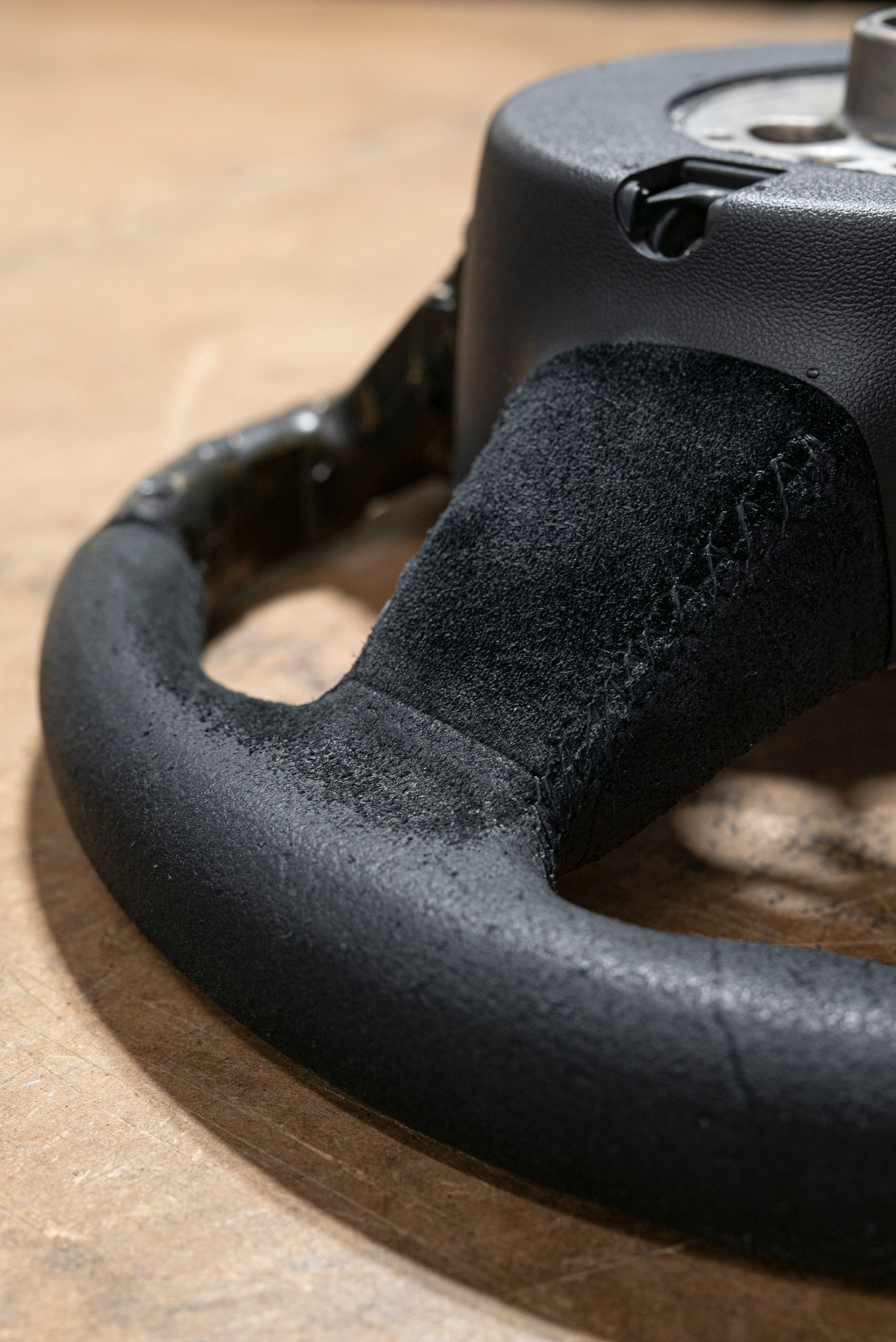 The steering wheel was in a bad way; being suede from the factory, this material does not age well, especially on highly used areas of a car (door handles, steering wheels, gear knobs). Our customer requested to retrim the wheel with Alcantara for a more modern look, with light grey stitching, a change from the OEM black.